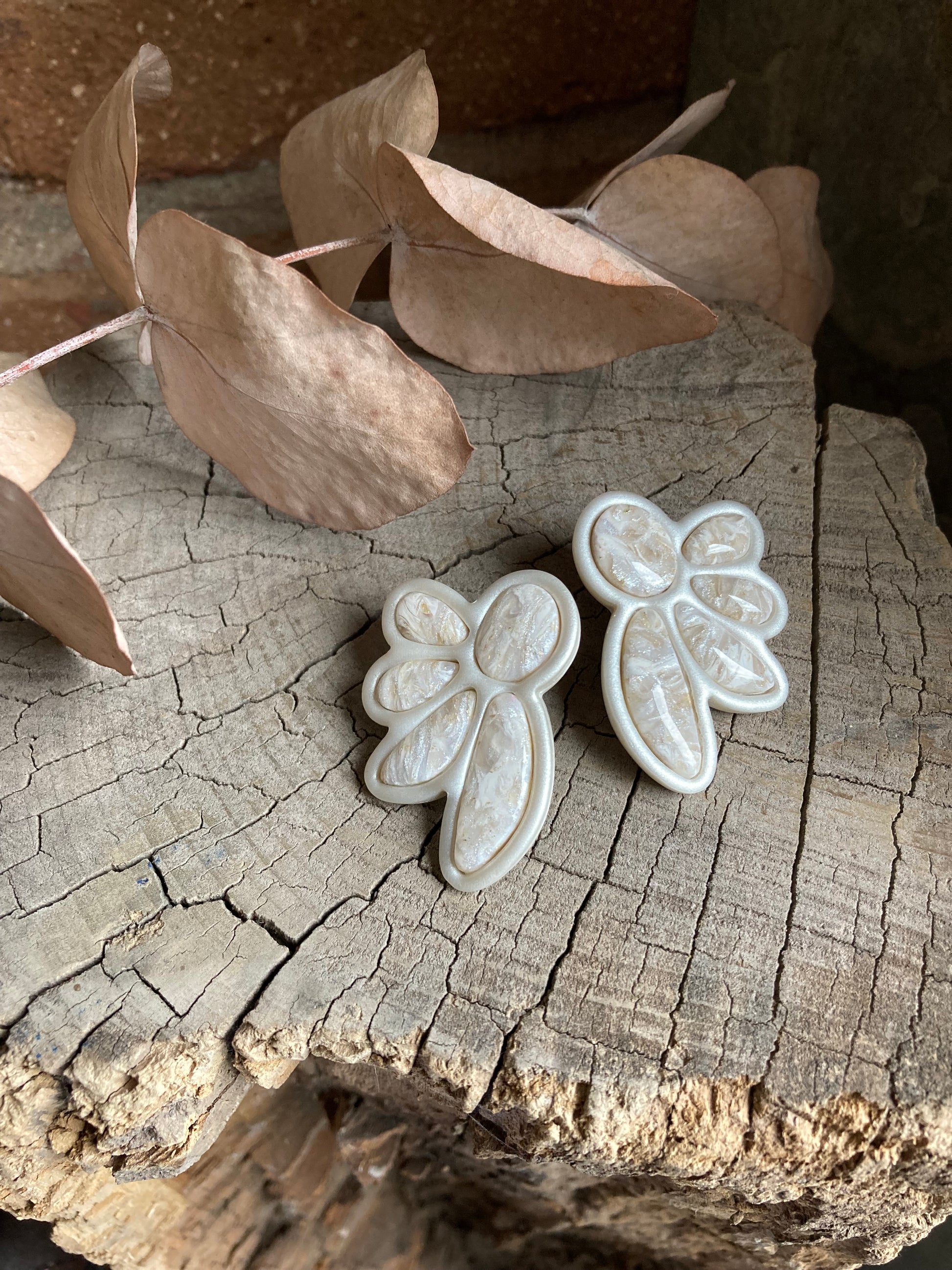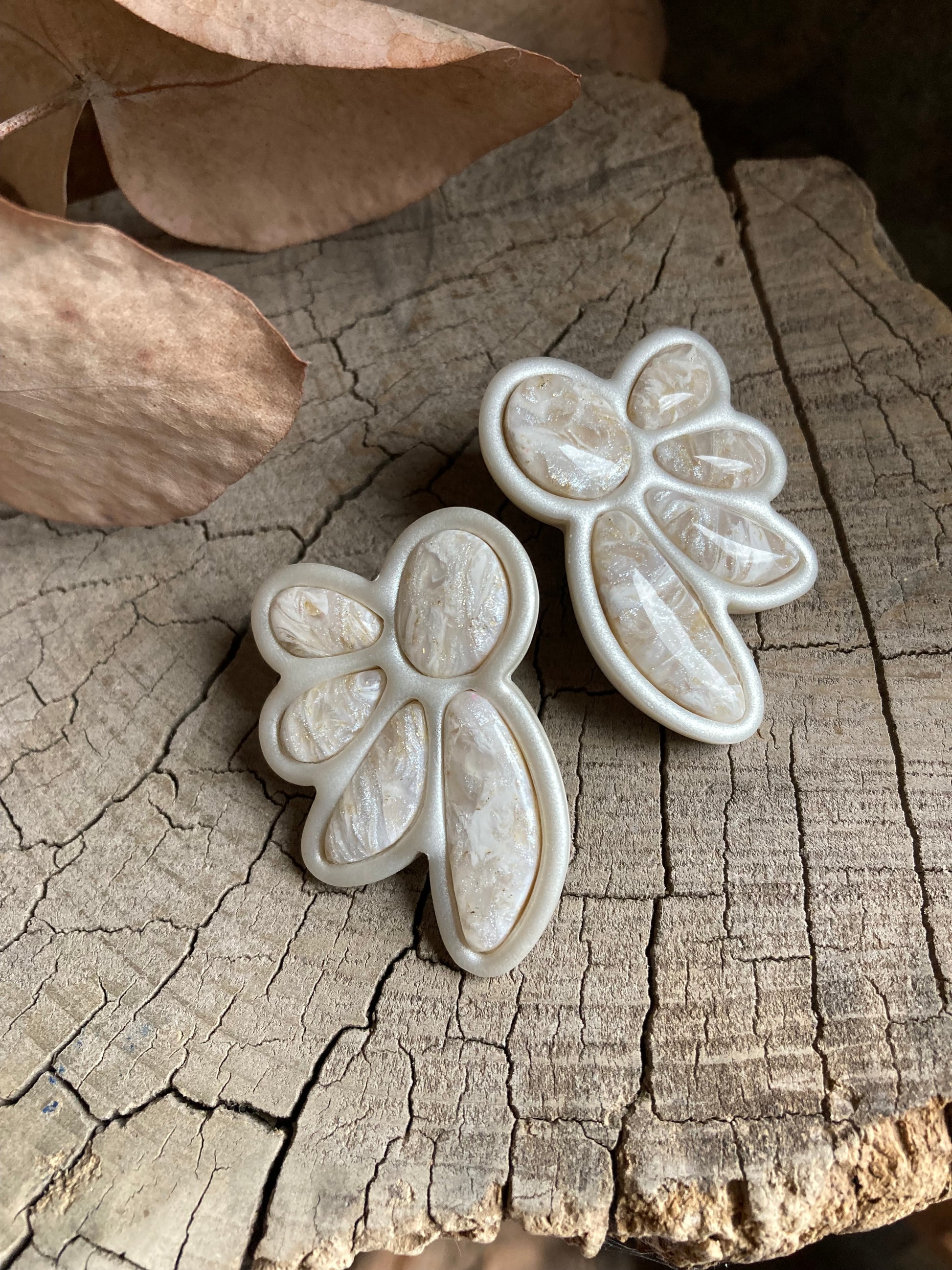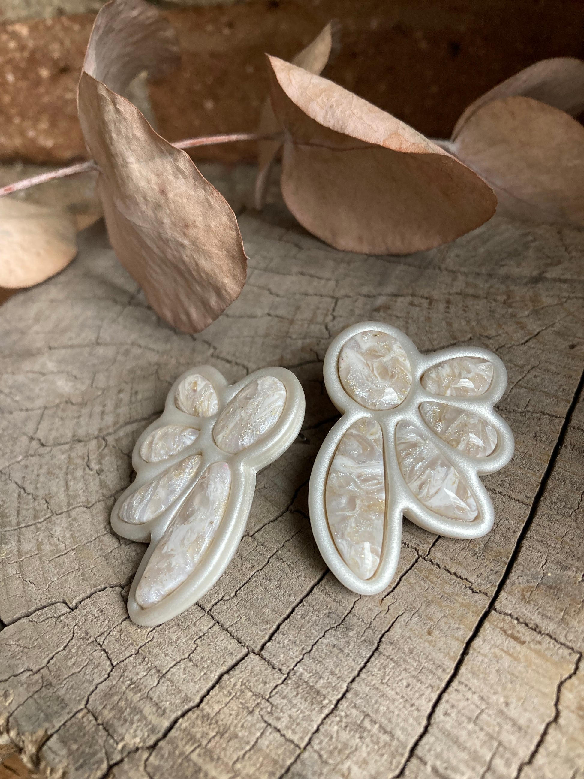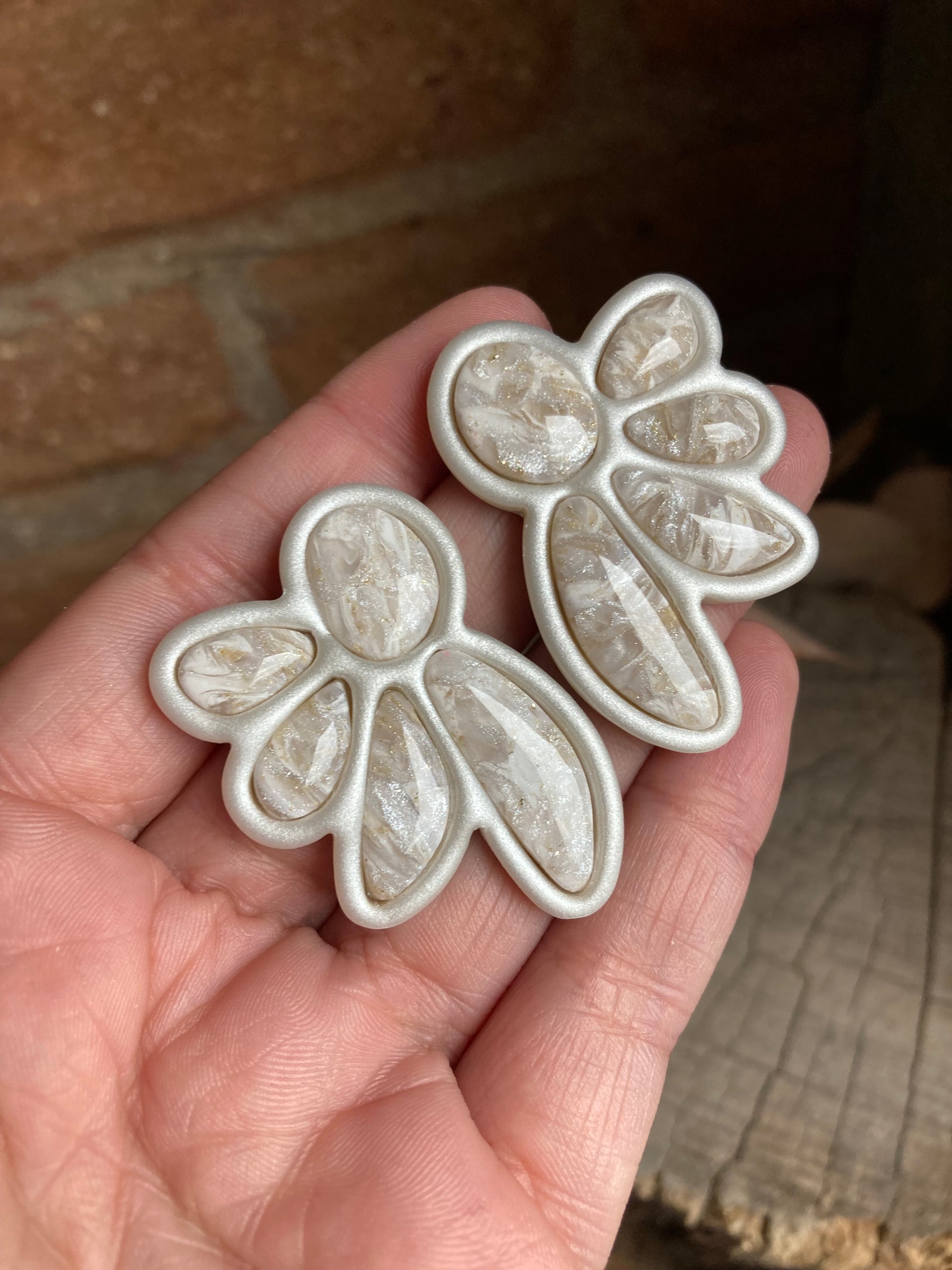 Aros de arcilla polimérica con top coat de resina uv. Miden 4,5 cms. Palito de acero quirúrgico y tope de goma.