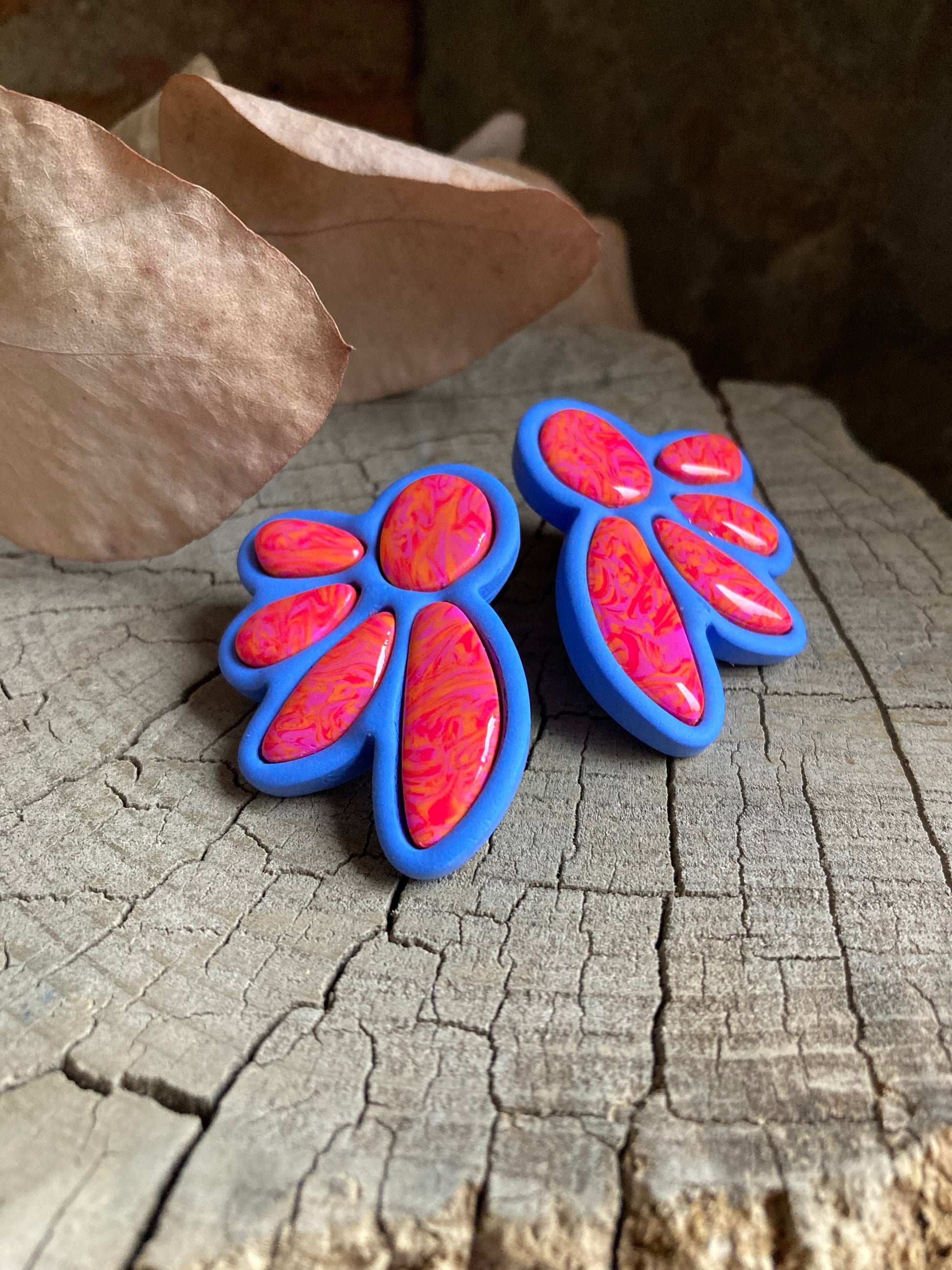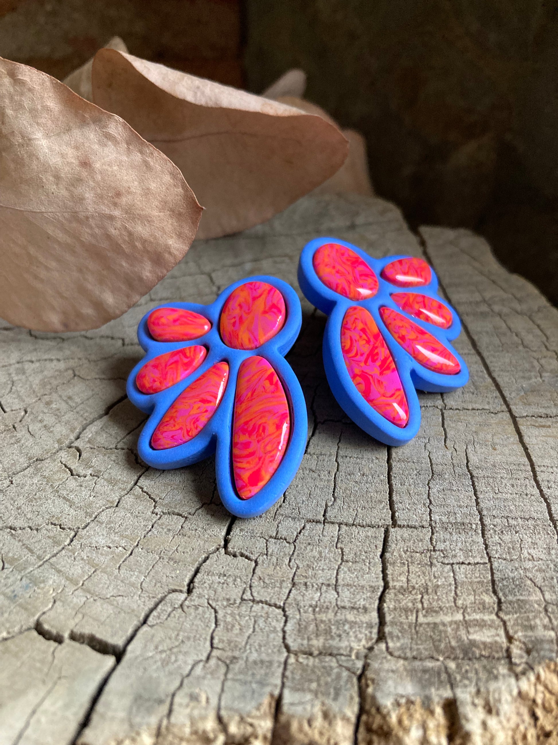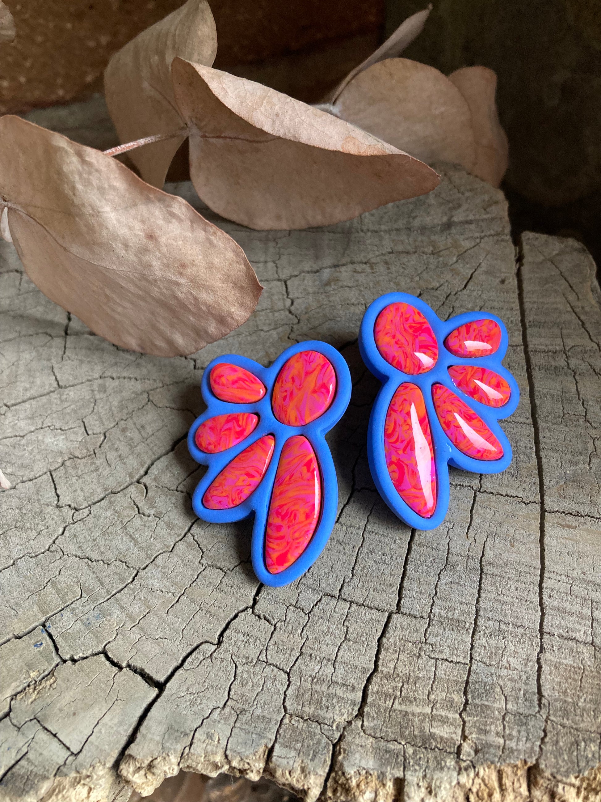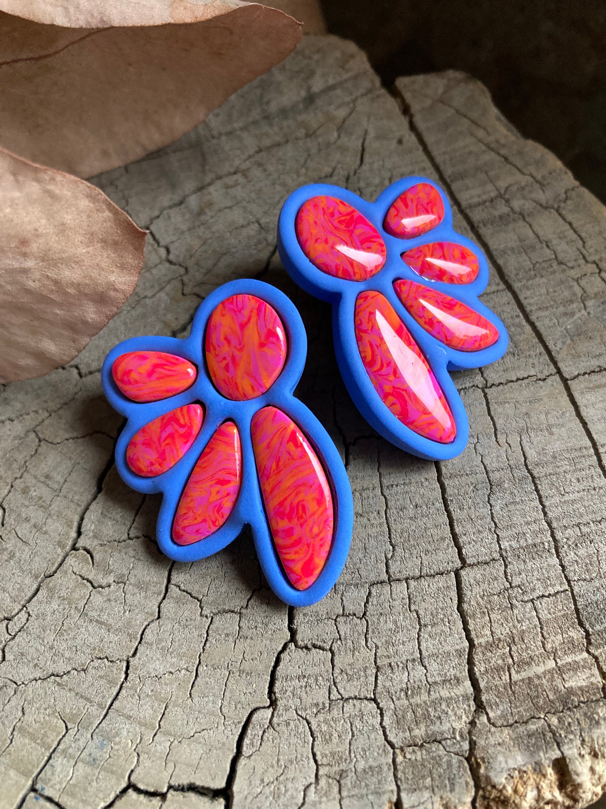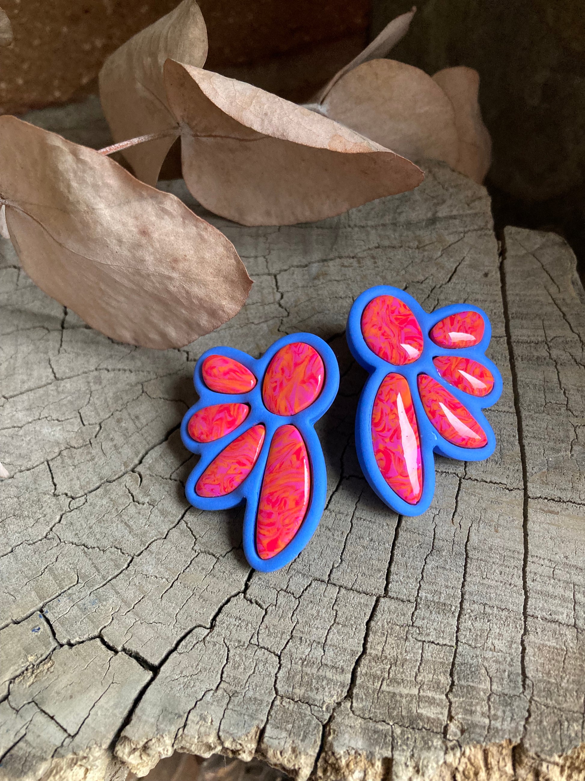 Aros de arcilla polimérica con top coat de resina uv. Miden 4,5 cms. Palito de acero quirúrgico y tope de goma.