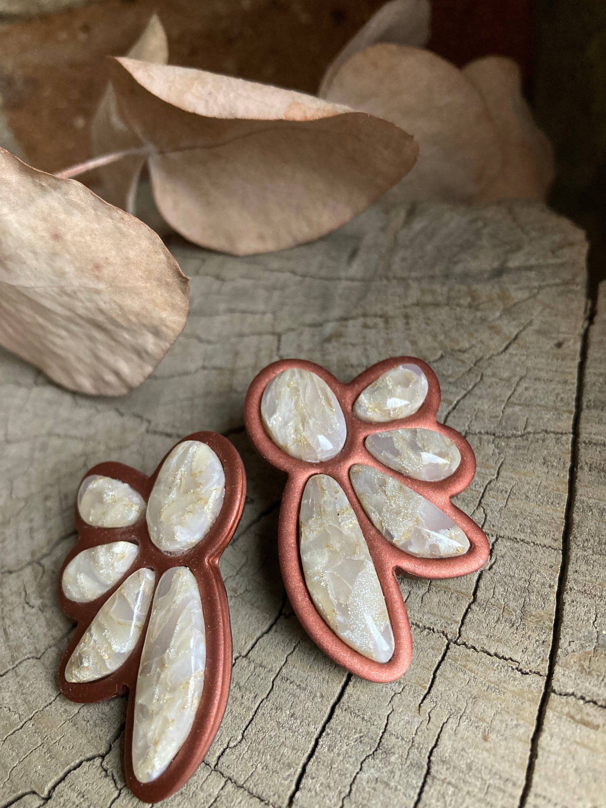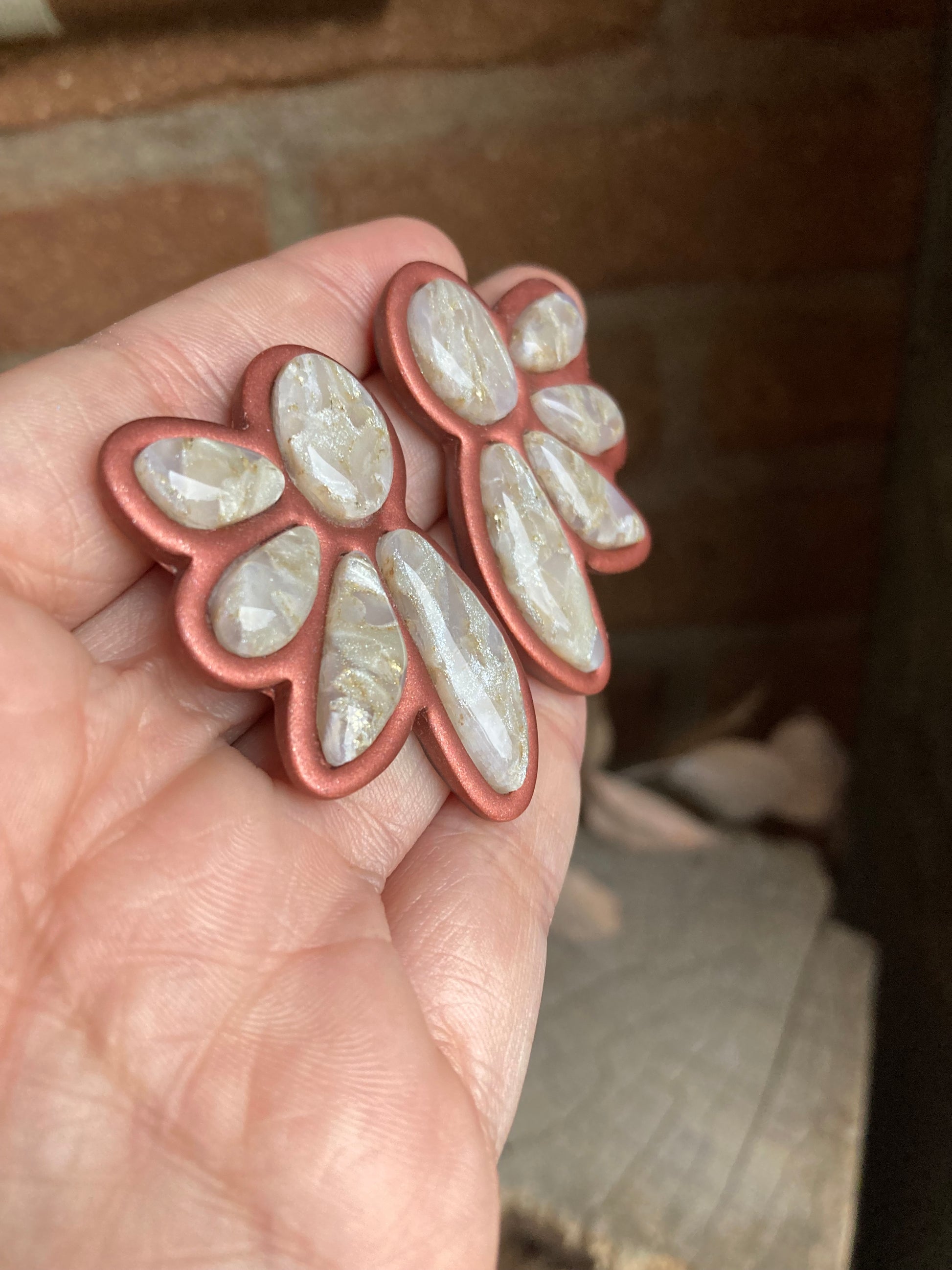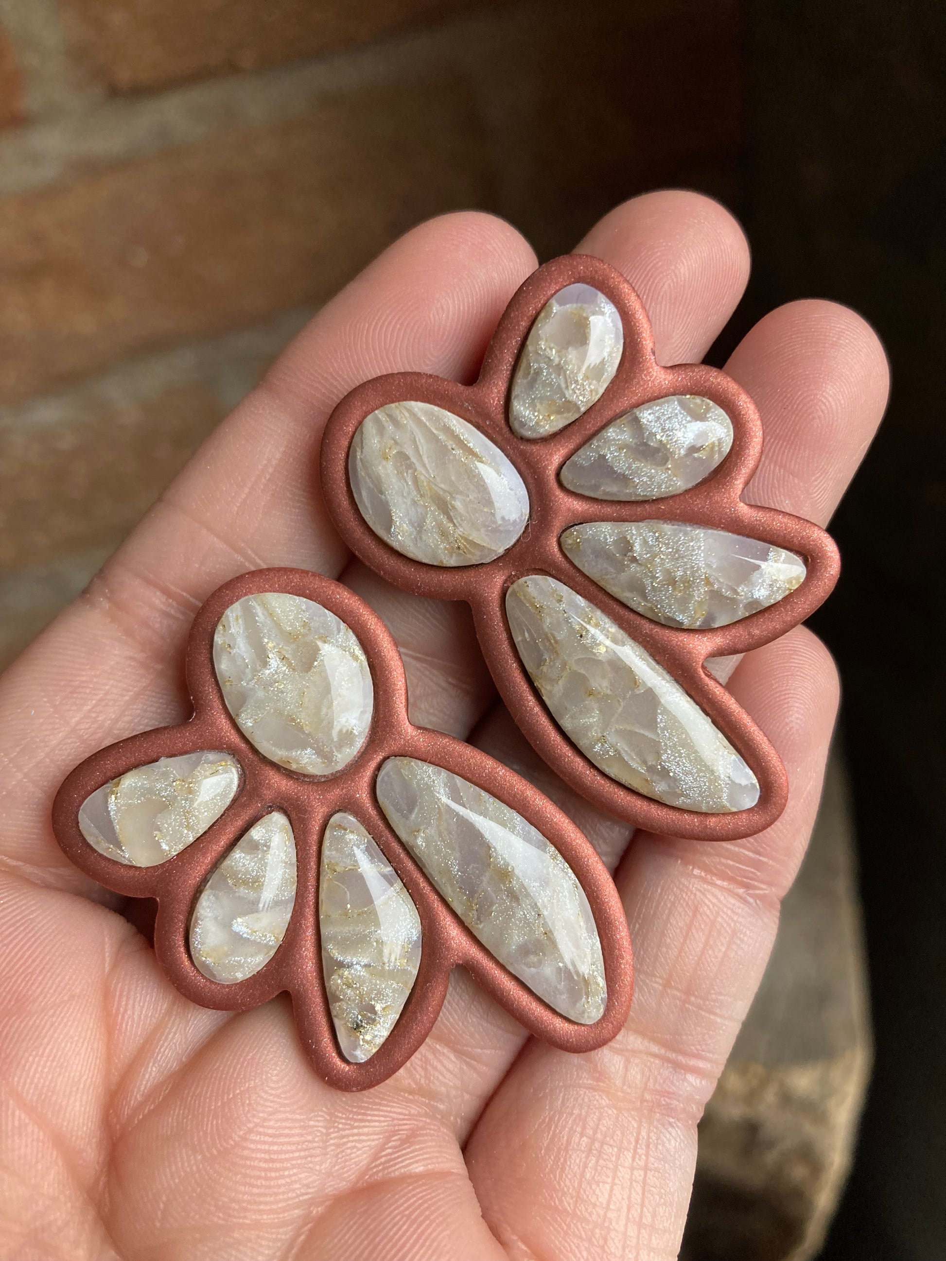 Aros de arcilla polimérica con top coat de resina uv. Miden 4,5 cms. Palito de acero quirúrgico y tope de goma.