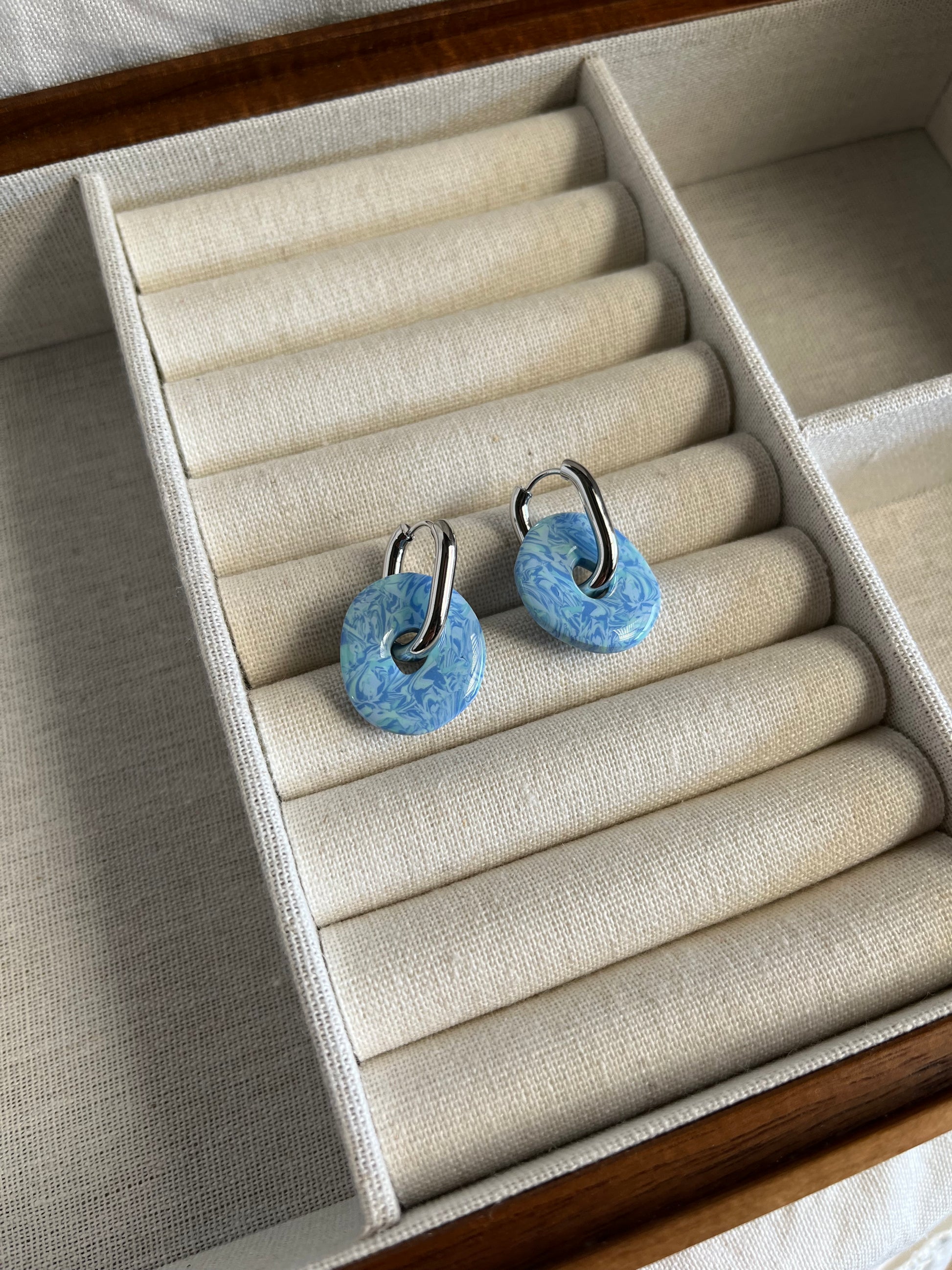 Argollas de acero inoxidable bañadas en rodio. Miden 20x16 mm. Incluye círculito de arcilla polimérica con resina y detalles en nácar que puedes sacar y poner.