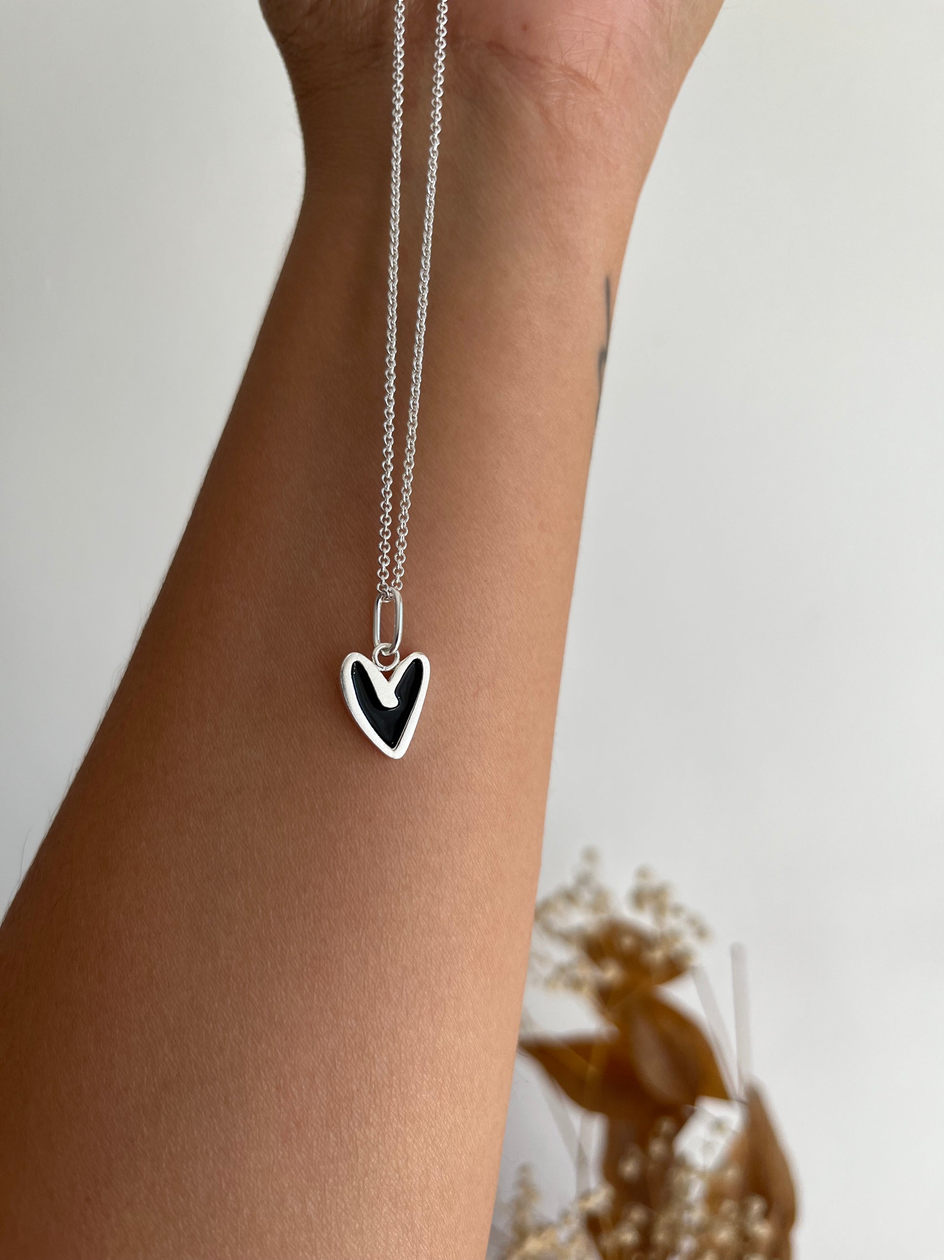 Cadena de plata 925 de 40 cms con colgante de corazón de plata 980 esmaltada al frío negro. El corazón mide 1,4 cms.