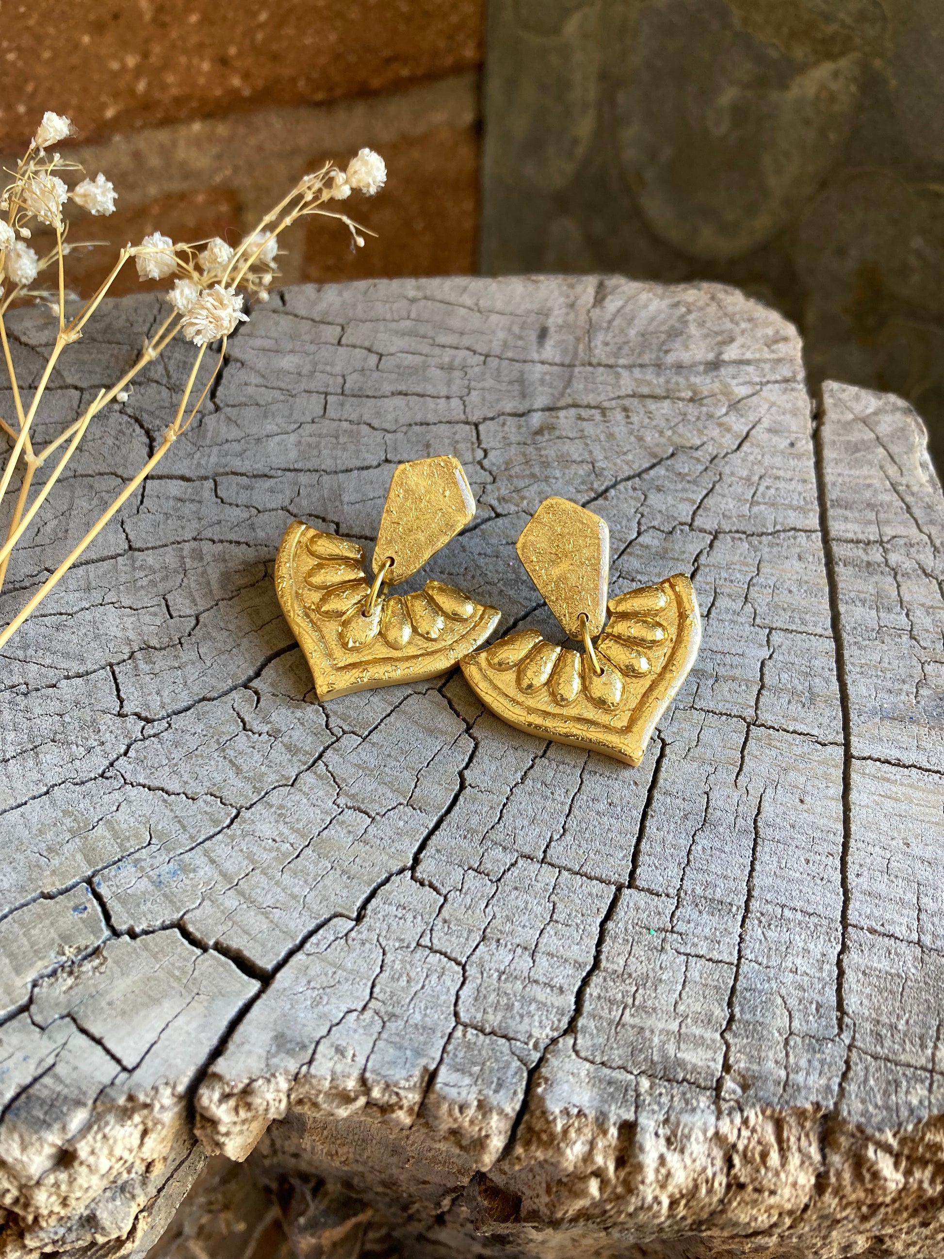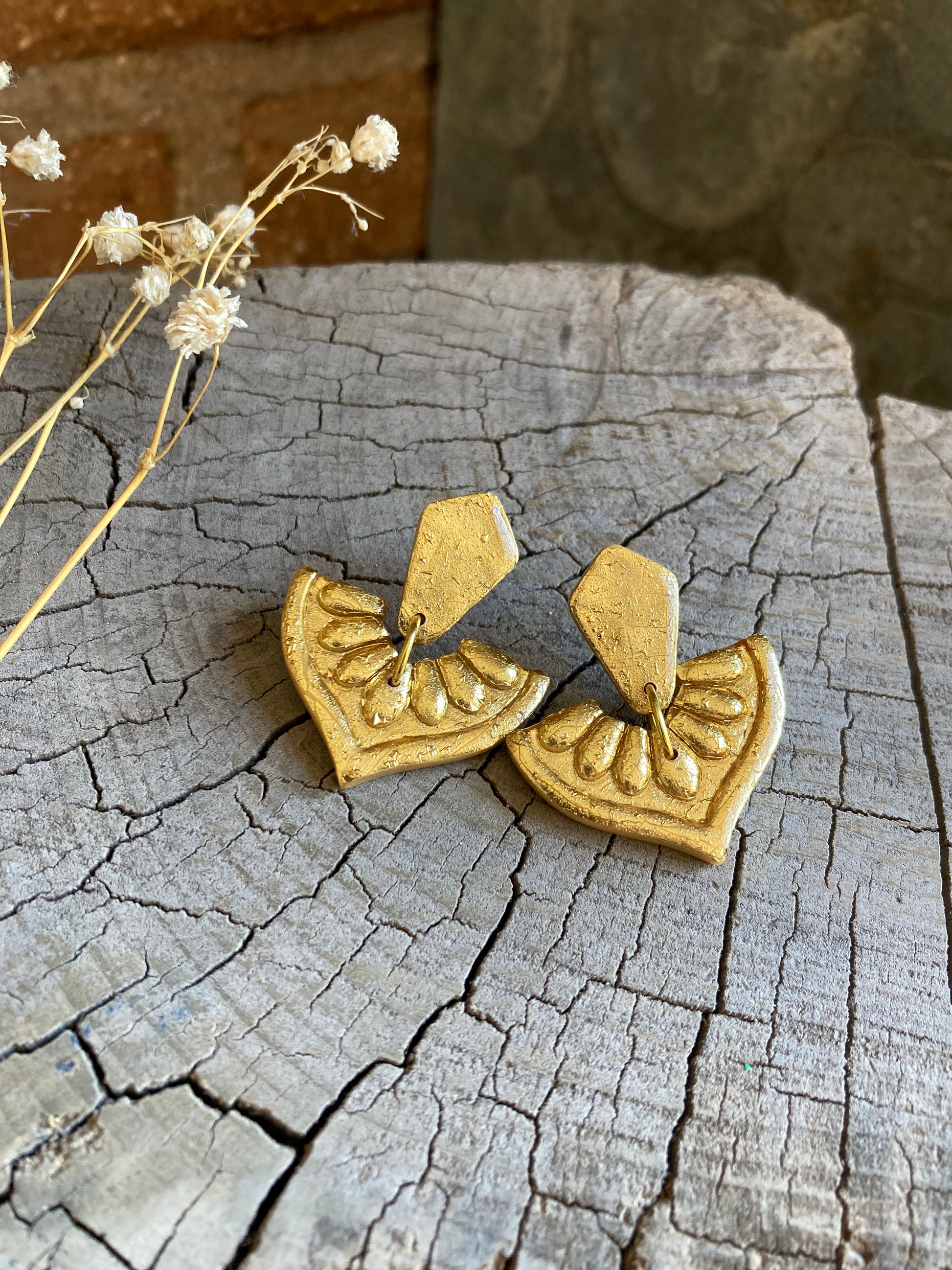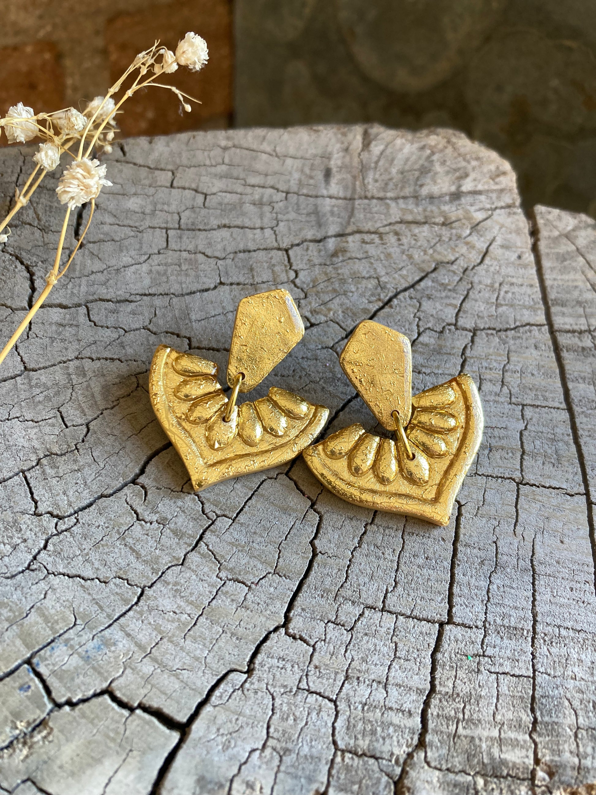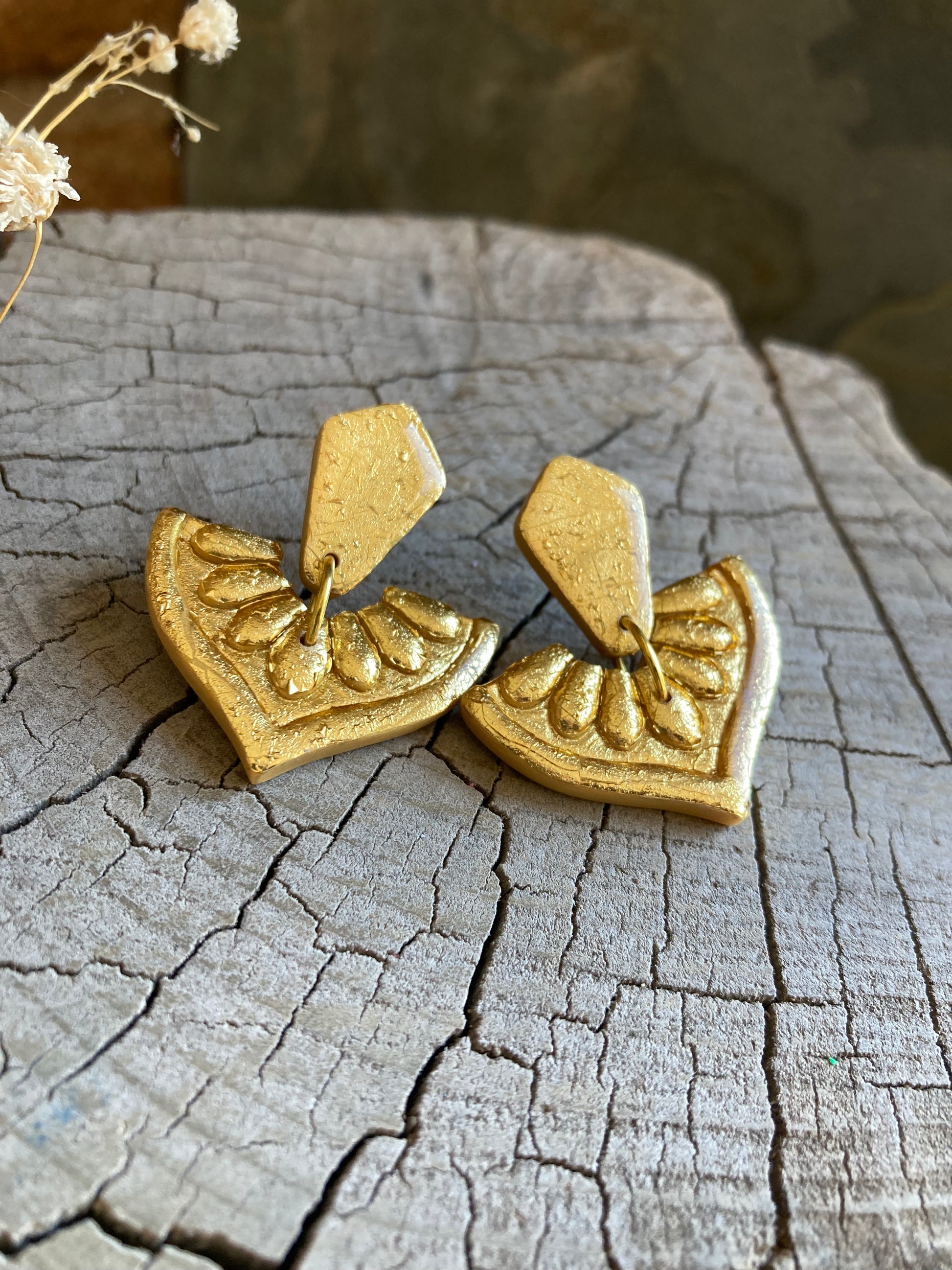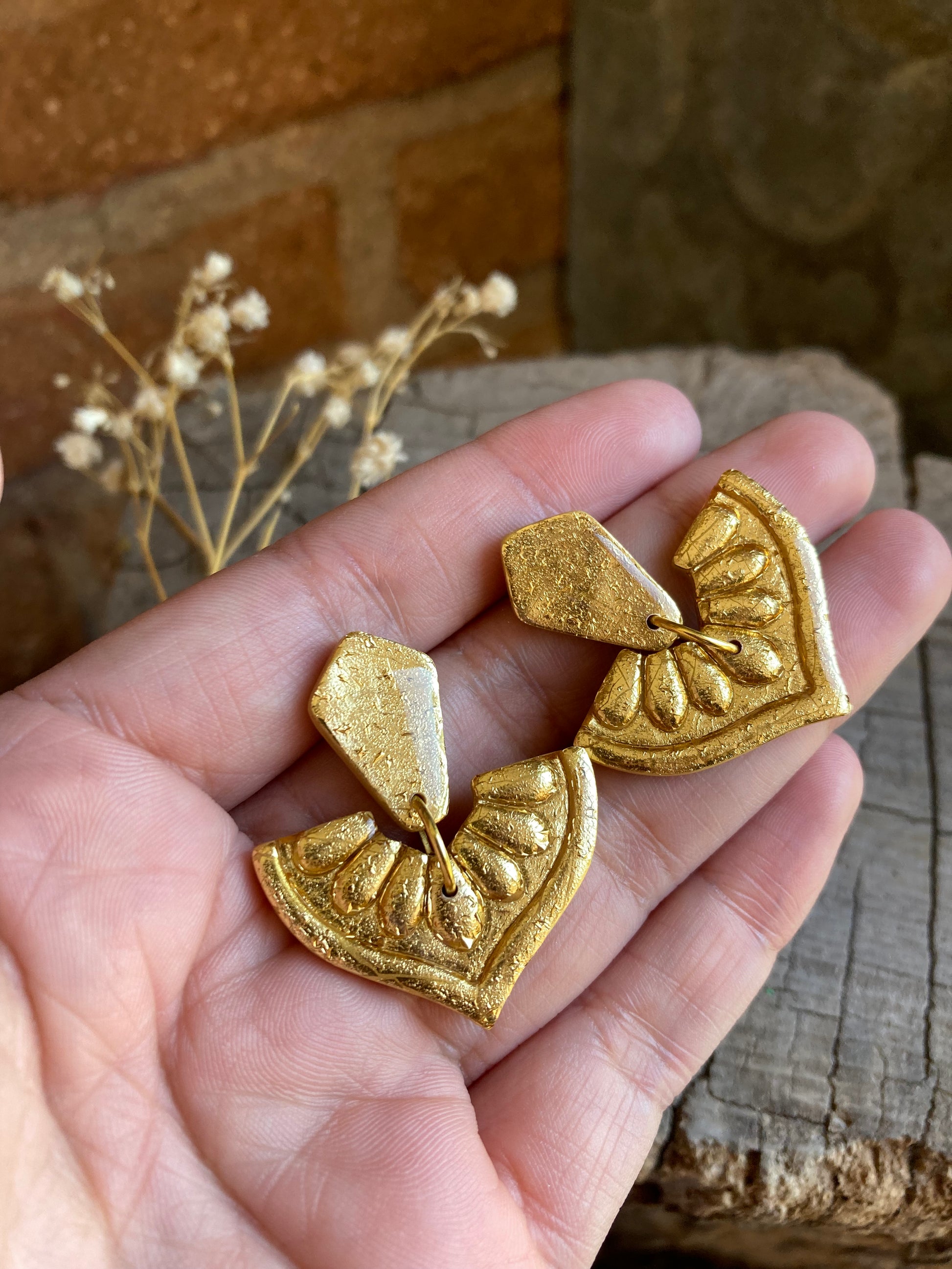 Aros de arcilla polimérica con papel metálico y top coat de resina uv. Miden 3,6 cms. Palito de acero quirúrgico y tope de goma.