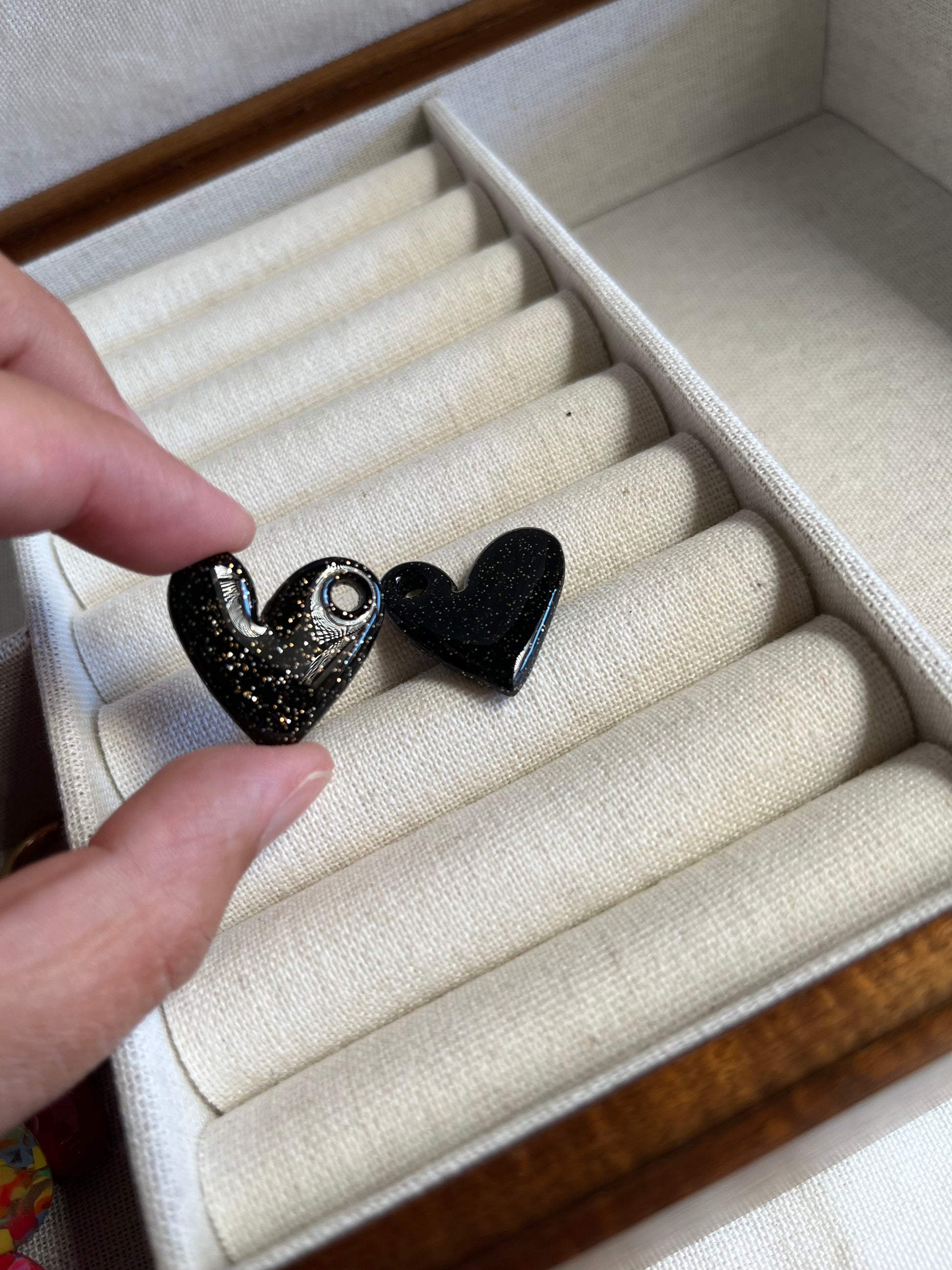 Corazón de arcilla polimérica de 2,5 cms. Glitter y resina UV.