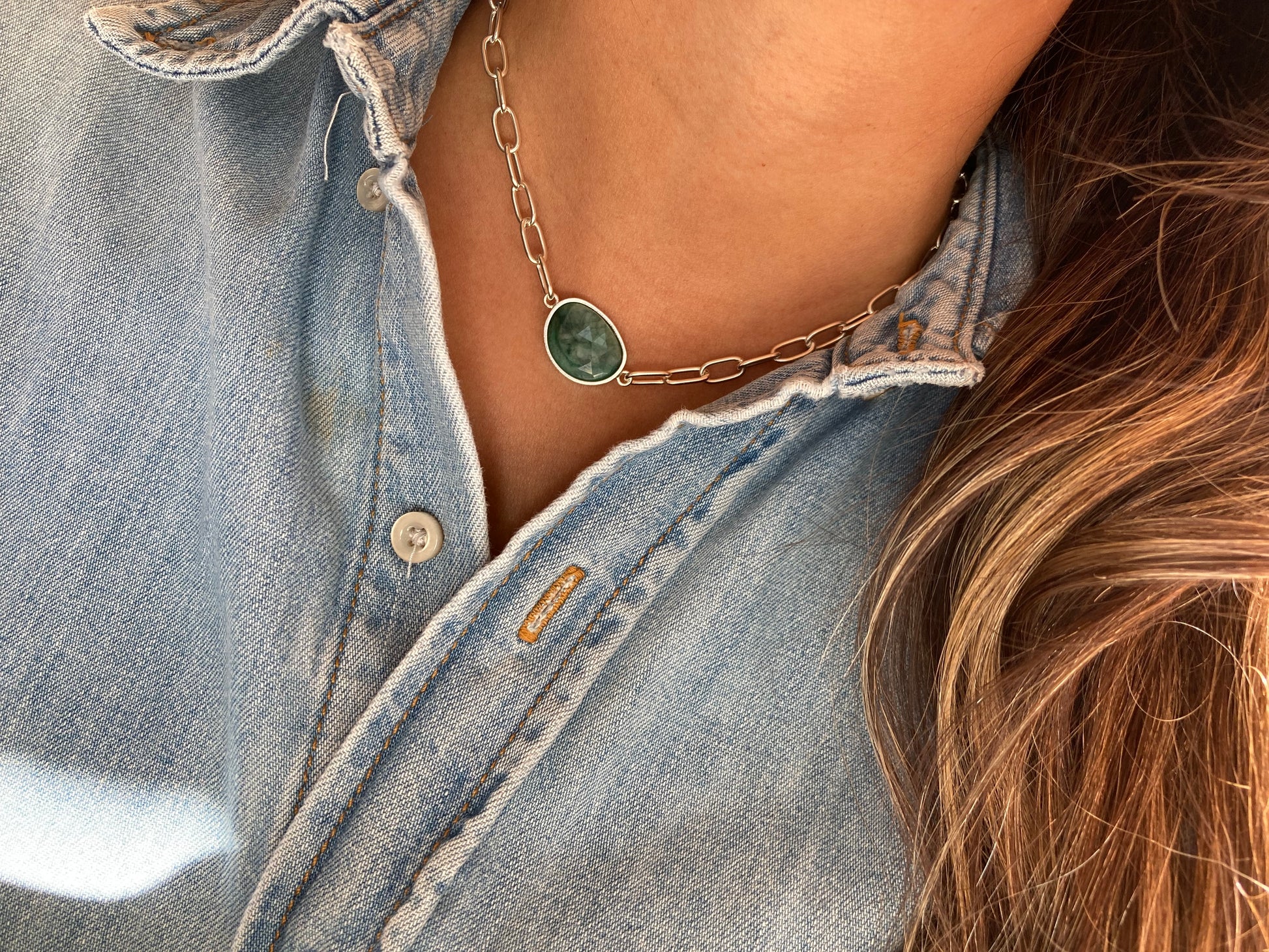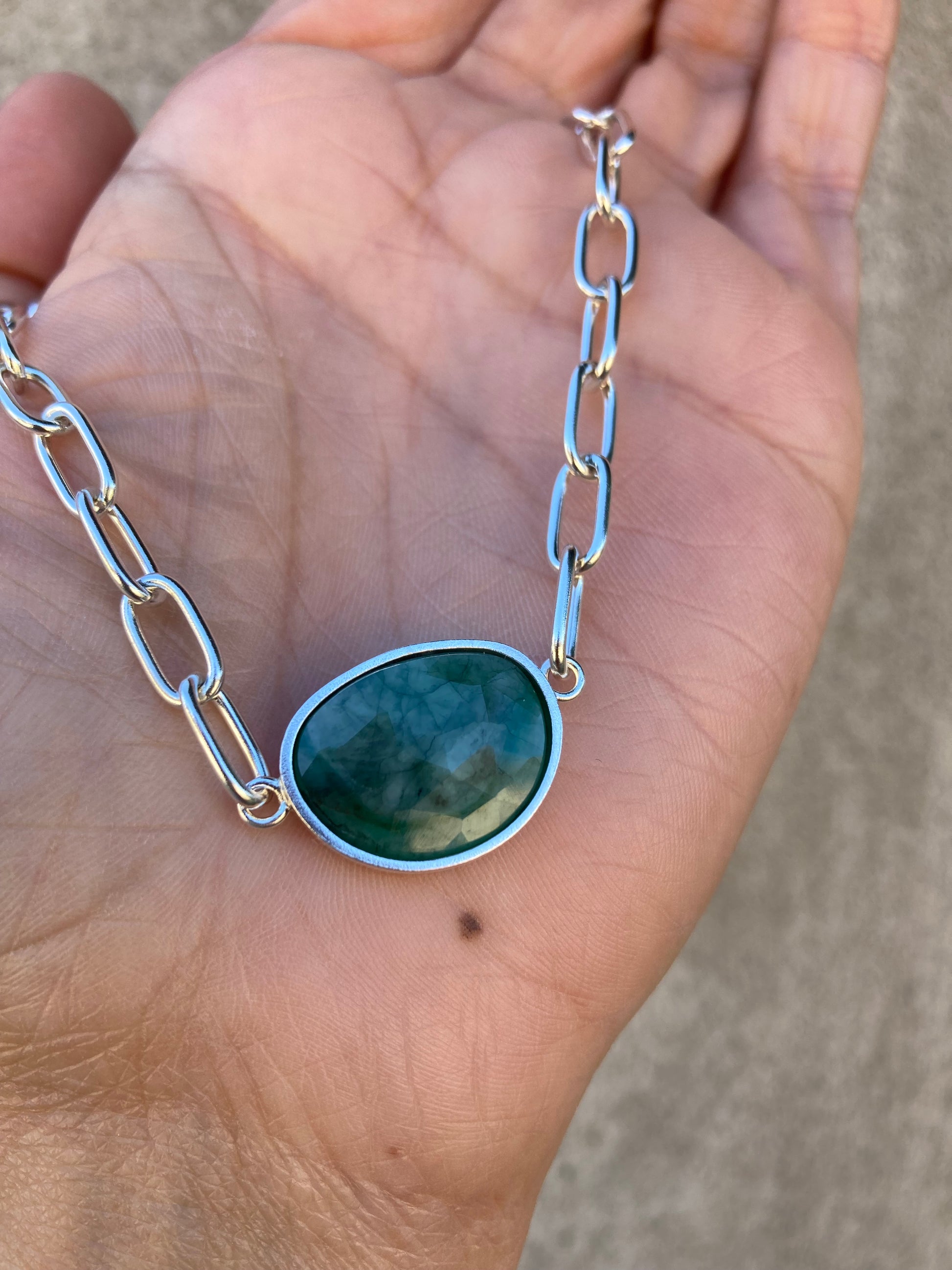 Collar de eslabones en plata 980 y esmeralda natural. Mide 38 cms + 2 cms de extensión.