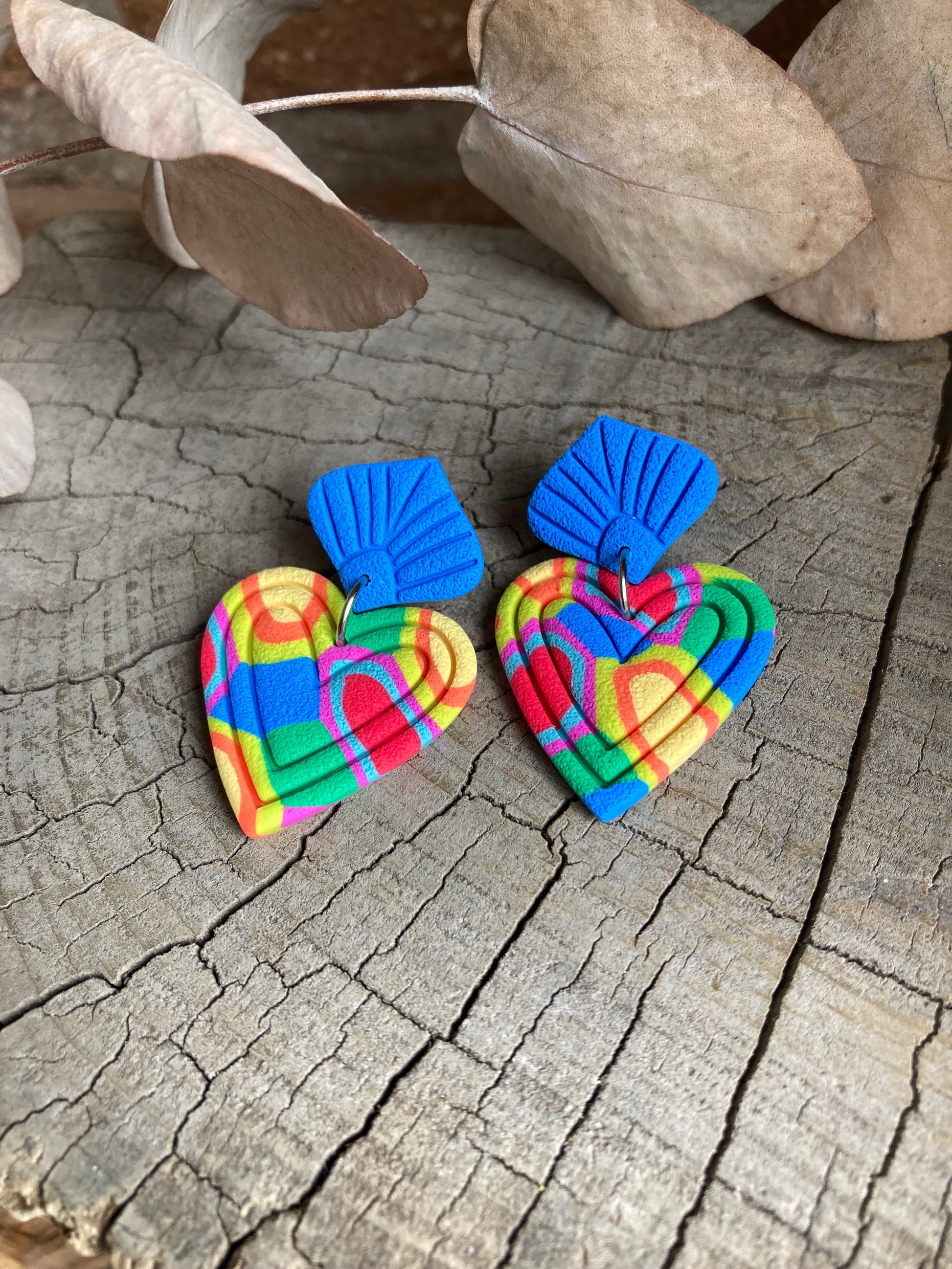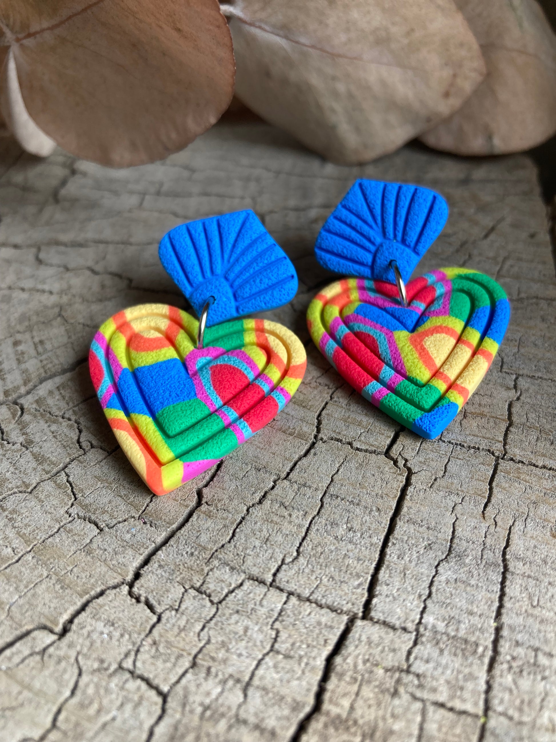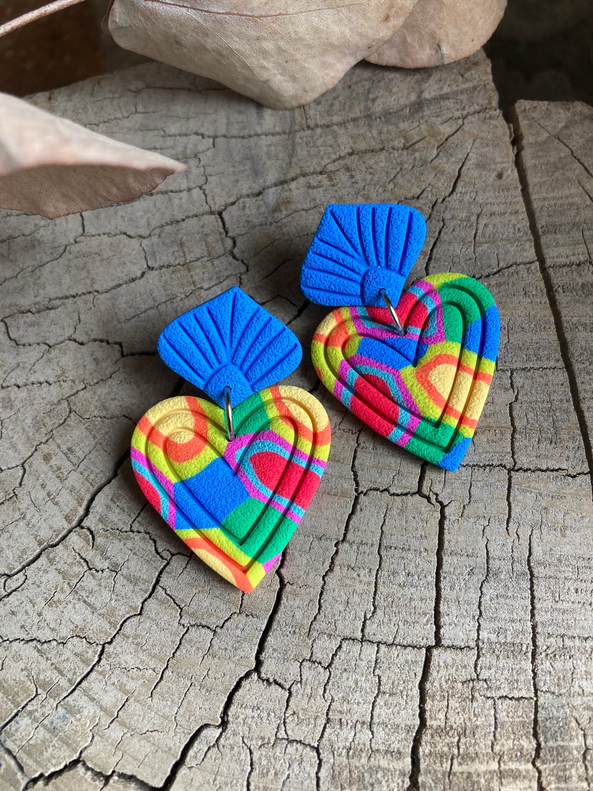 Aros de arcilla polimérica con textura. Miden 4,5 cms. Palito de acero quirúrgico y tope de goma.