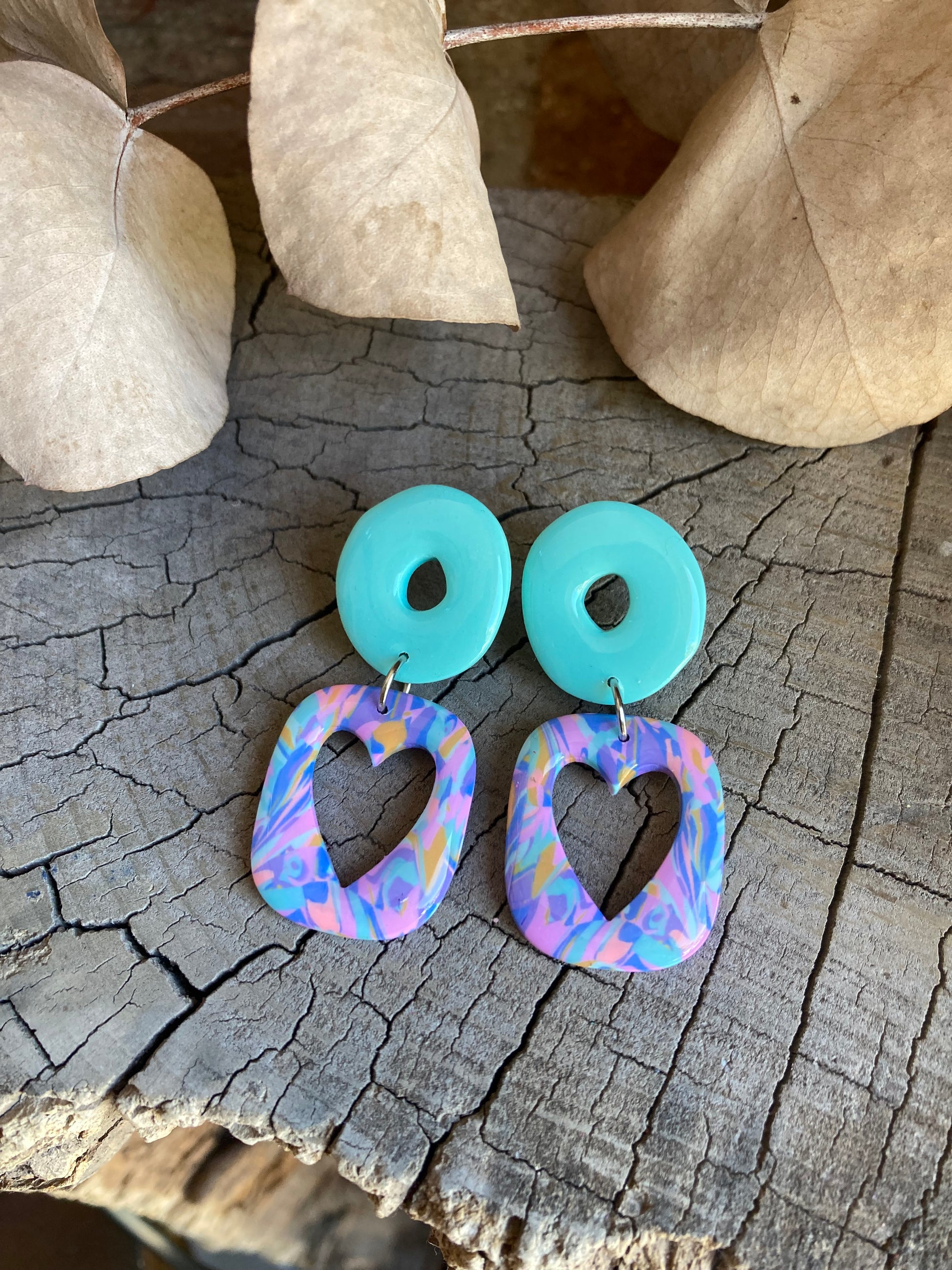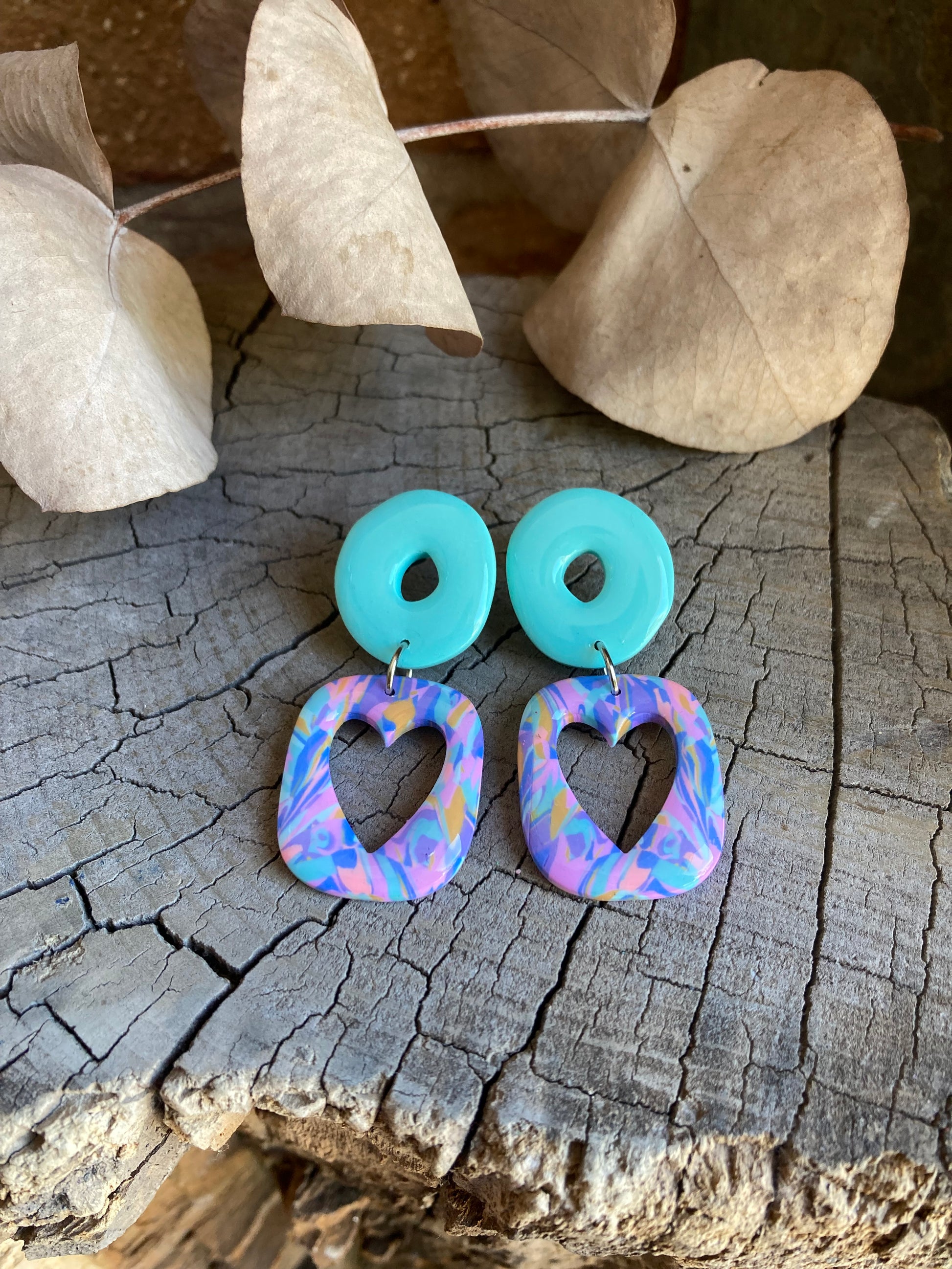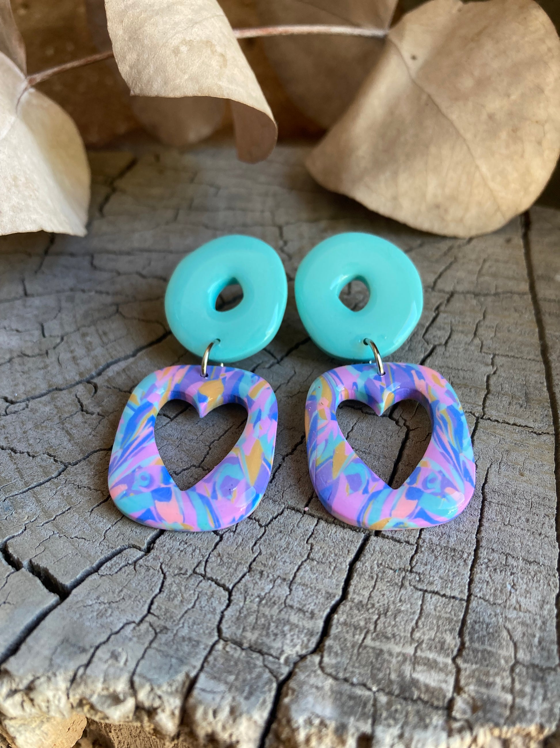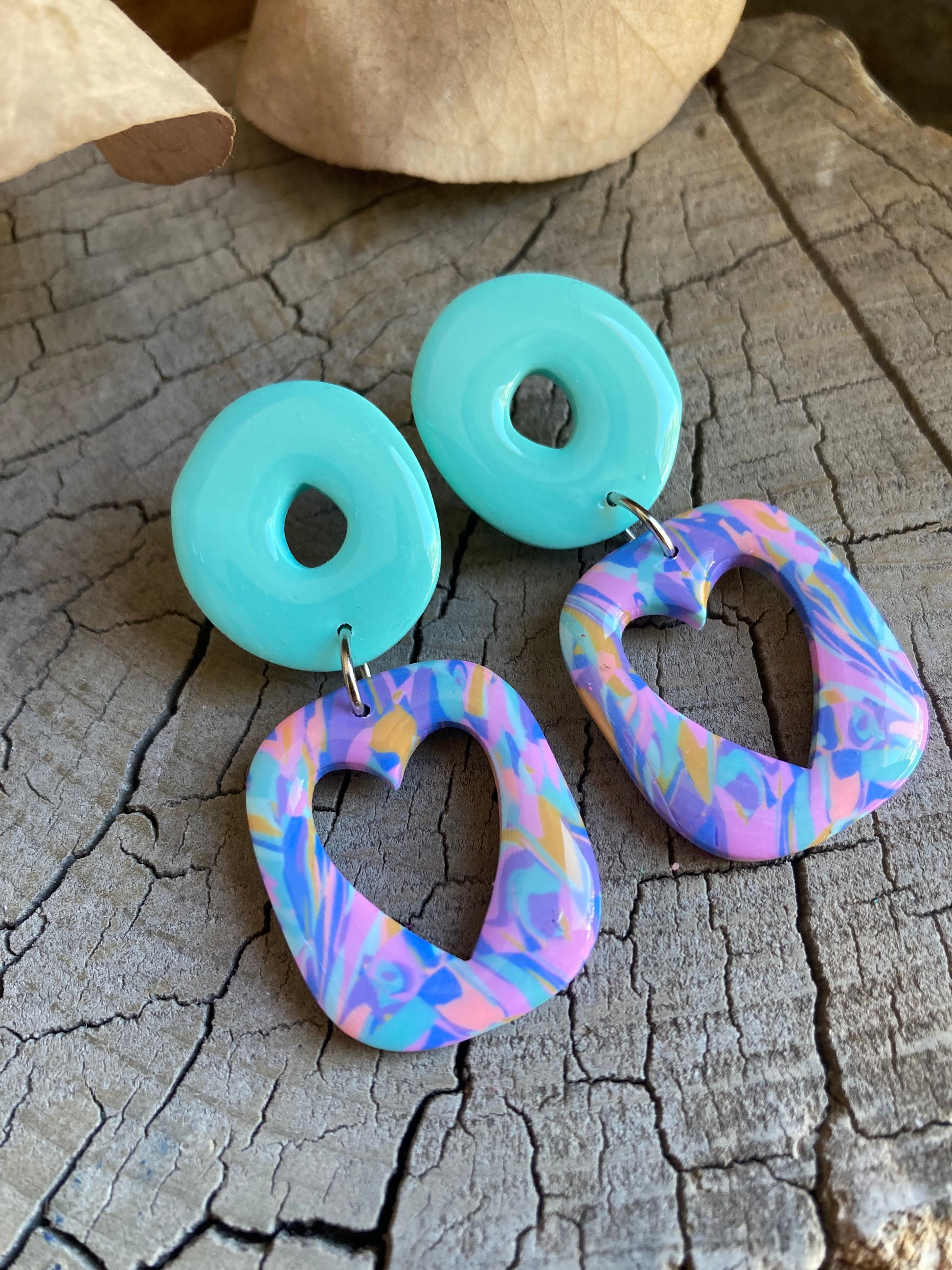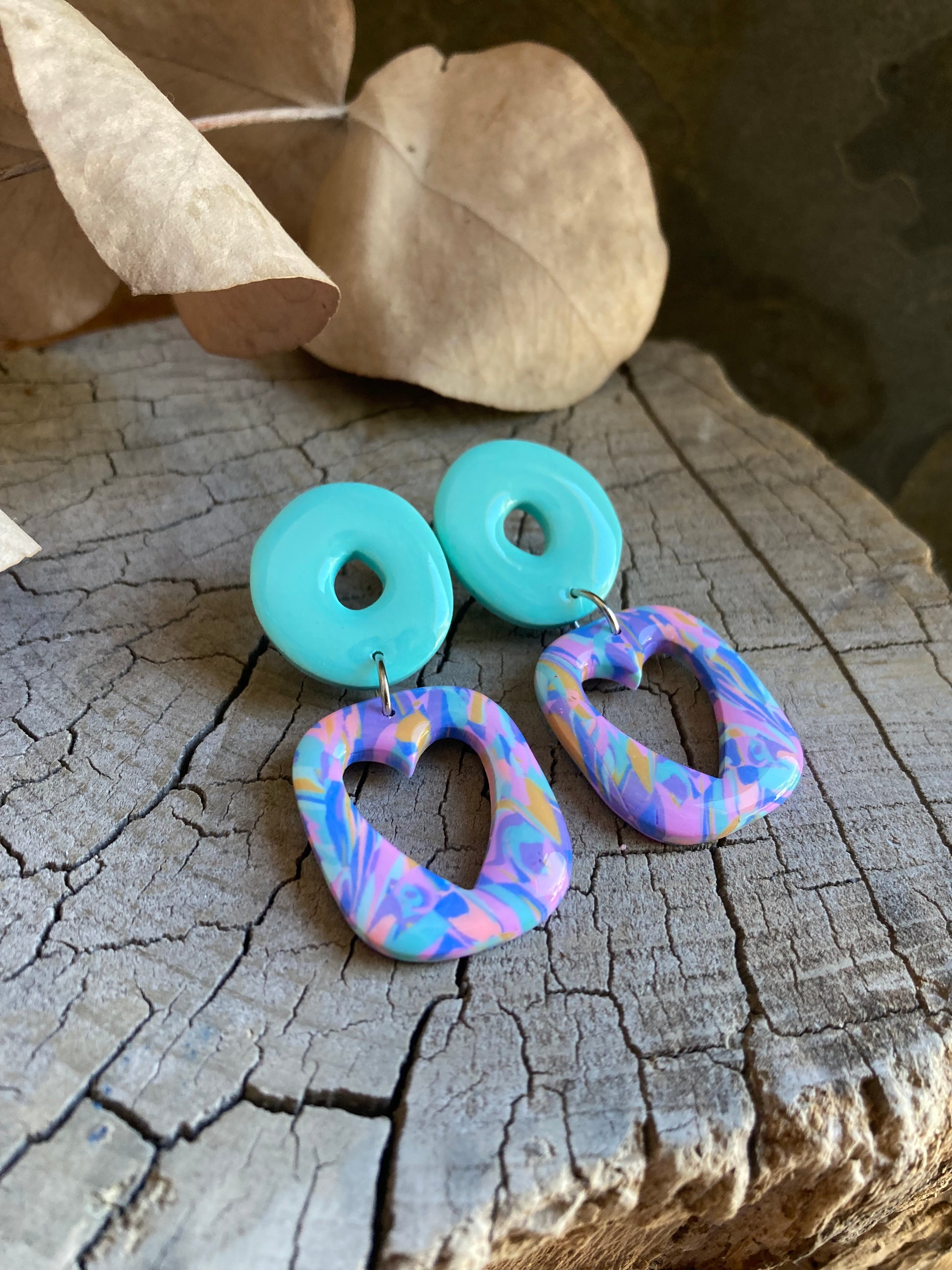 Aros de arcilla polimérica con top coat de resina uv. Miden 5,2 cms. Palito de acero quirúrgico y tope de goma.