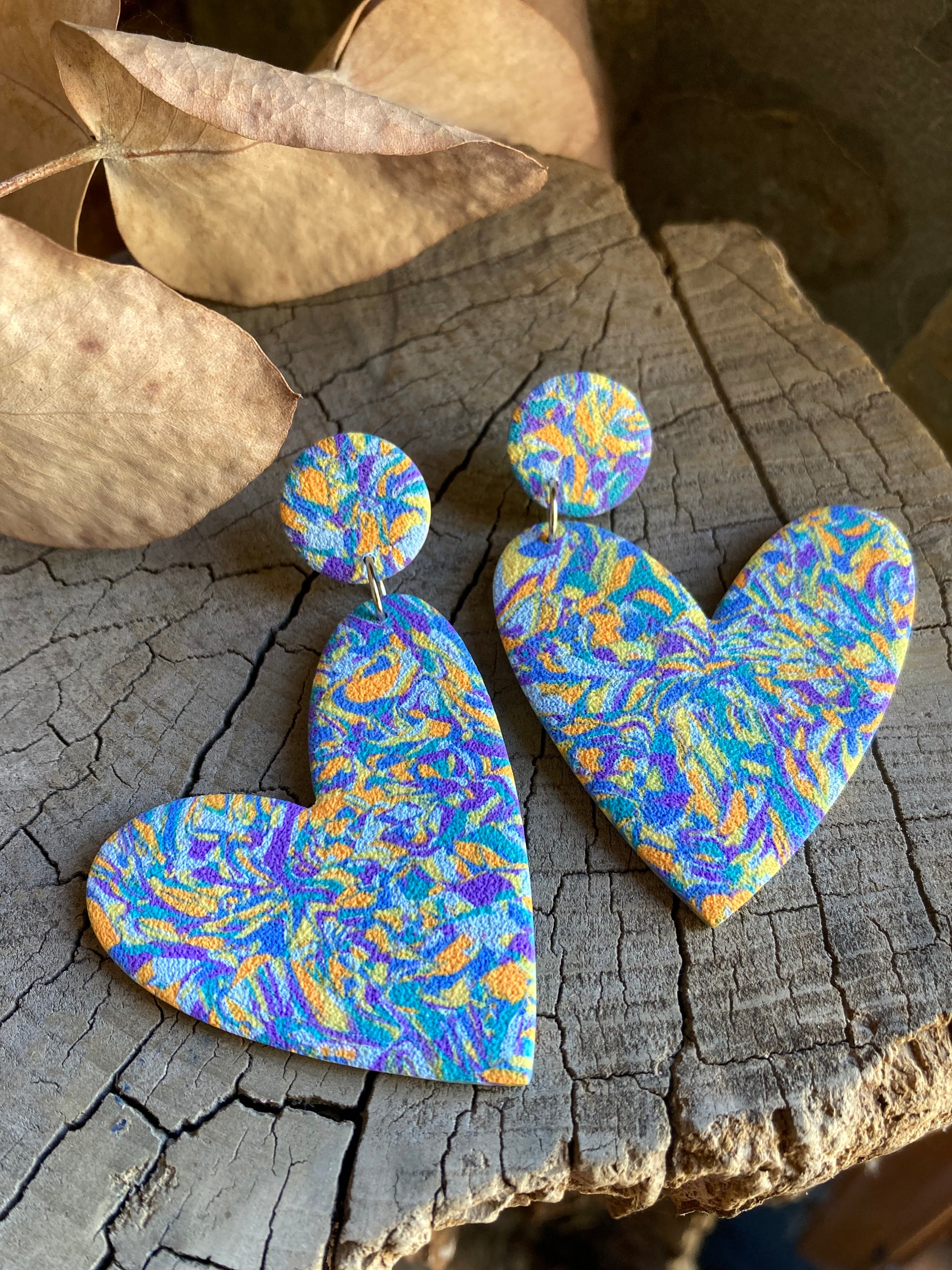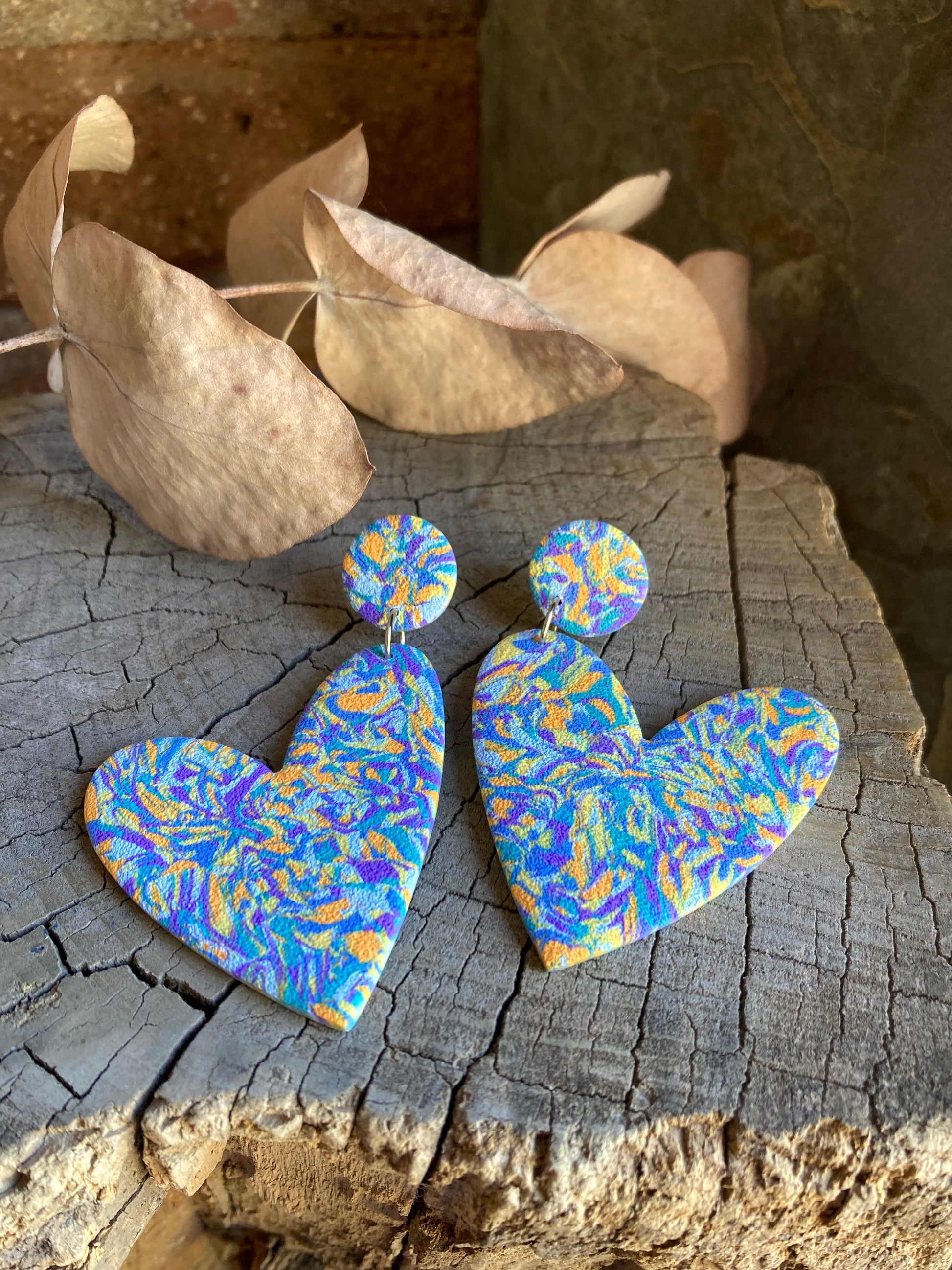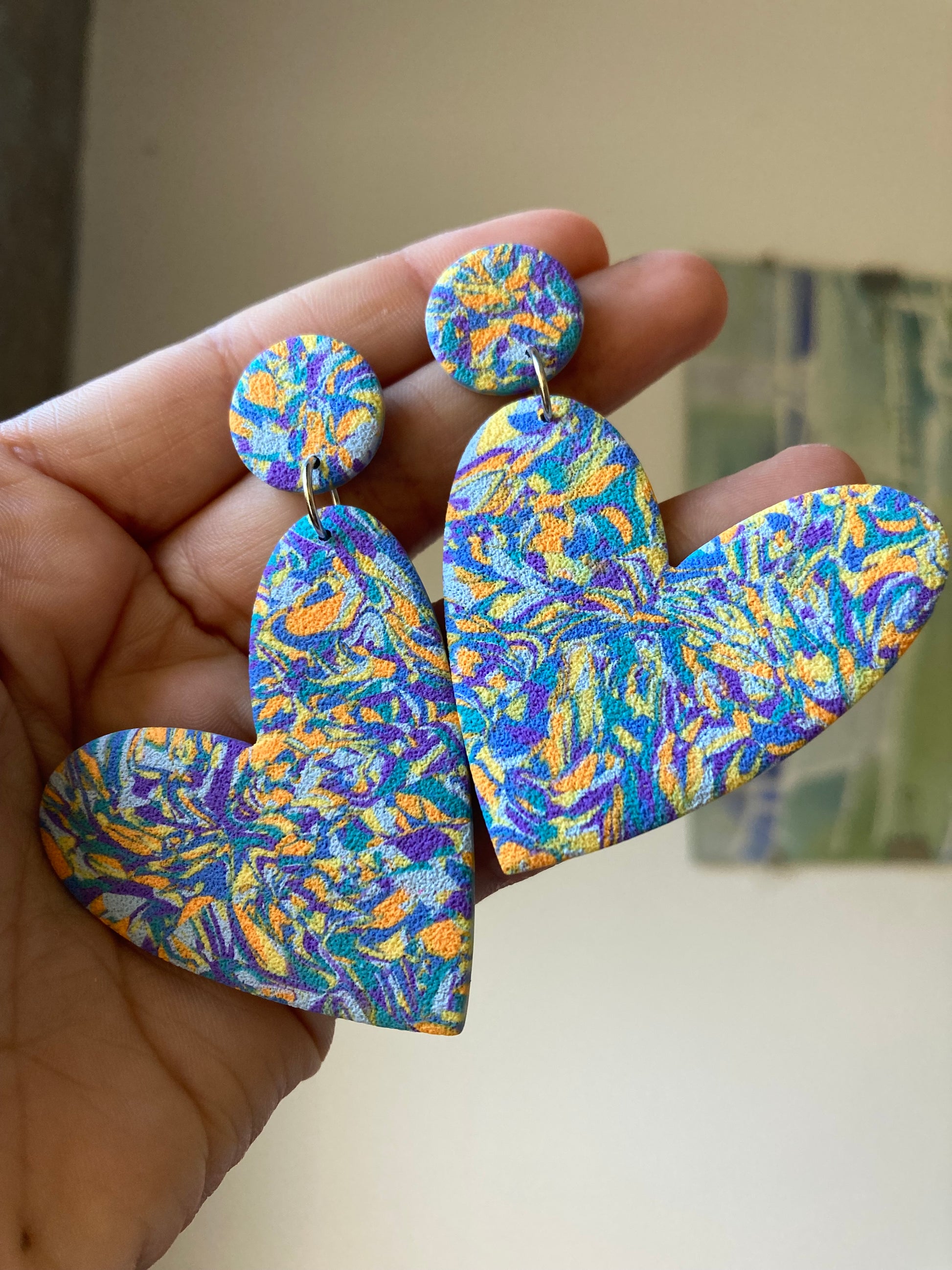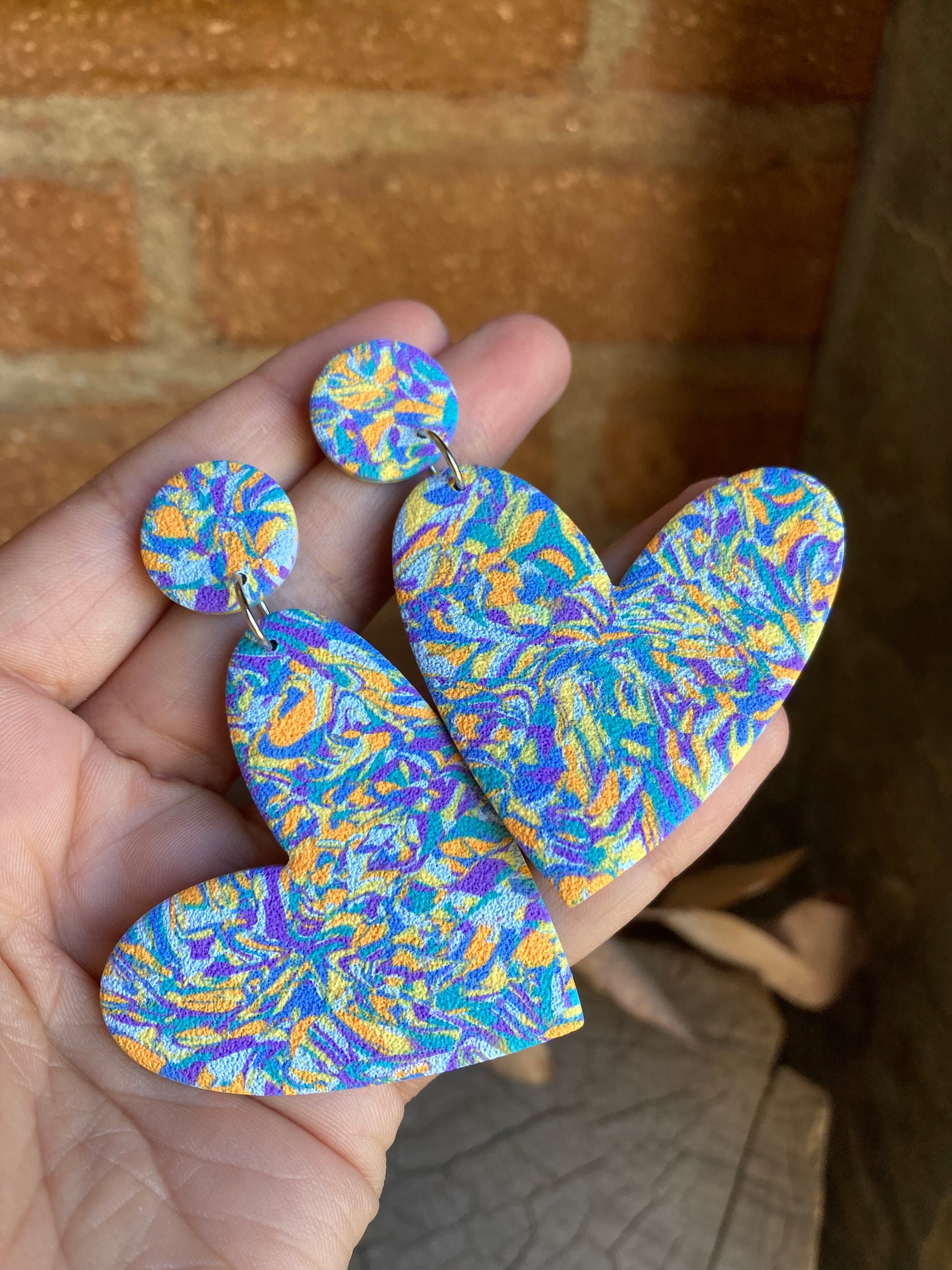 Aros de arcilla polimérica con textura. Miden 7 cms. Palito de acero quirúrgico y tope de goma.