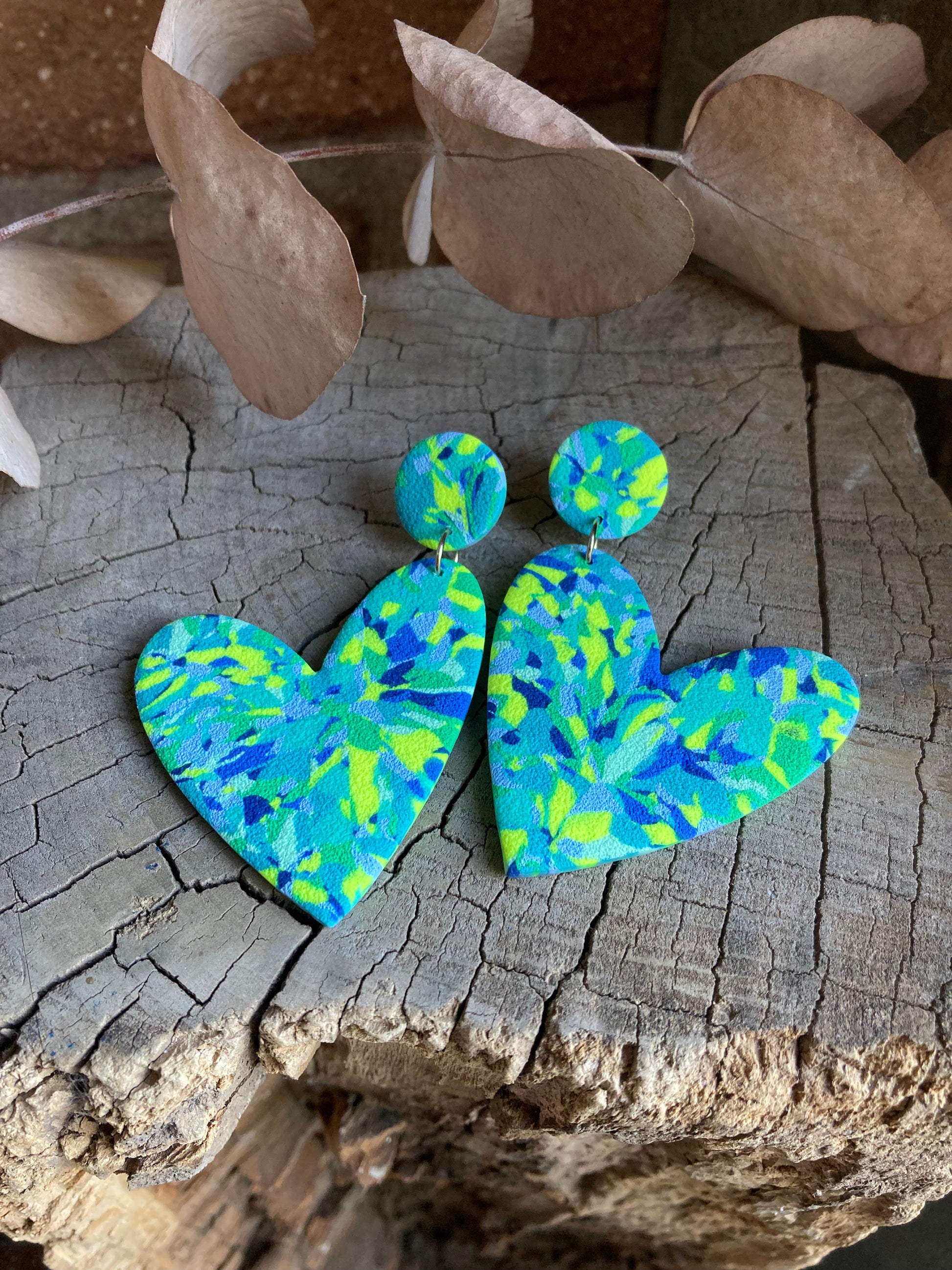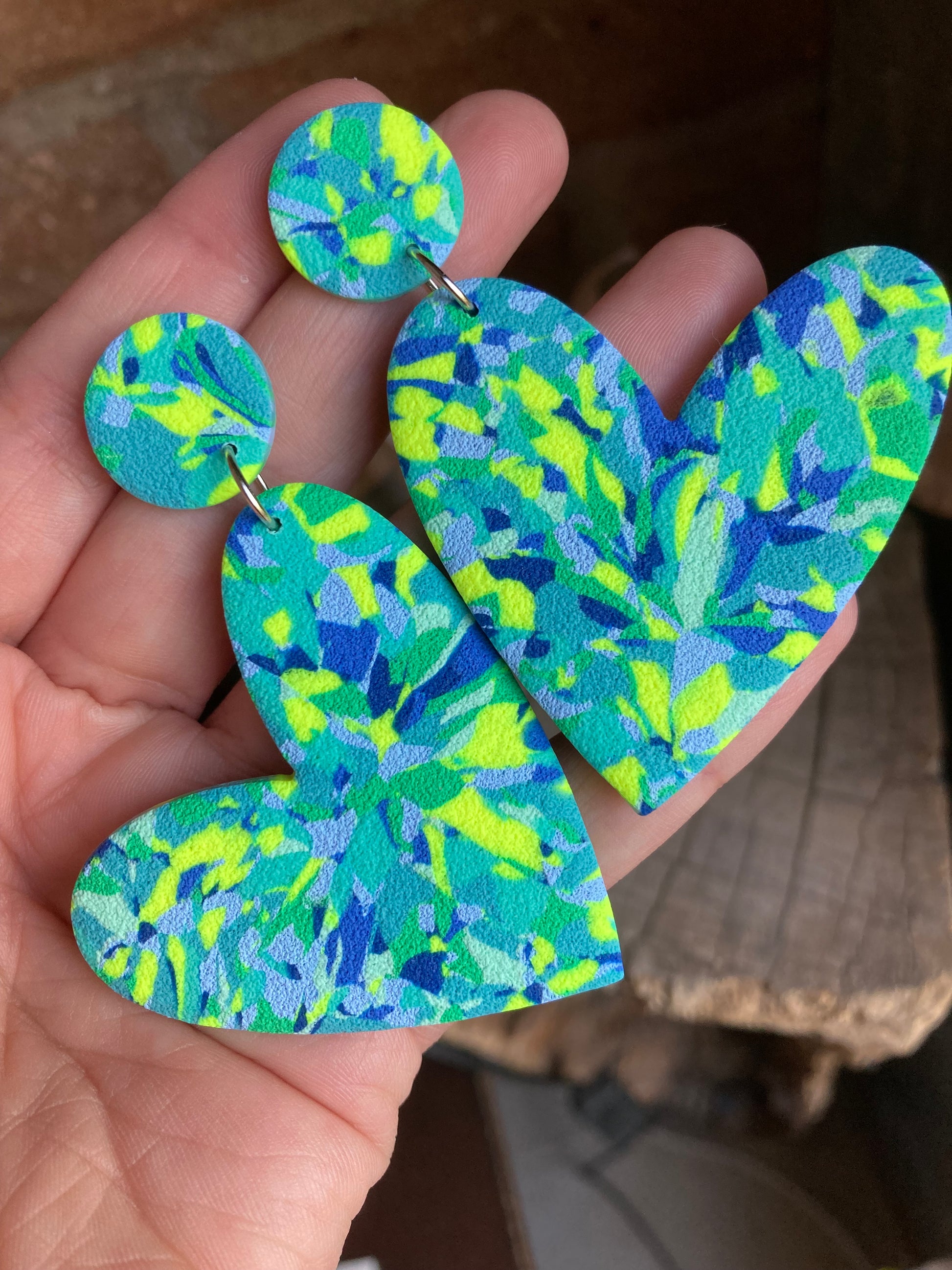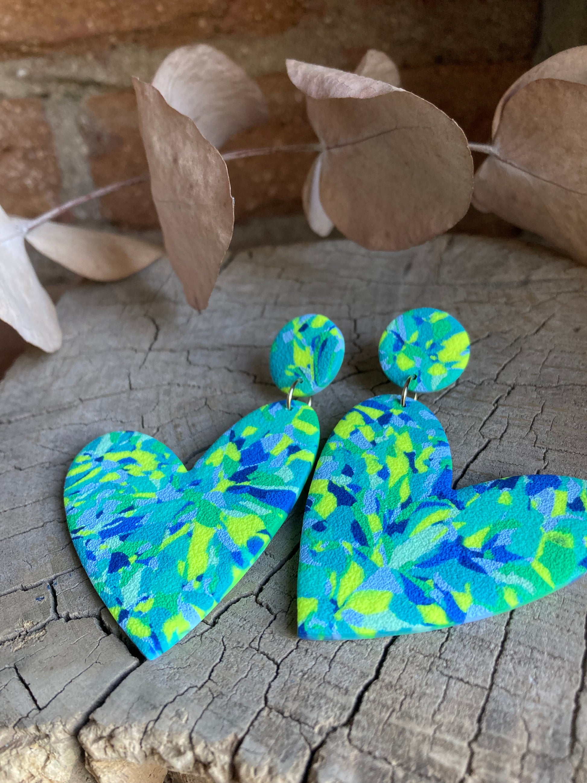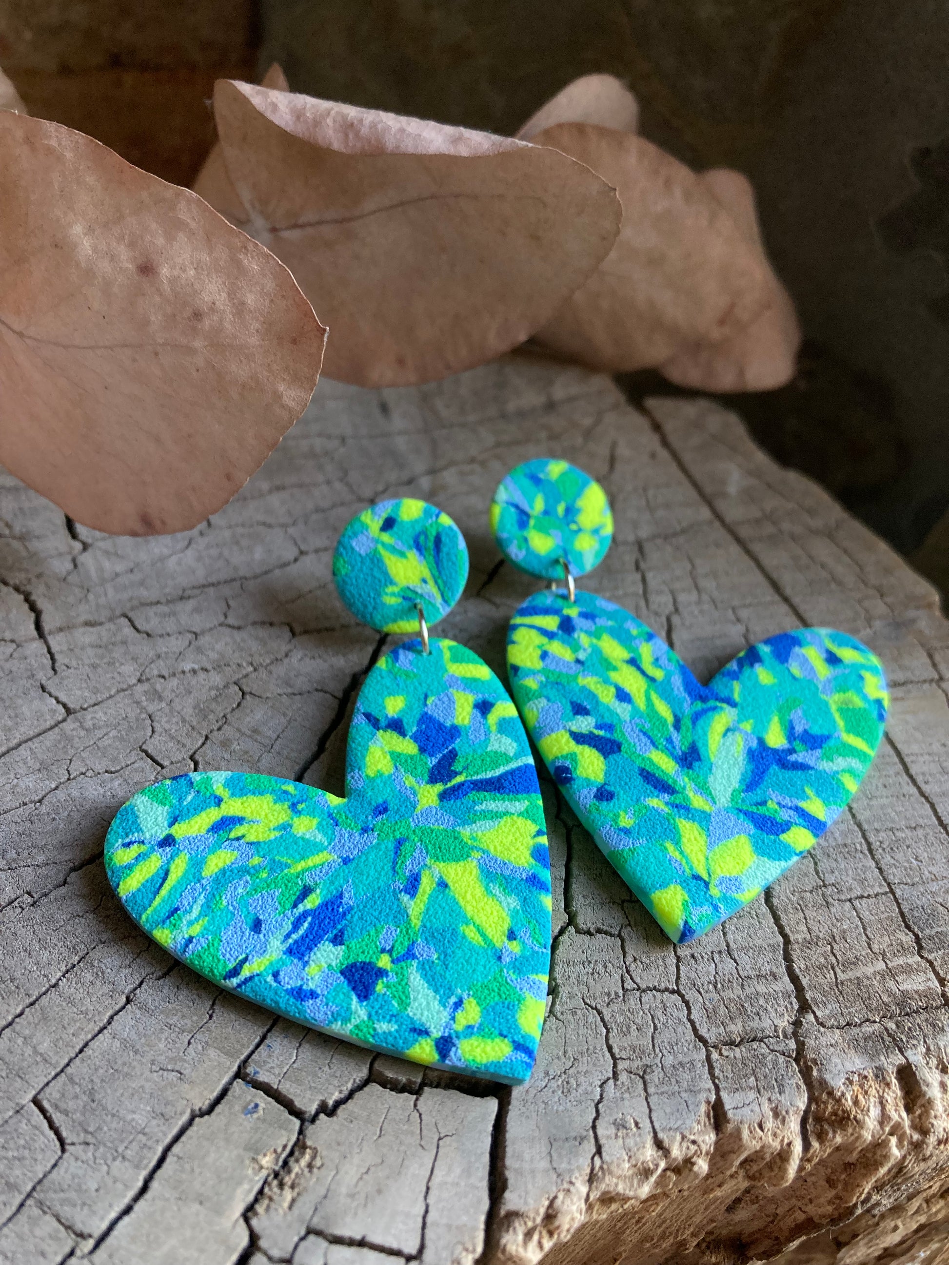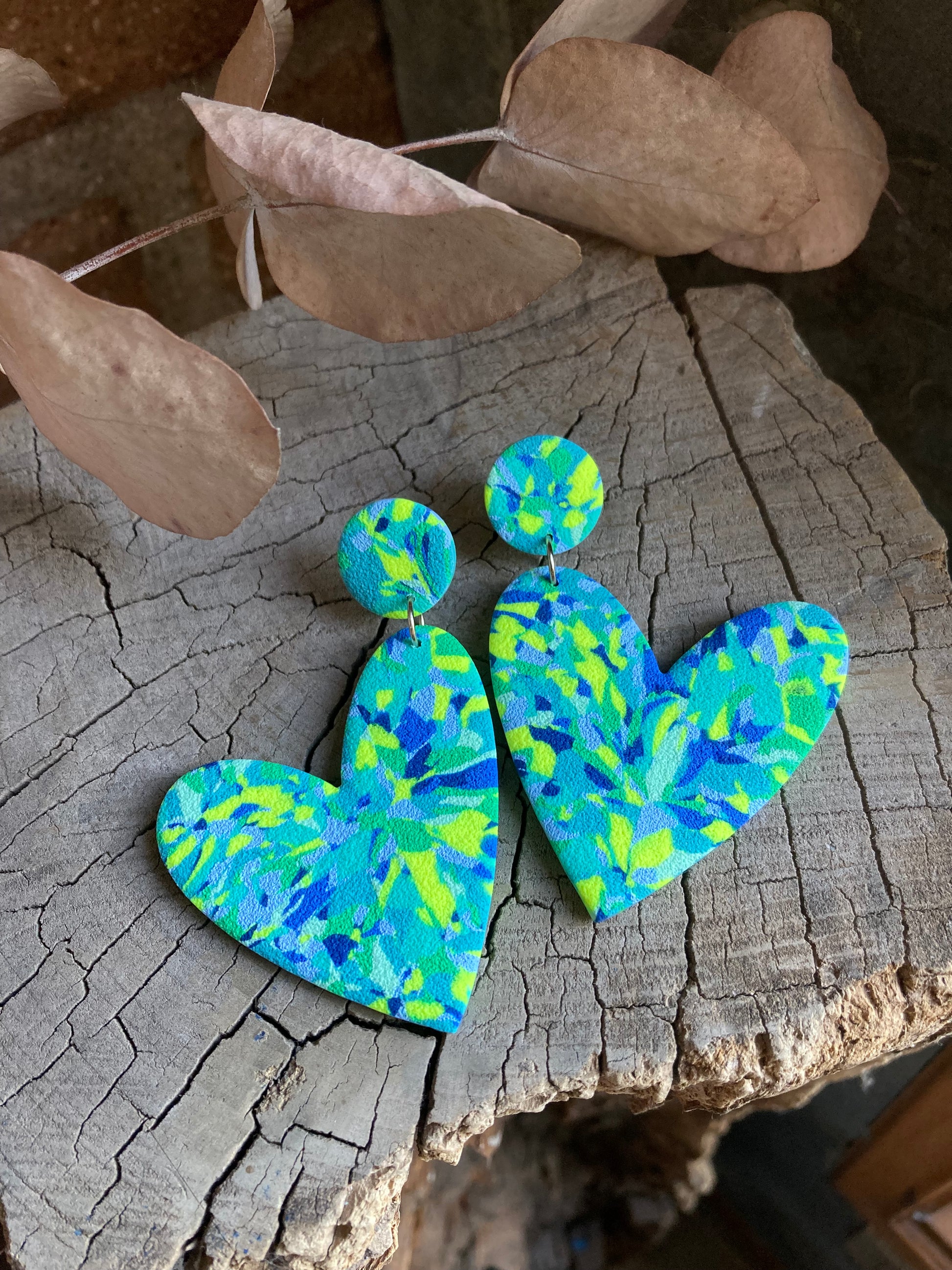 Aros de arcilla polimérica con textura. Miden 7 cms. Palito de acero quirúrgico y tope de goma.