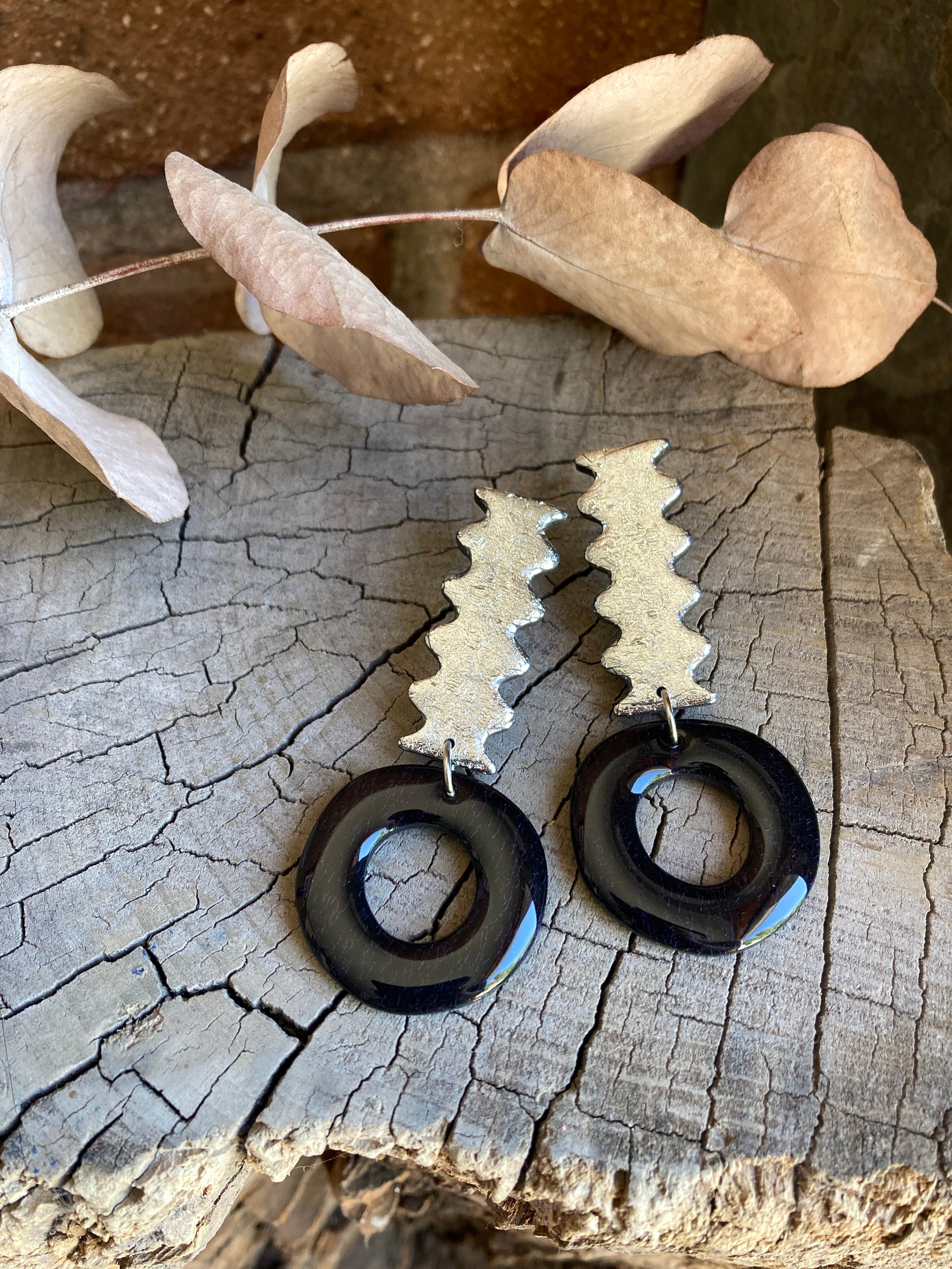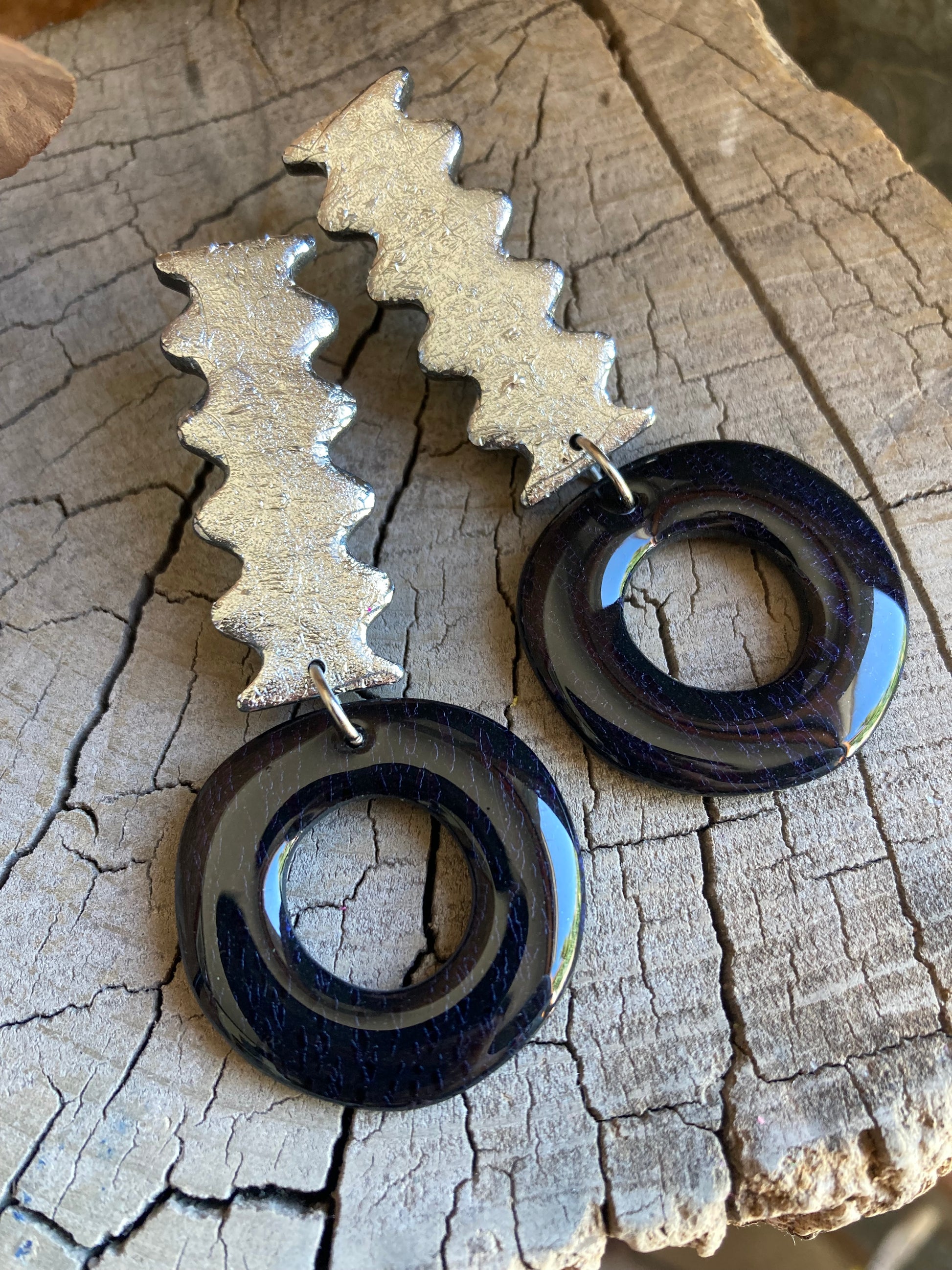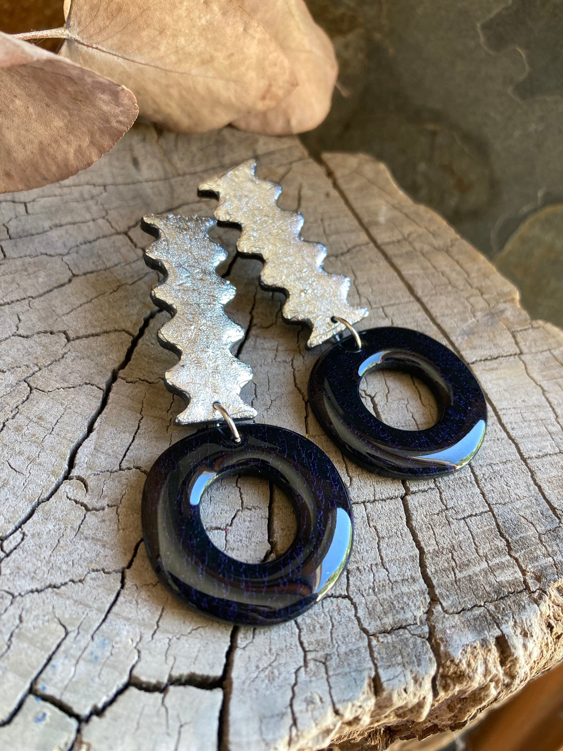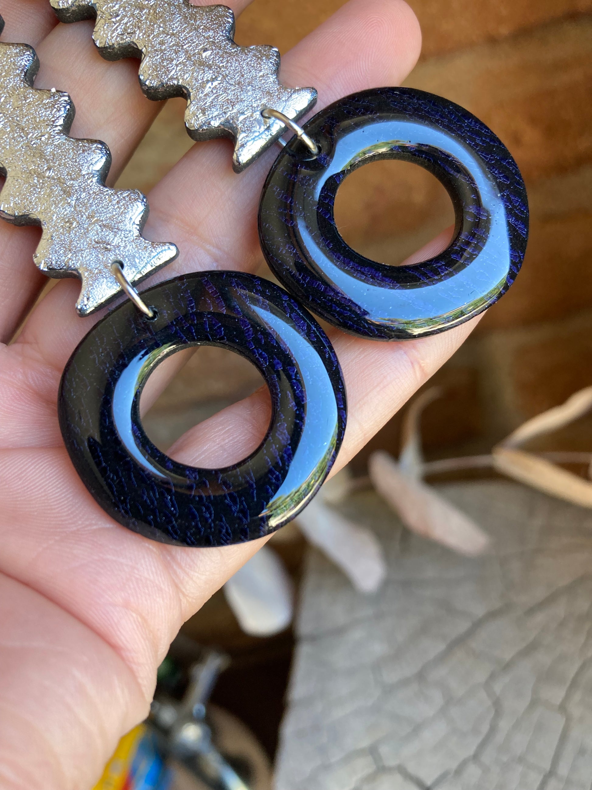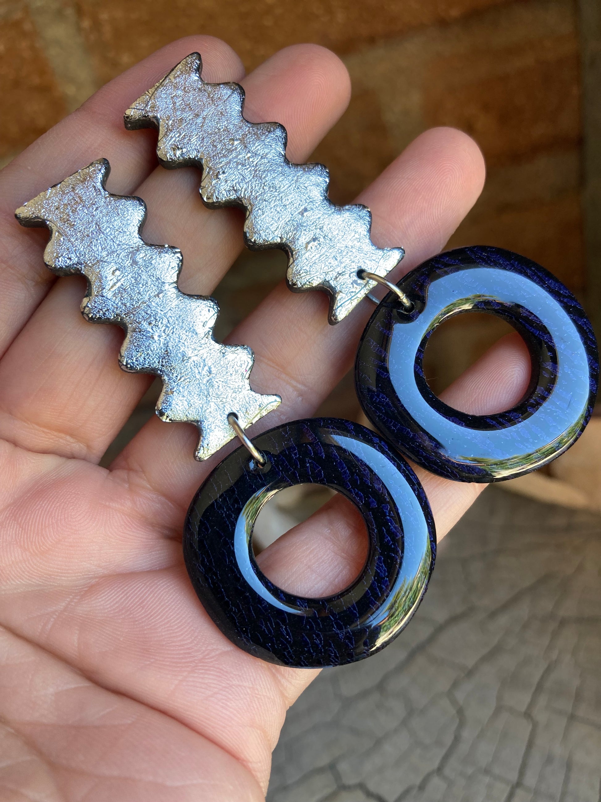 Aros de arcilla polimérica con top coat de resina uv. Miden 7,2 cms. Palito de acero quirúrgico y tope de goma.