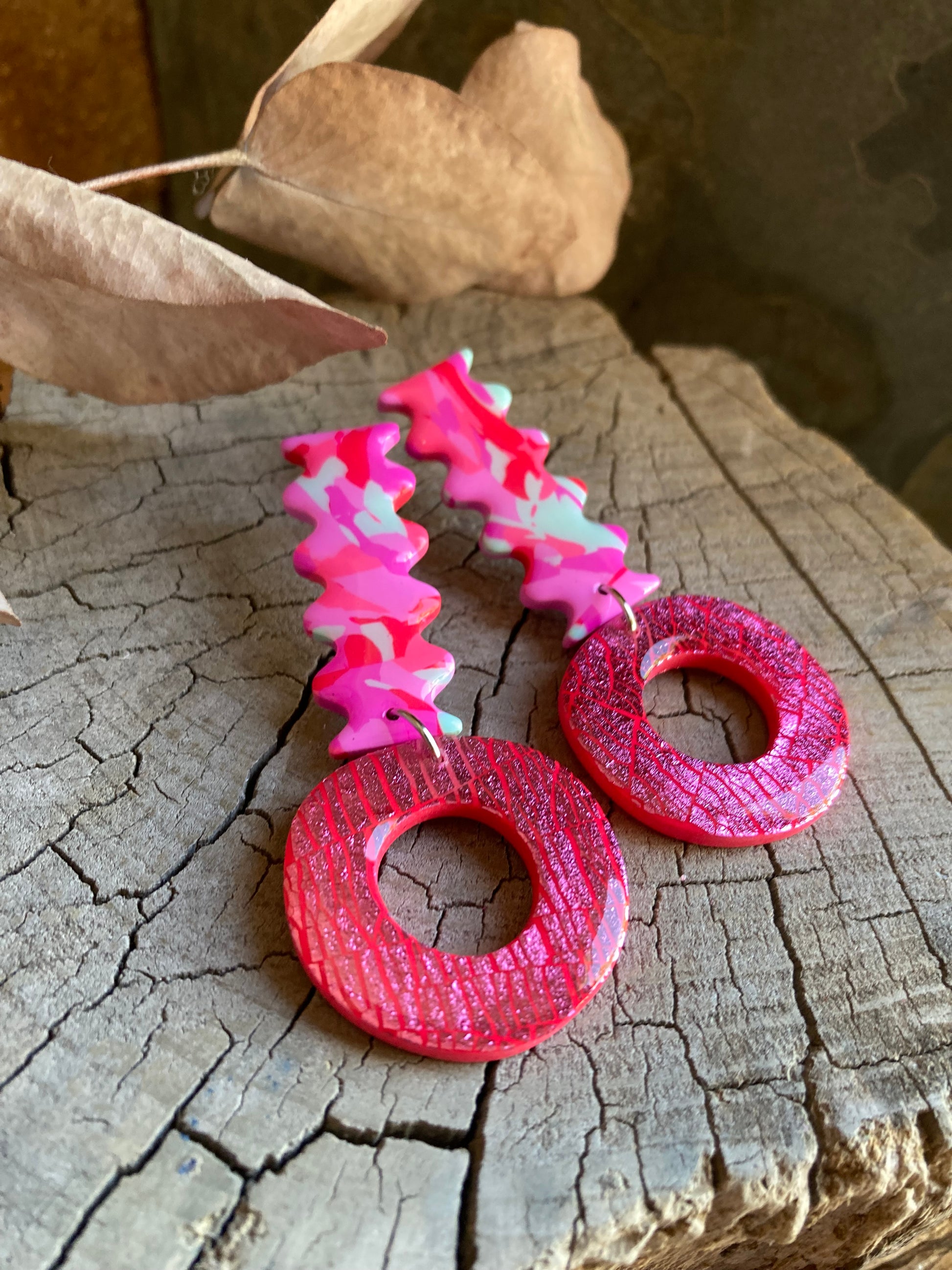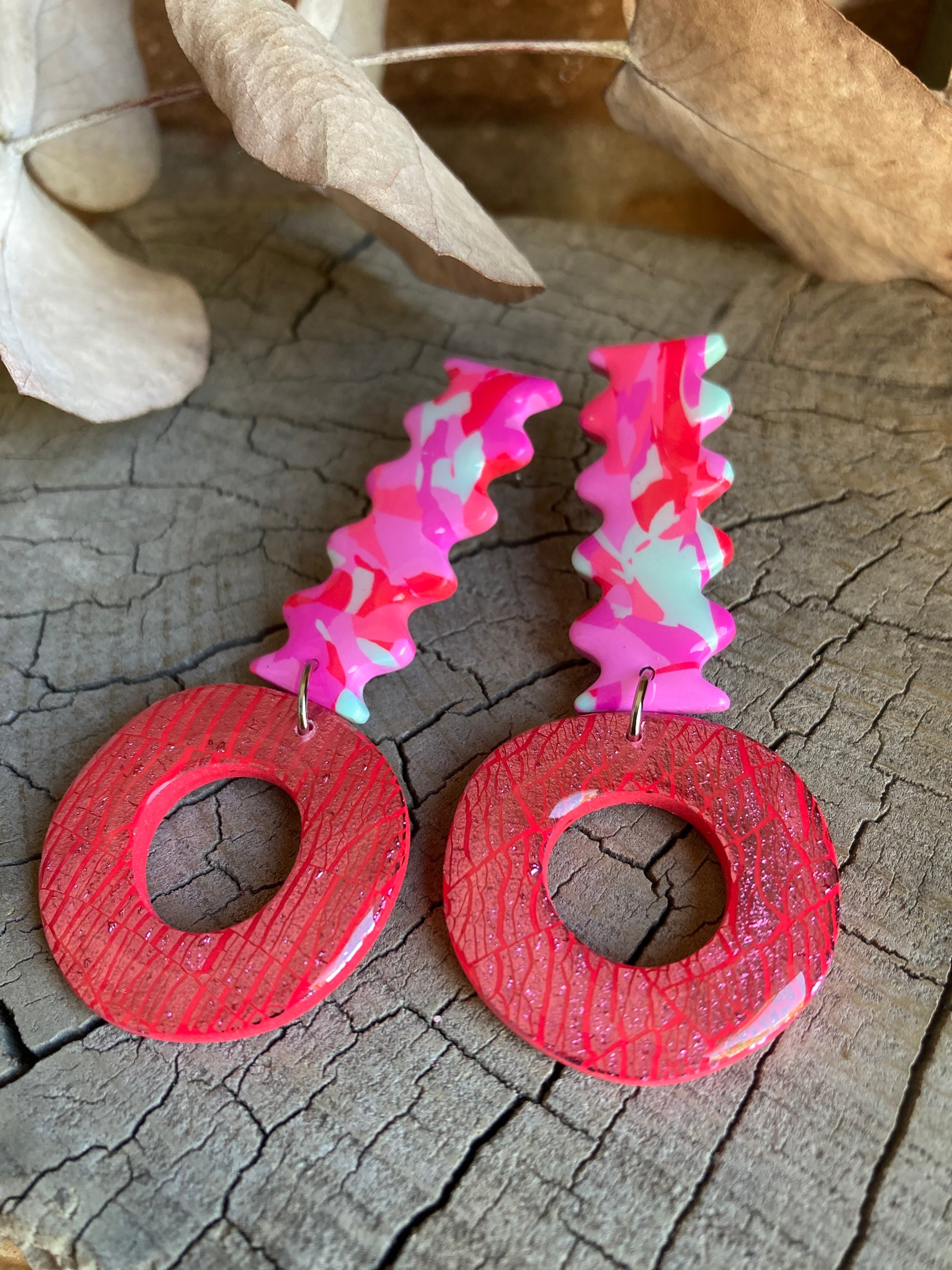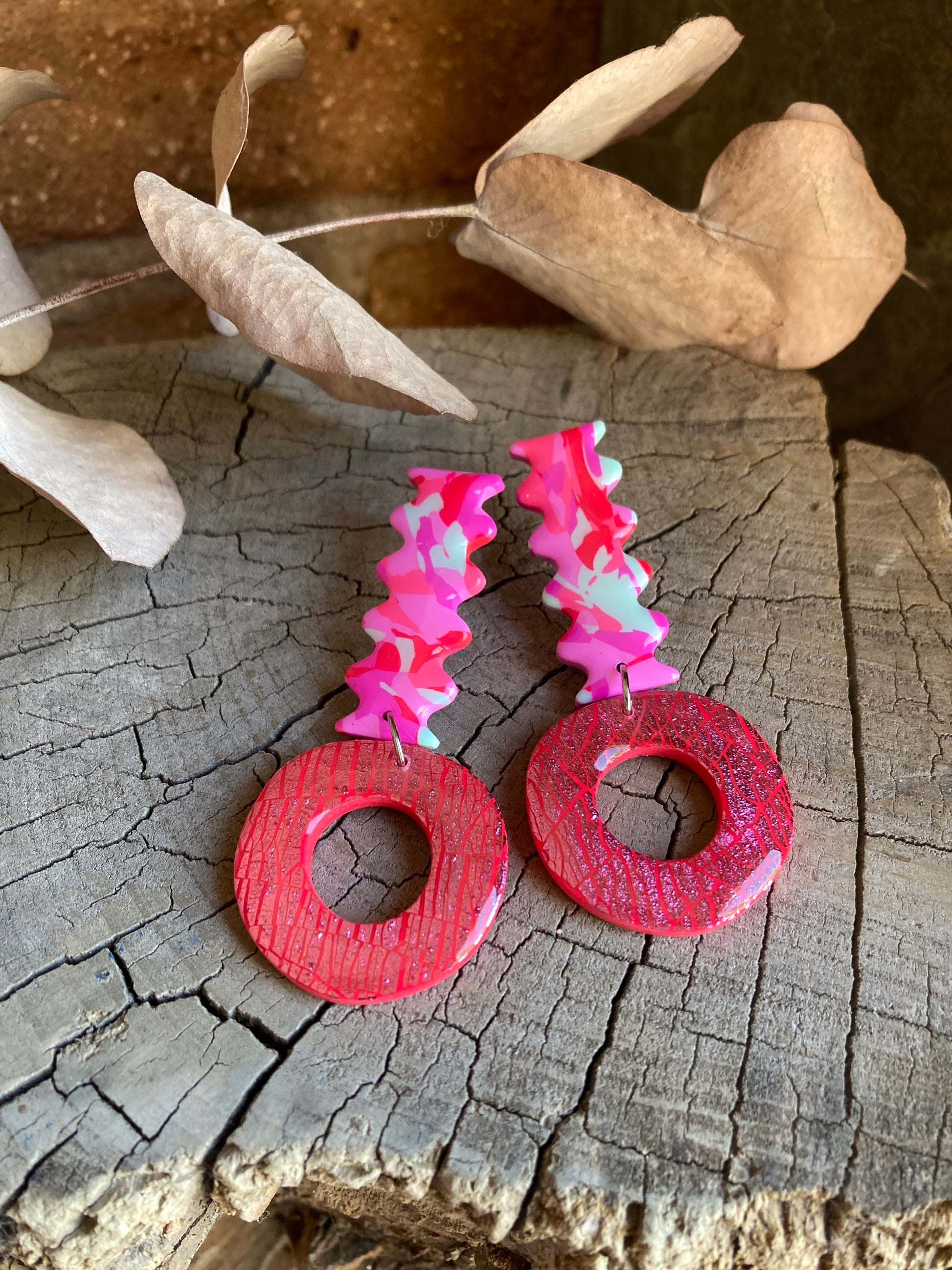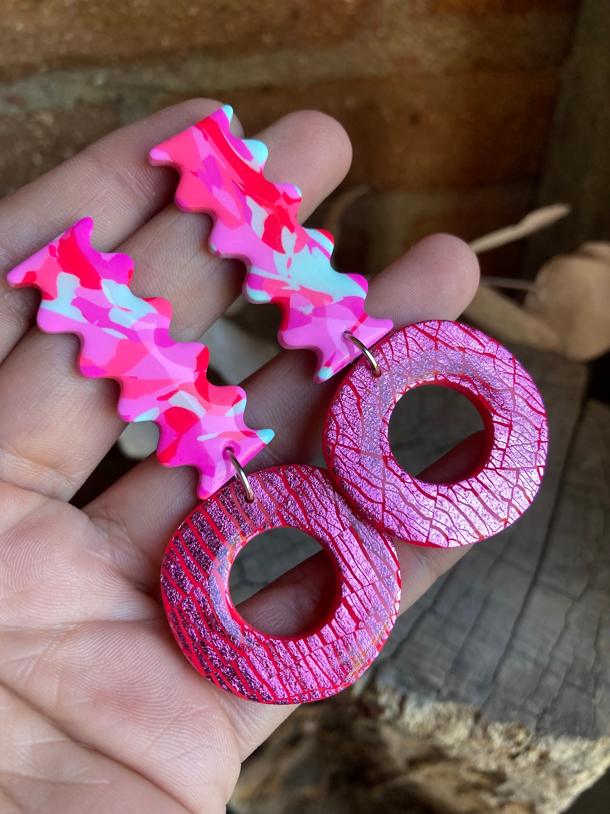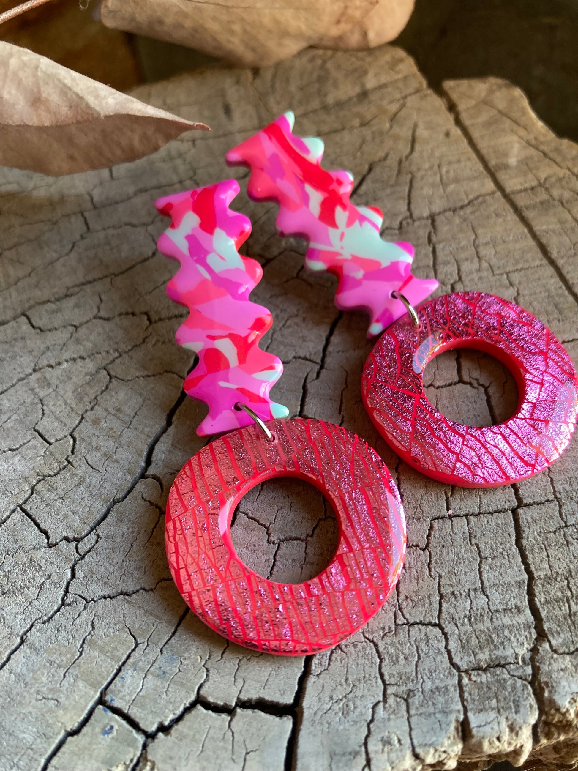 Aros de arcilla polimérica con top coat de resina uv. Miden 7,2 cms. Palito de acero quirúrgico y tope de goma.