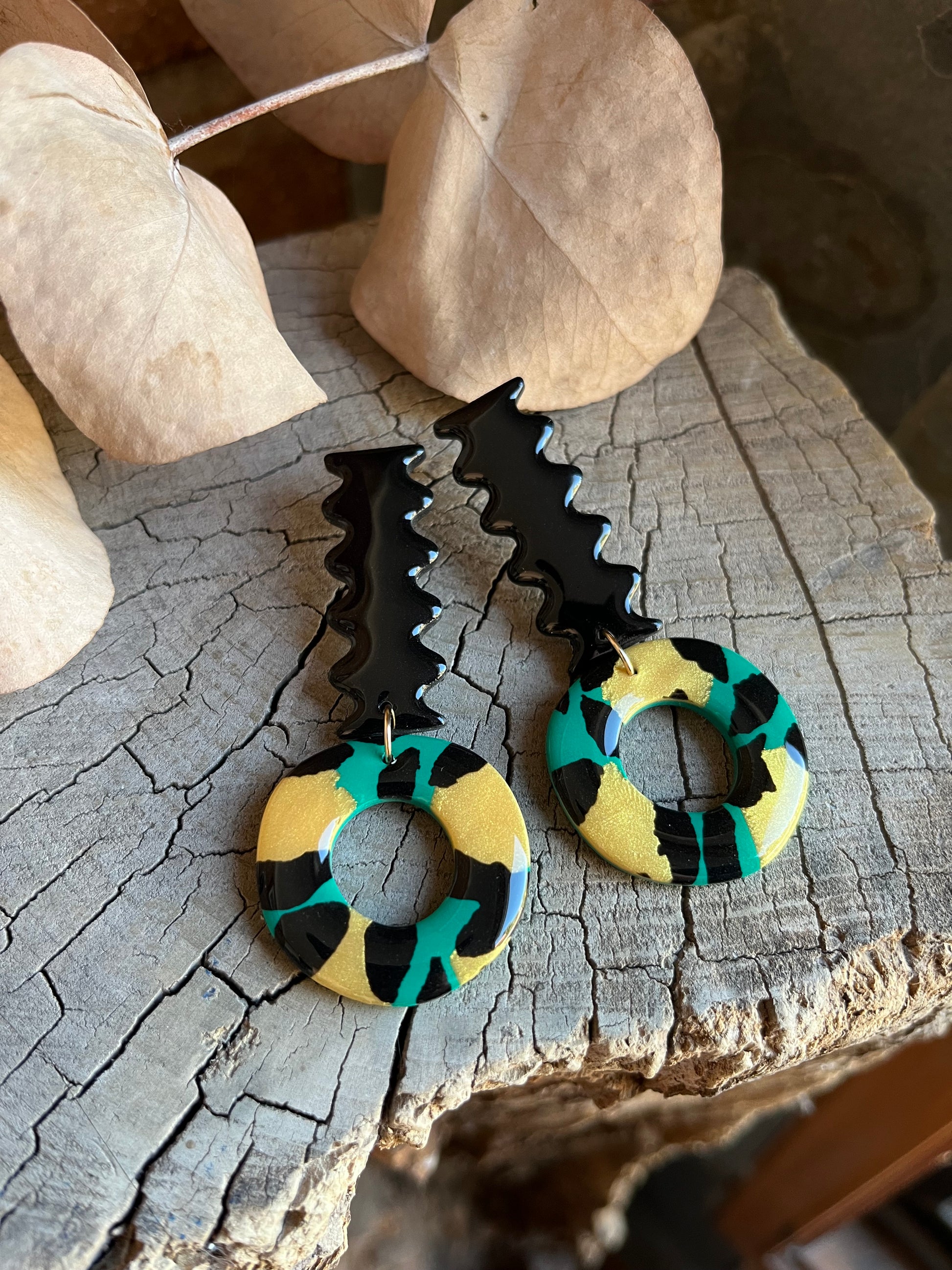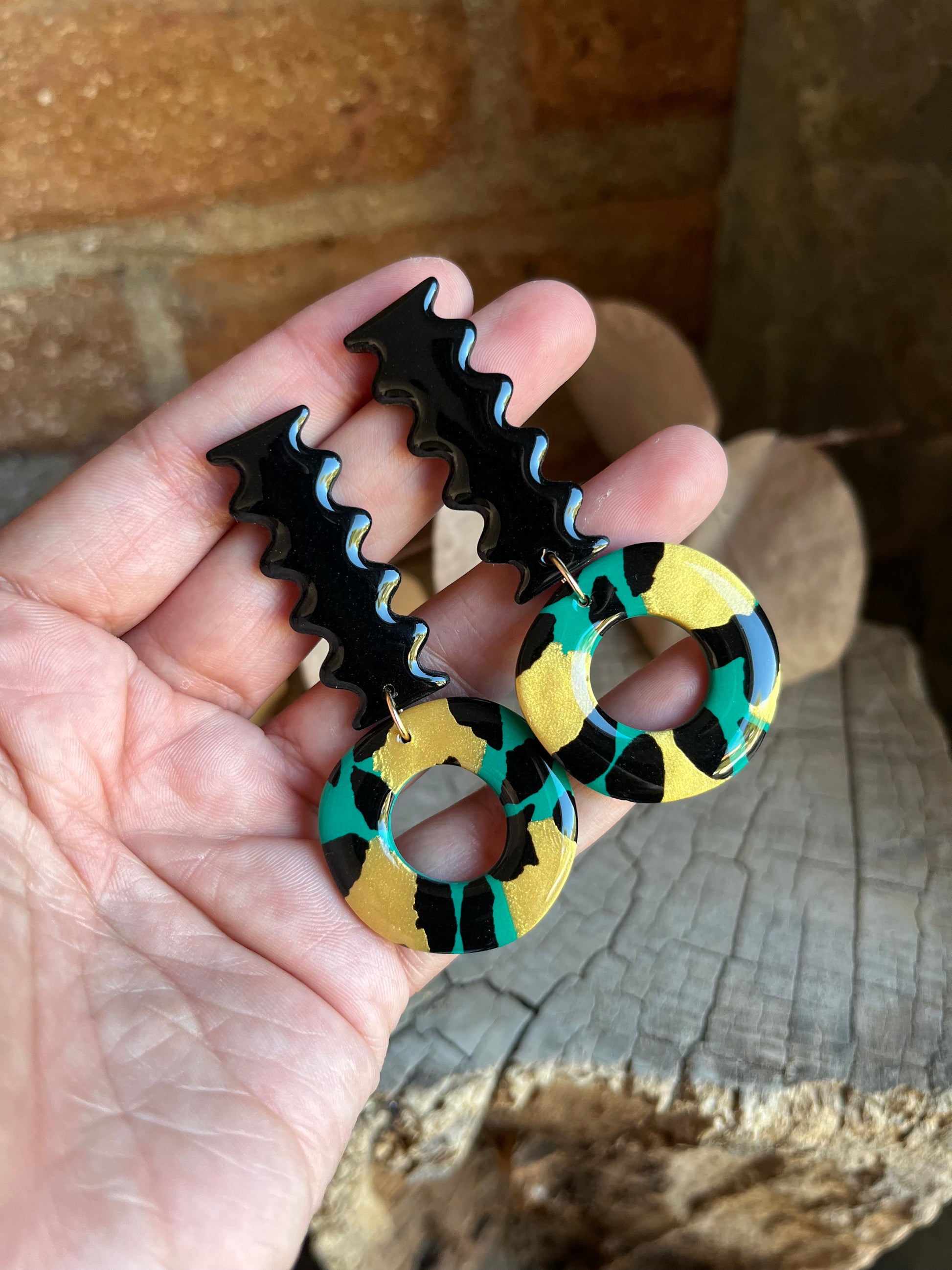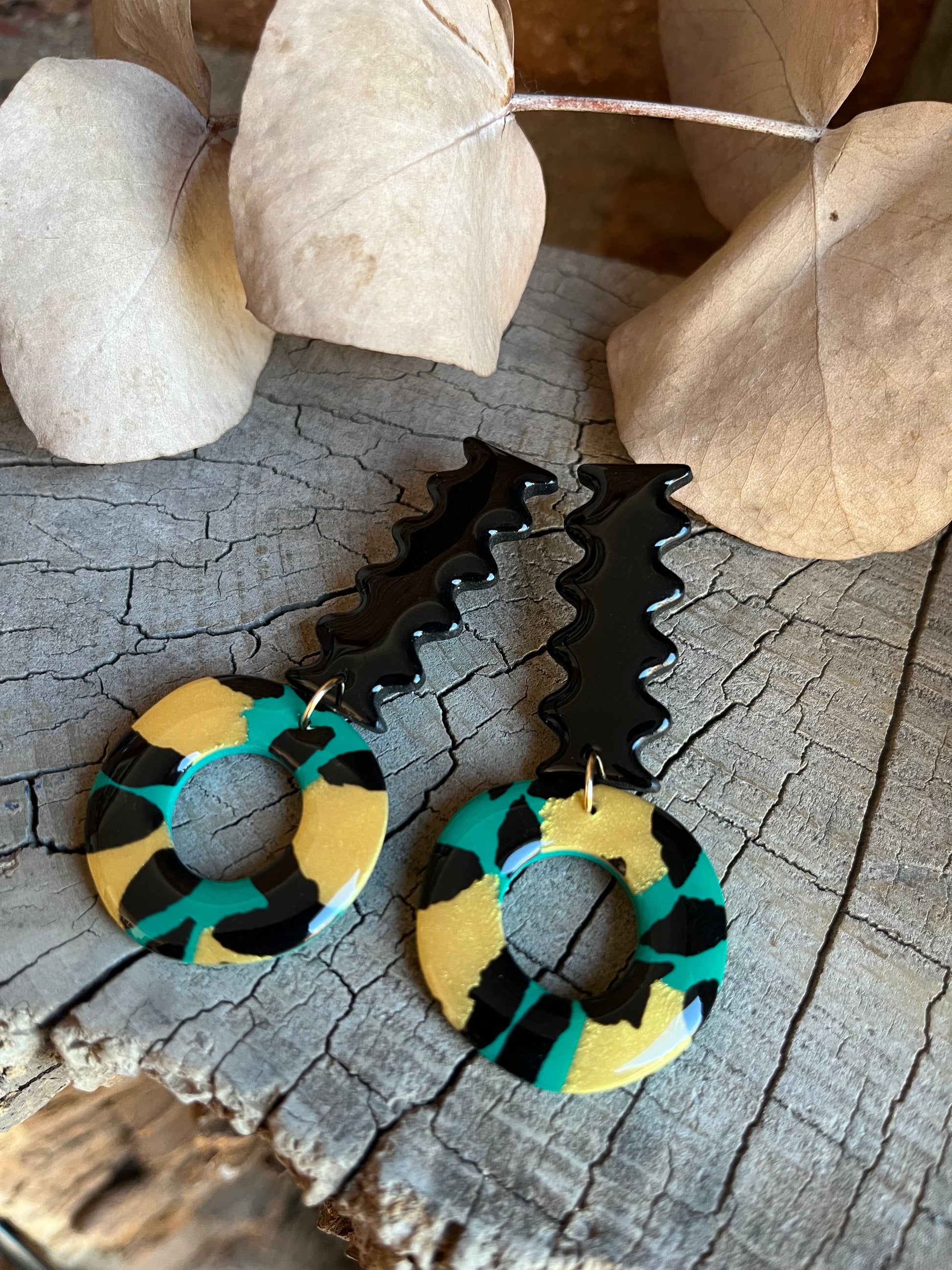 Aros de arcilla polimérica con top coat de resina uv. Miden 7,2 cms. Palito de acero quirúrgico y tope de goma.