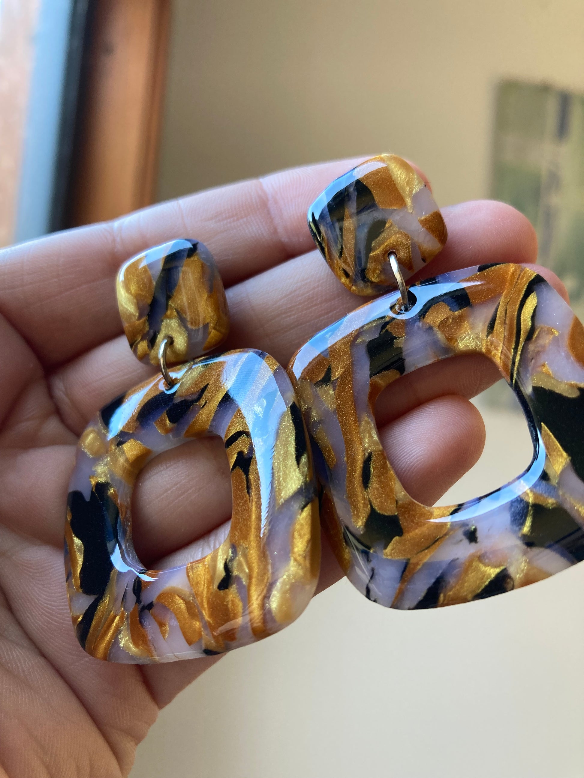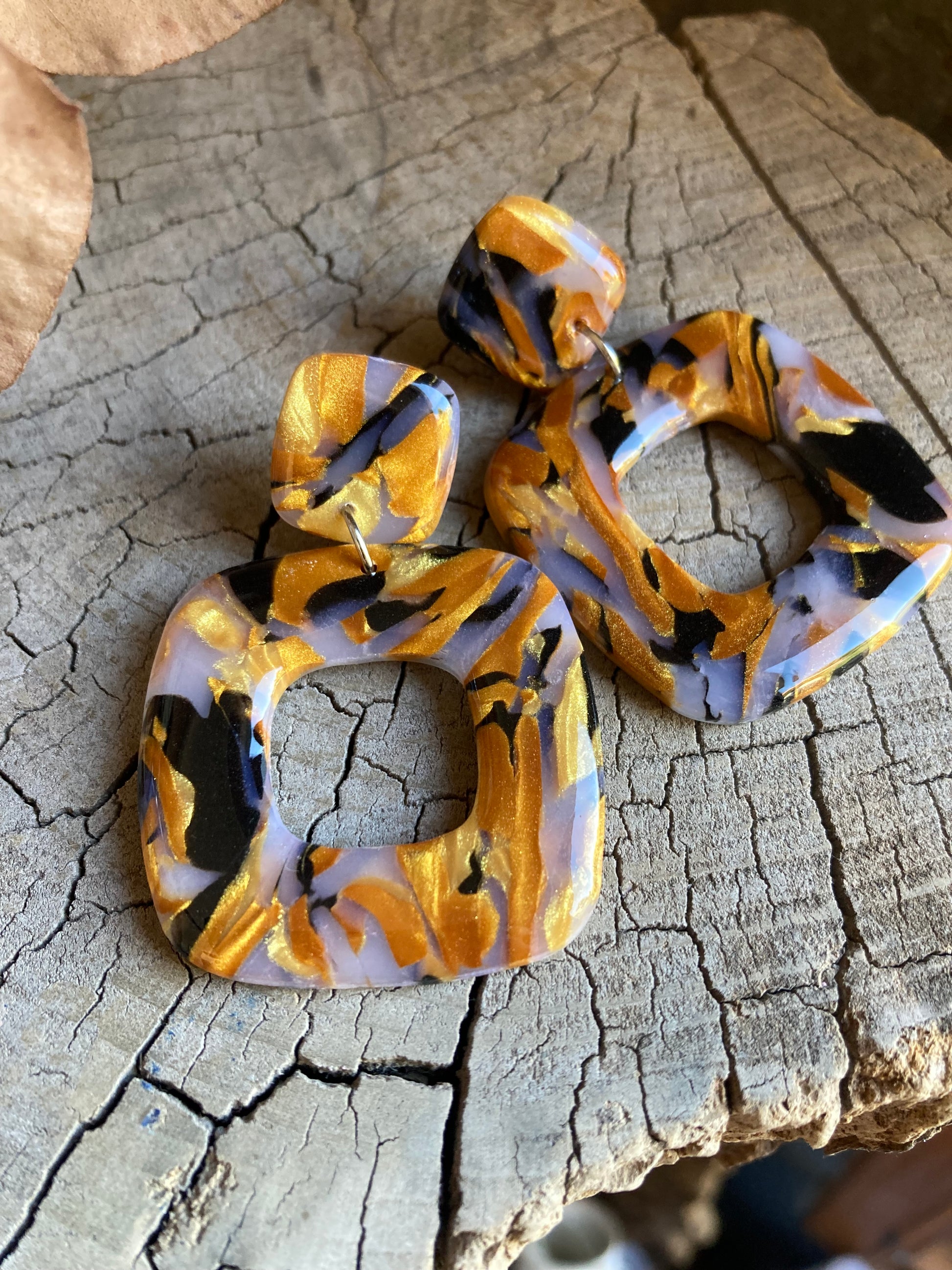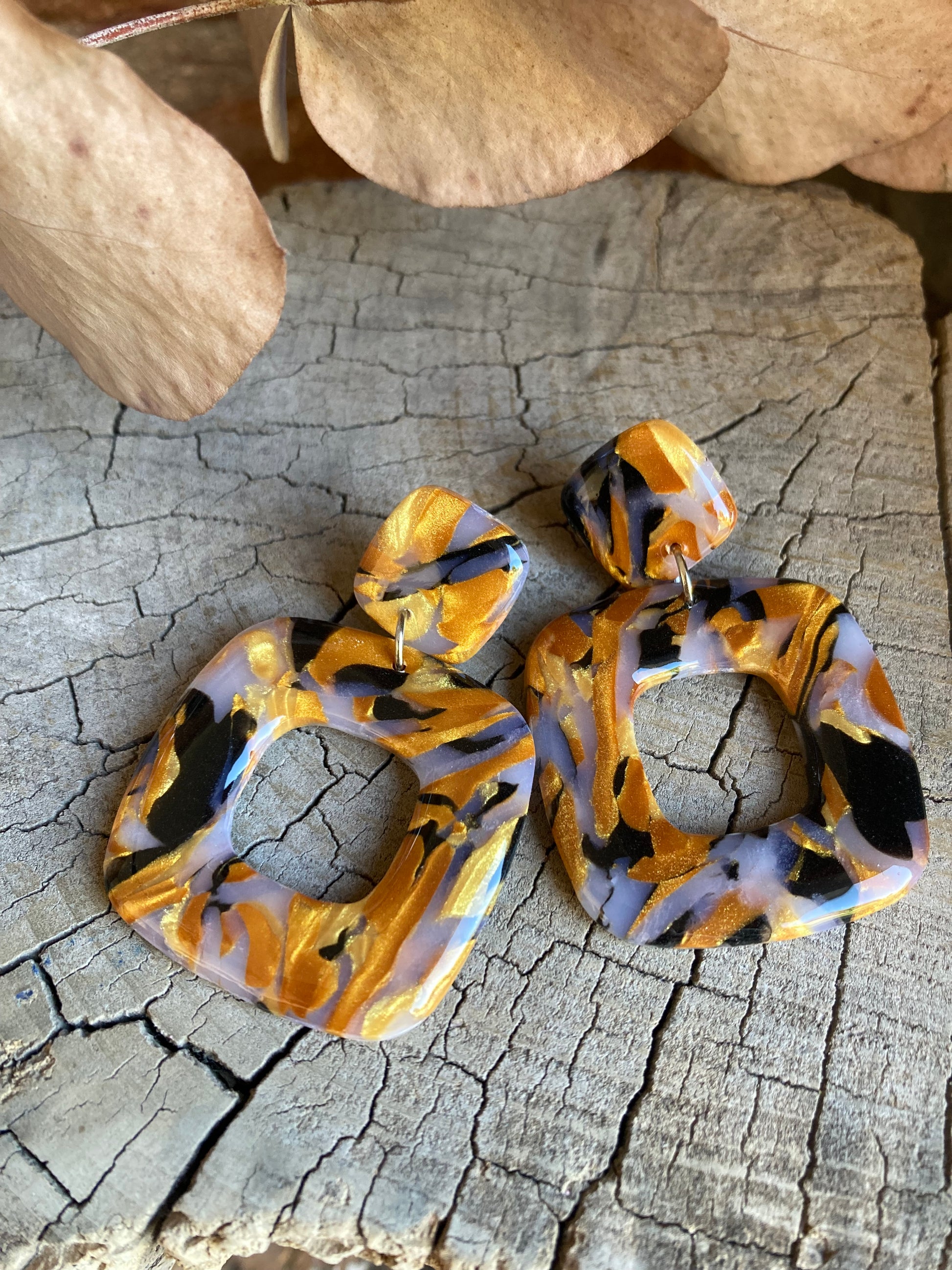 Aros de arcilla polimérica con top coat de resina uv. Miden 5,4 cms. Palito de acero quirúrgico y tope de goma.