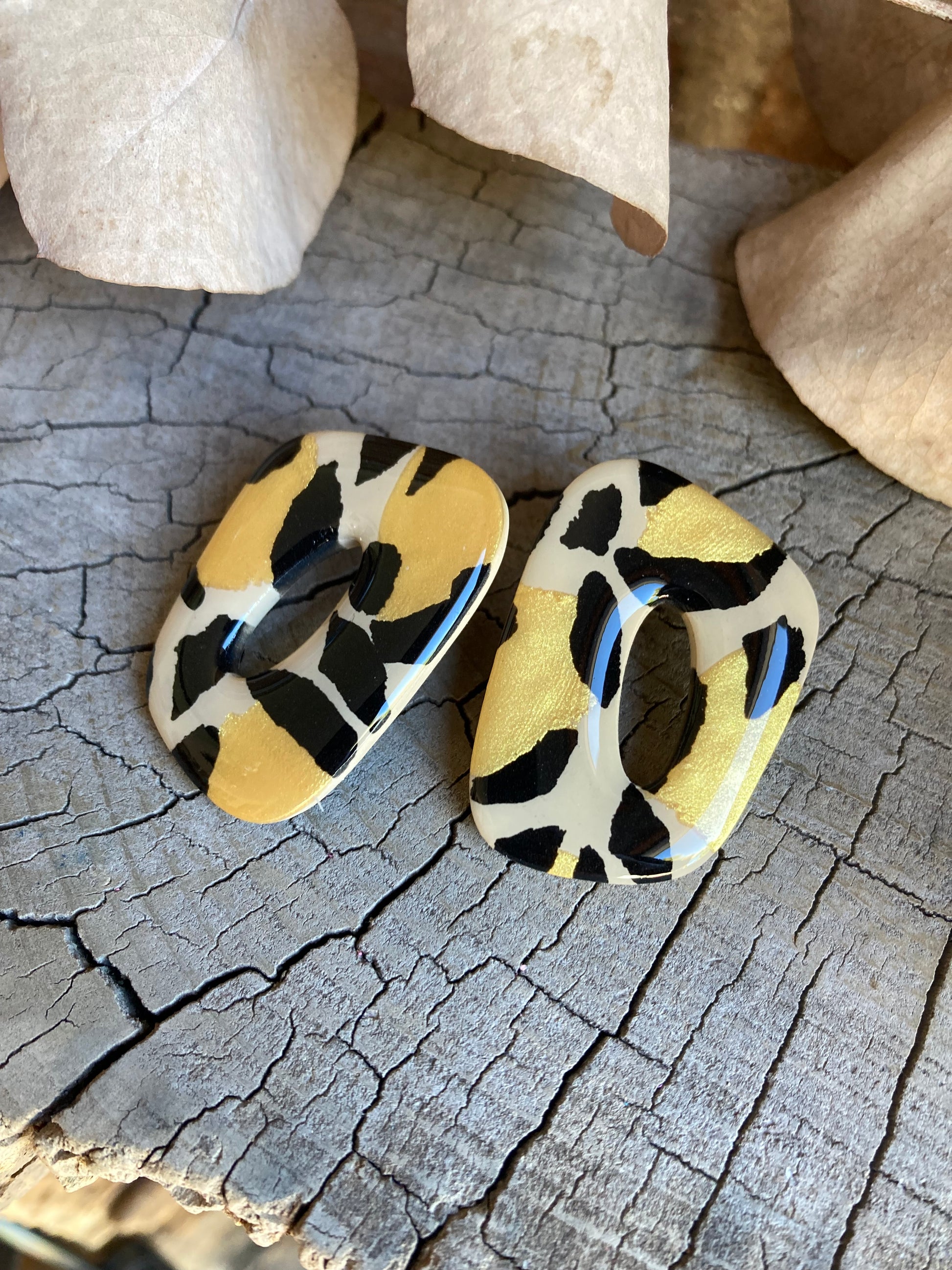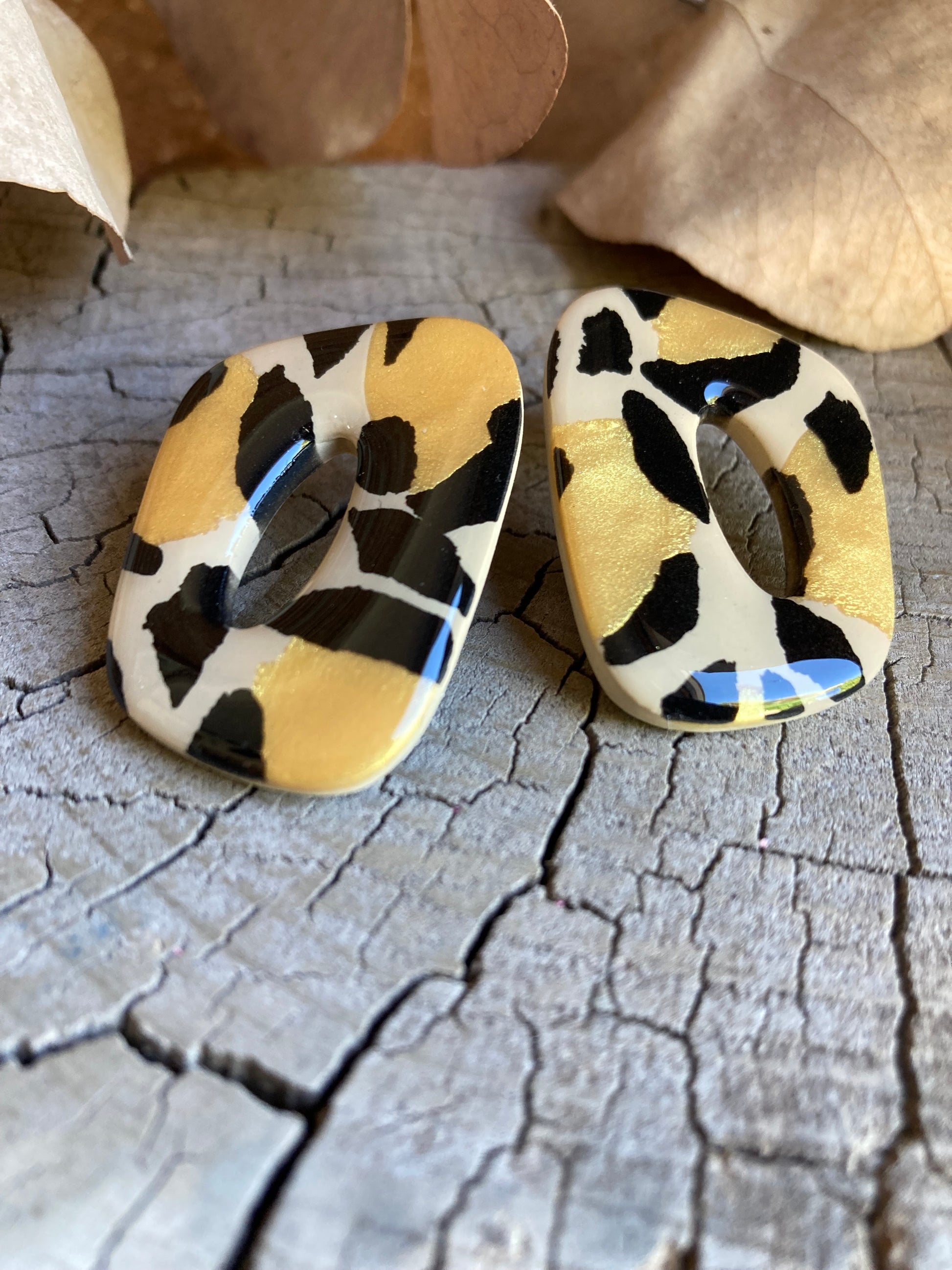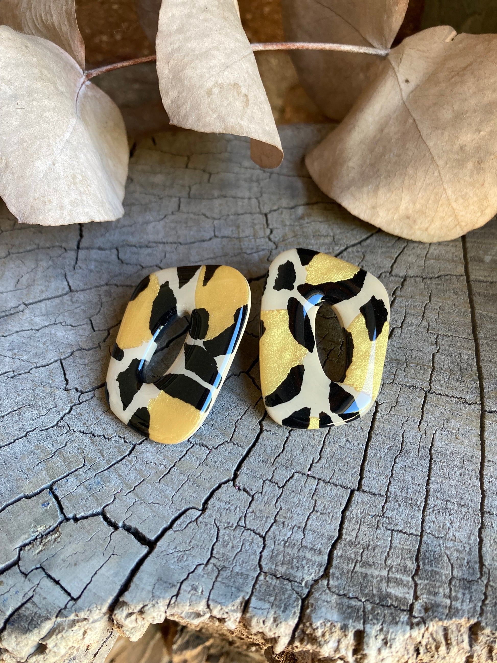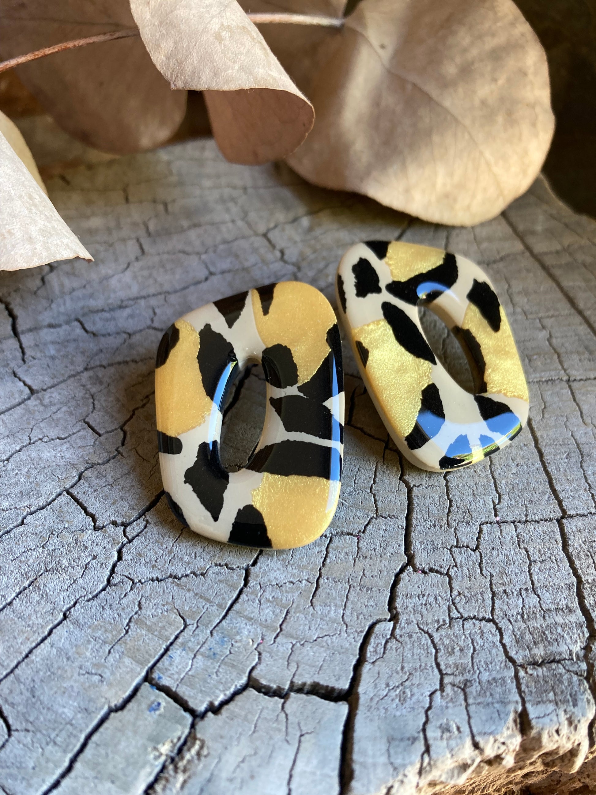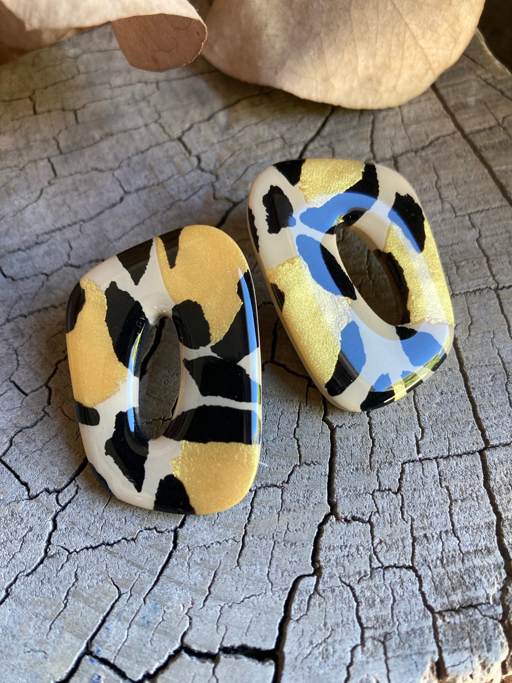 Aros de arcilla polimérica con top coat de resina uv. Miden 4 cms. Palito de acero quirúrgico y tope de goma.
