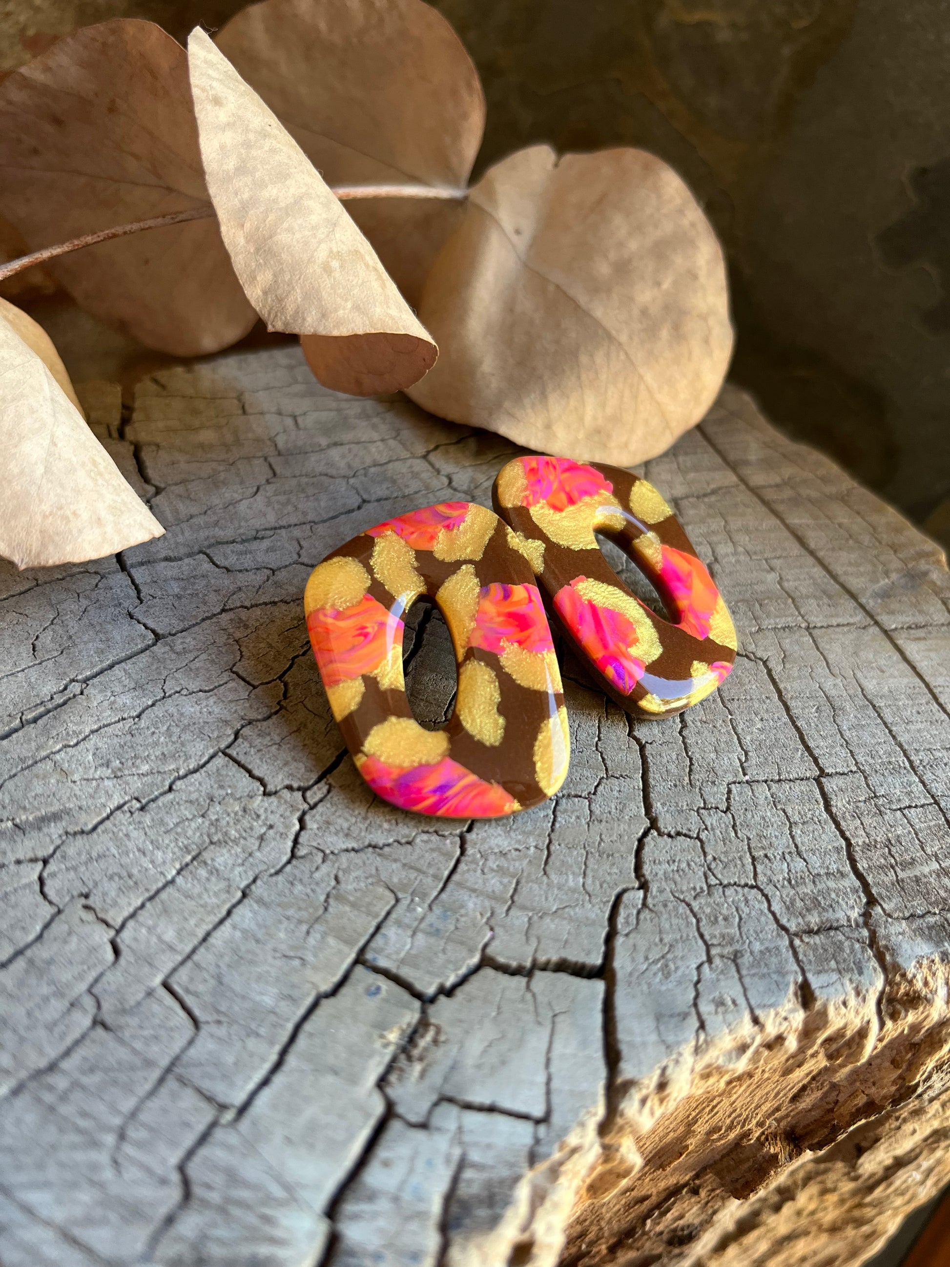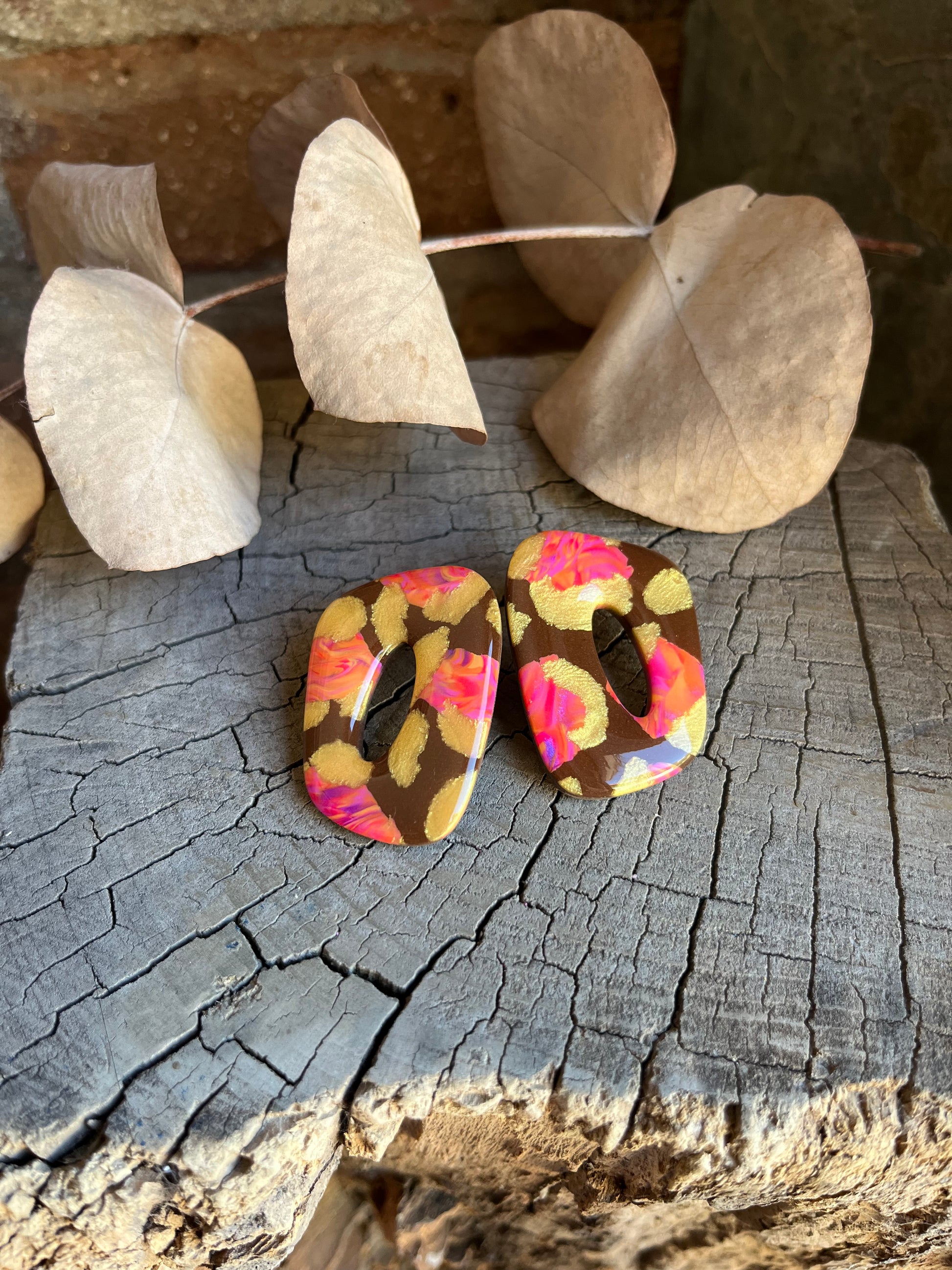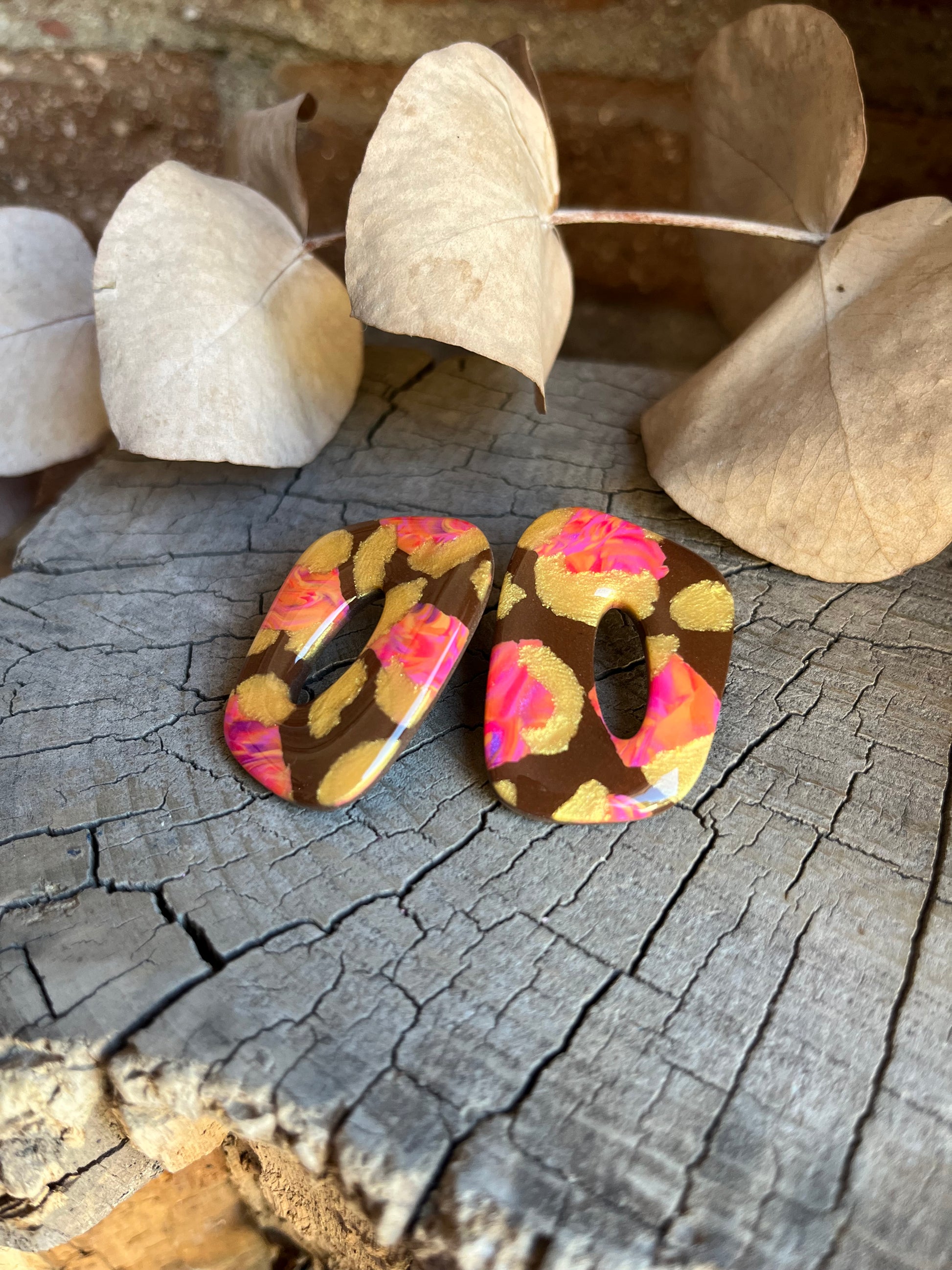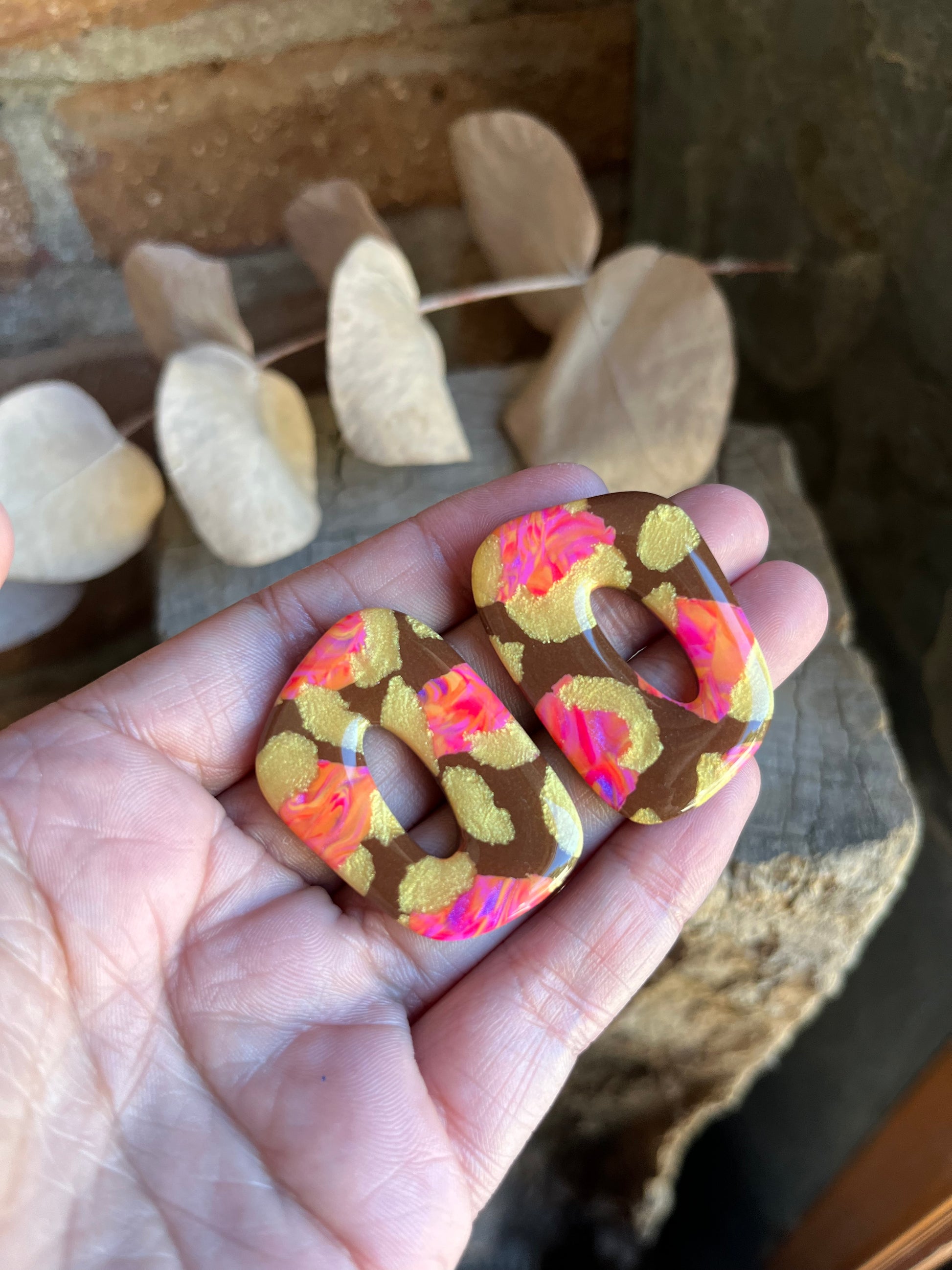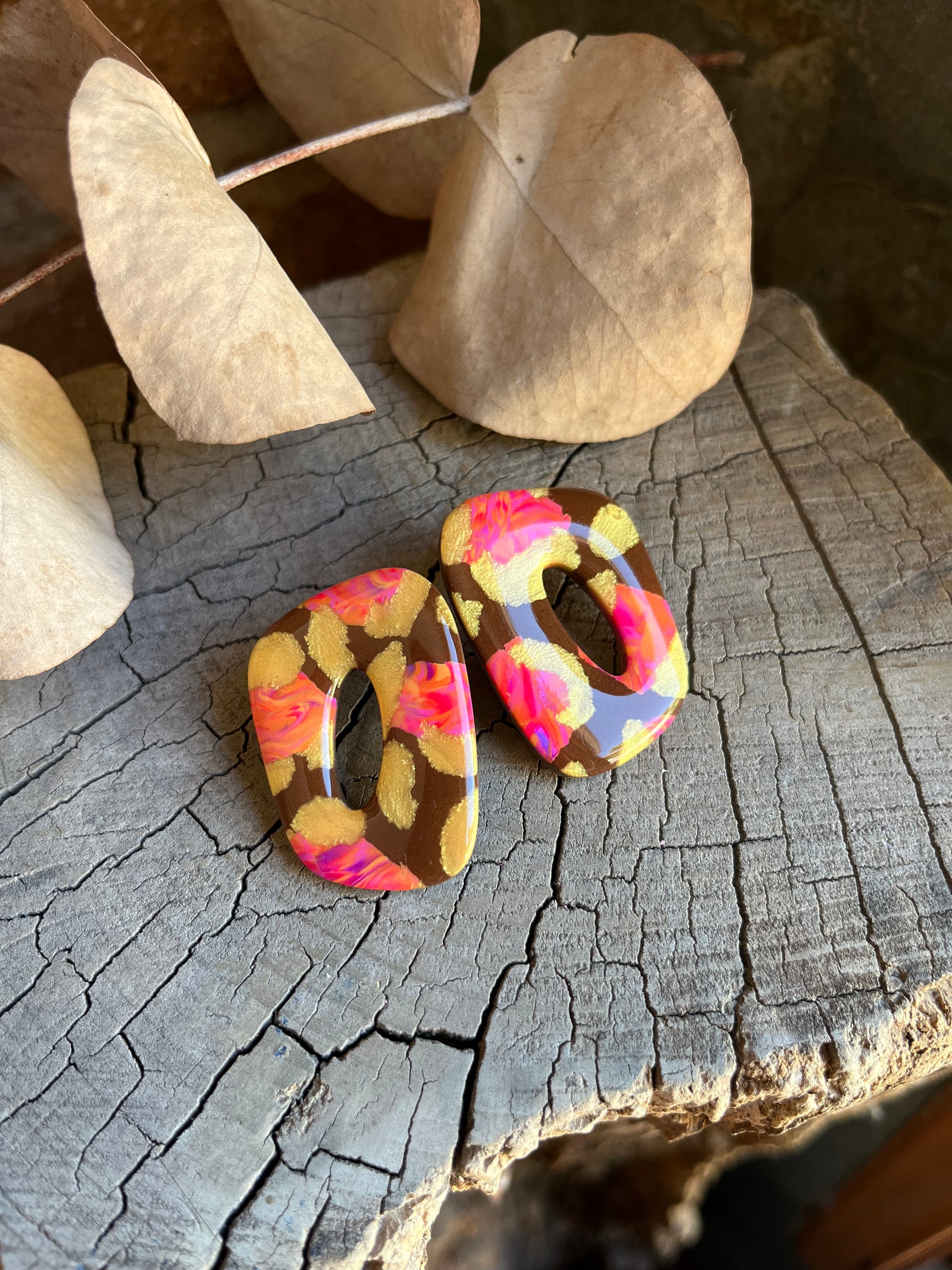 Aros de arcilla polimérica con top coat de resina uv. Miden 4 cms. Palito de acero quirúrgico y tope de goma.