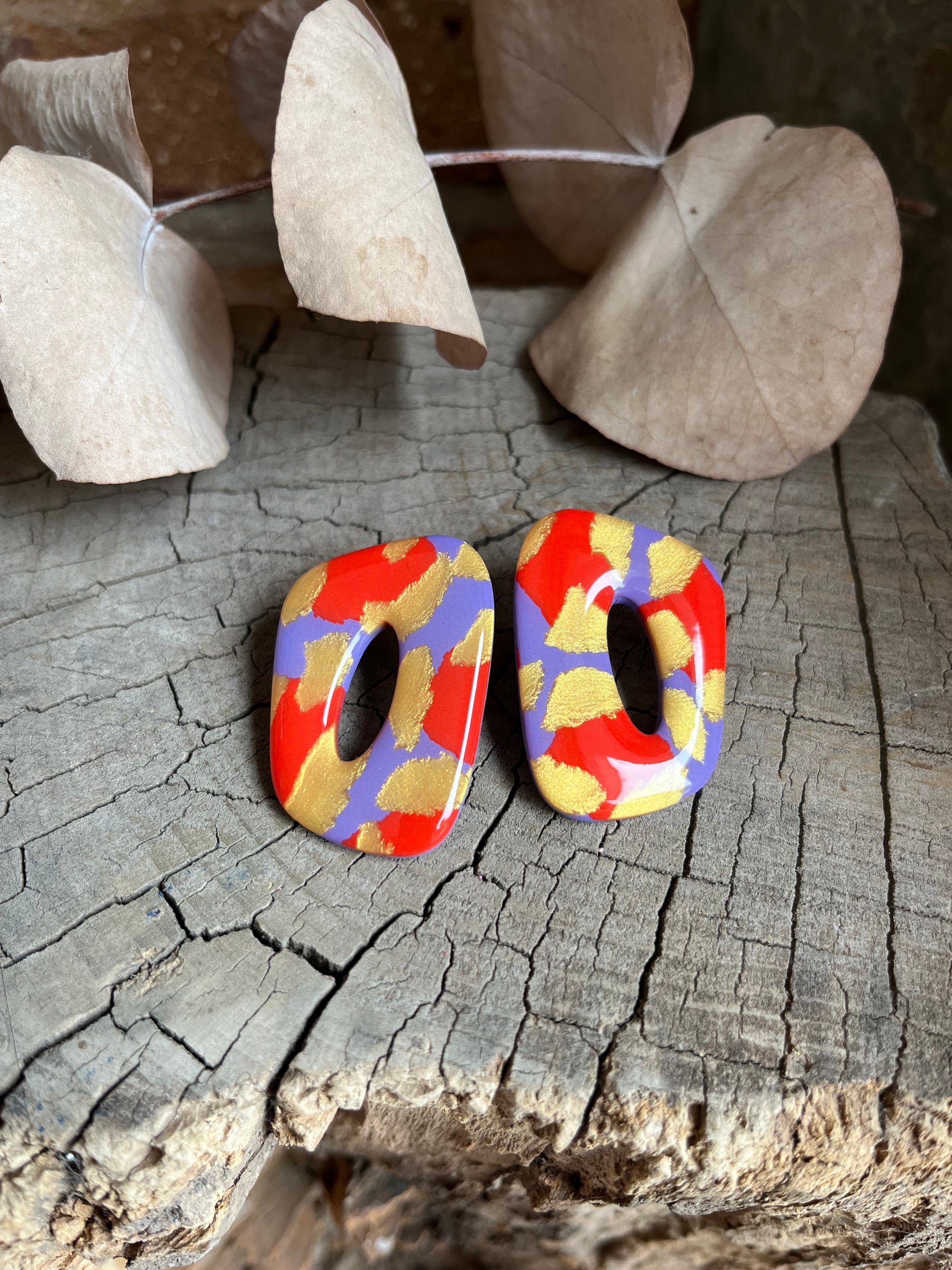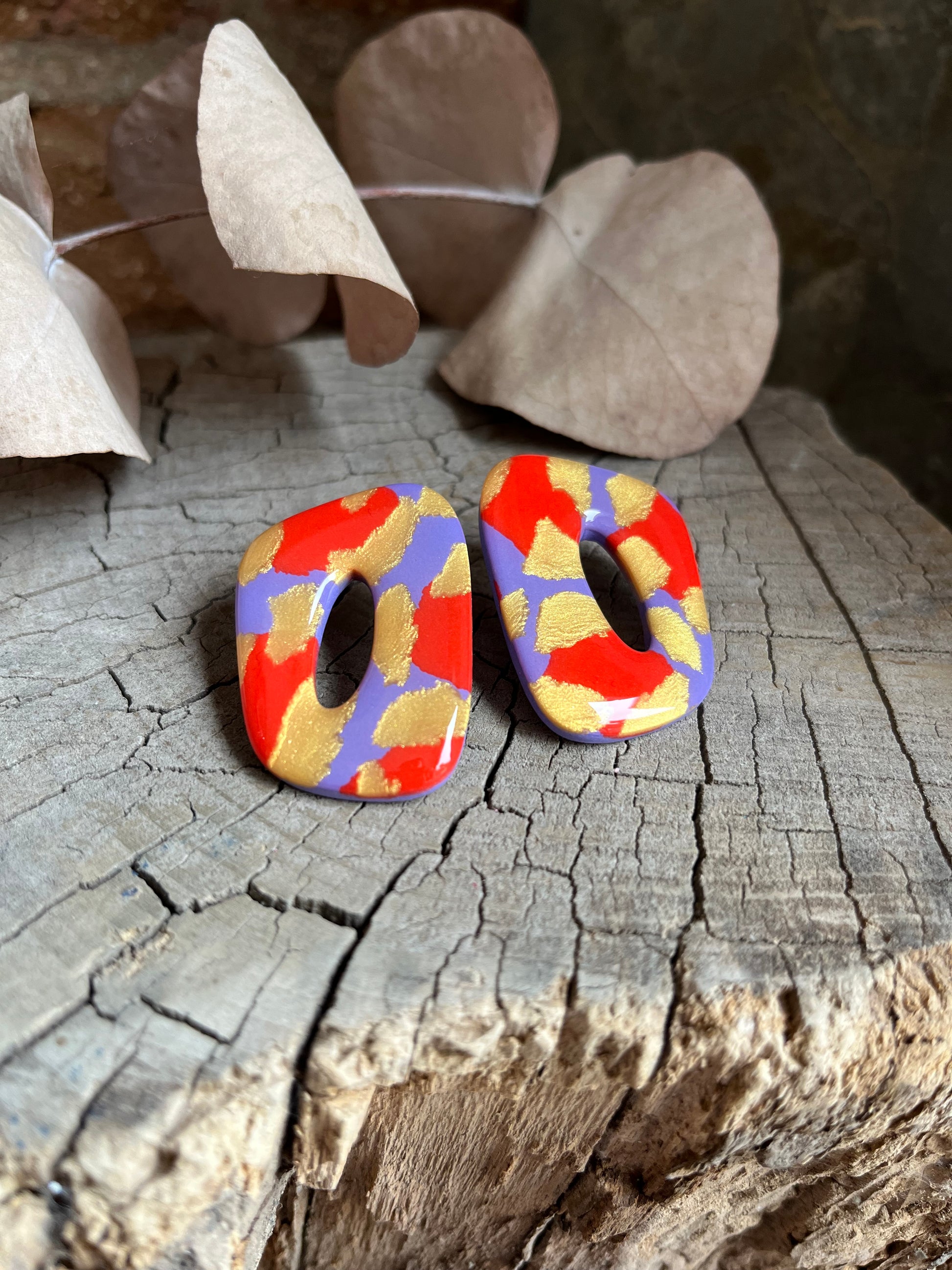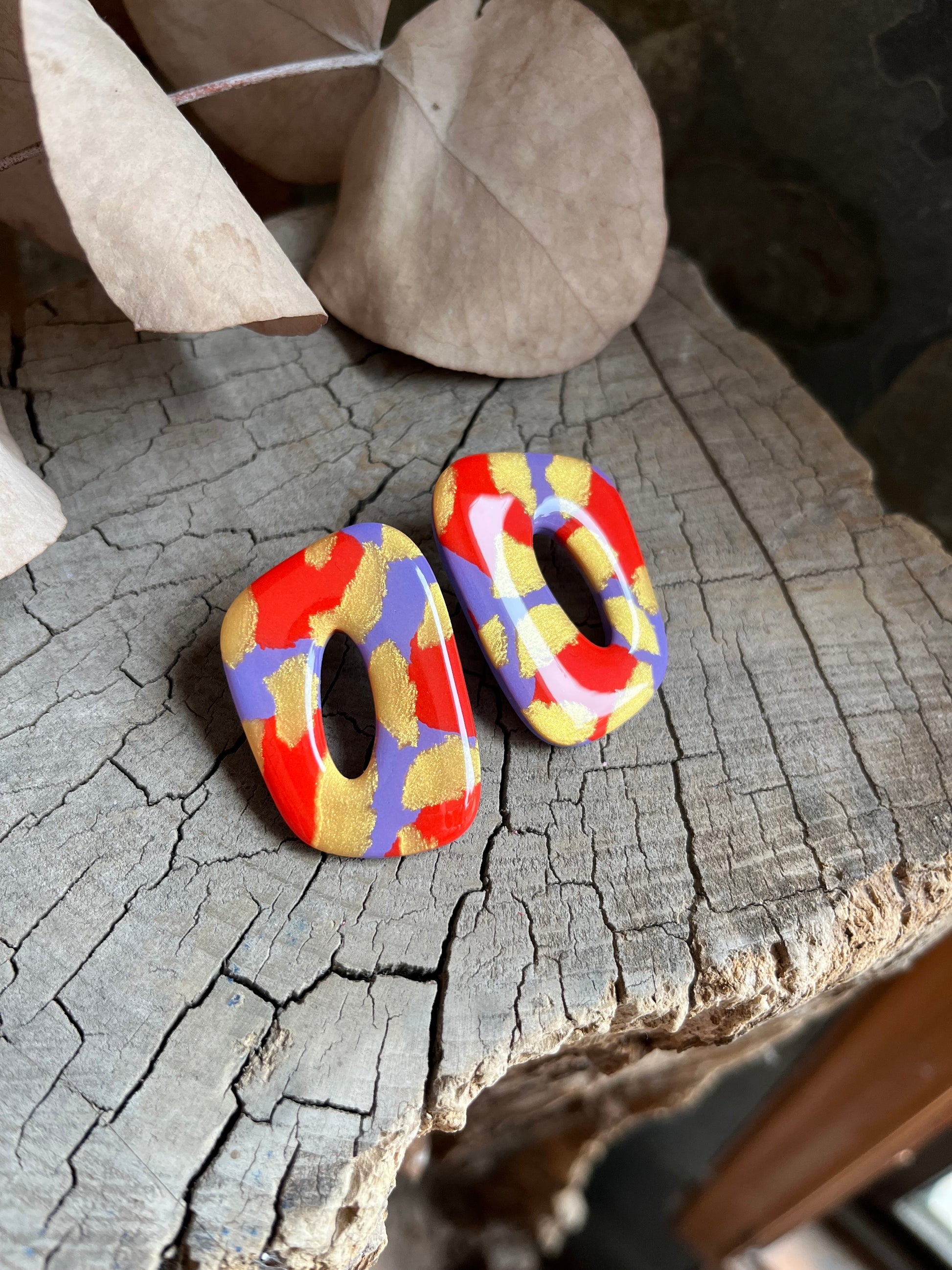 Aros de arcilla polimérica con top coat de resina uv. Miden 4 cms. Palito de acero quirúrgico y tope de goma.