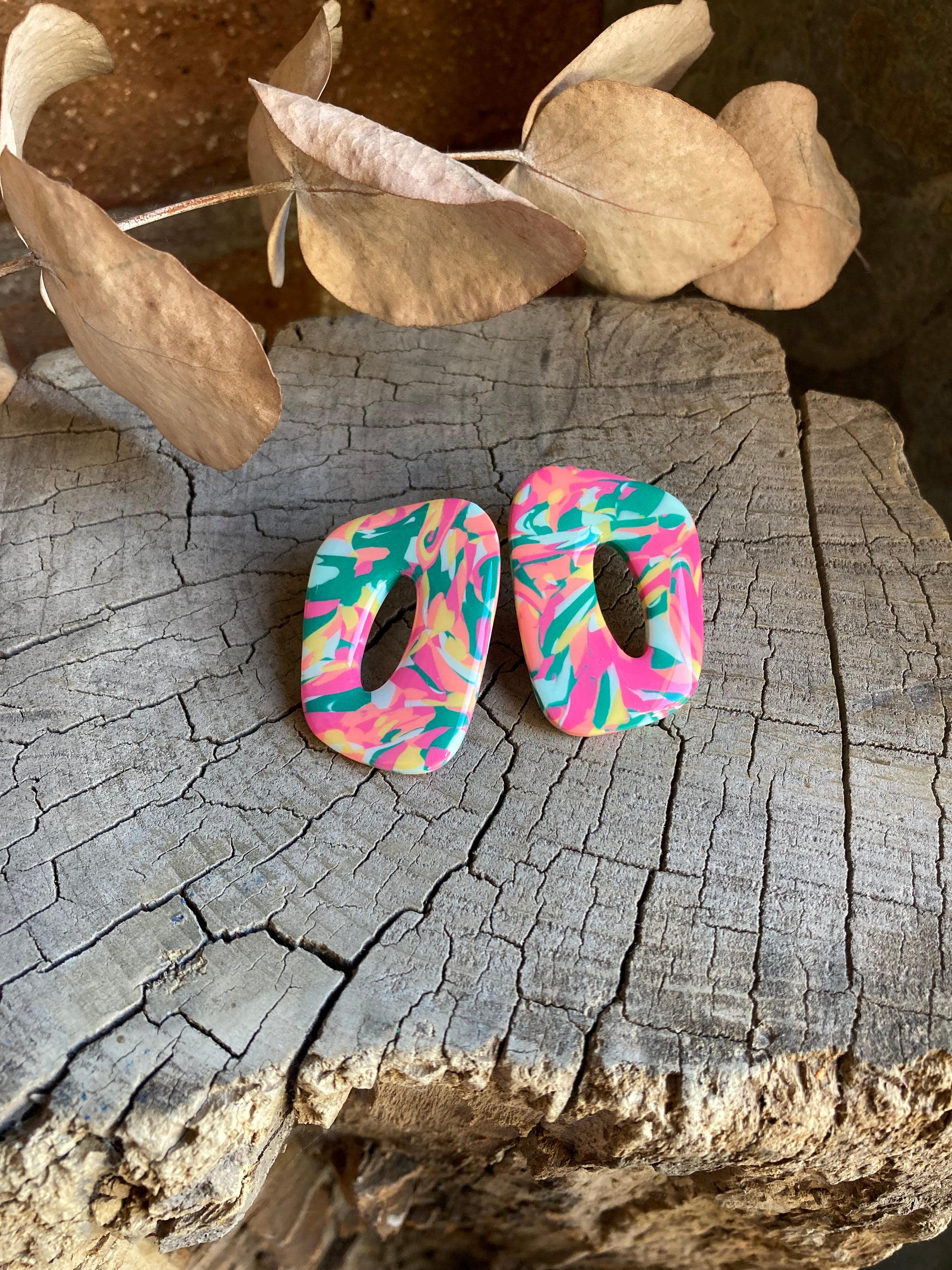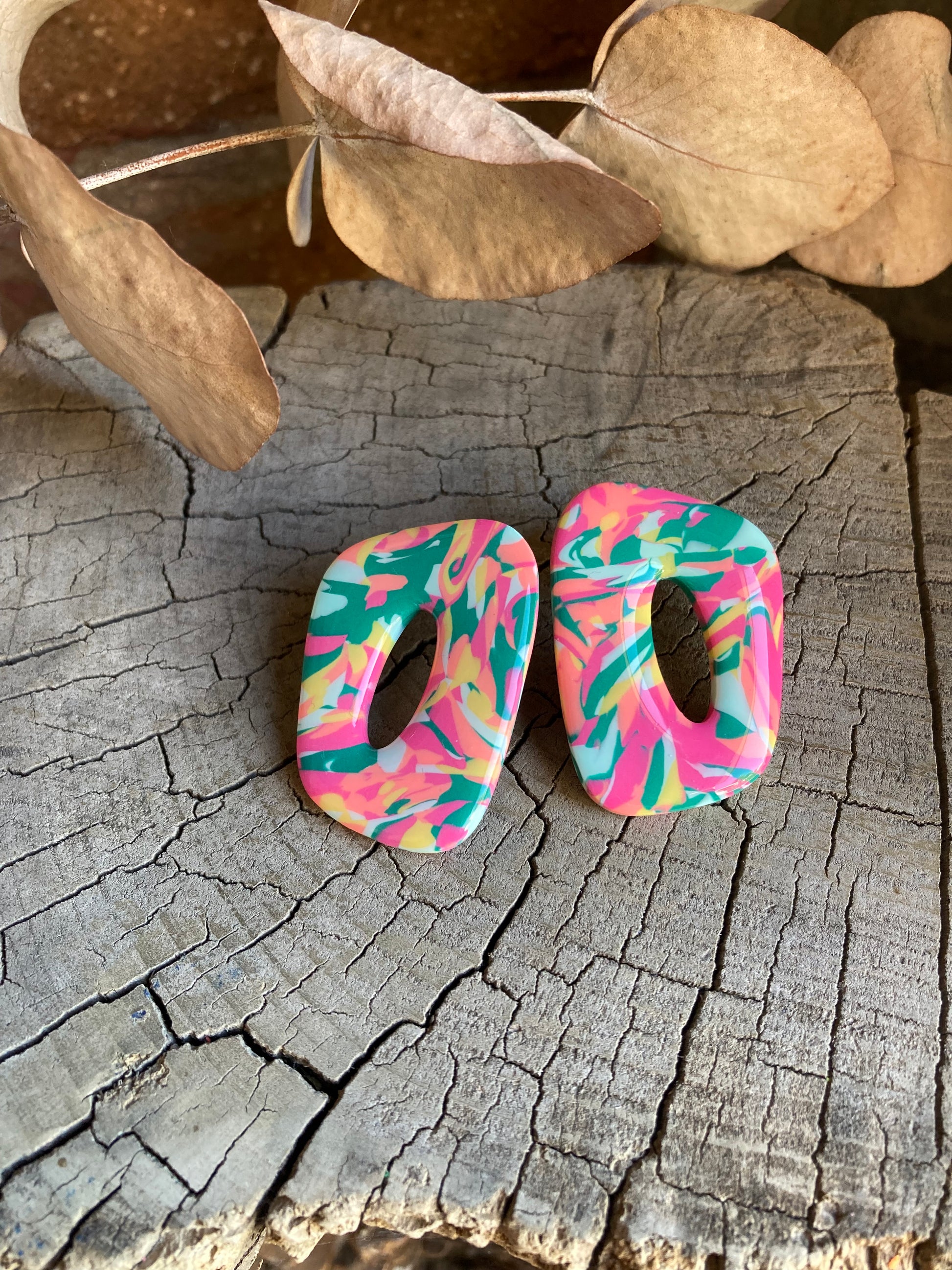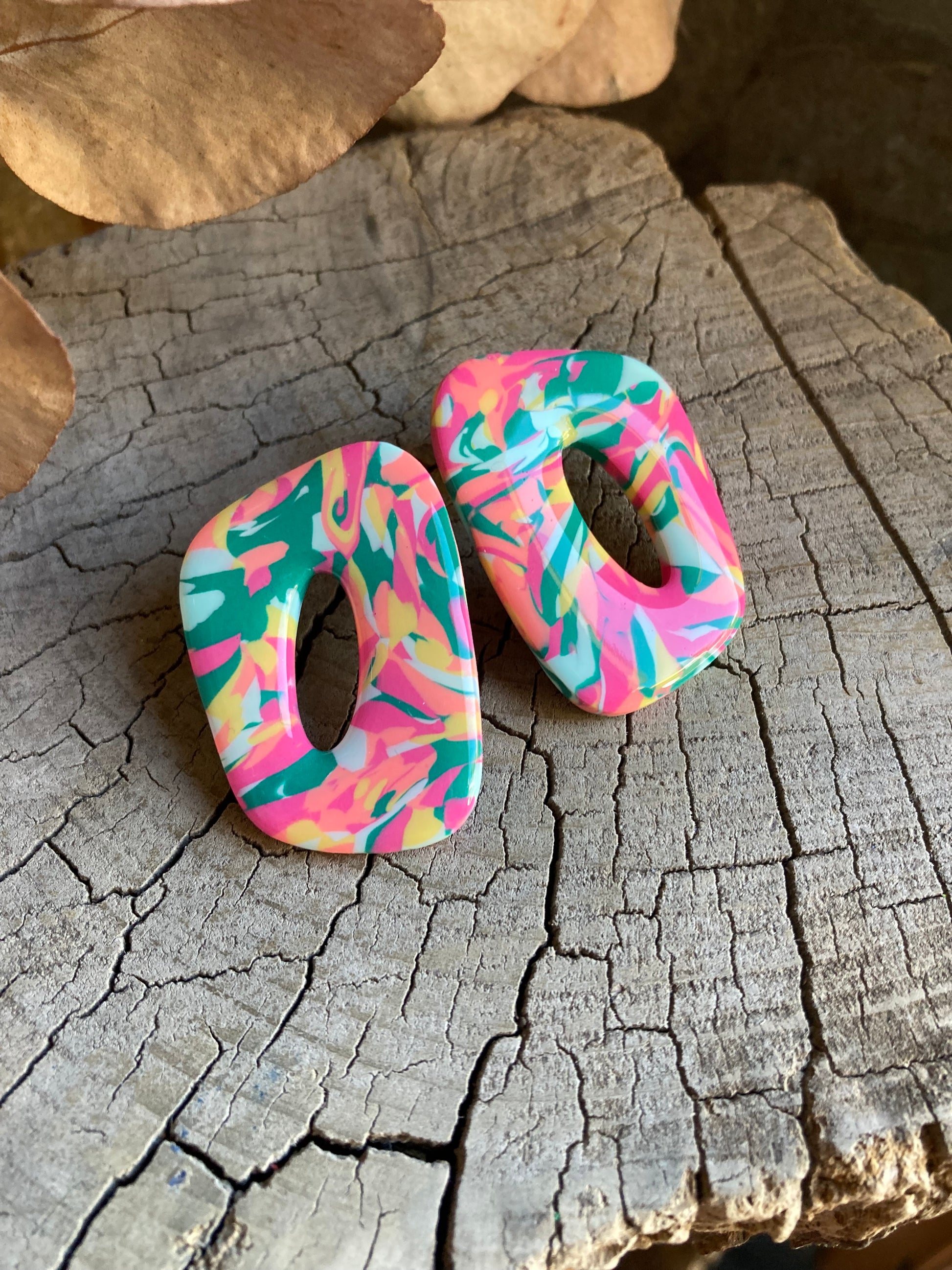 Aros de arcilla polimérica con top coat de resina uv. Miden 4 cms. Palito de acero quirúrgico y tope de goma.