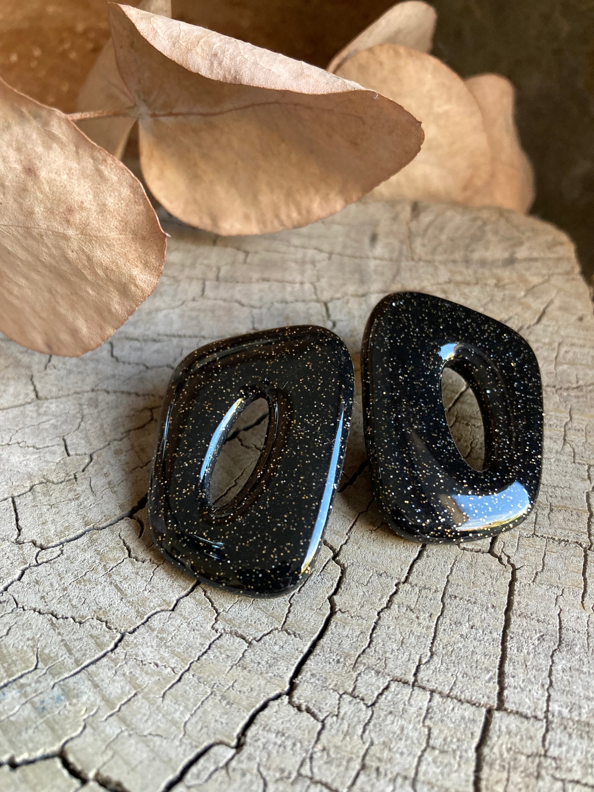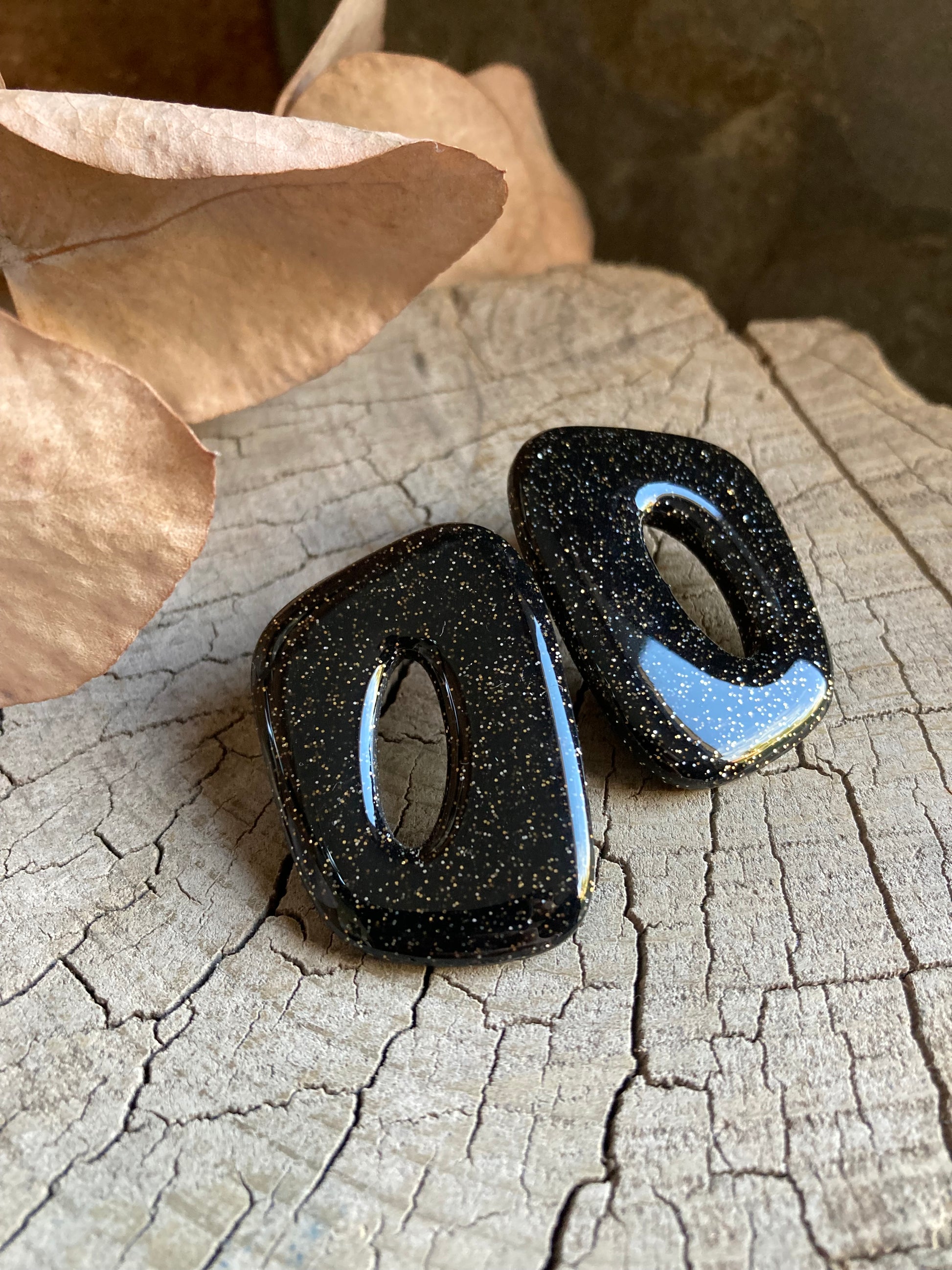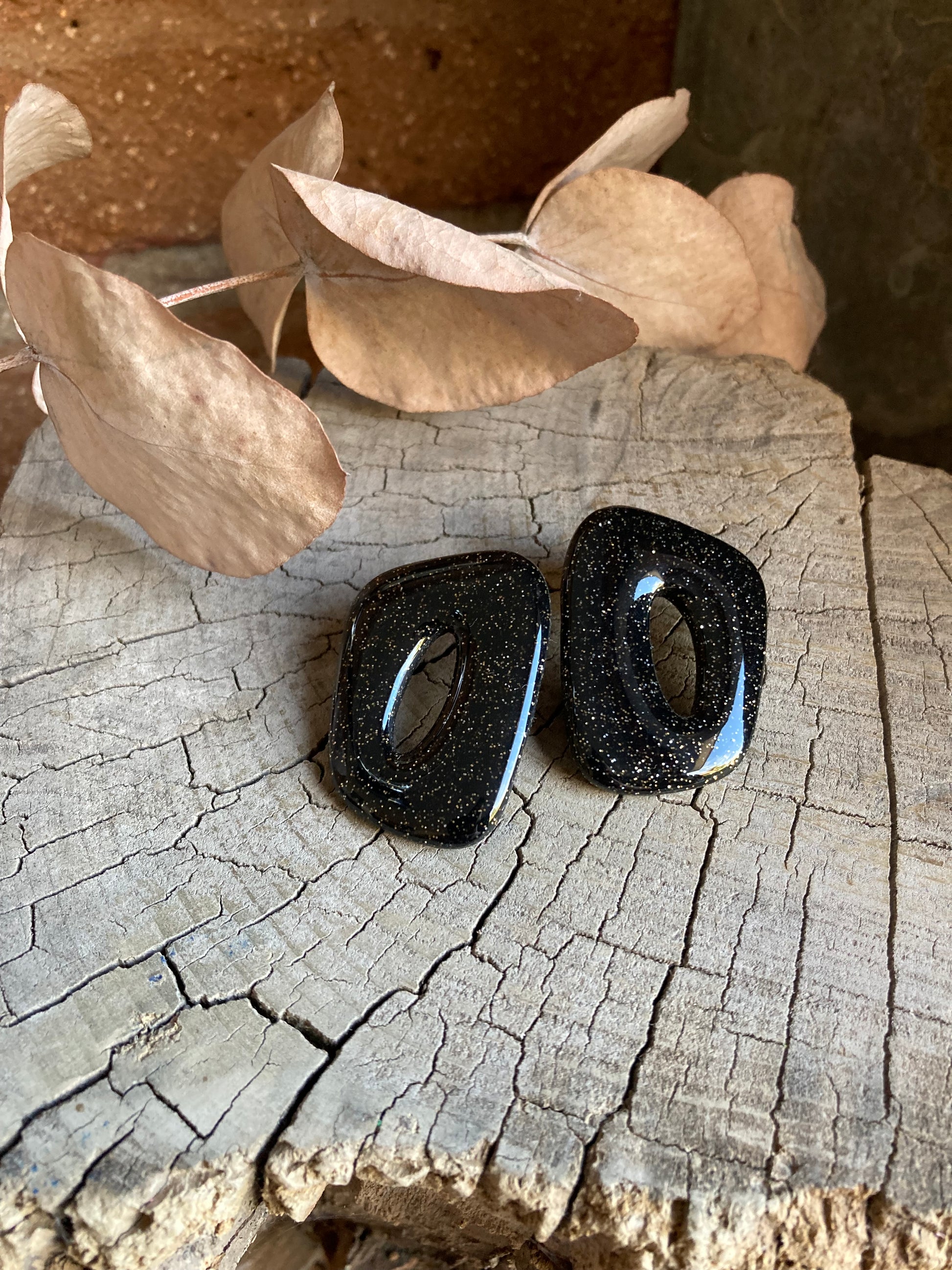 Aros de arcilla polimérica con top coat de resina uv. Miden 4 cms. Palito de acero quirúrgico y tope de goma.