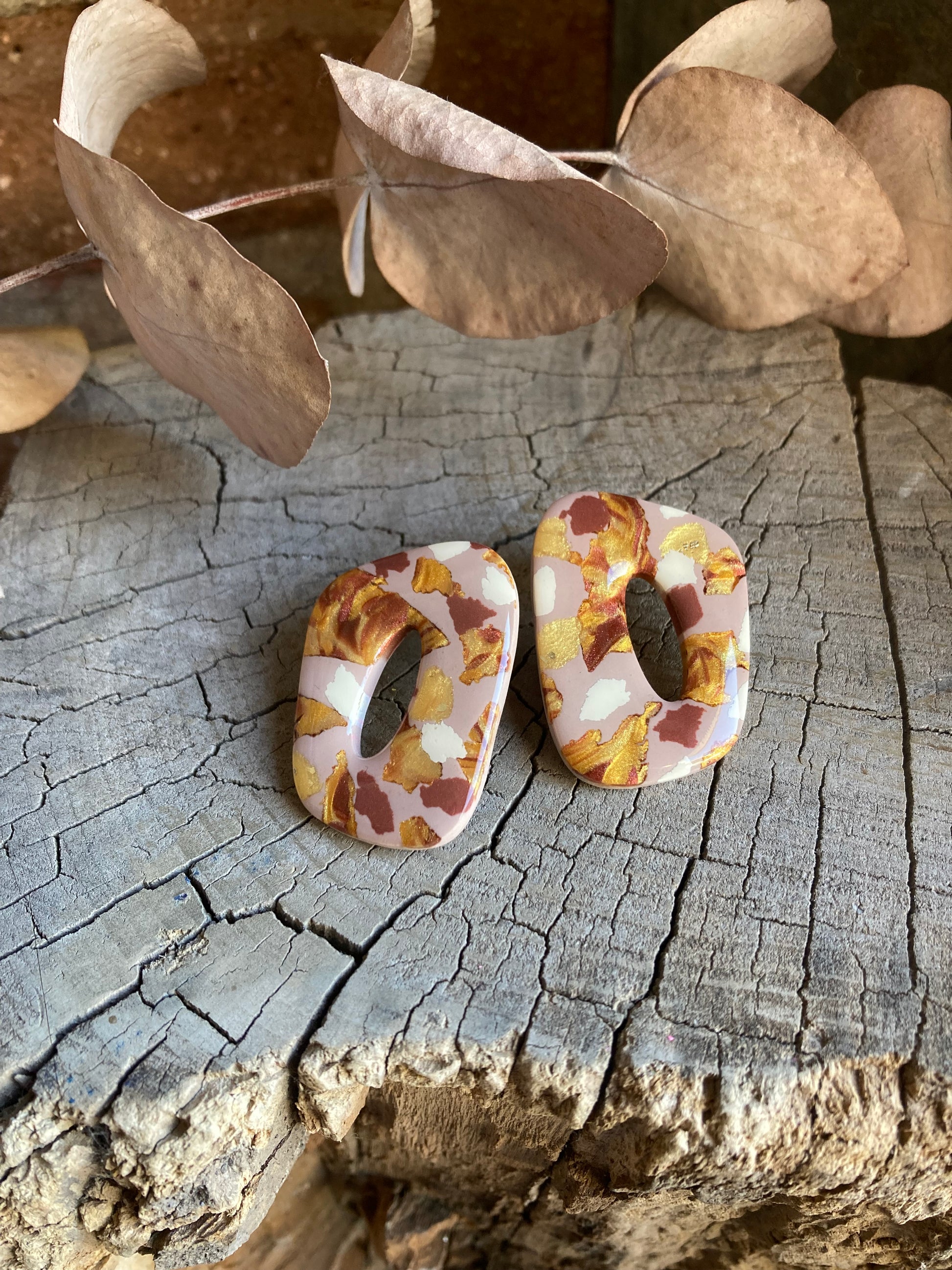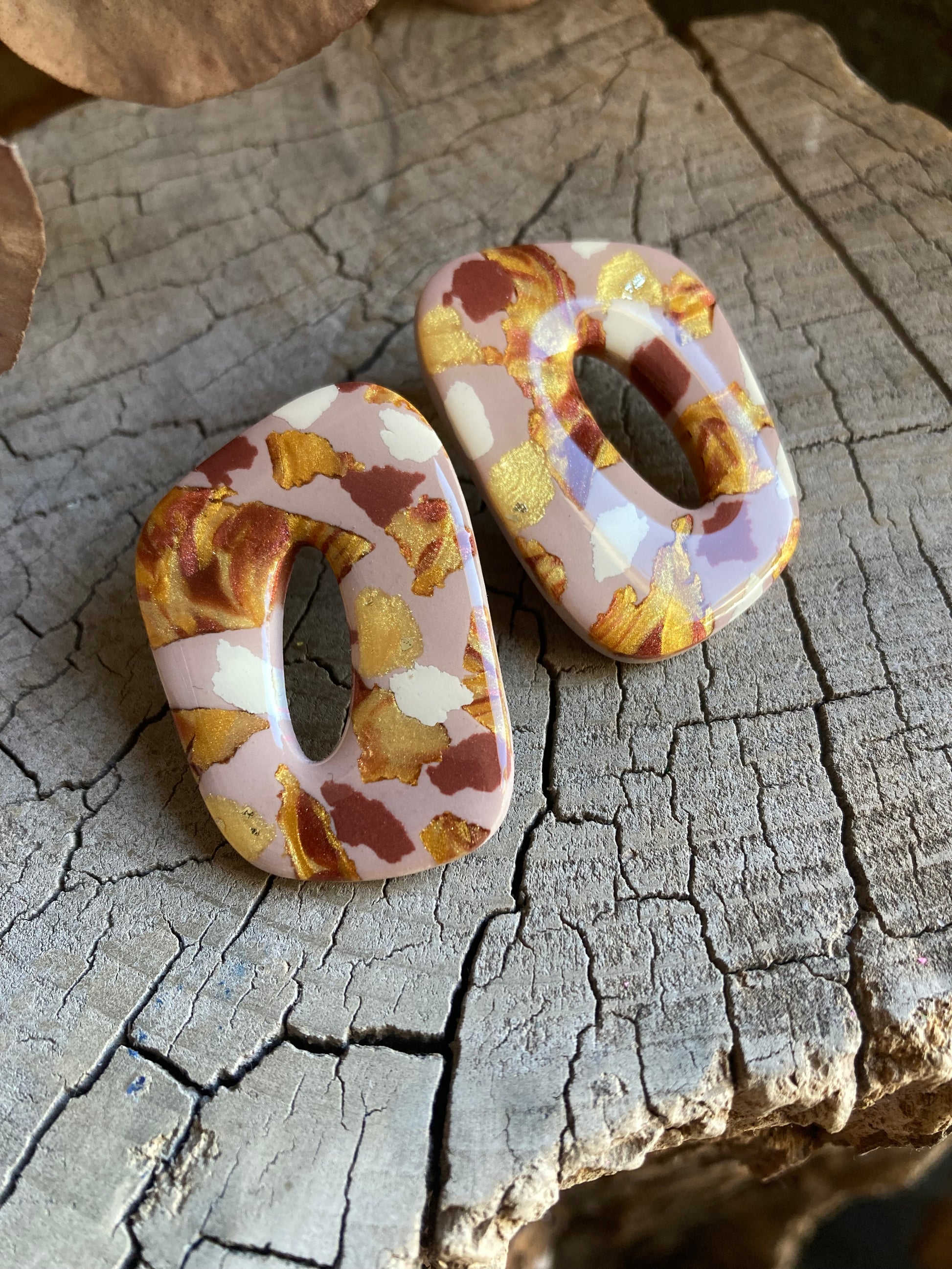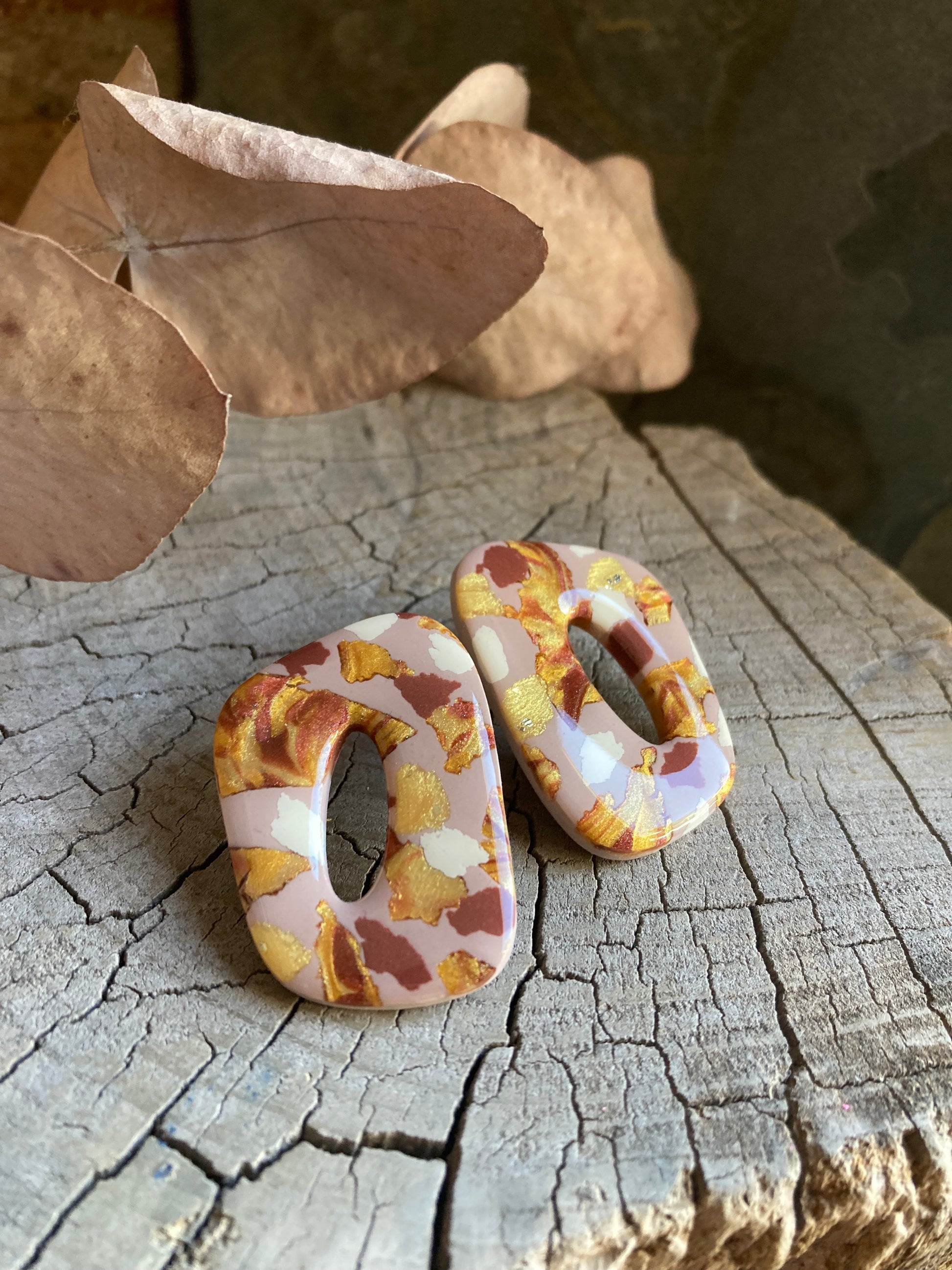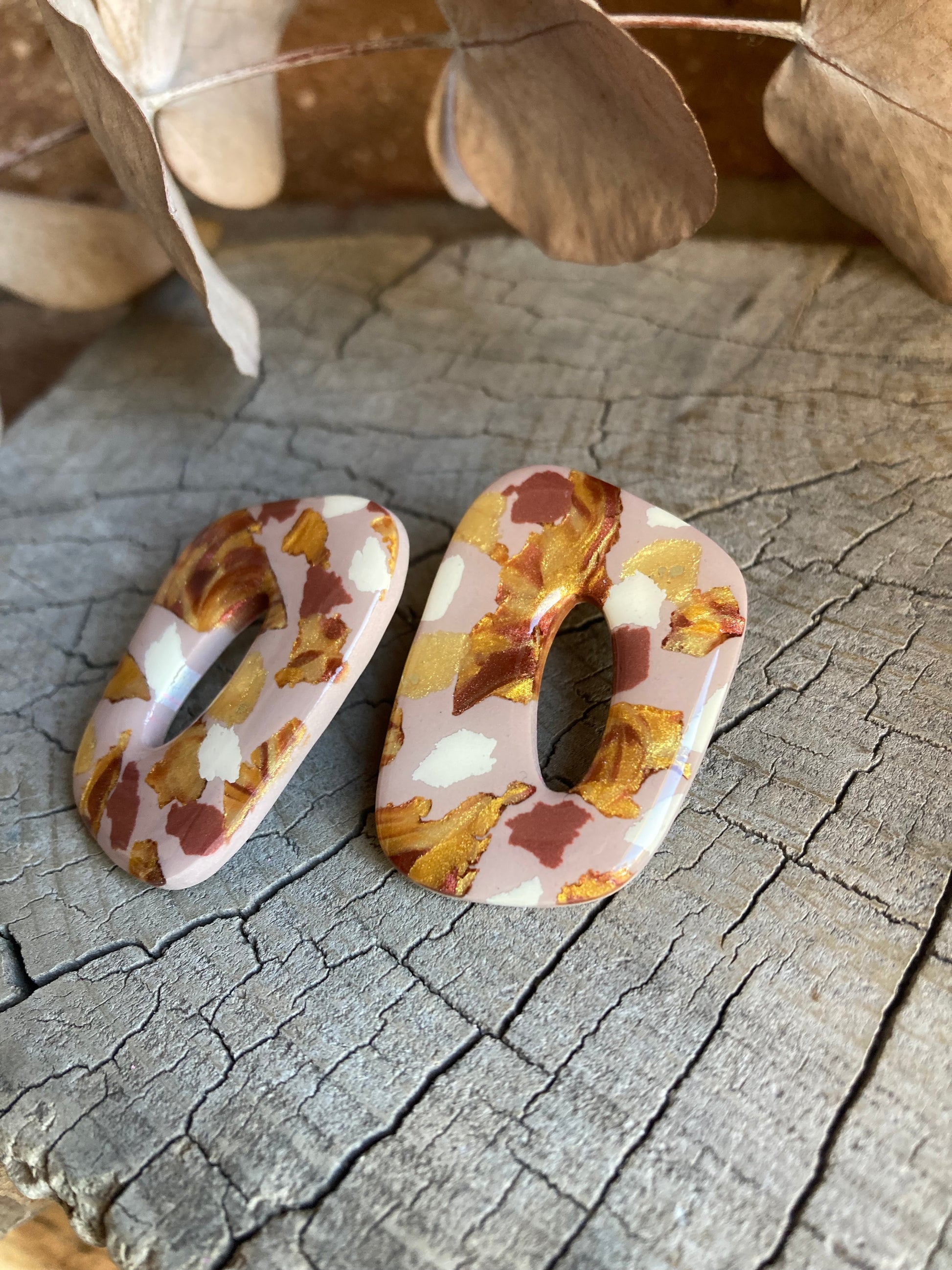 Aros de arcilla polimérica con top coat de resina uv. Miden 4 cms. Palito de acero quirúrgico y tope de goma.