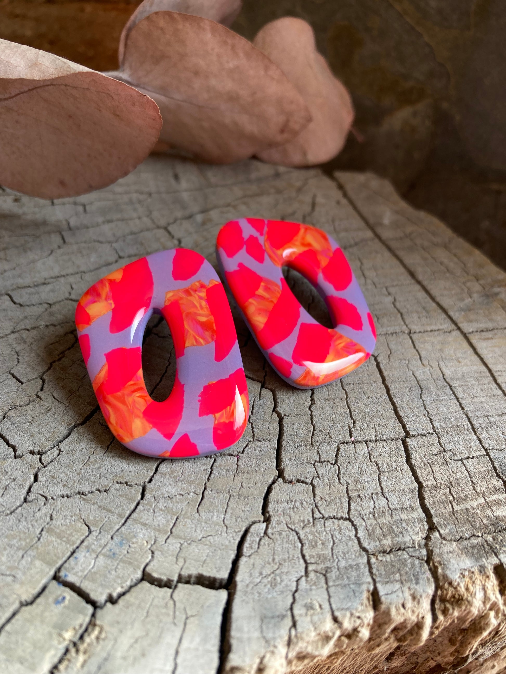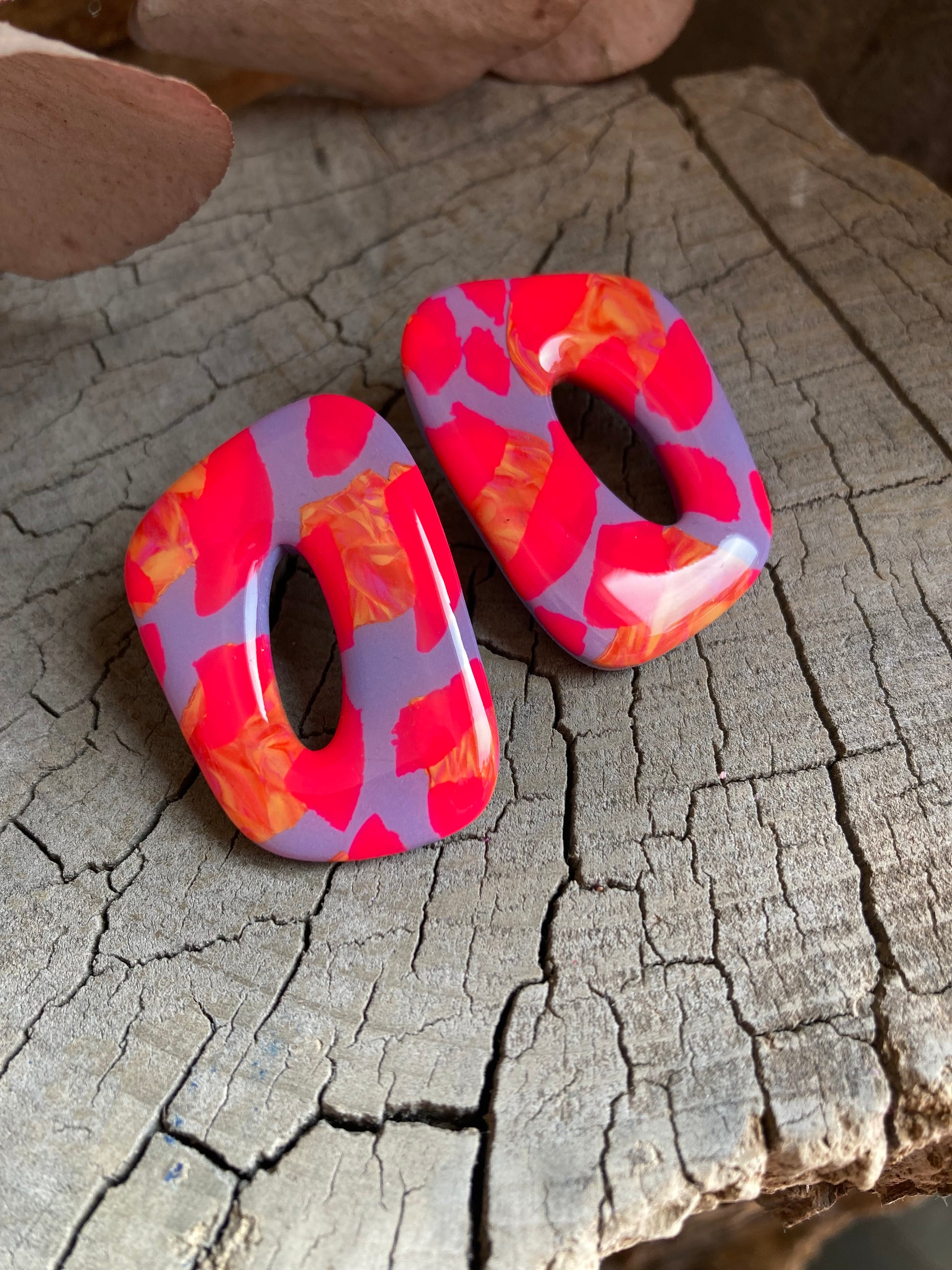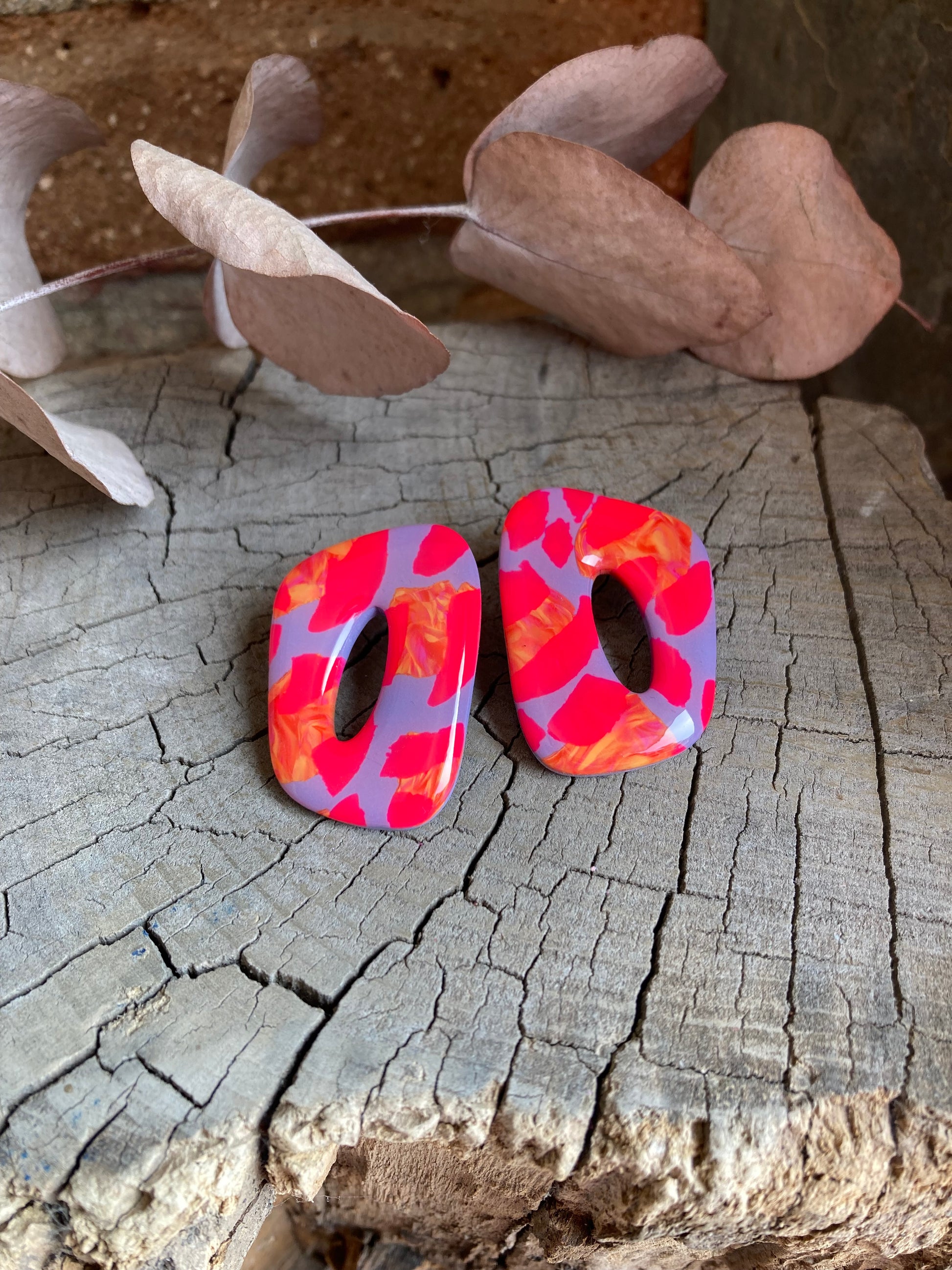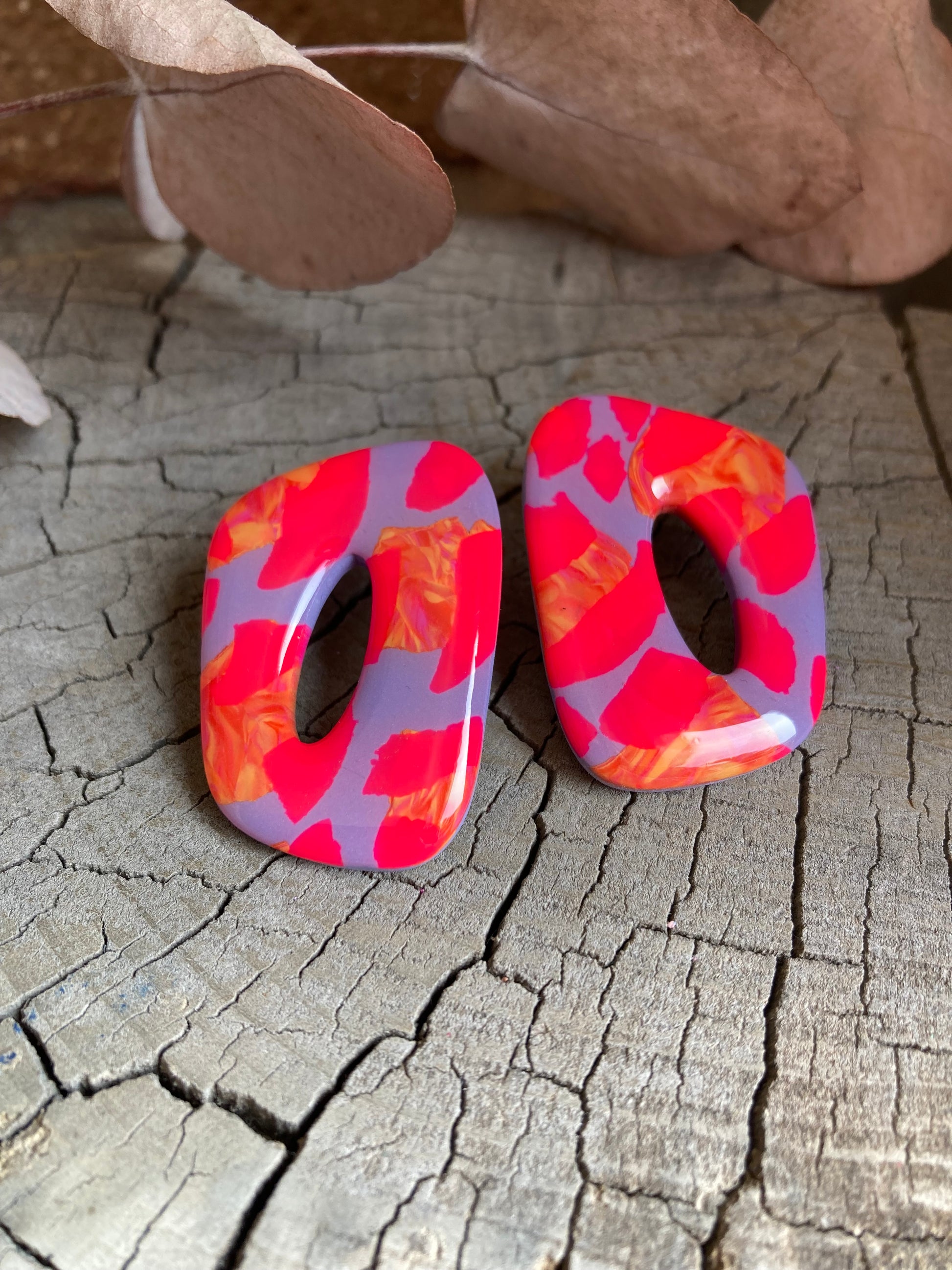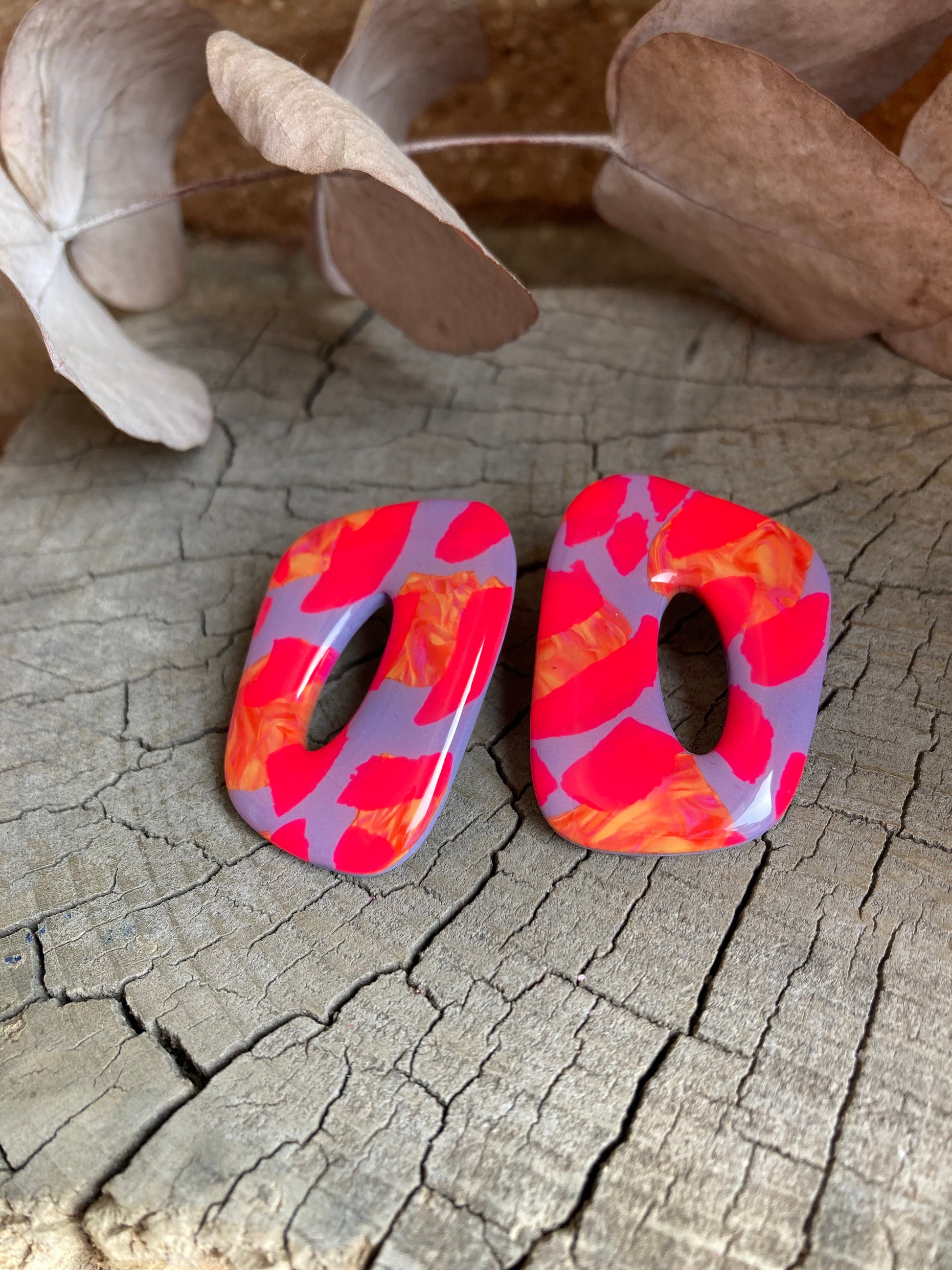 Aros de arcilla polimérica con top coat de resina uv. Miden 4 cms. Palito de acero quirúrgico y tope de goma.