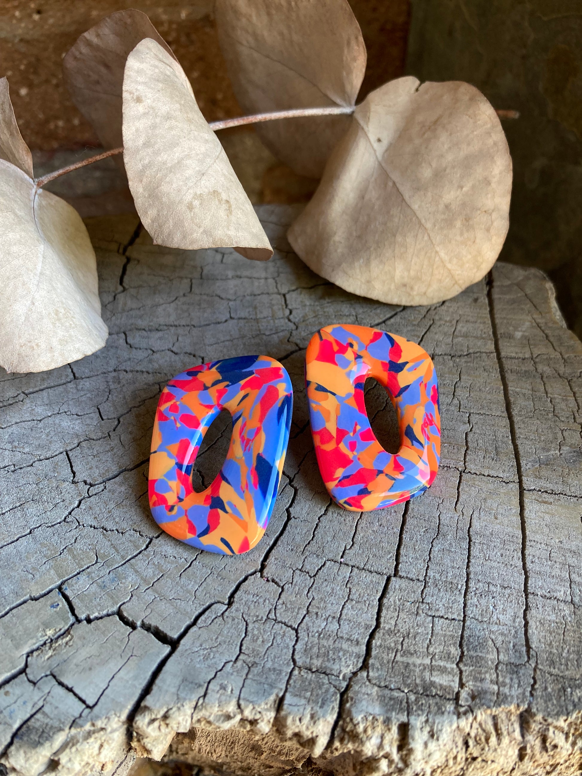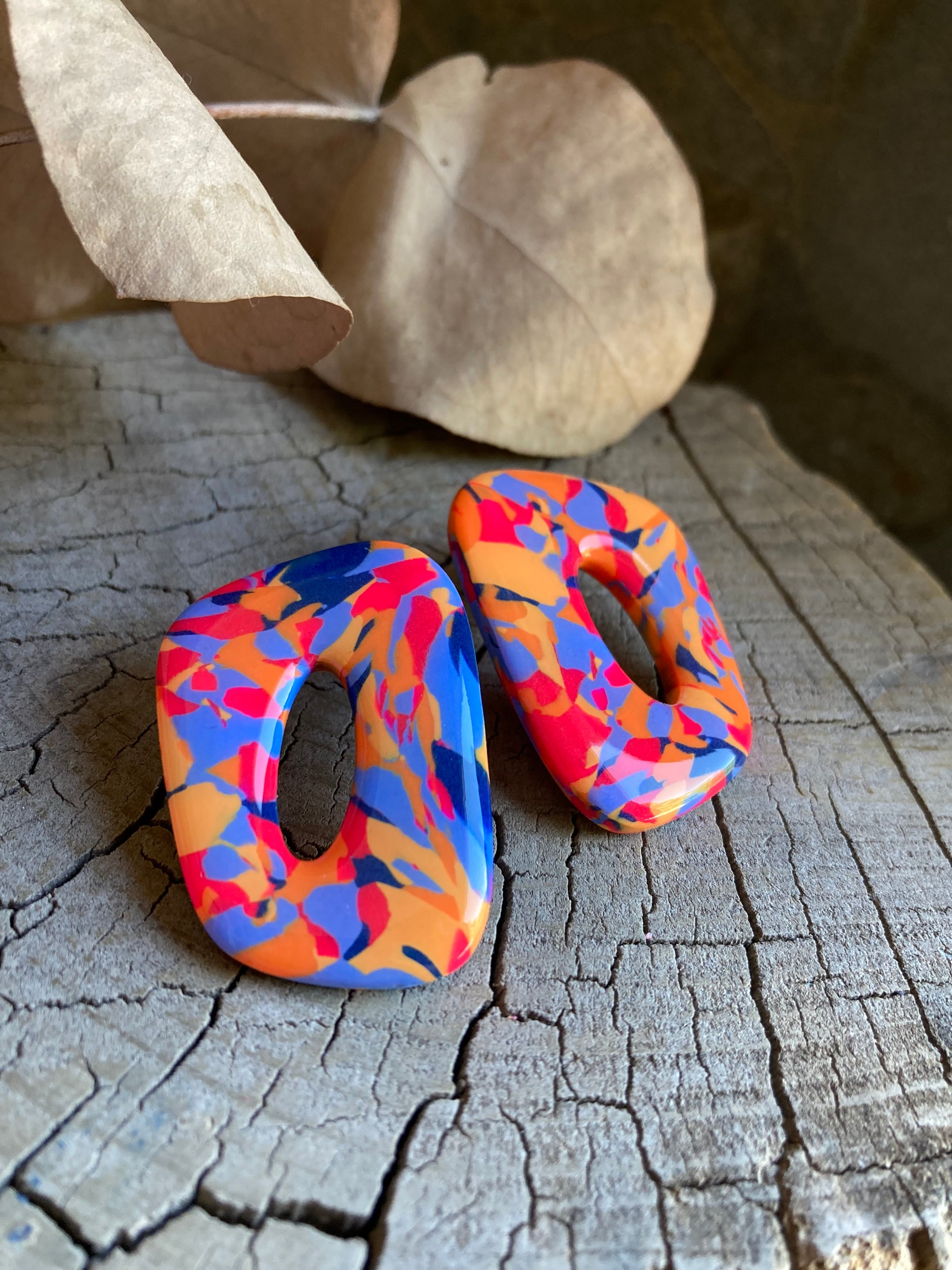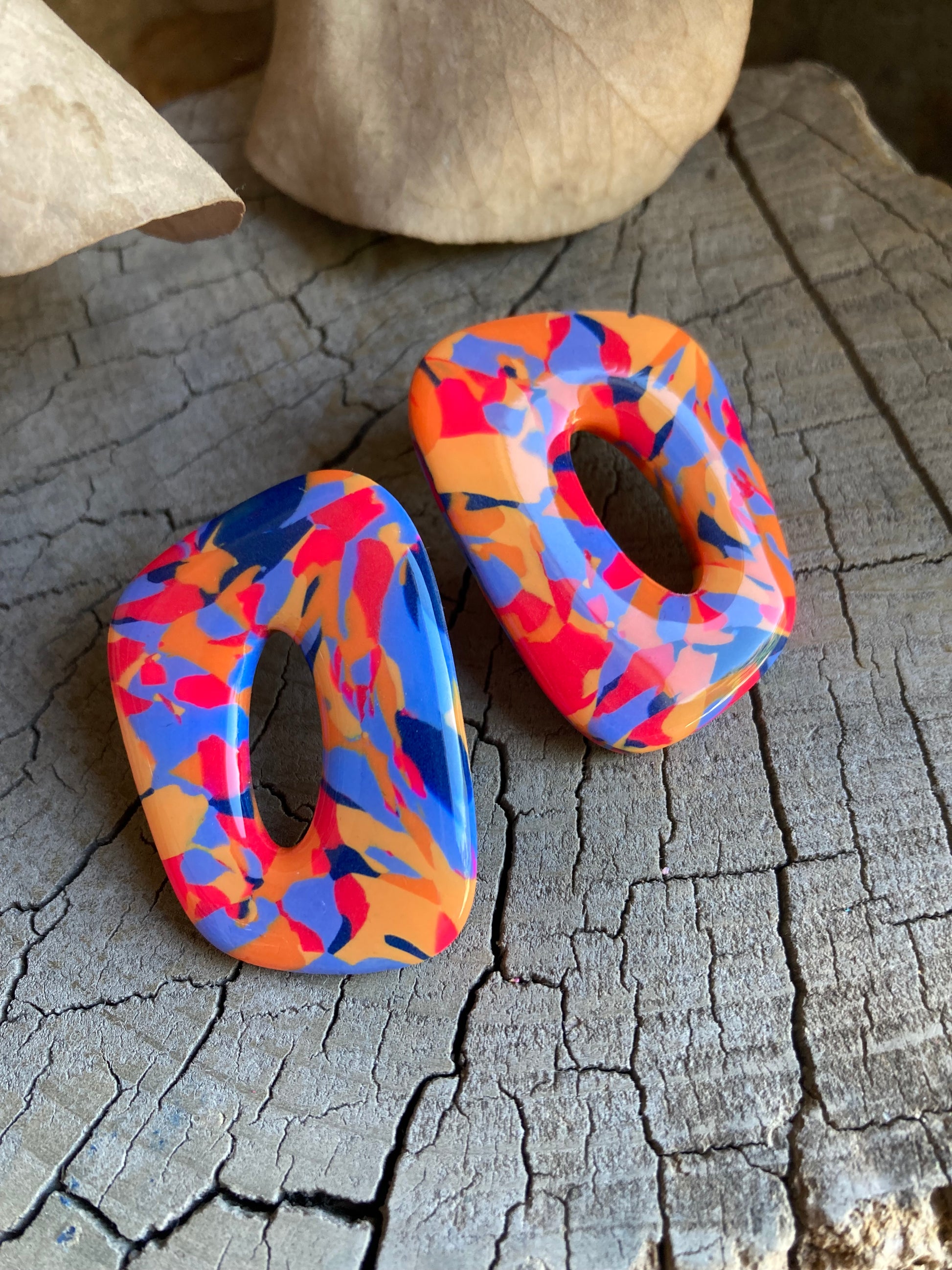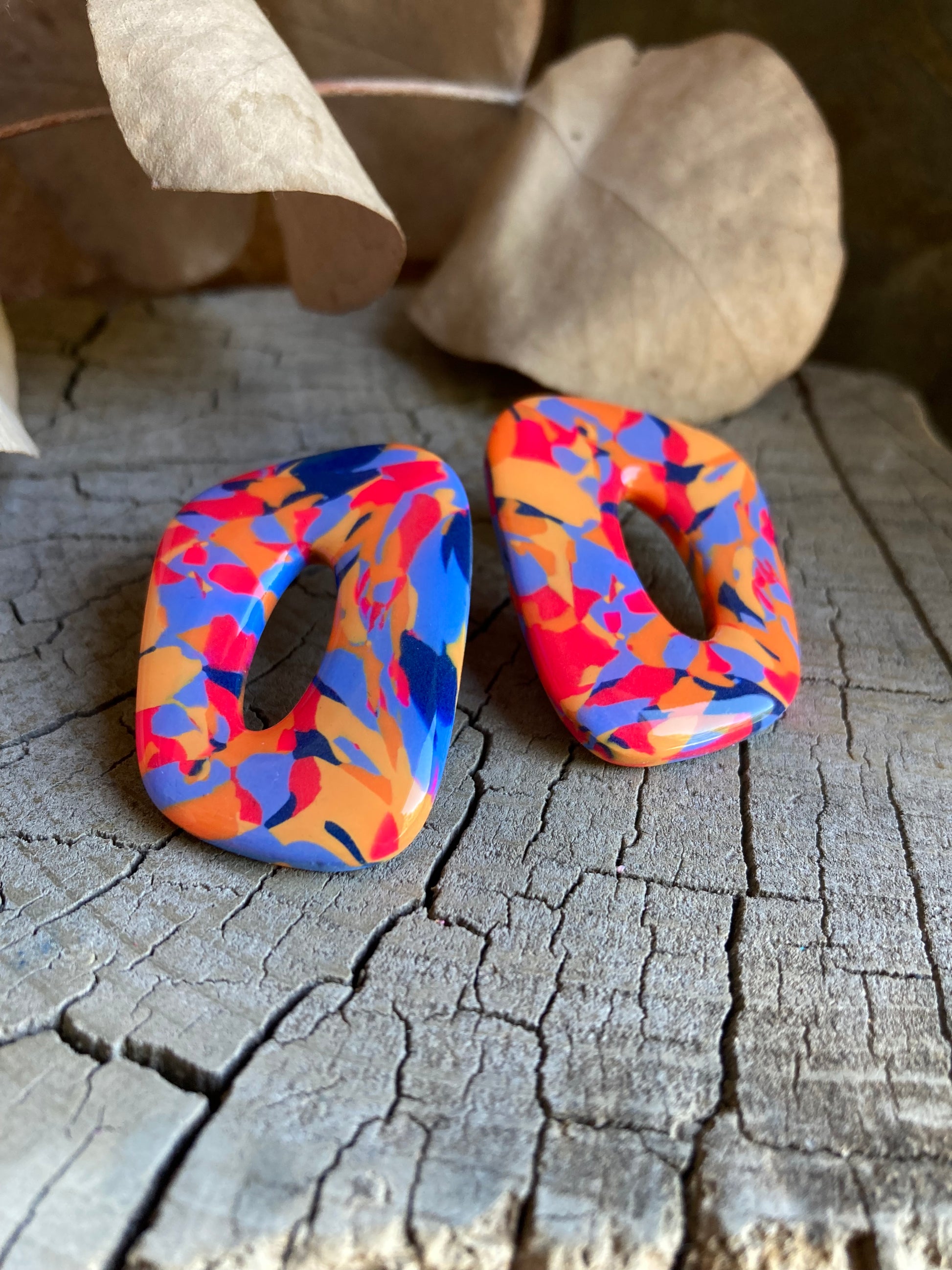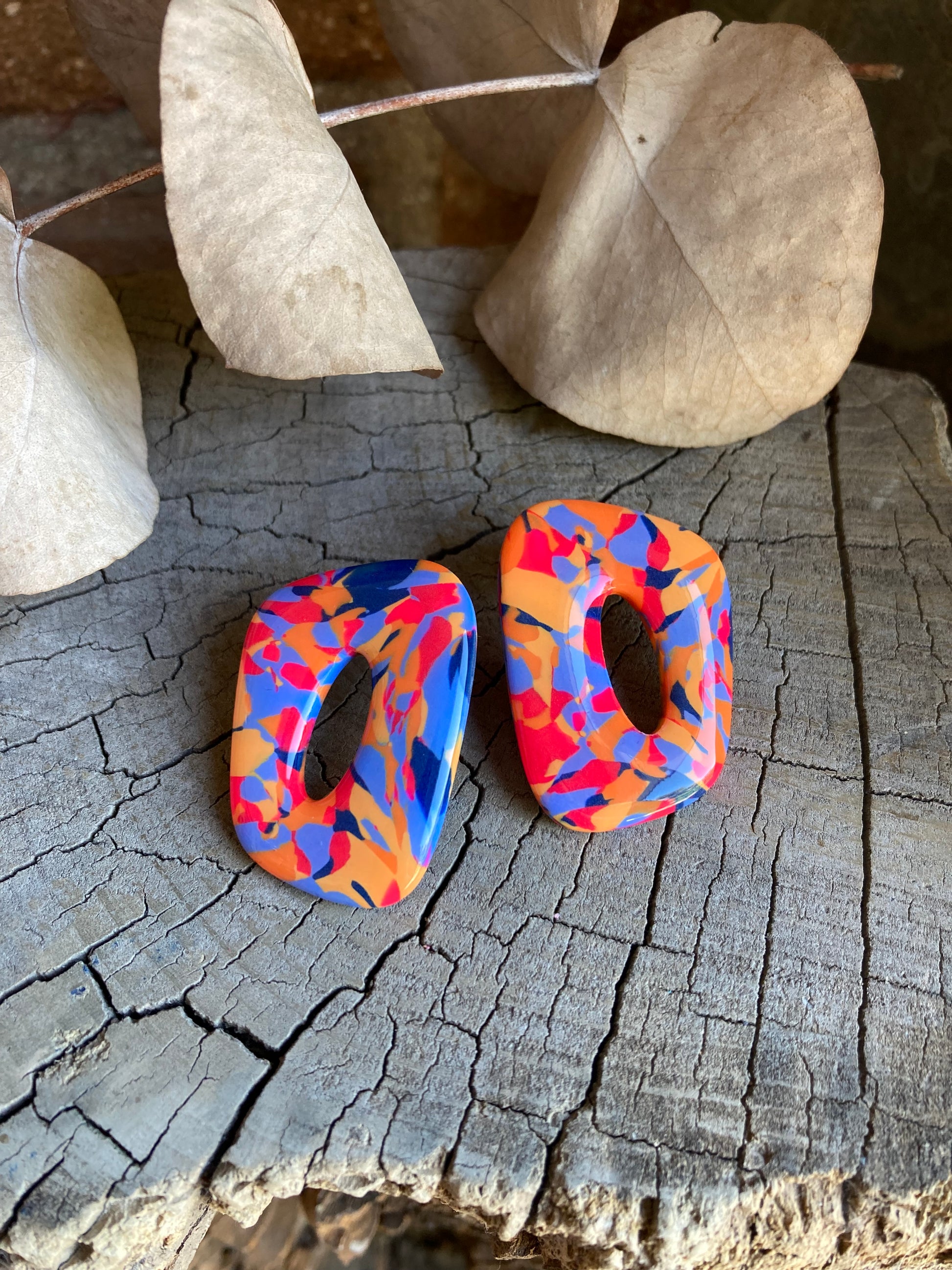 Aros de arcilla polimérica con top coat de resina uv. Miden 4 cms. Palito de acero quirúrgico y tope de goma.