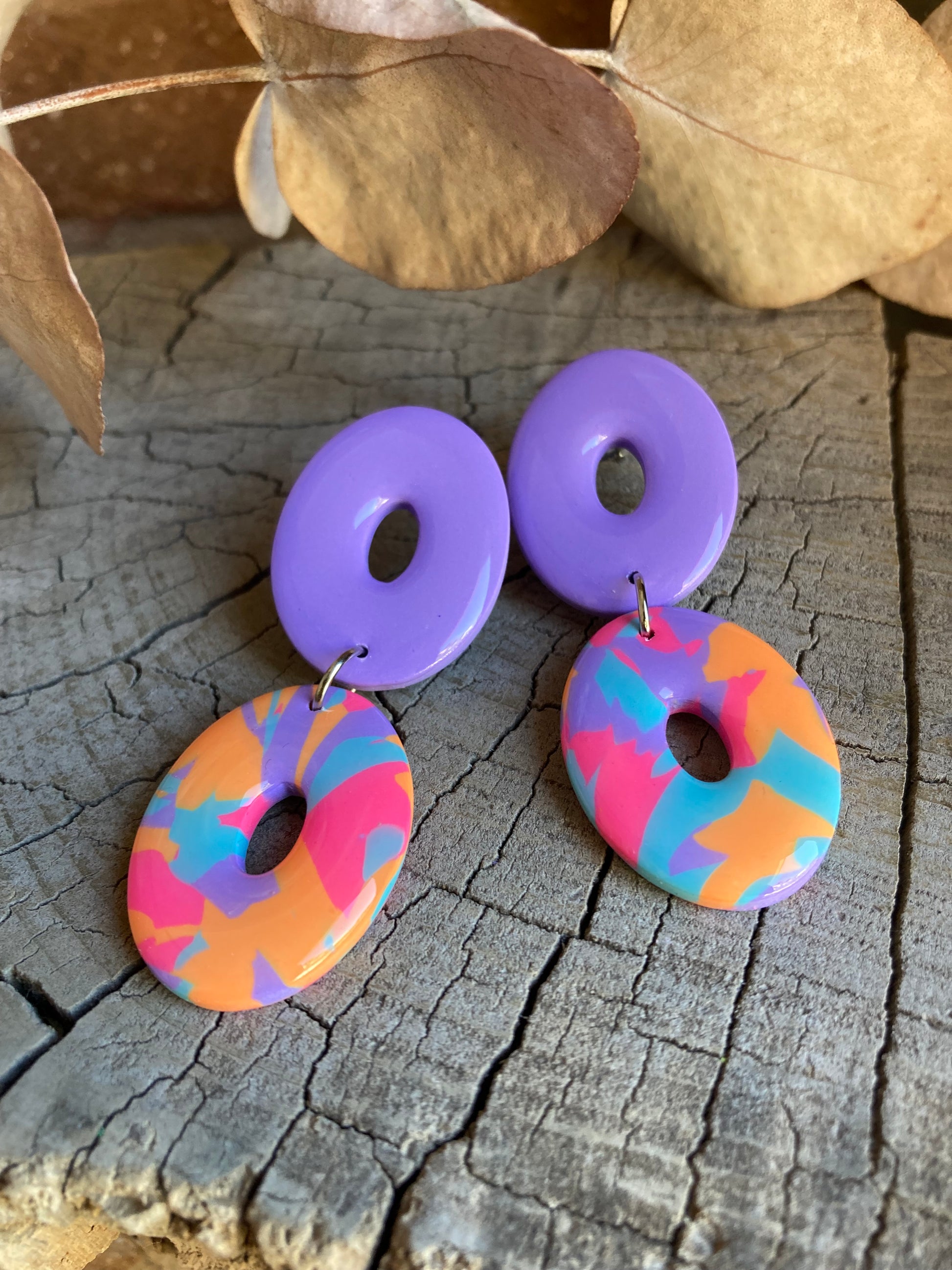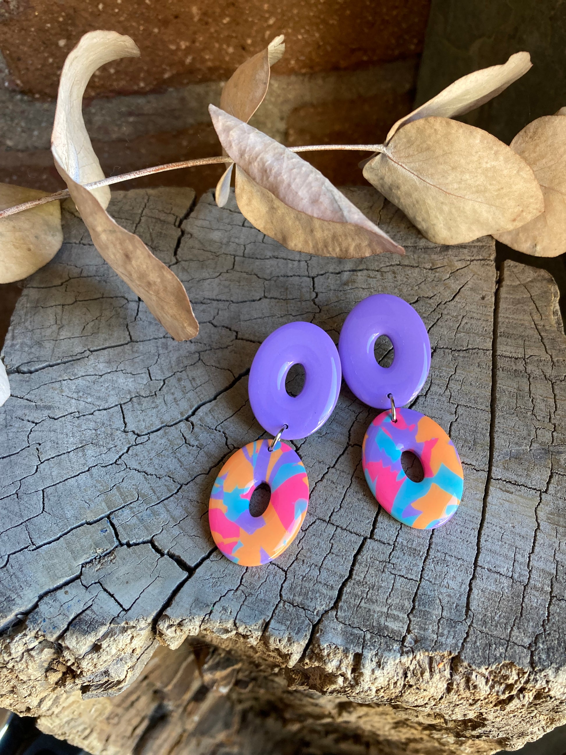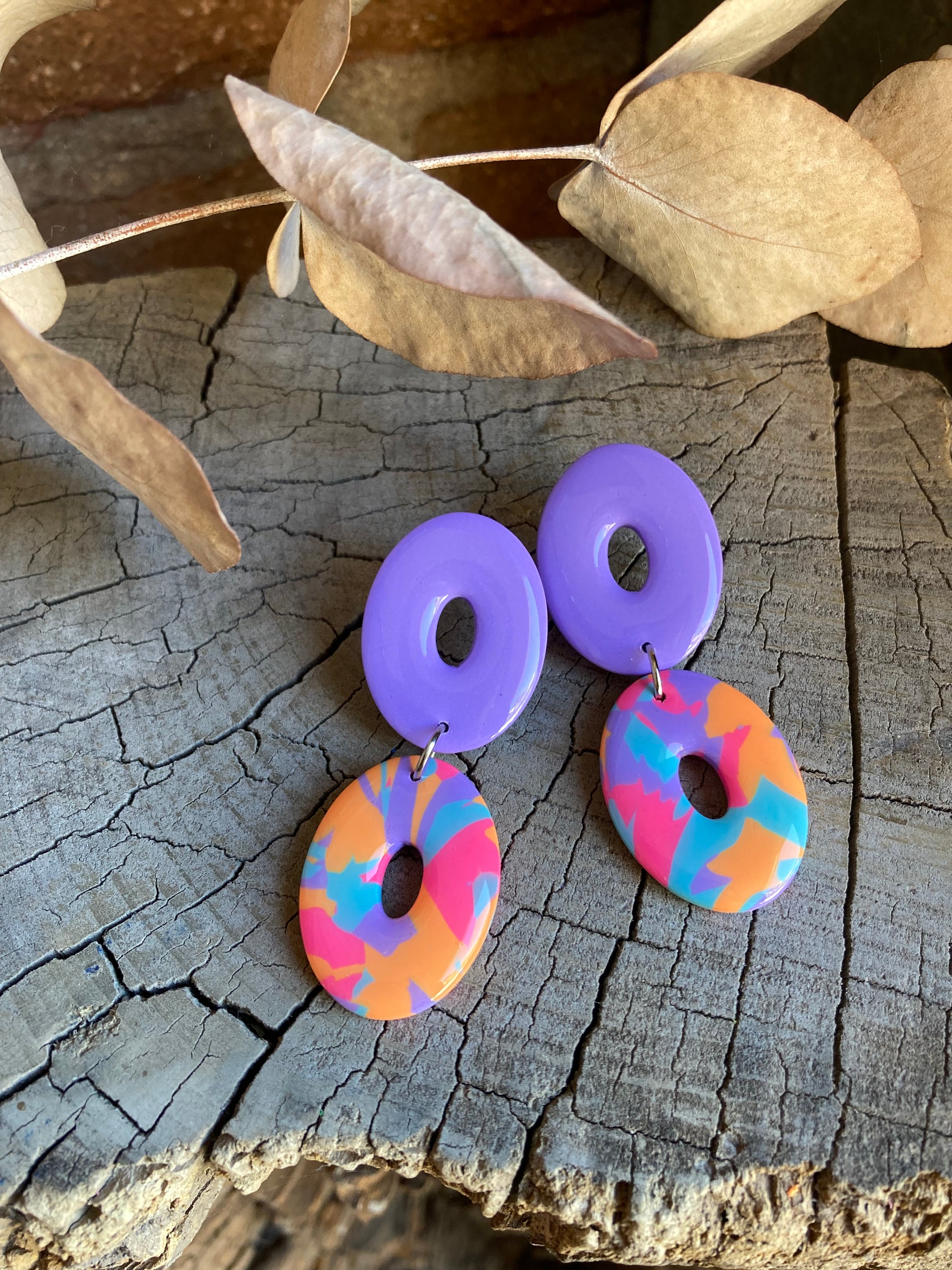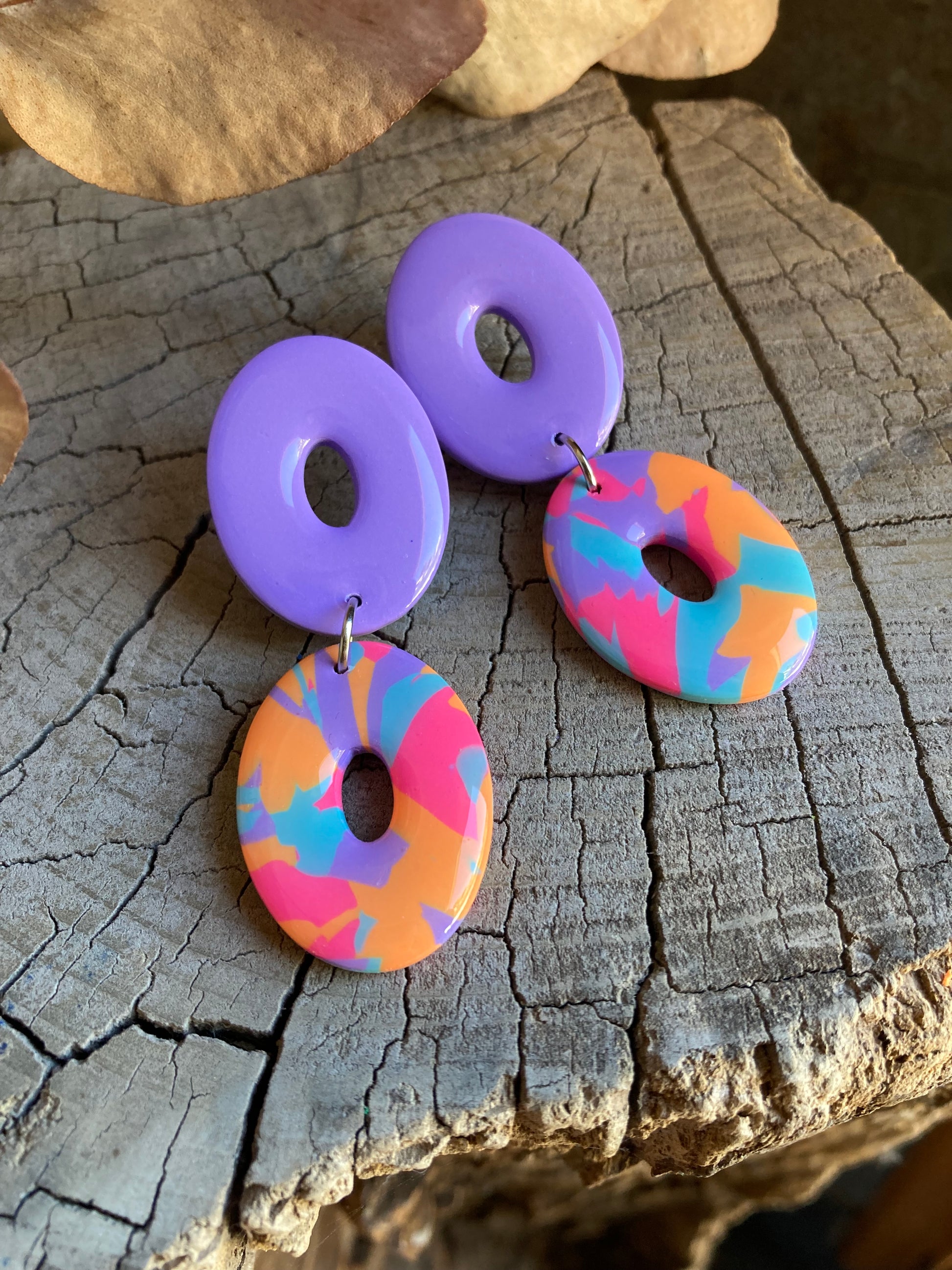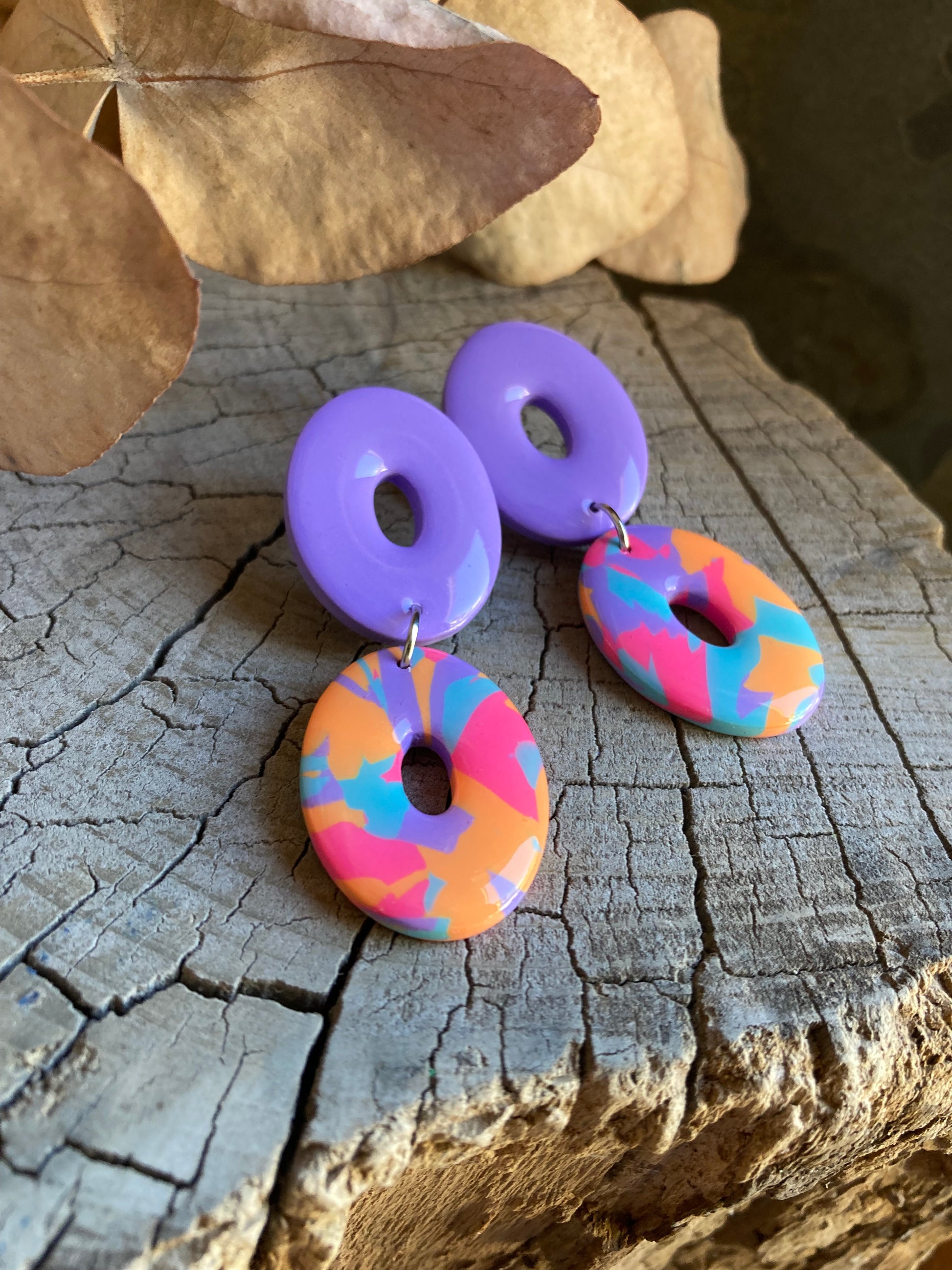 Aros de arcilla polimérica con top coat de resina uv. Miden 6 cms. Palito de acero quirúrgico y tope de goma.