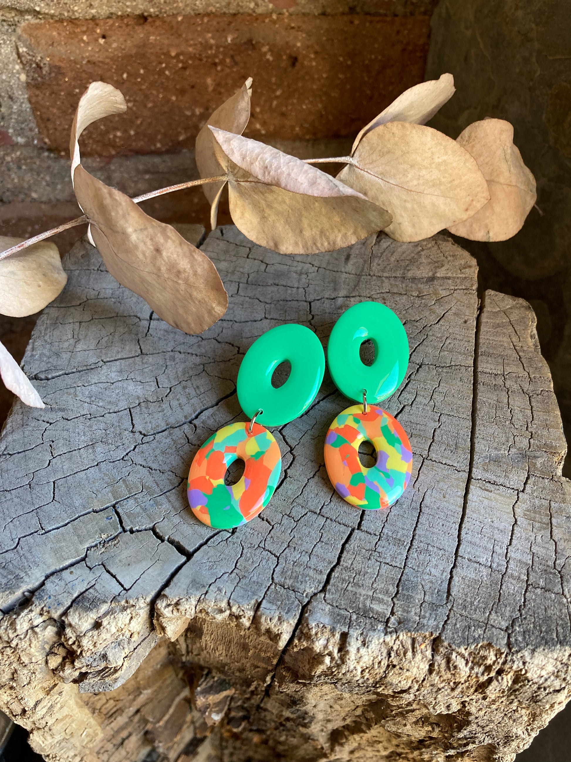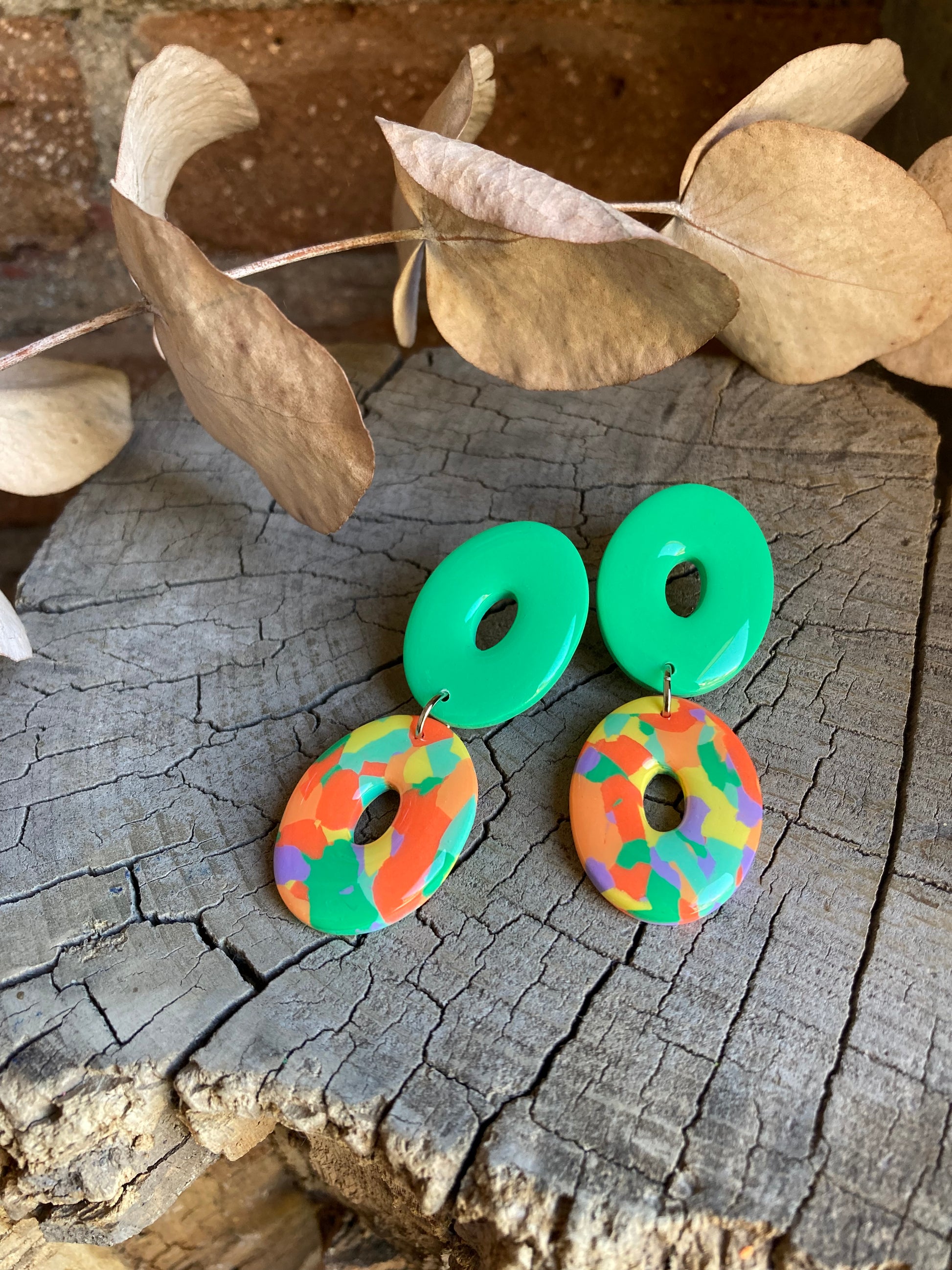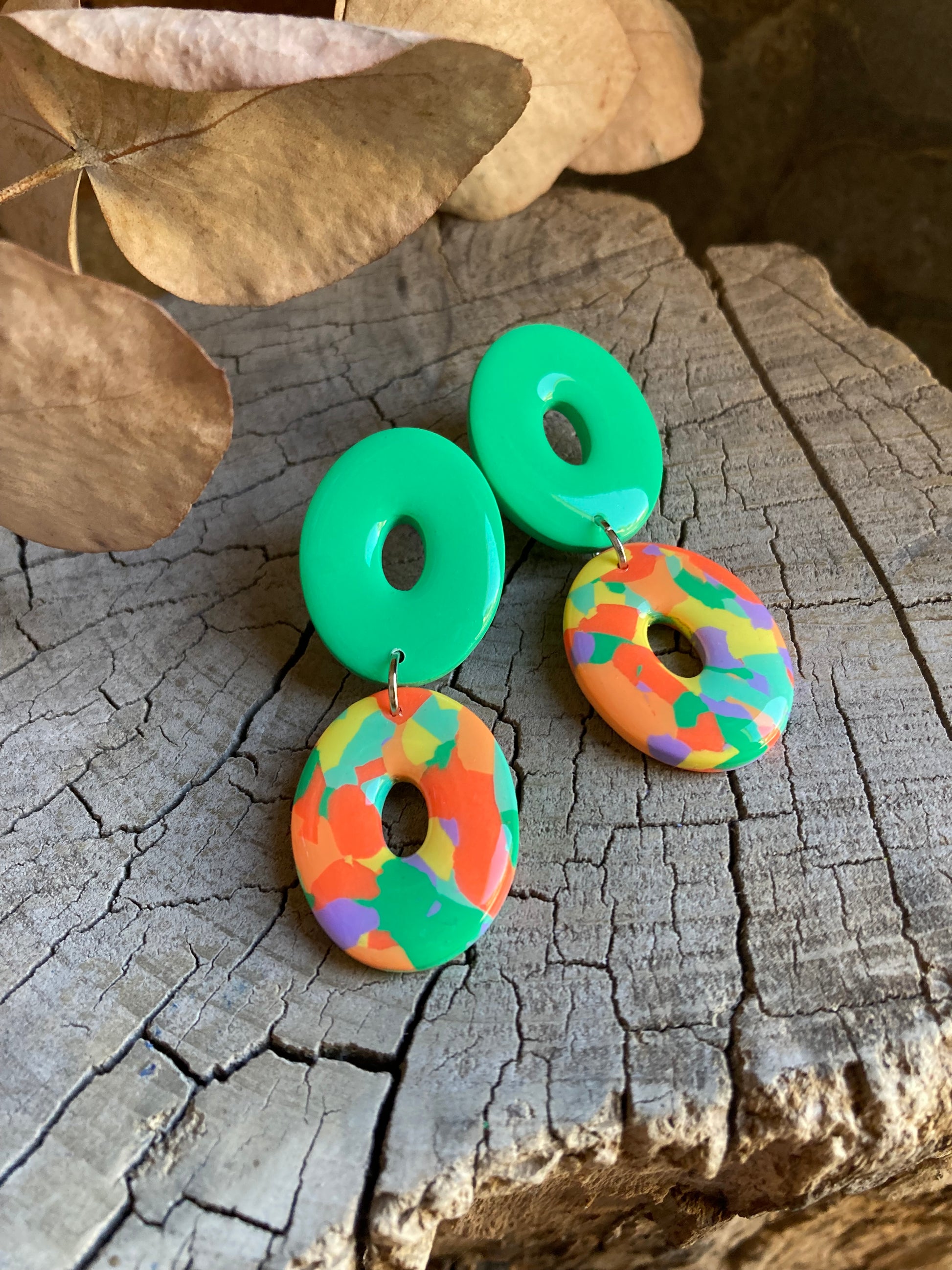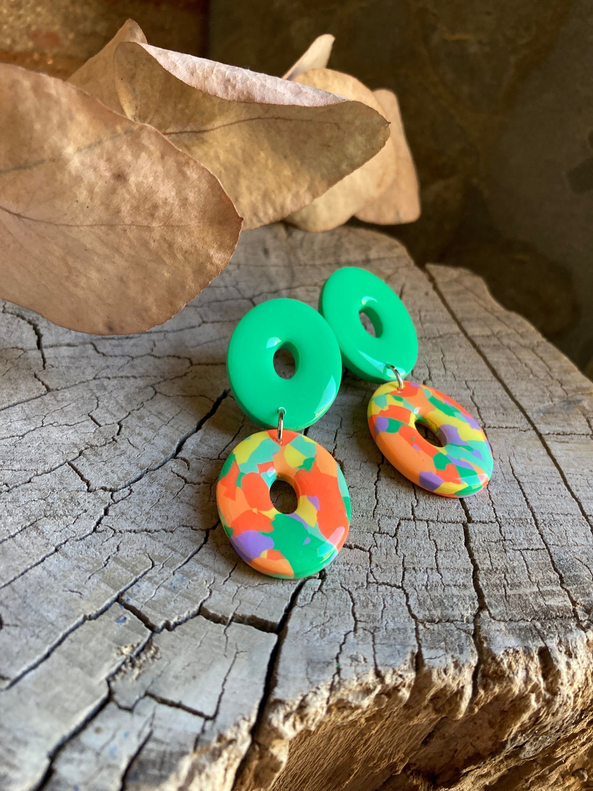 Aros de arcilla polimérica con top coat de resina uv. Miden 6 cms. Palito de acero quirúrgico y tope de goma.