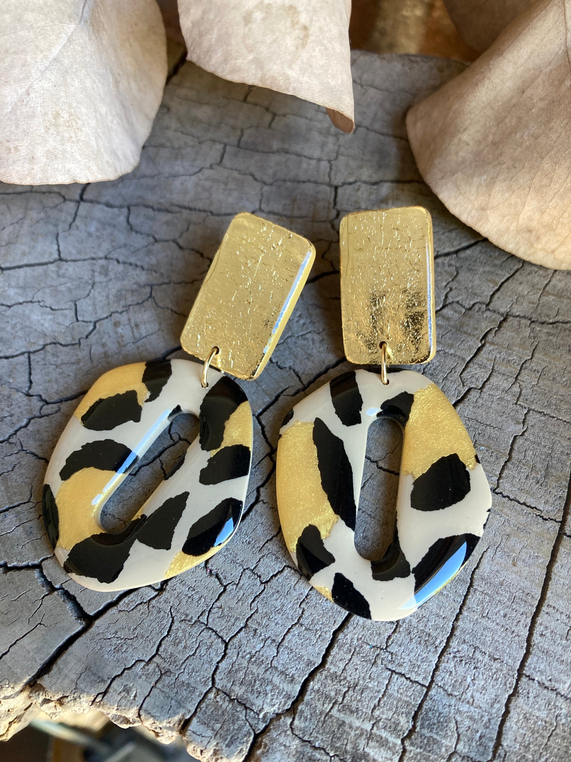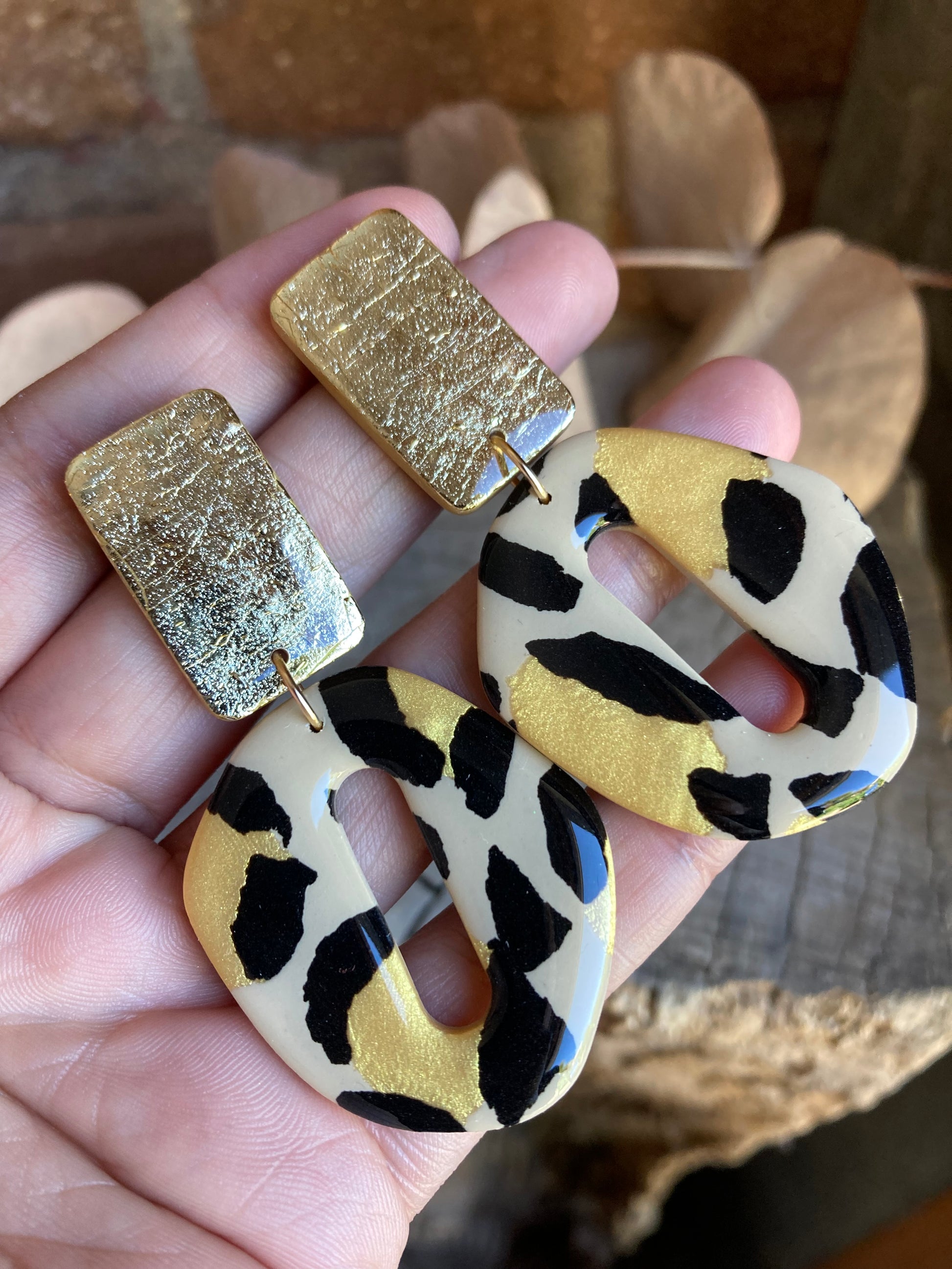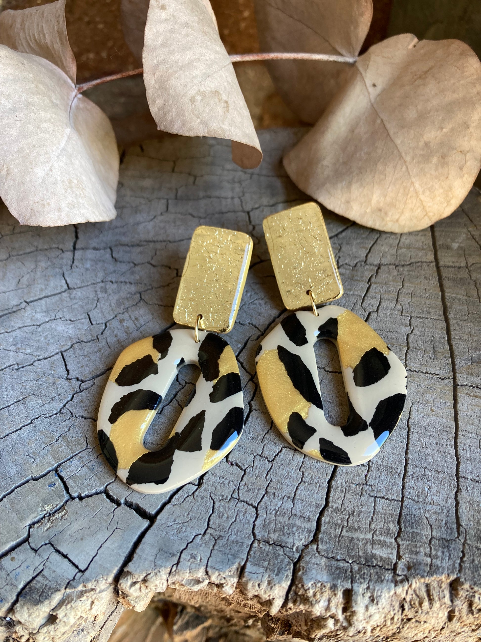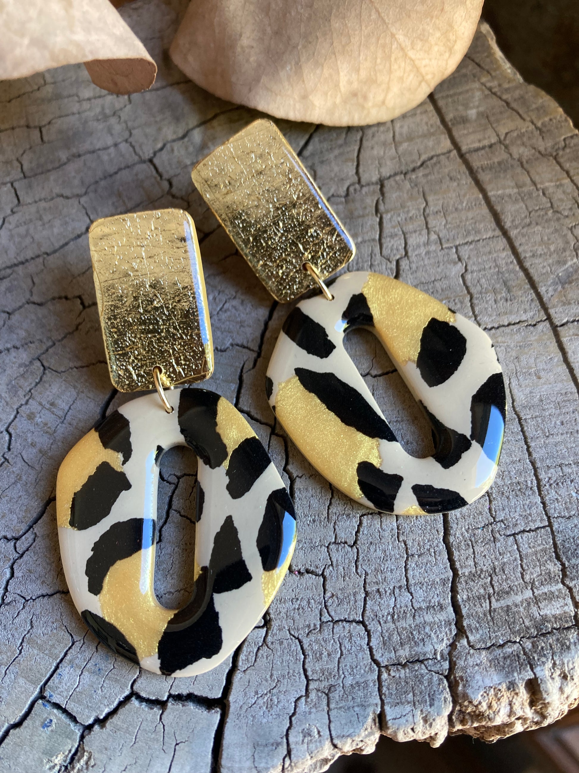 Aros de arcilla polimérica con top coat de resina uv. Miden 6,5 cms. Palito de acero quirúrgico y tope de goma.