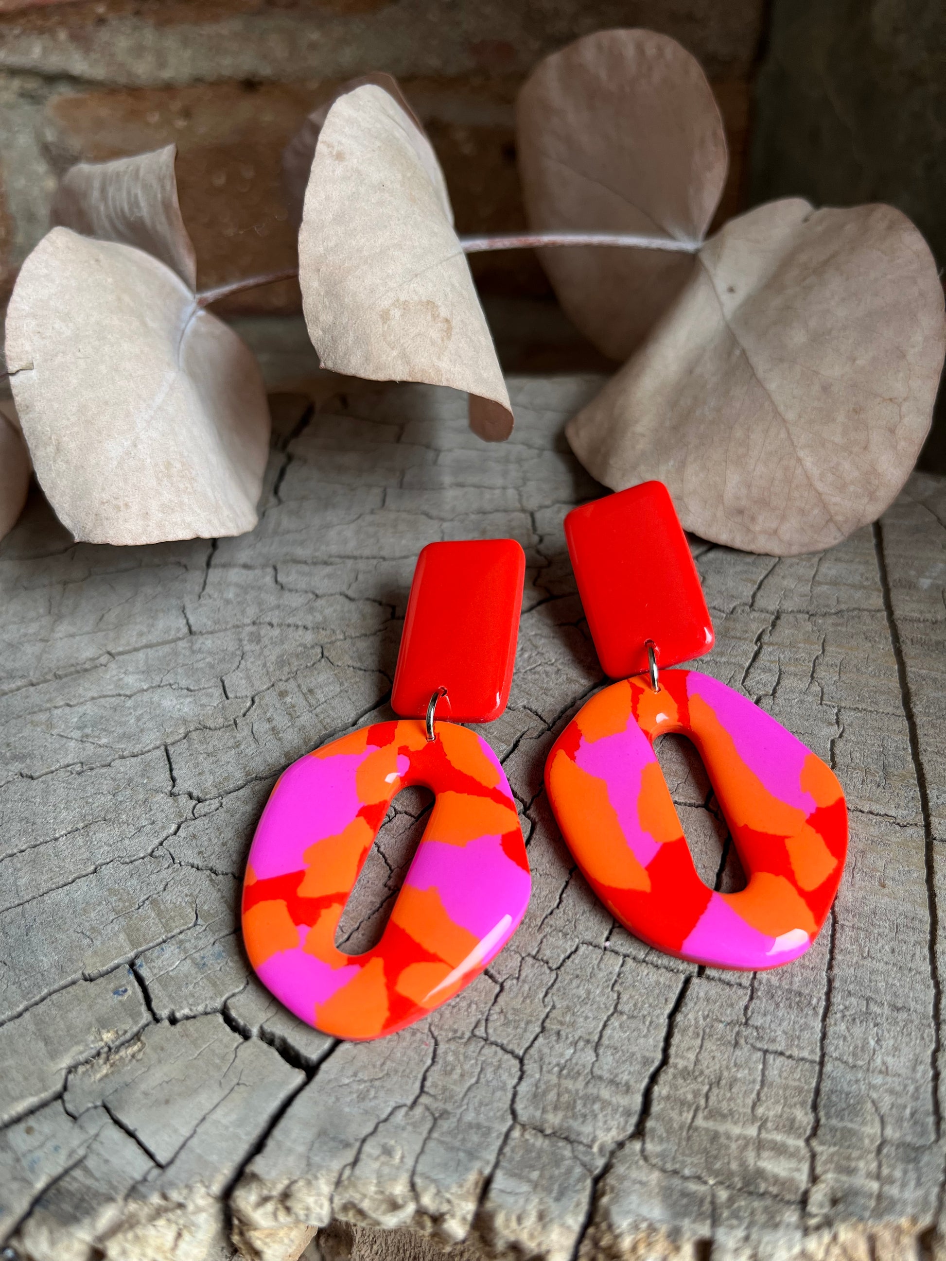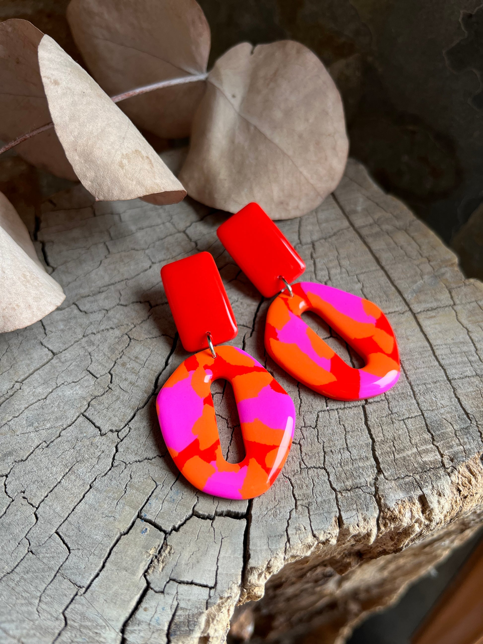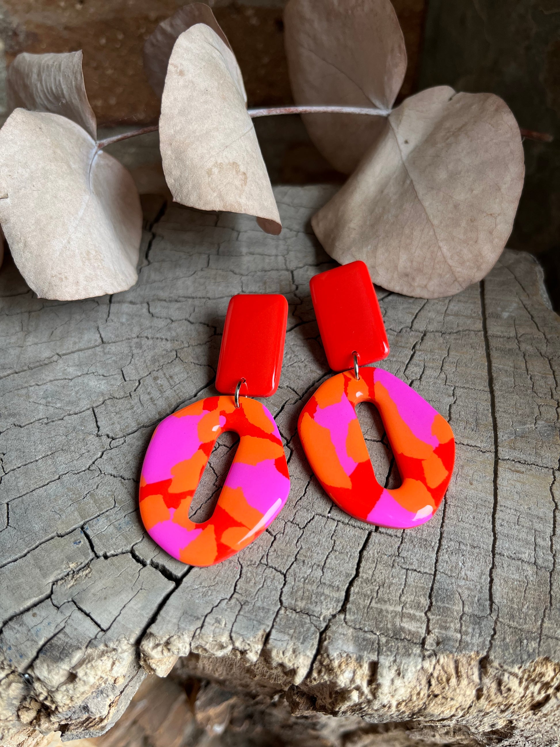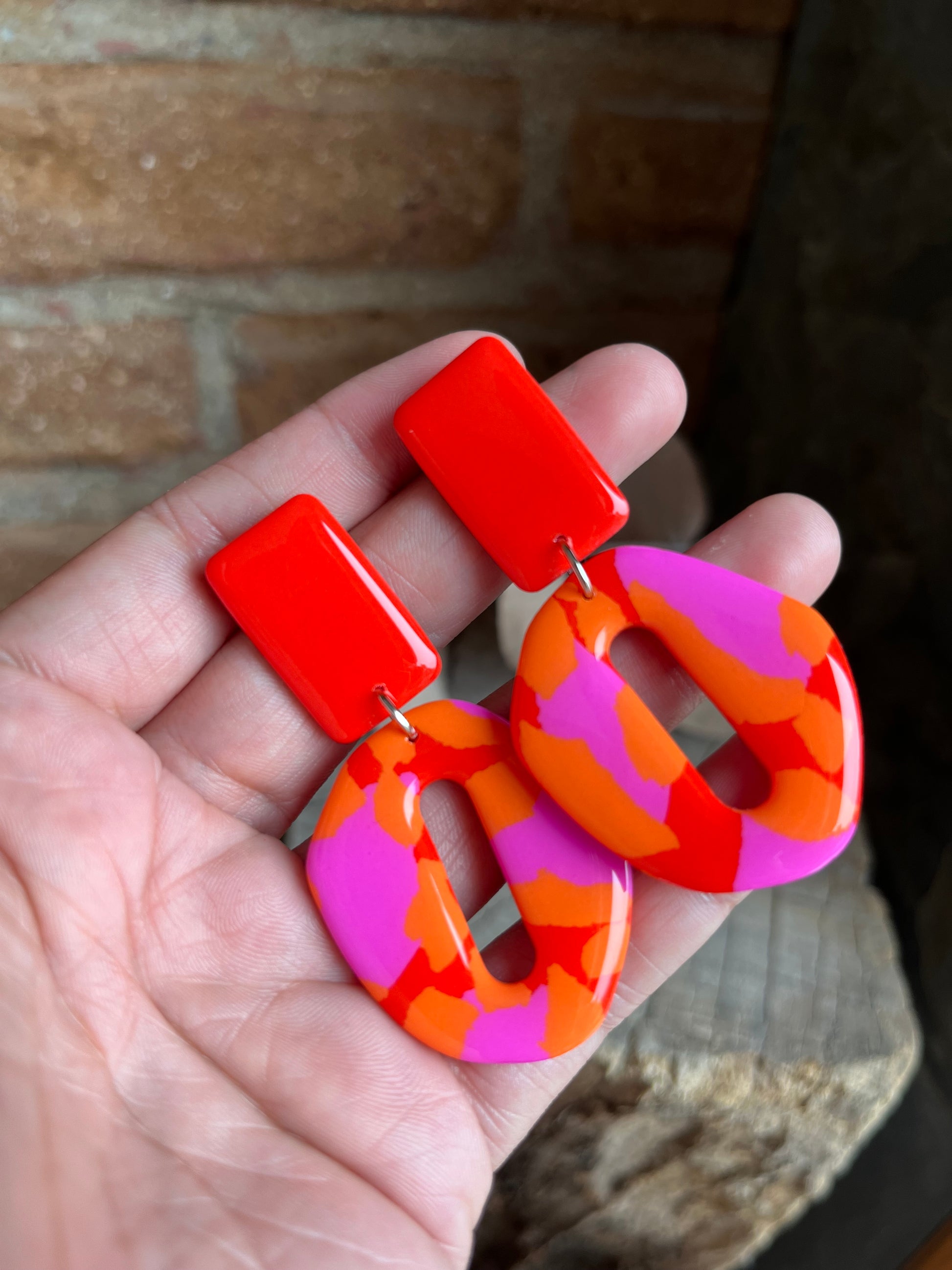 Aros de arcilla polimérica con top coat de resina uv. Miden 6,5 cms. Palito de acero quirúrgico y tope de goma.