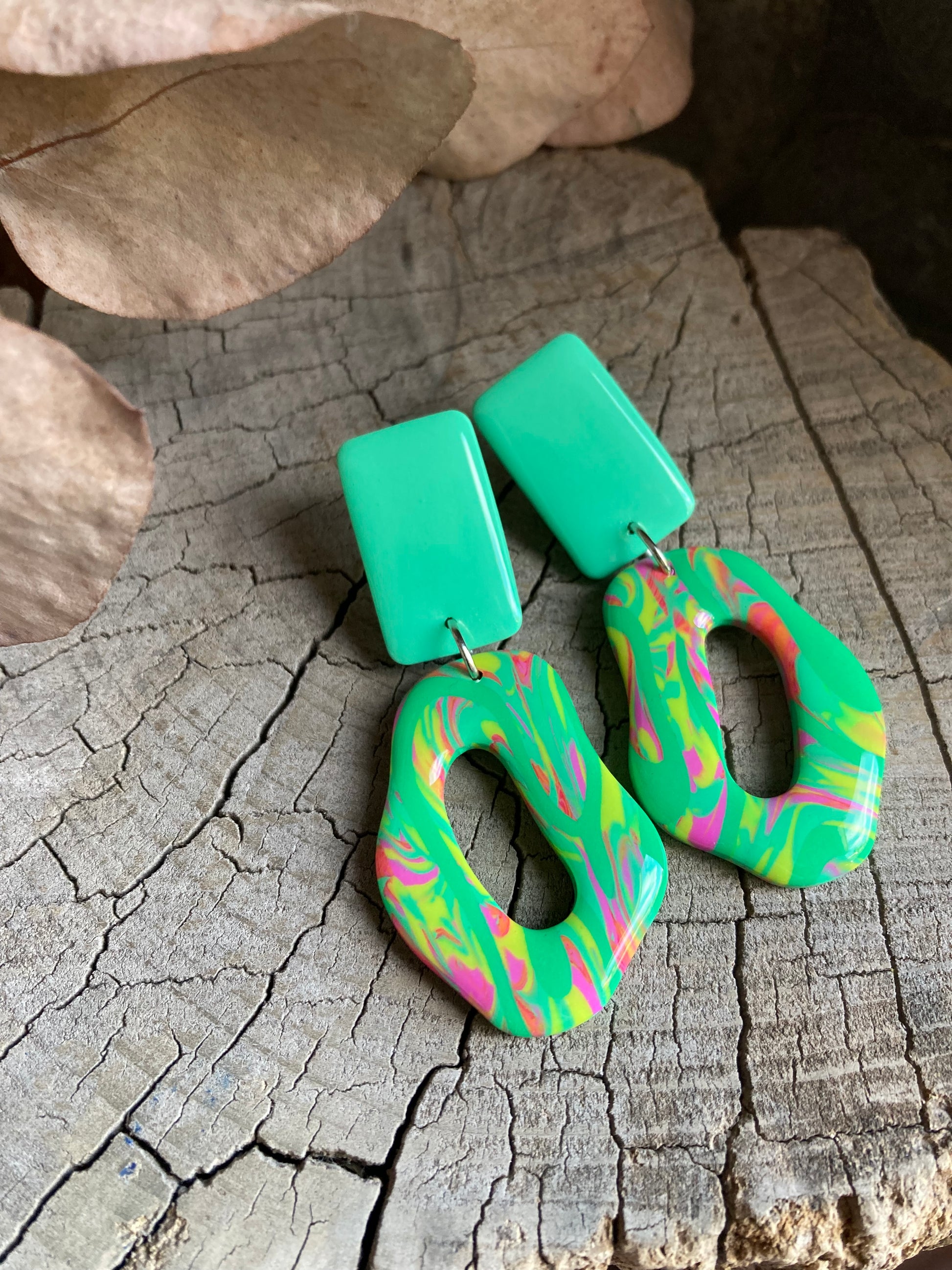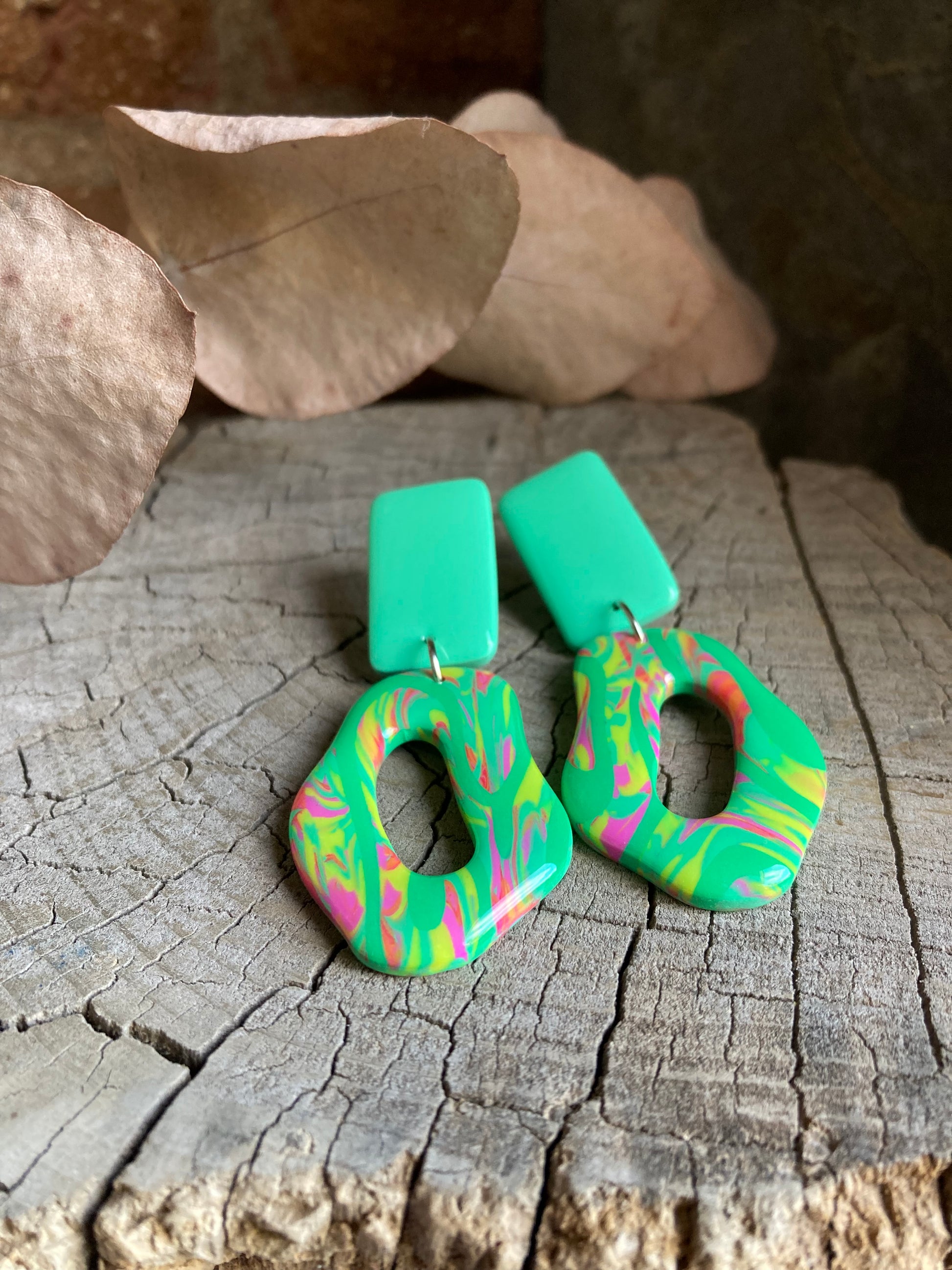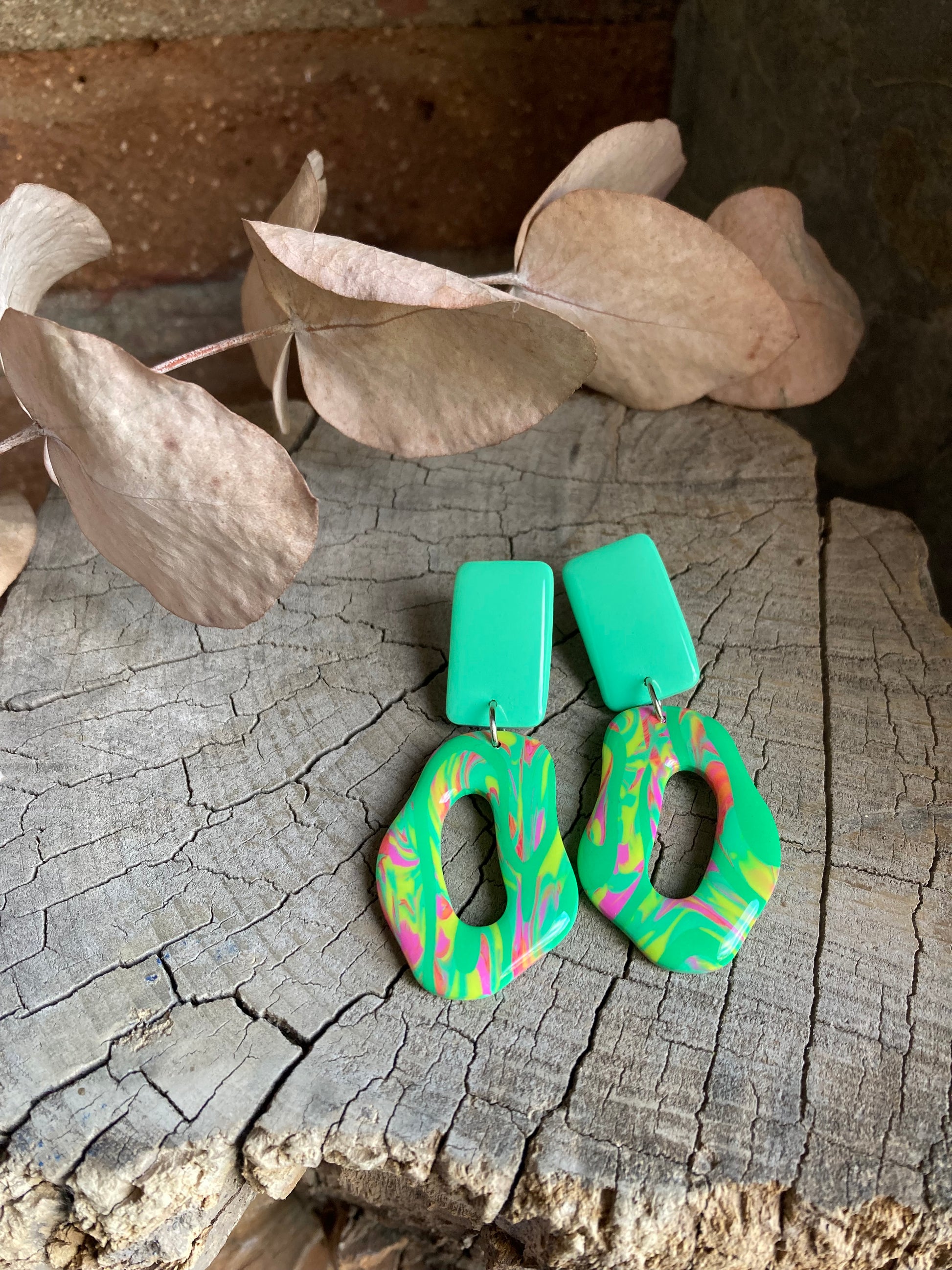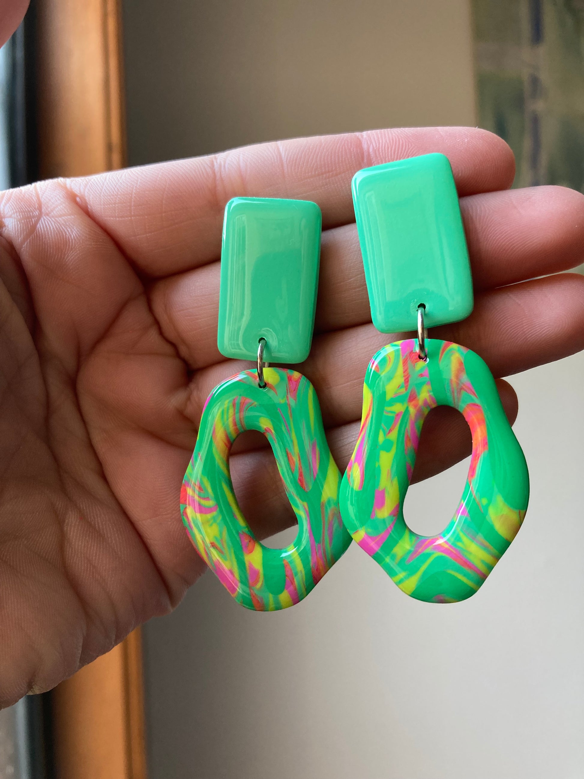 Aros de arcilla polimérica con top coat de resina uv. Miden 6,5 cms. Palito de acero quirúrgico y tope de goma.
