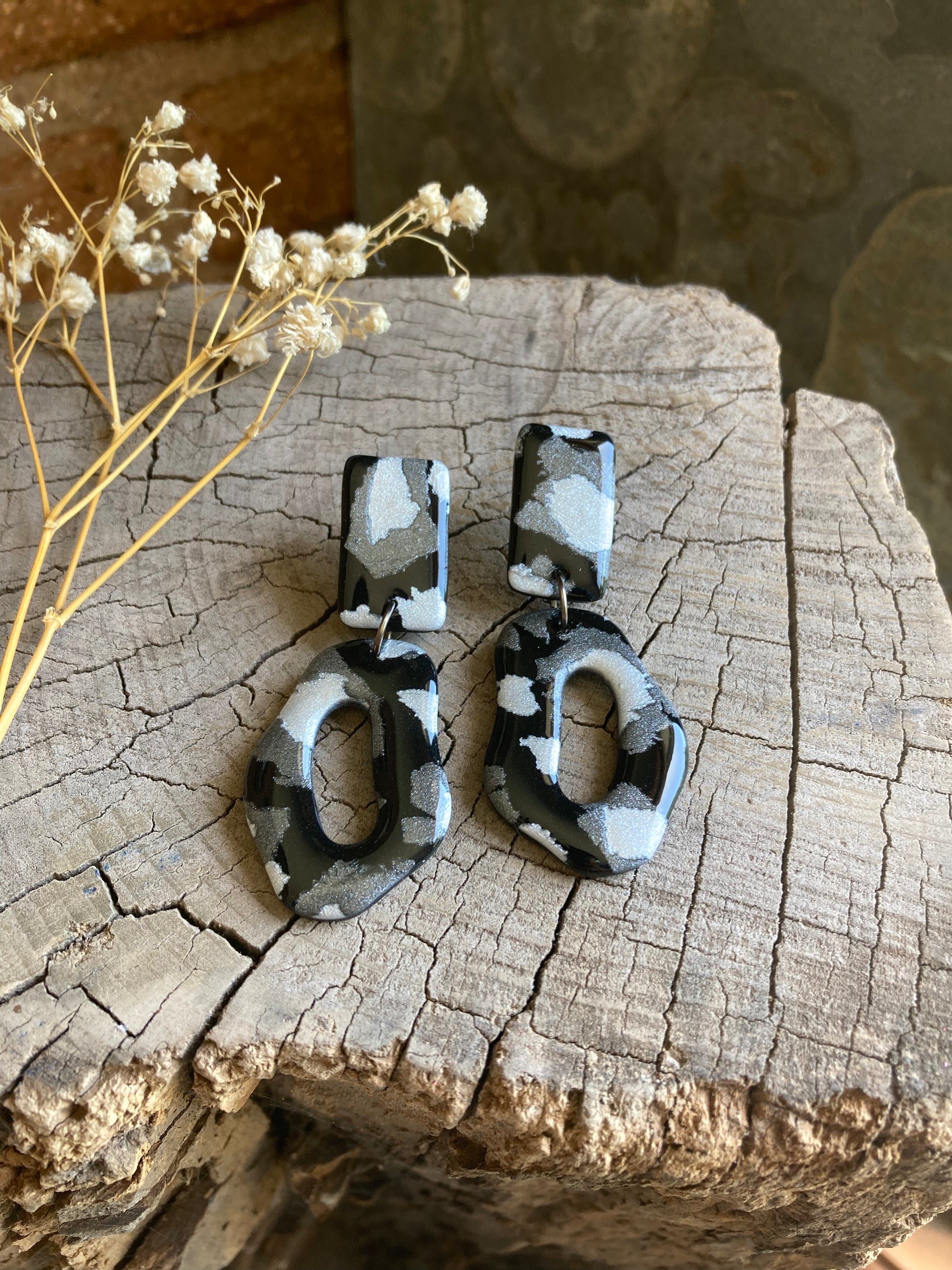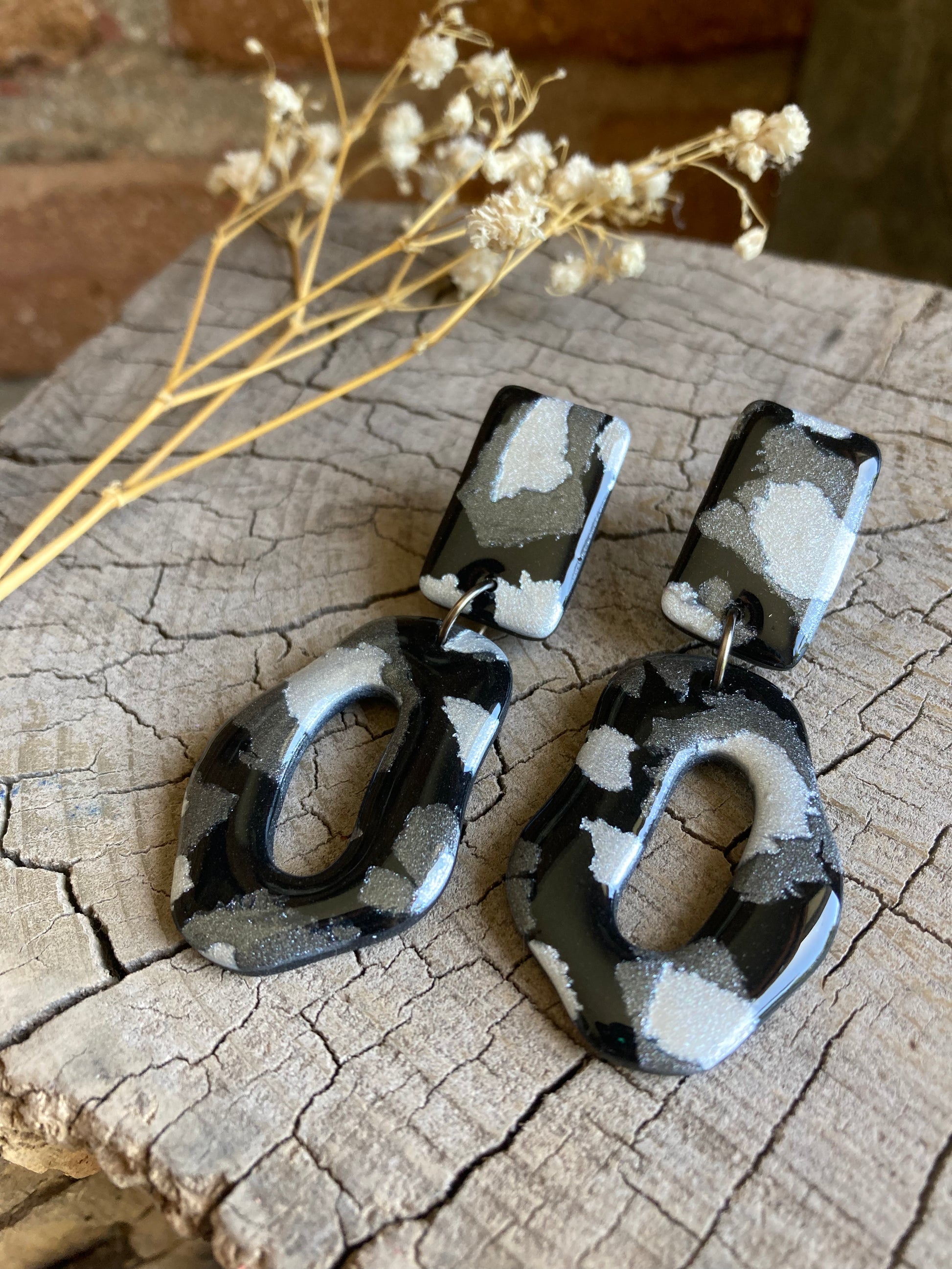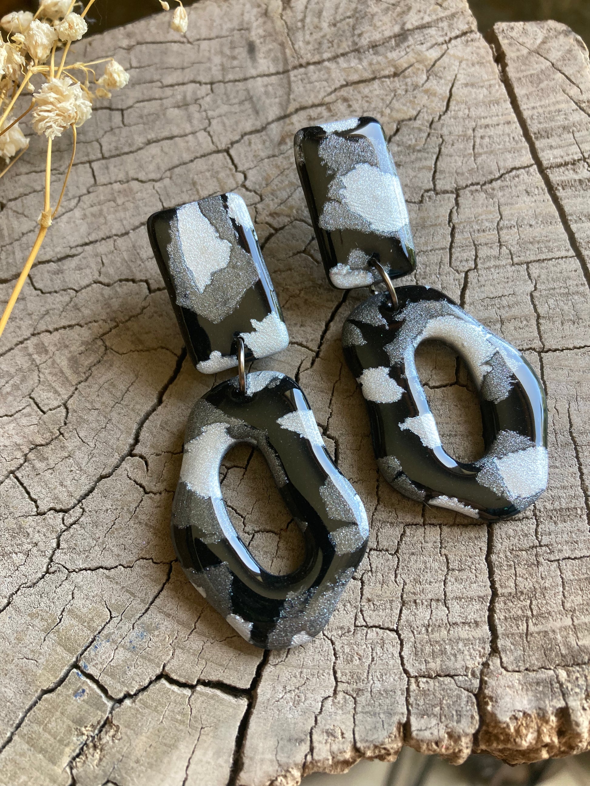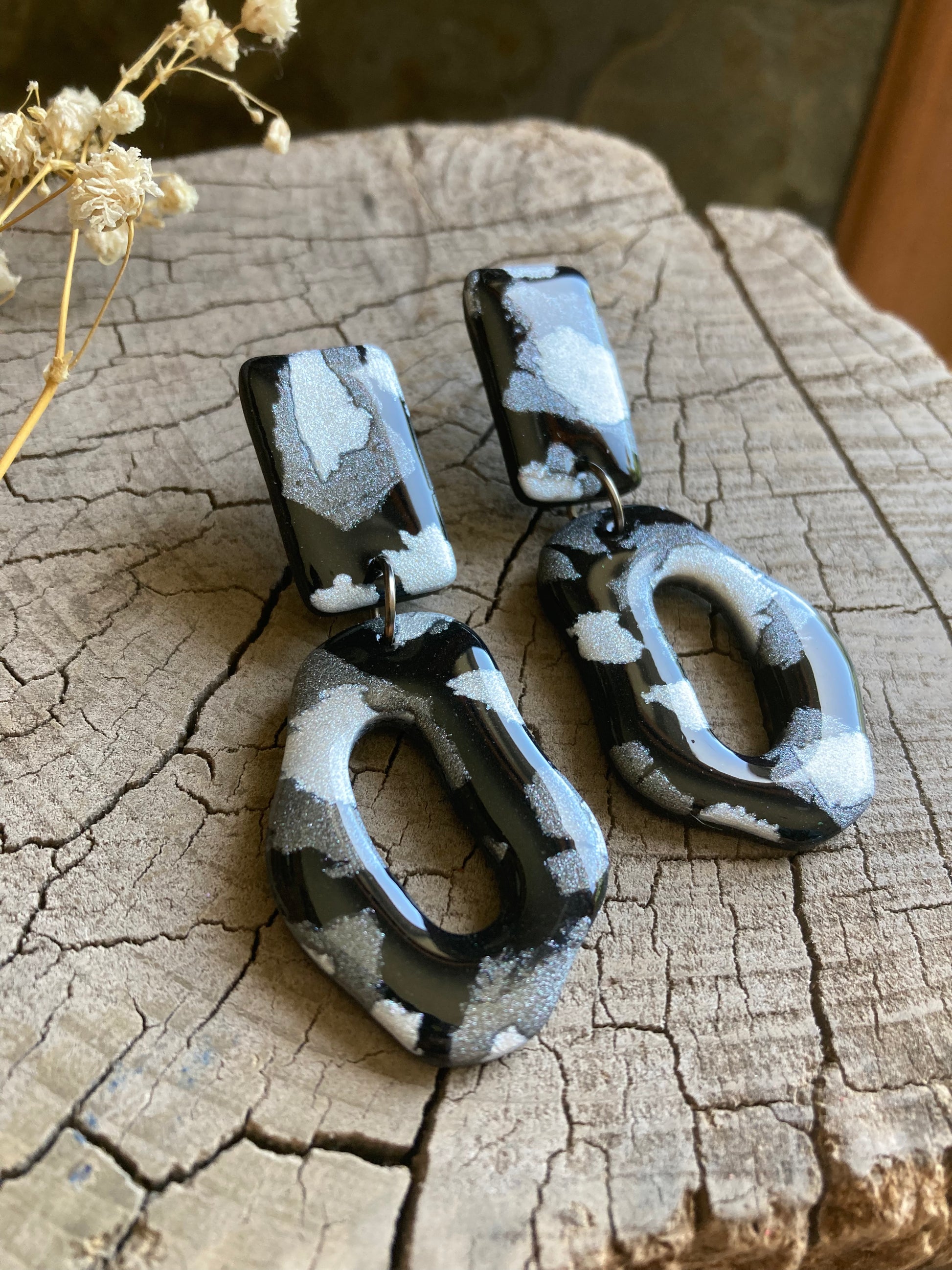 Aros de arcilla polimérica con top coat de resina uv. Miden 6,5 cms. Palito de acero quirúrgico y tope de goma.