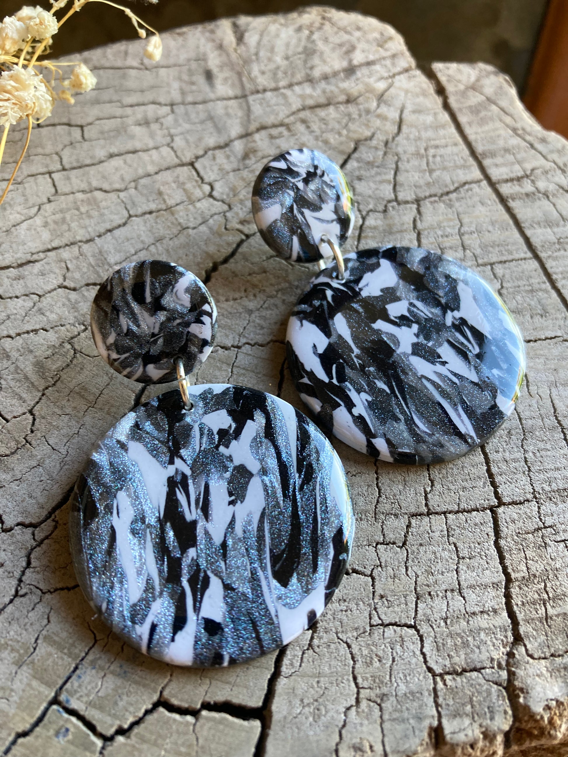 Aros de arcilla polimérica con top coat de resina uv. Miden 5,5 cms. Palito de acero quirúrgico y tope de goma.