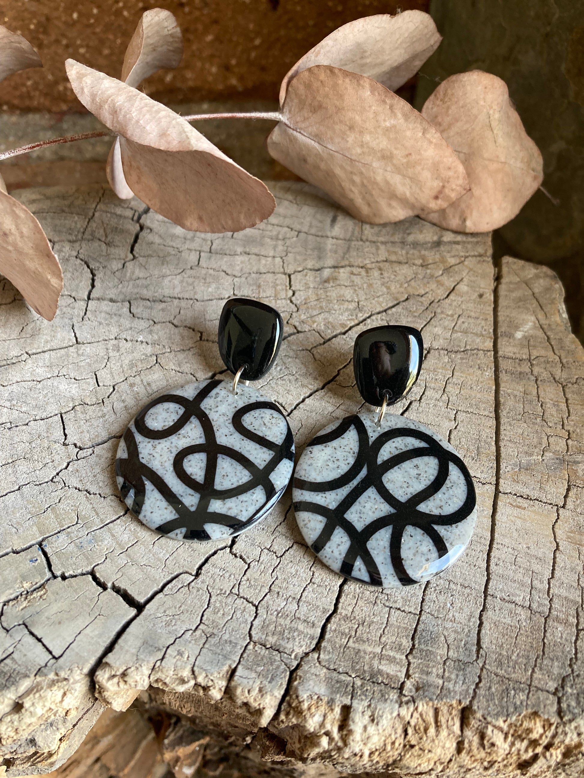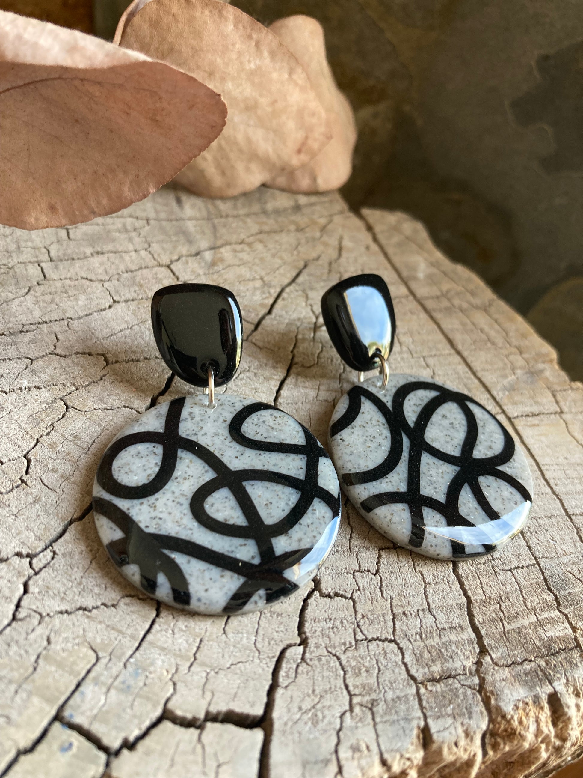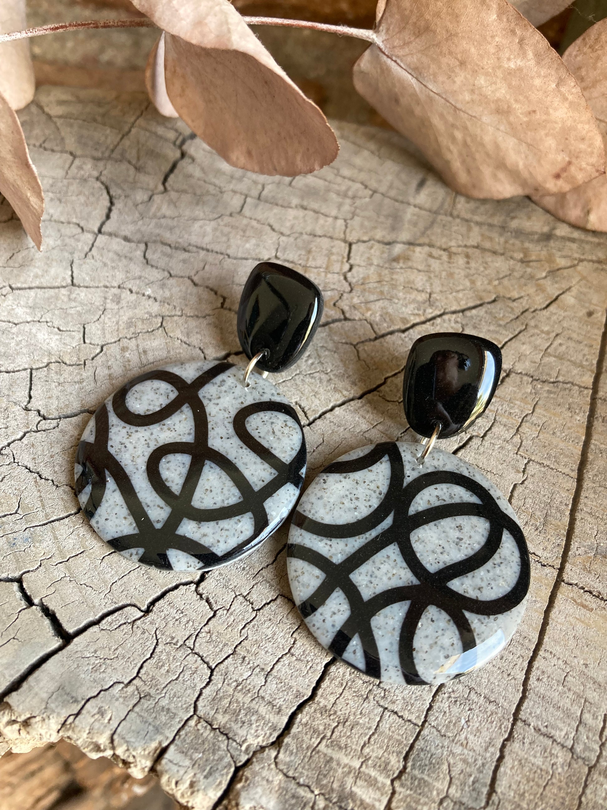 Aros de arcilla polimérica con top coat de resina uv. Miden 5,5 cms. Palito de acero quirúrgico y tope de goma.