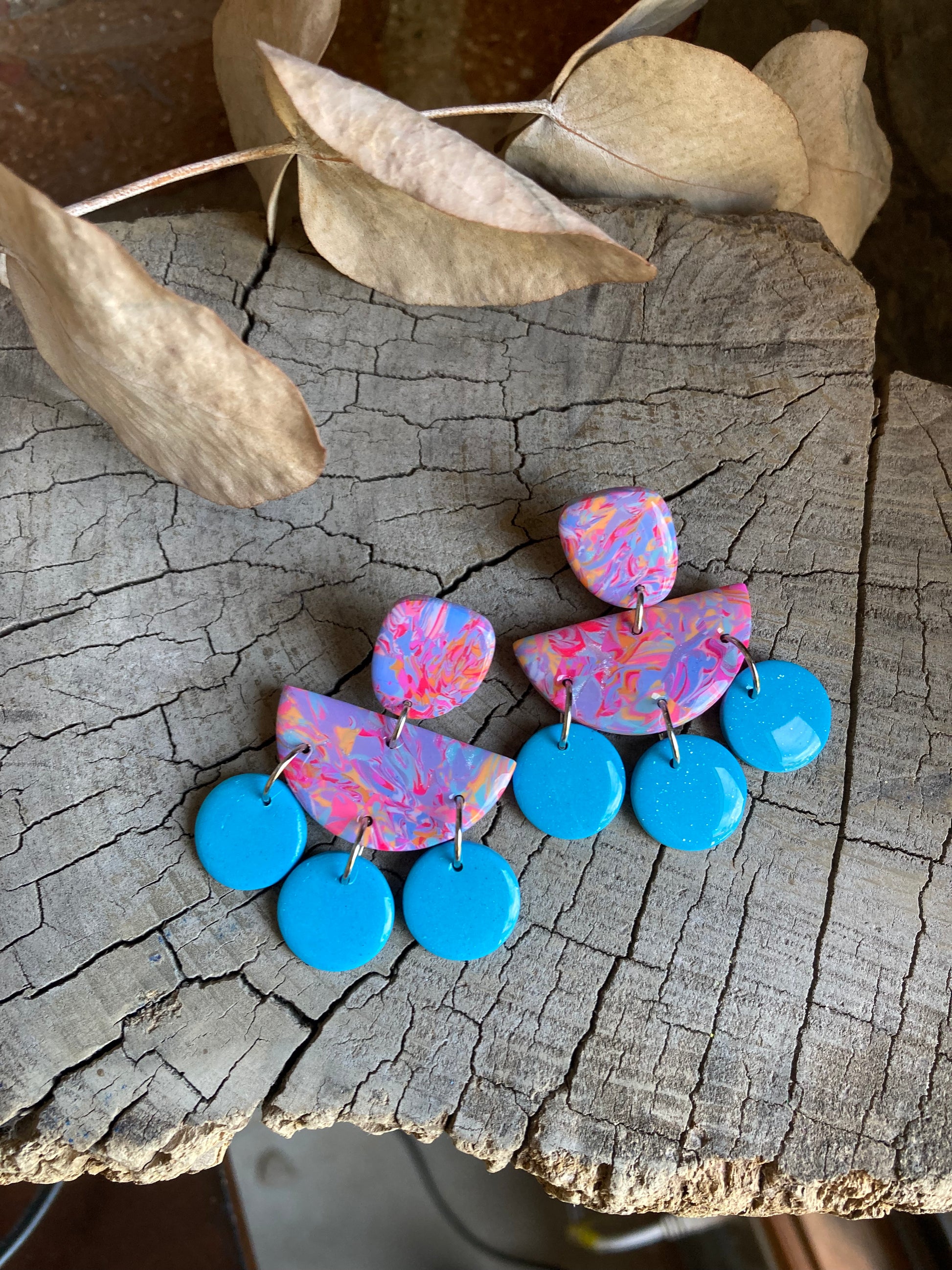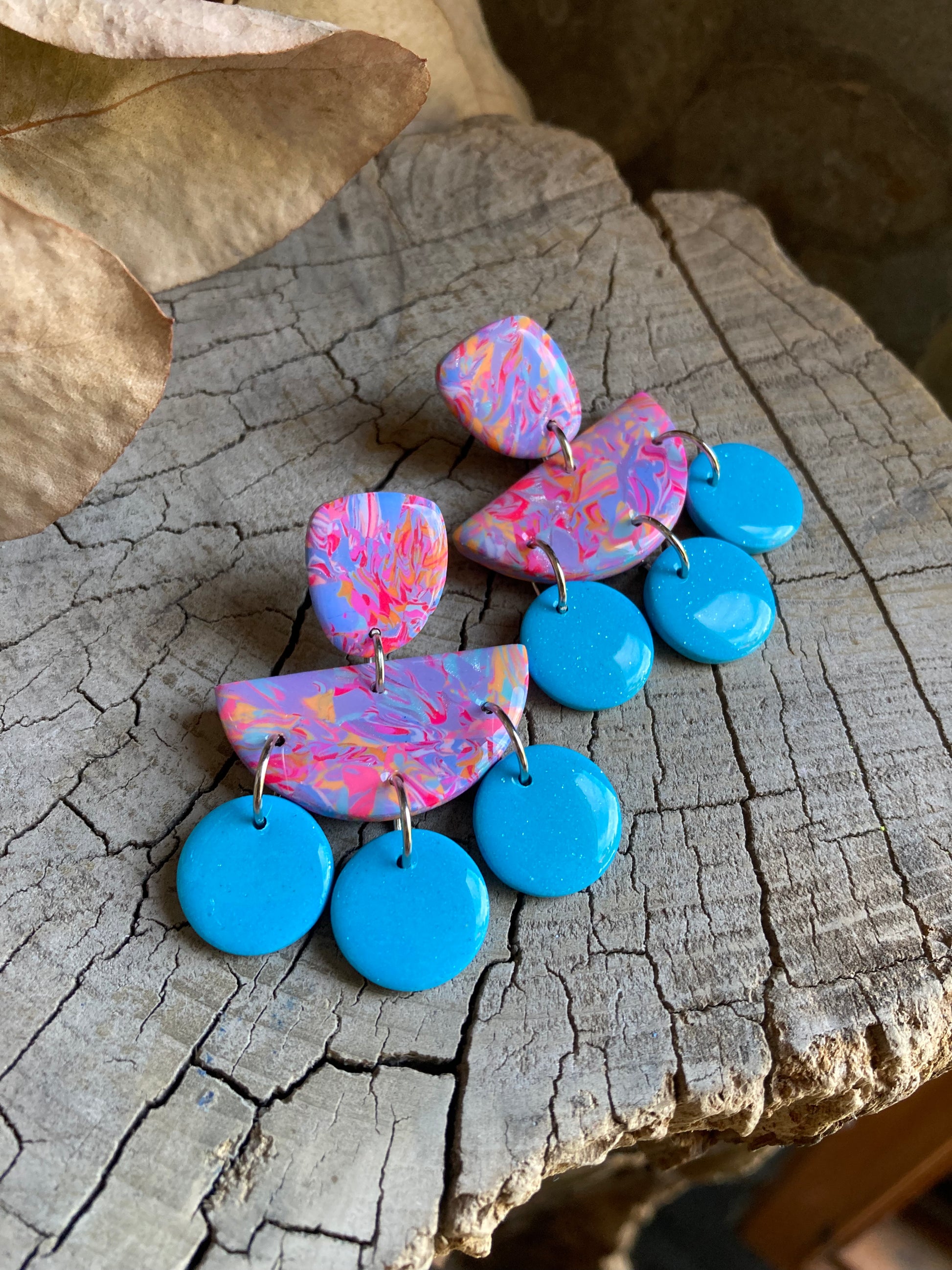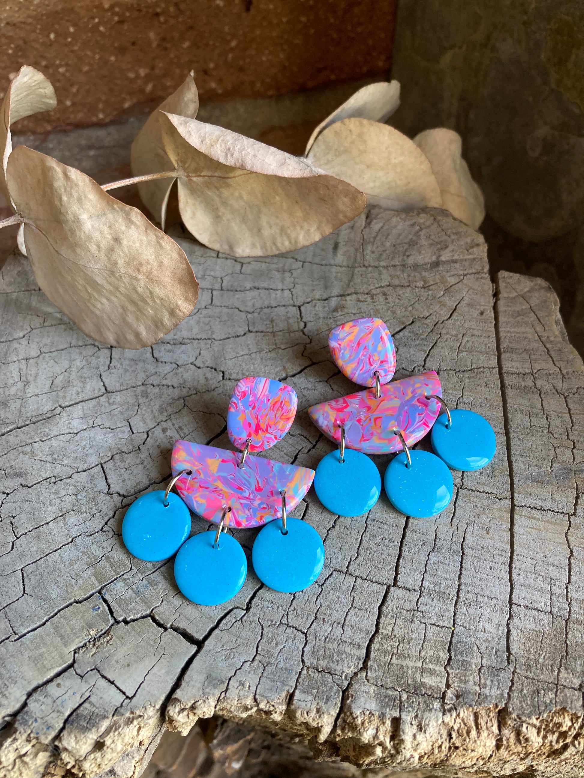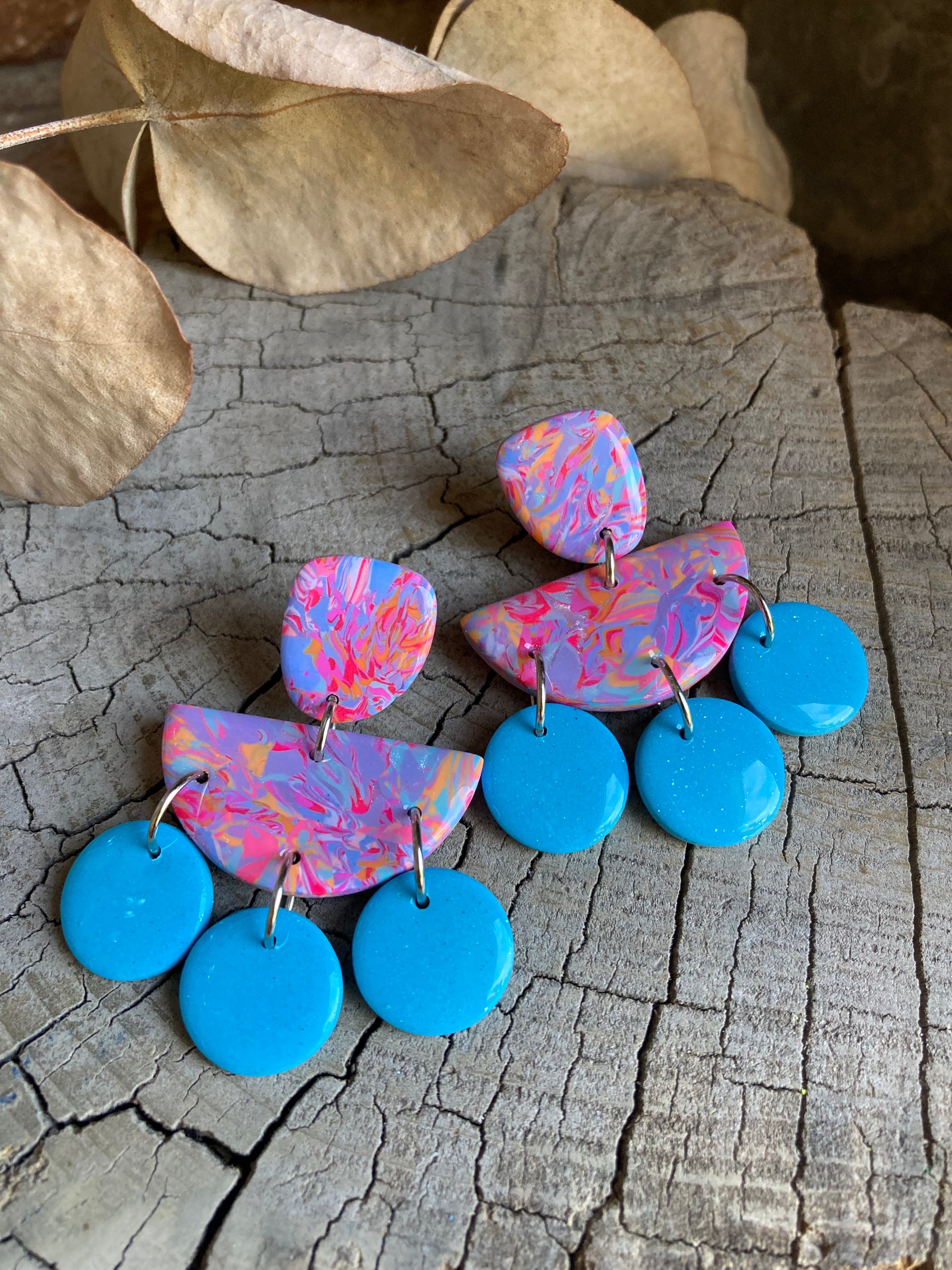 Aros de arcilla polimérica con top coat de resina uv. Miden 5,4 cms. Palito de acero quirúrgico y tope de goma.