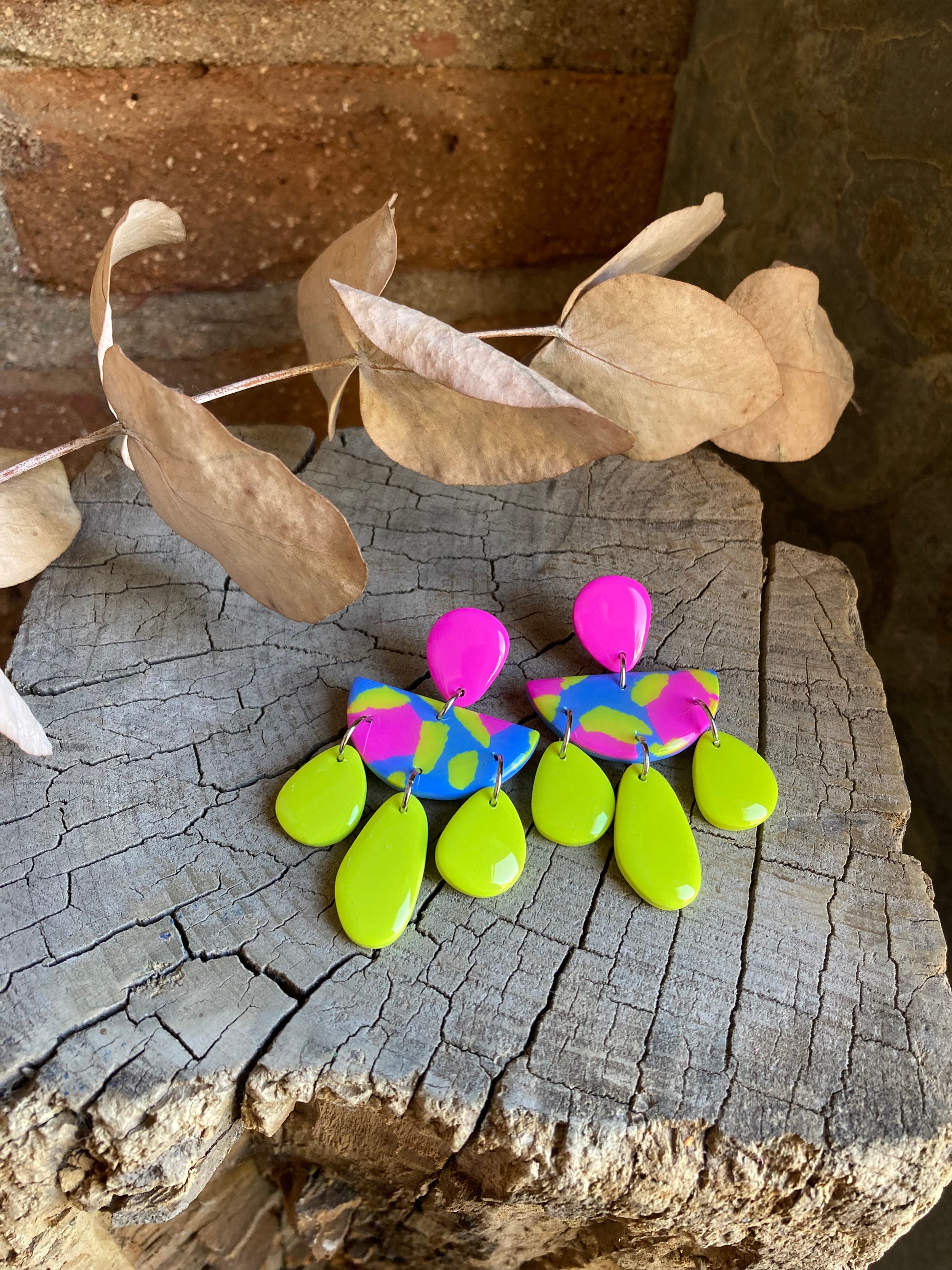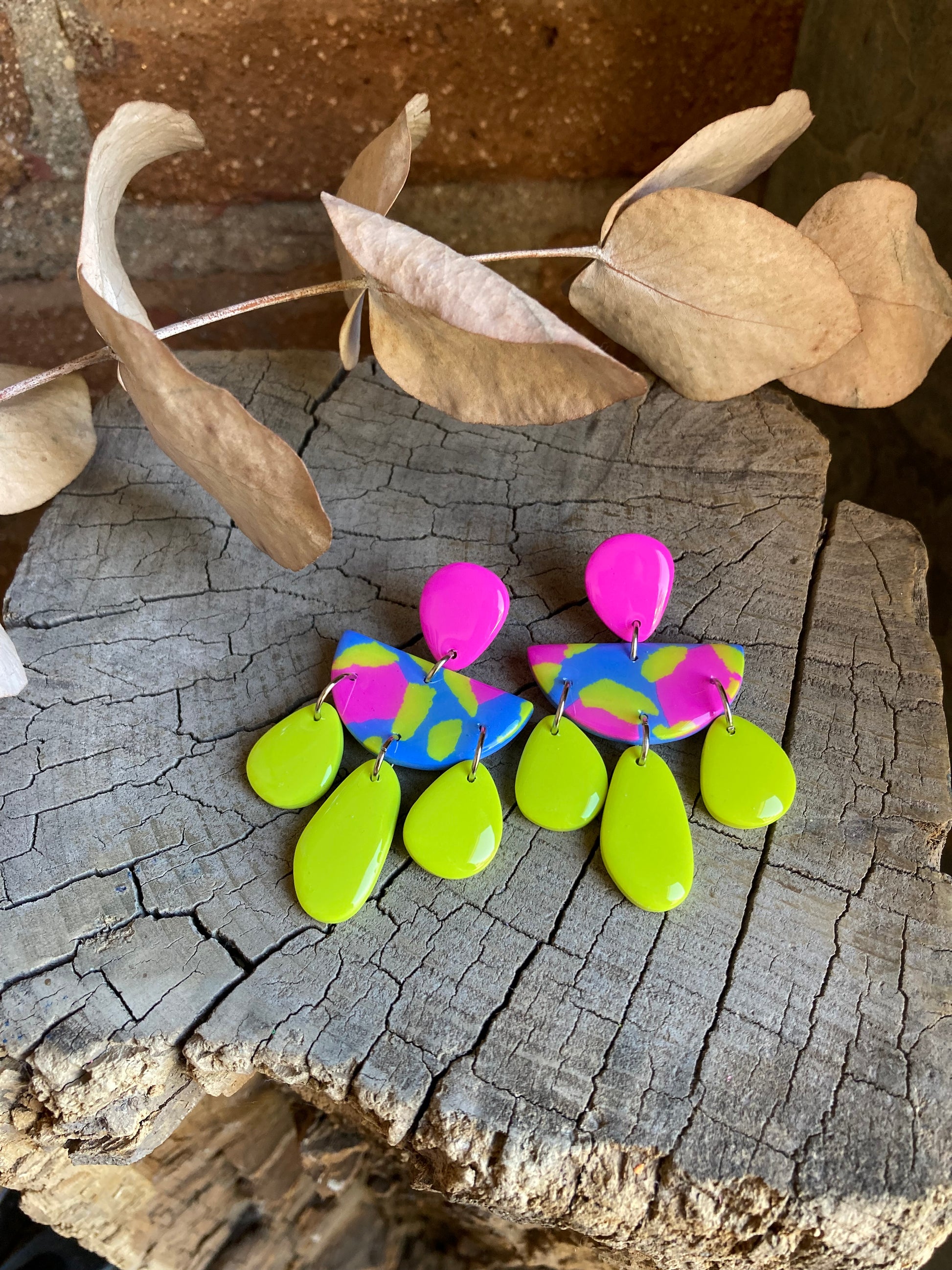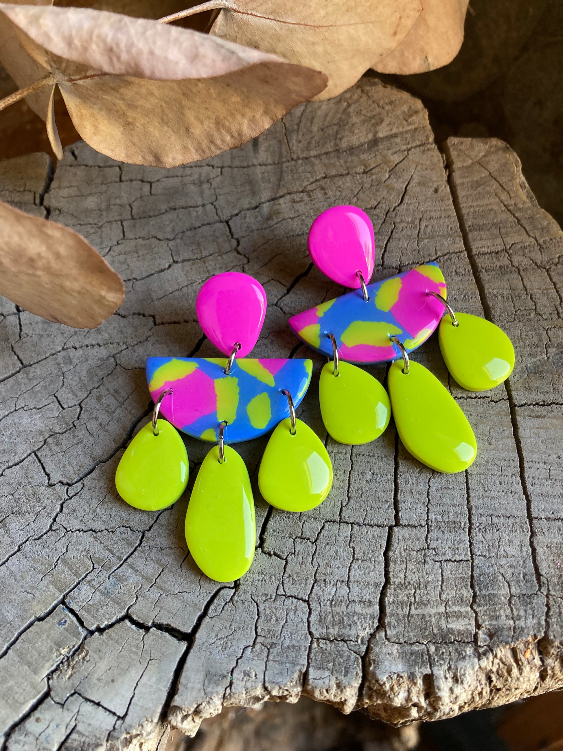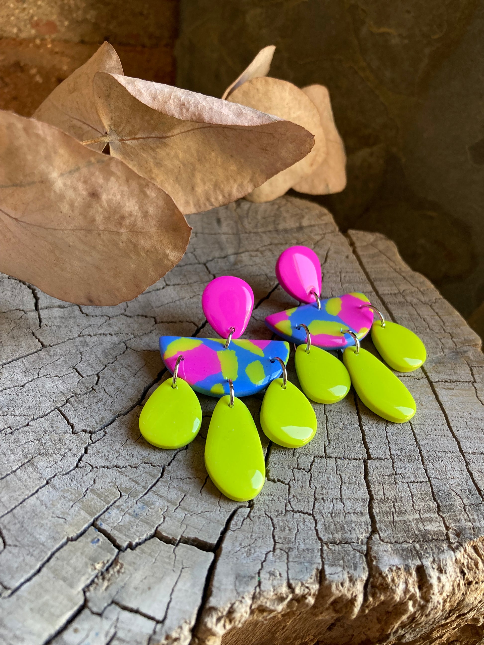 Aros de arcilla polimérica con top coat de resina uv. Miden 6 cms. Palito de acero quirúrgico y tope de goma.