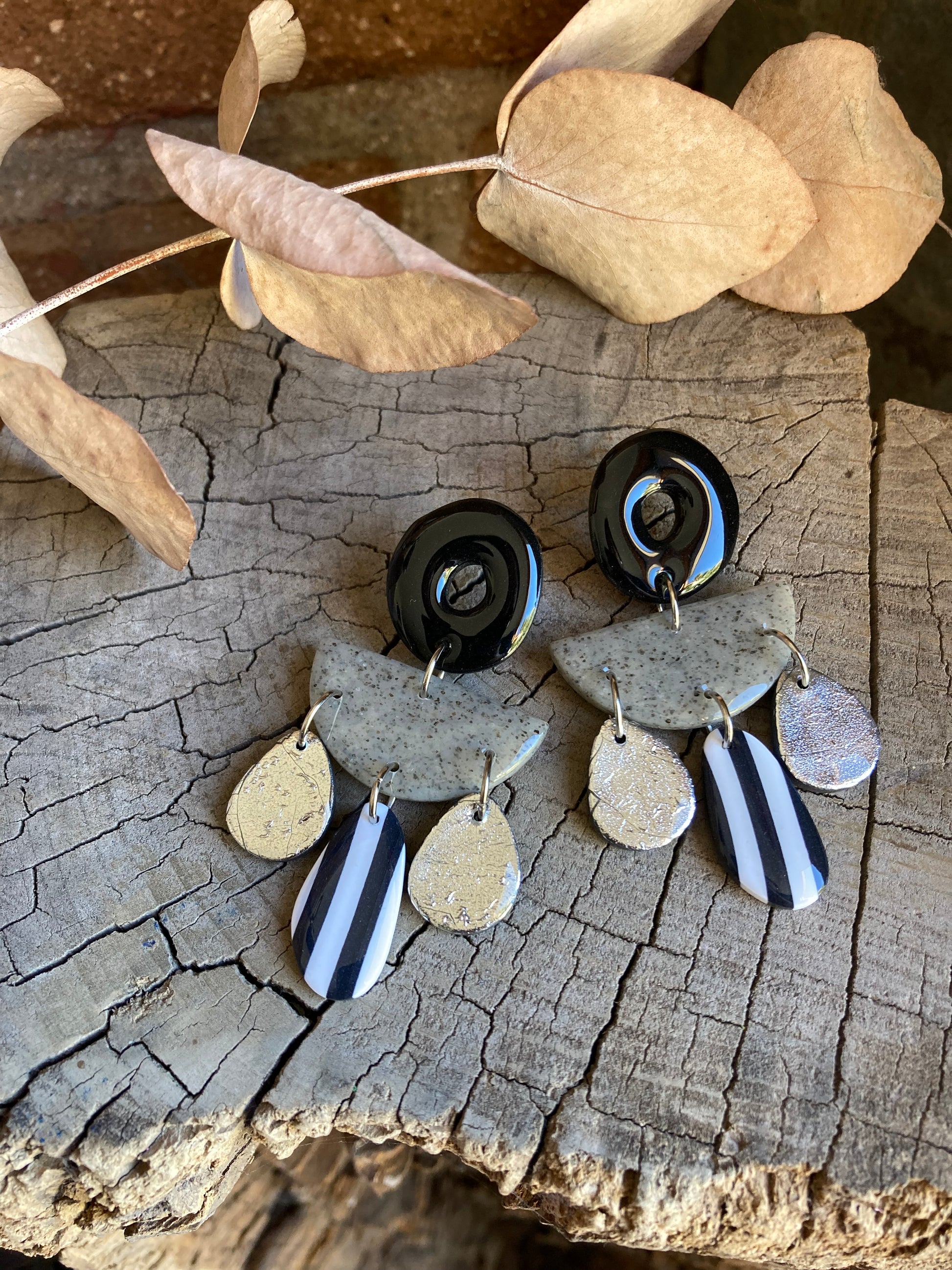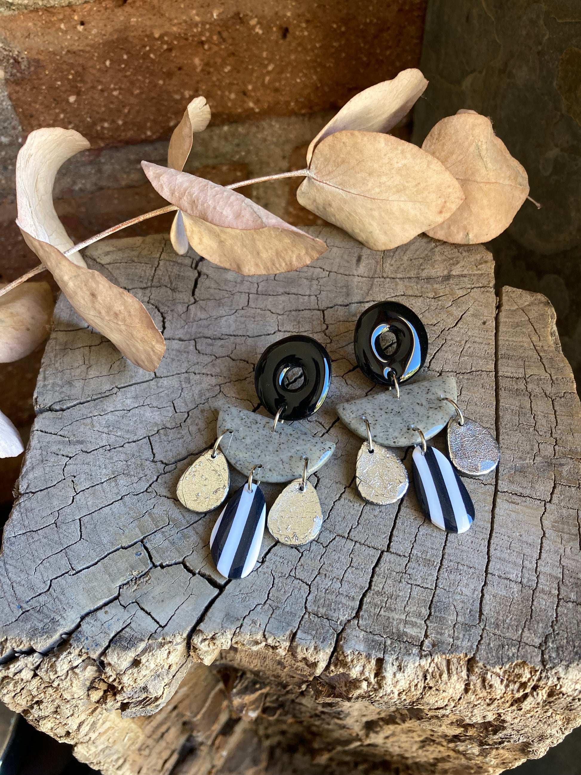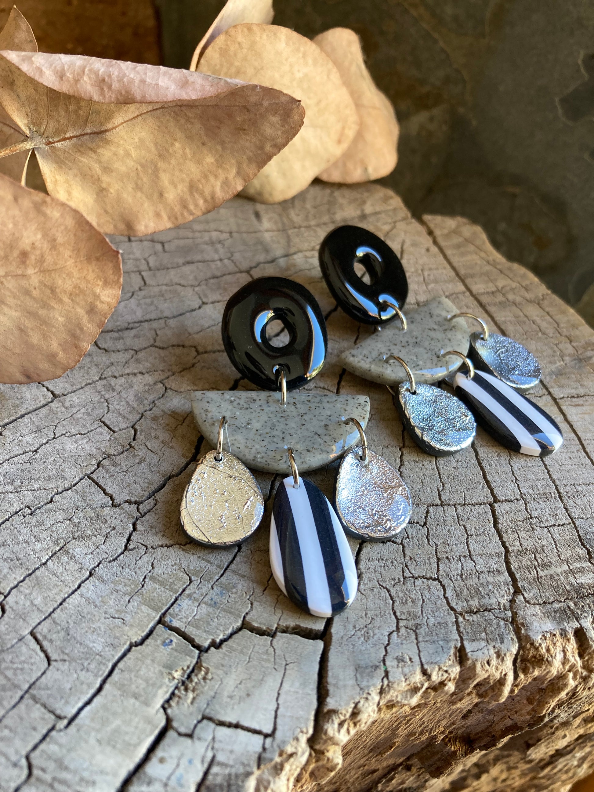 Aros de arcilla polimérica con top coat de resina uv. Miden 6,6 cms. Palito de acero quirúrgico y tope de goma.