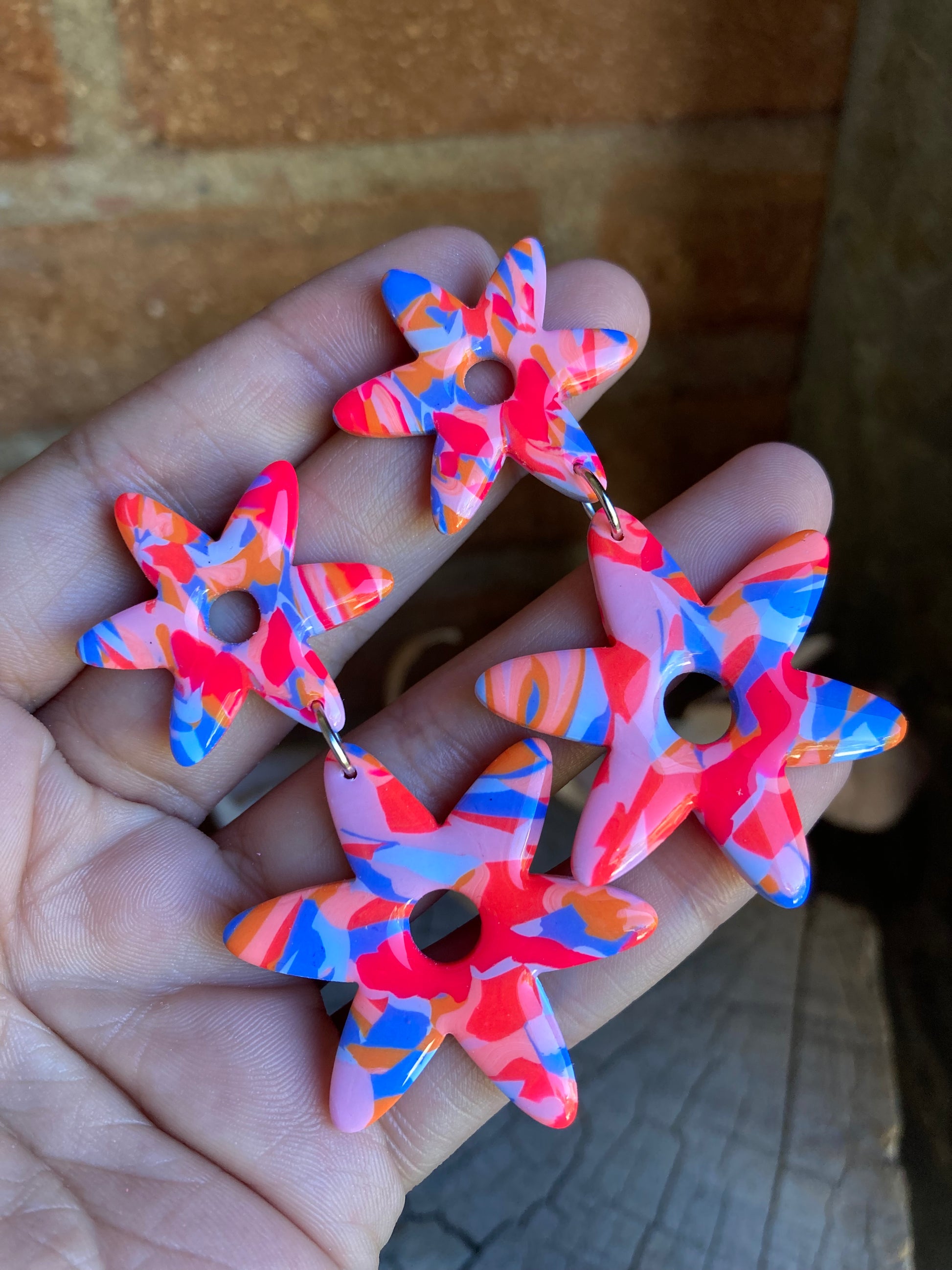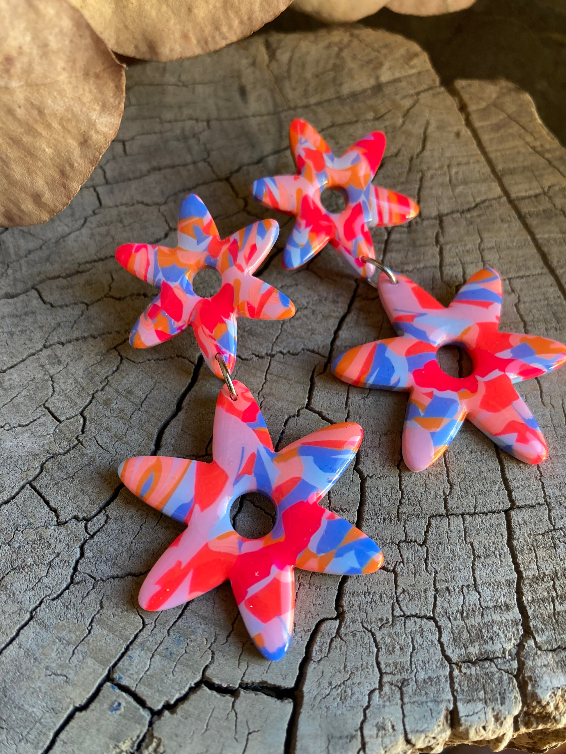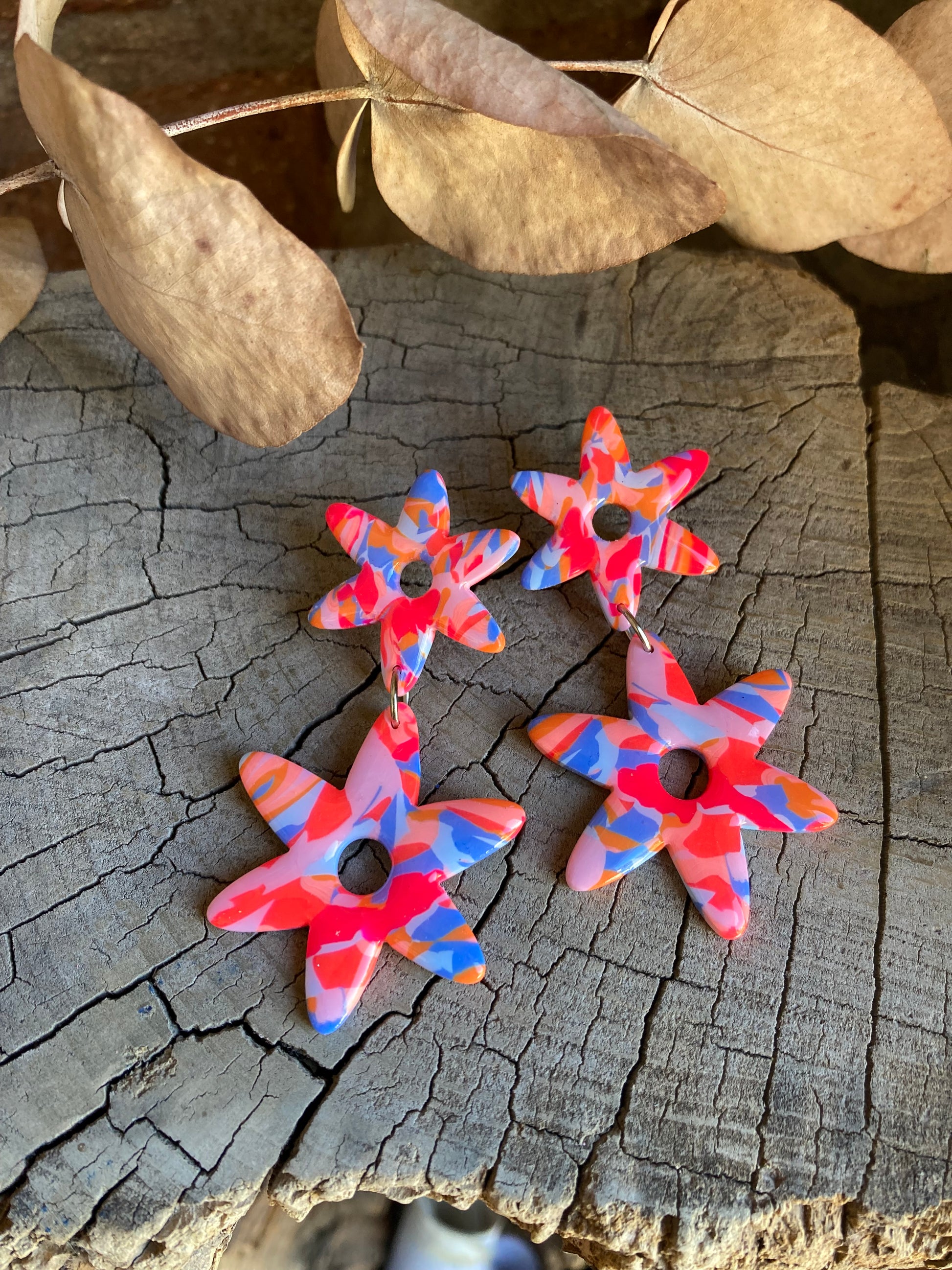 Aros de arcilla polimérica con top coat de resina uv. Miden 7 cms. Palito de acero quirúrgico y tope de goma.