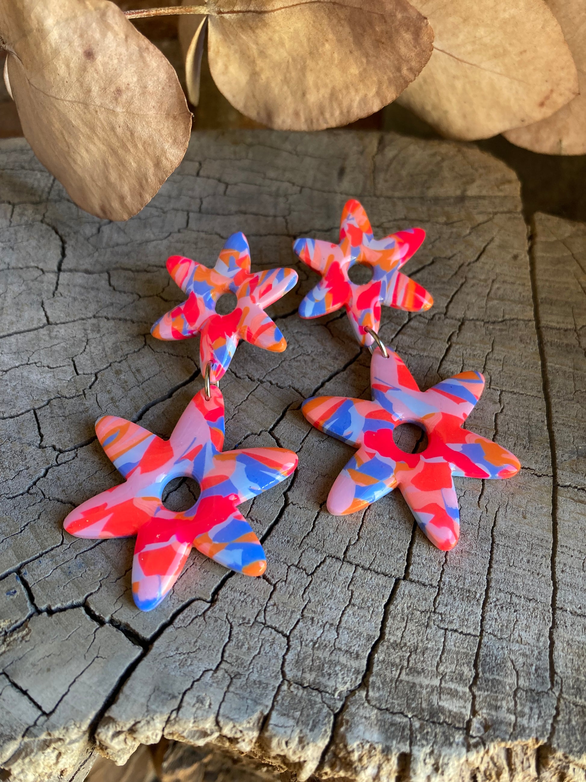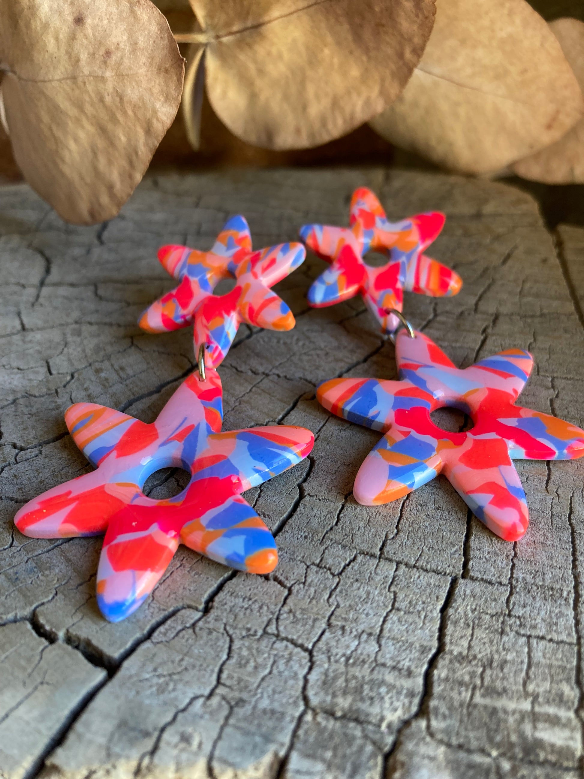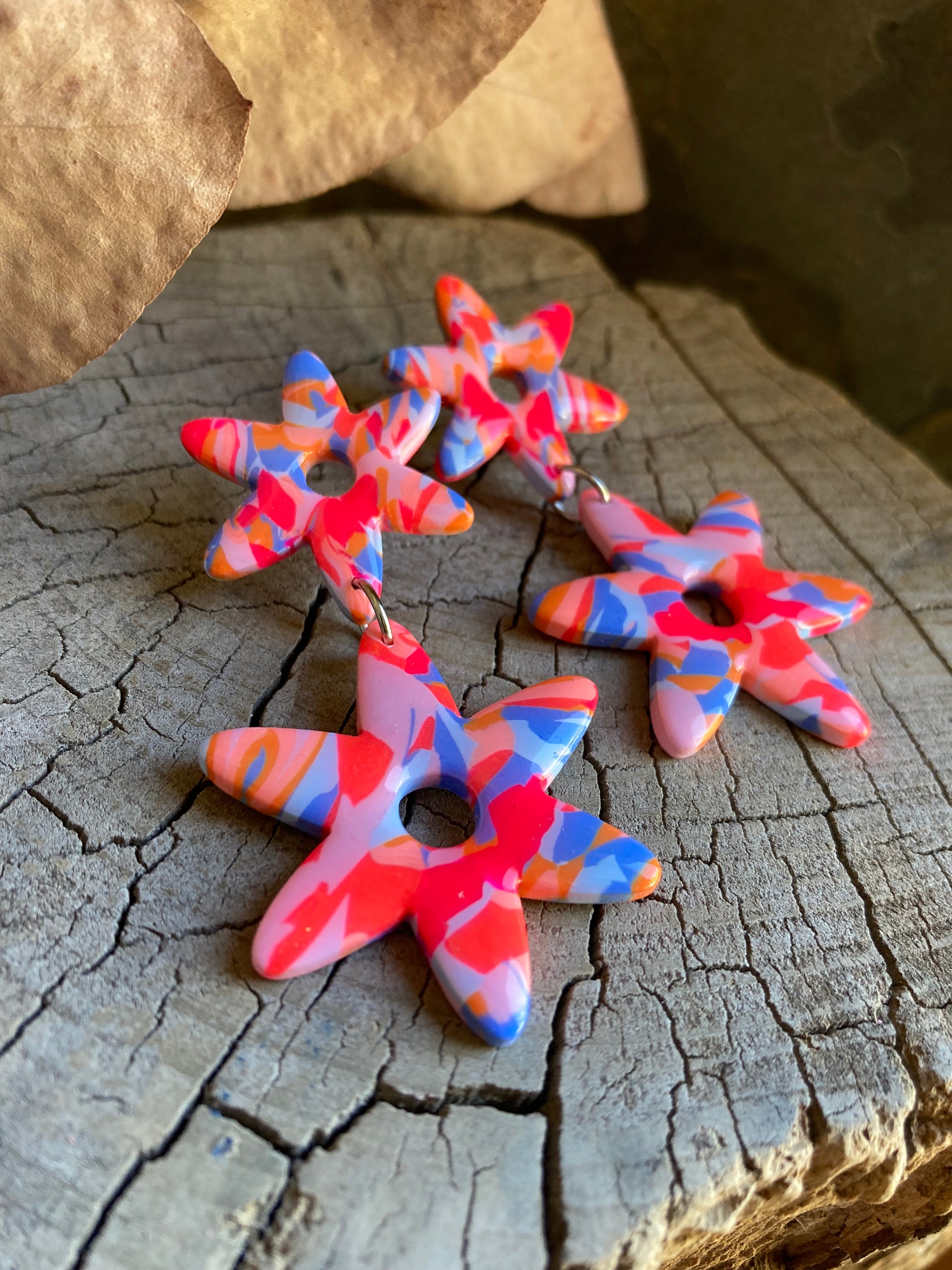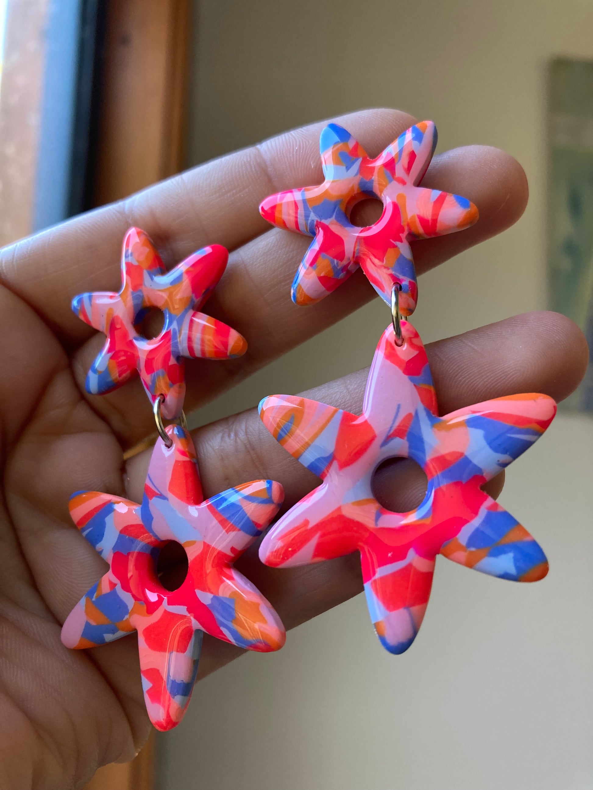 Aros de arcilla polimérica con top coat de resina uv. Miden 7 cms. Palito de acero quirúrgico y tope de goma.