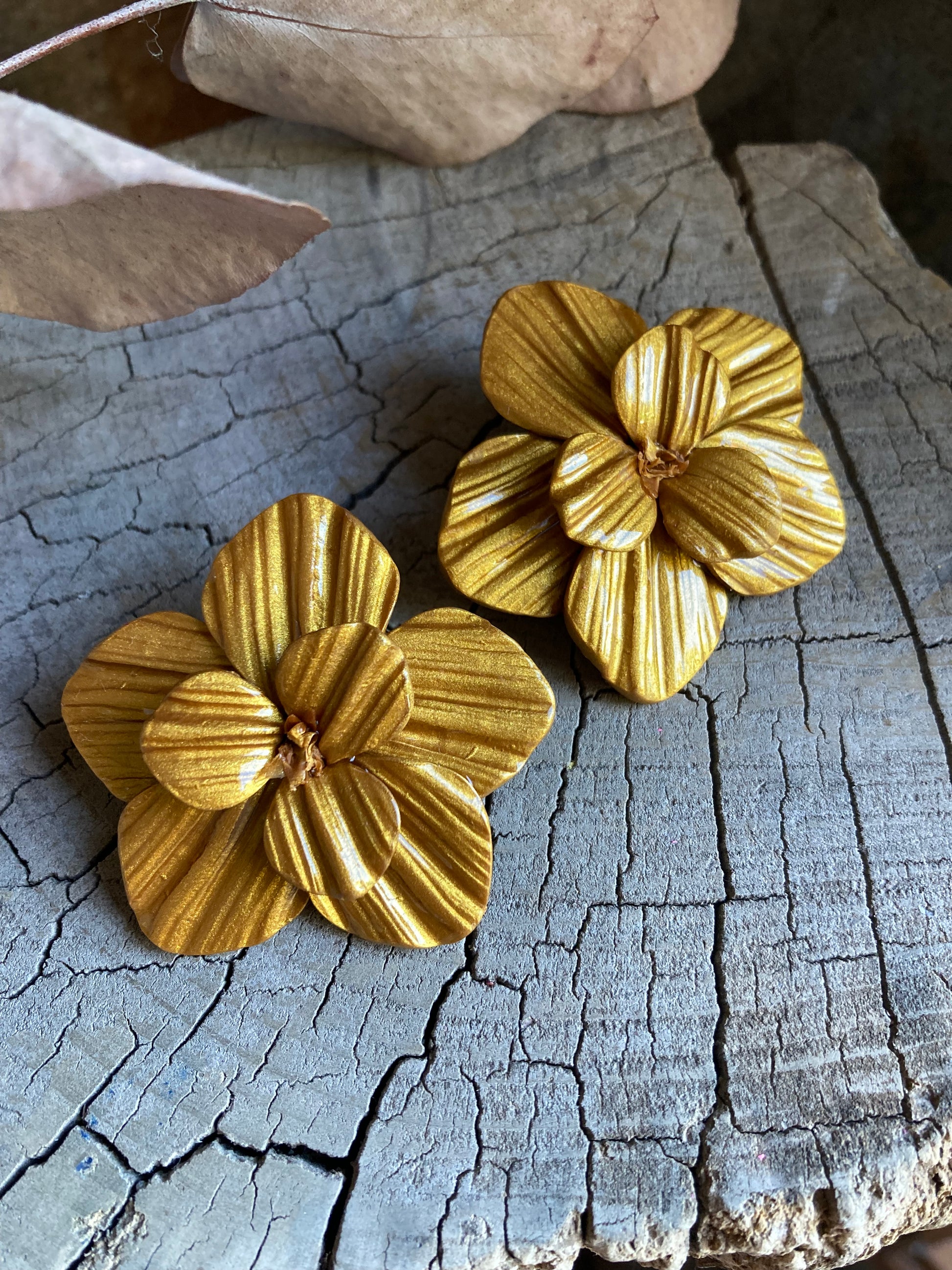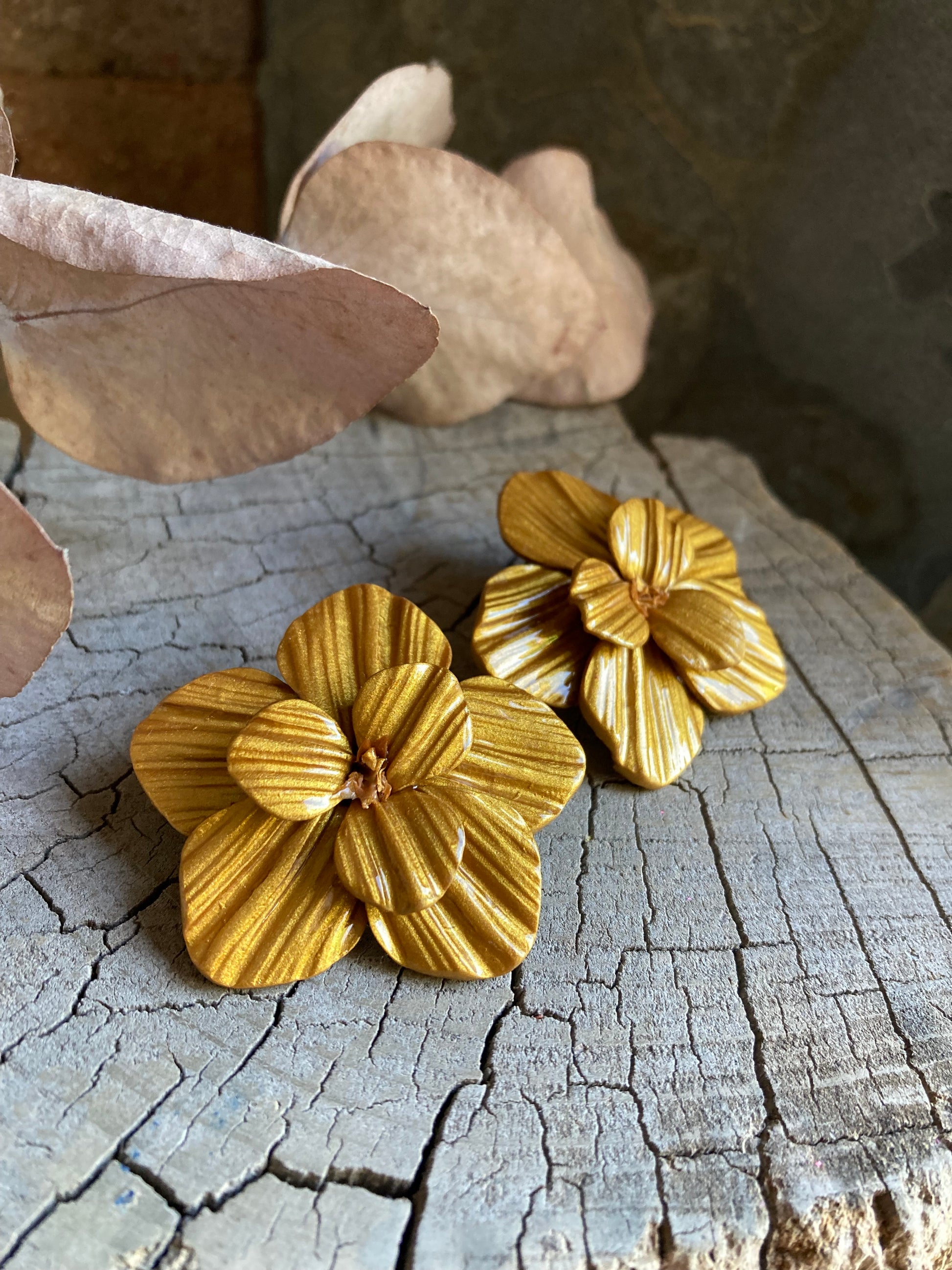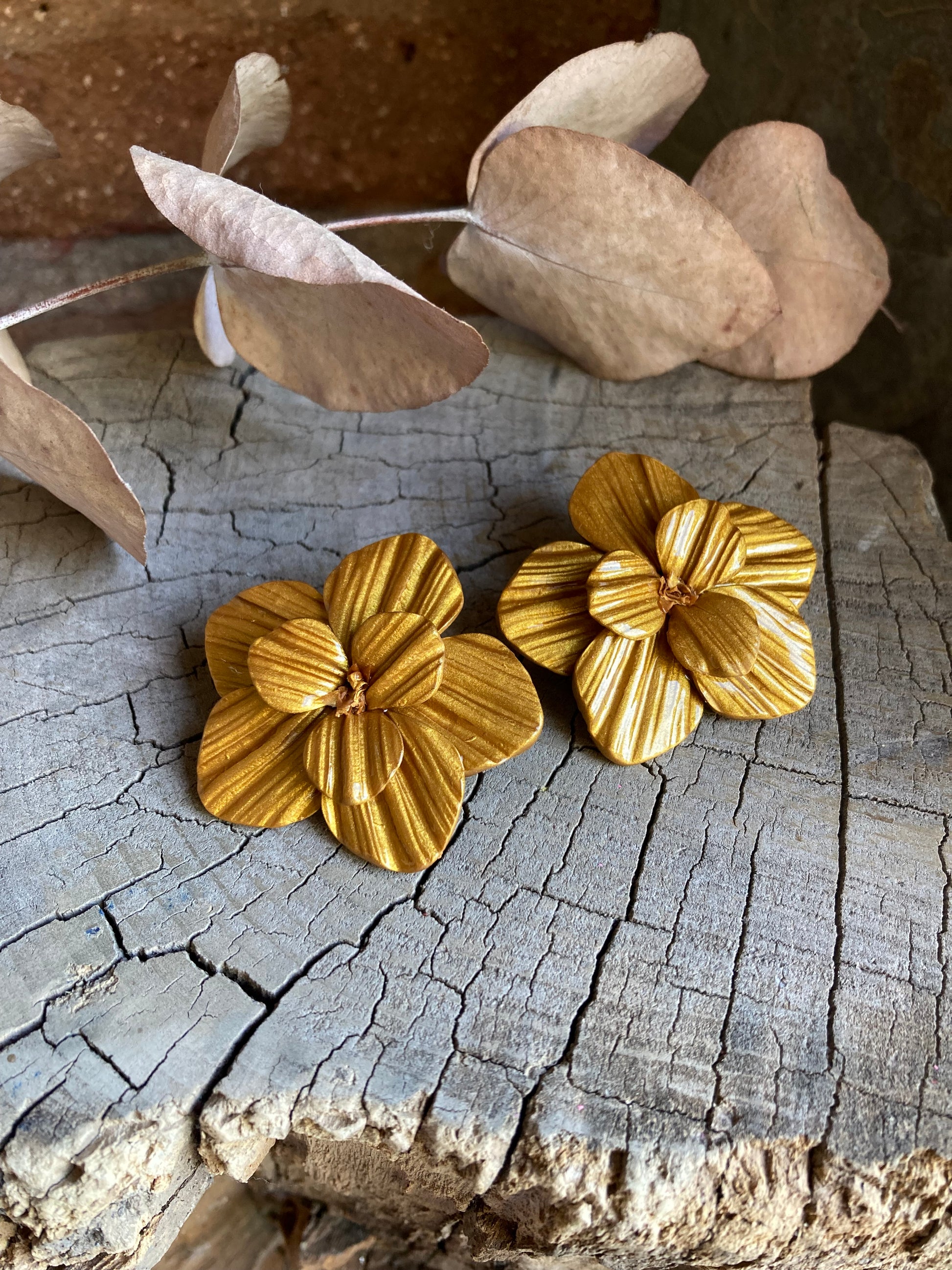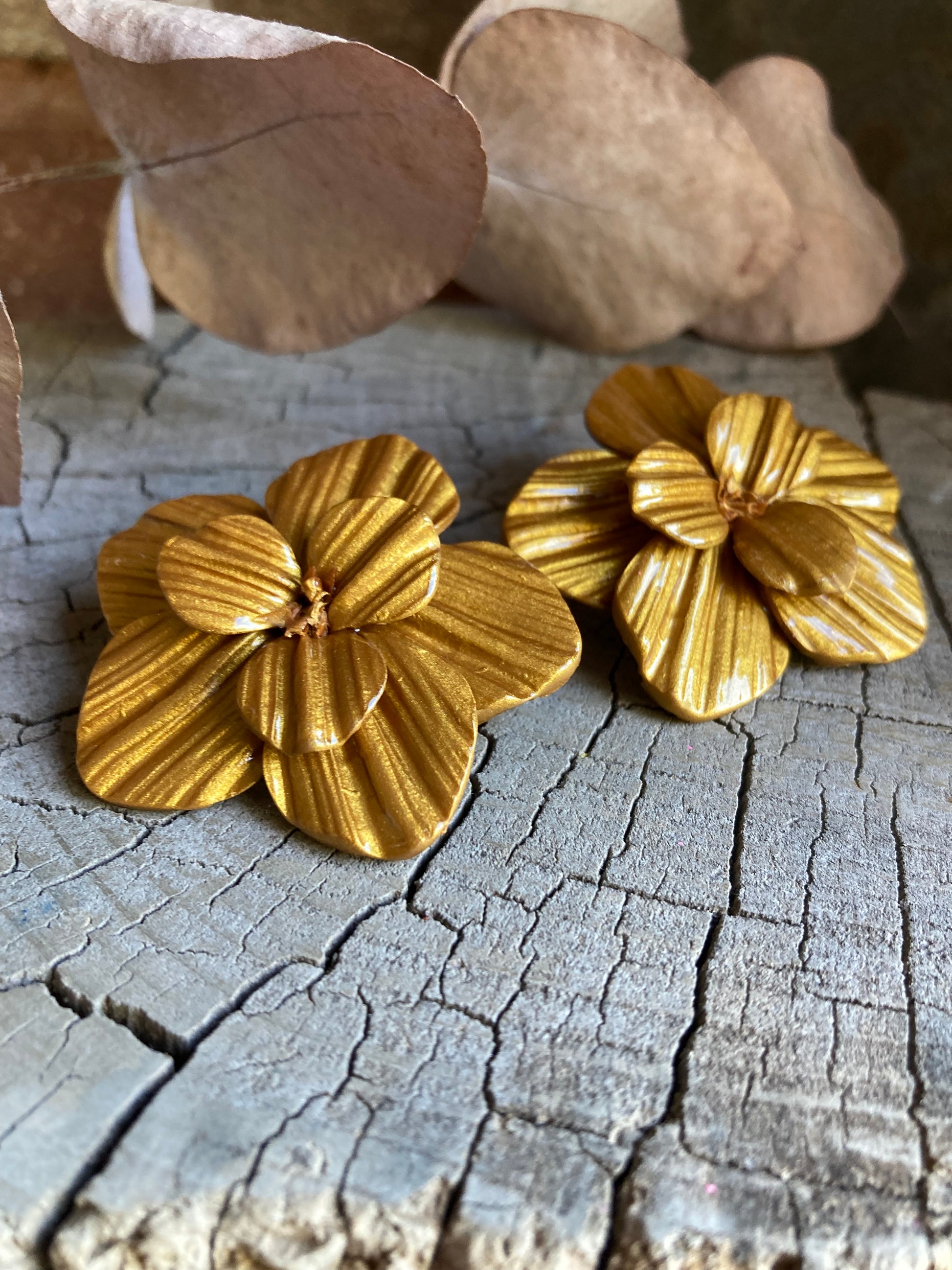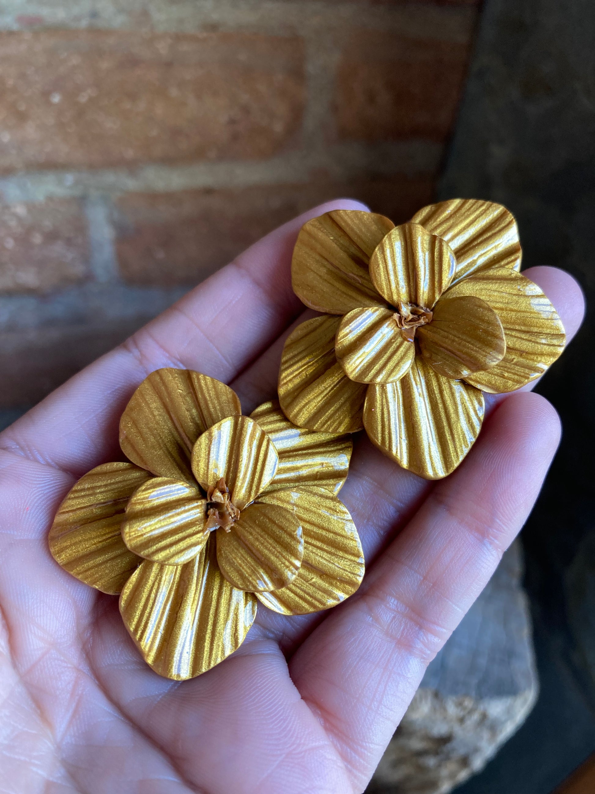 Aros de arcilla polimérica con textura y capa de resina uv. Miden 4,2 cms aproximadamente. Palitos de acero quirúrgico y tope de goma.