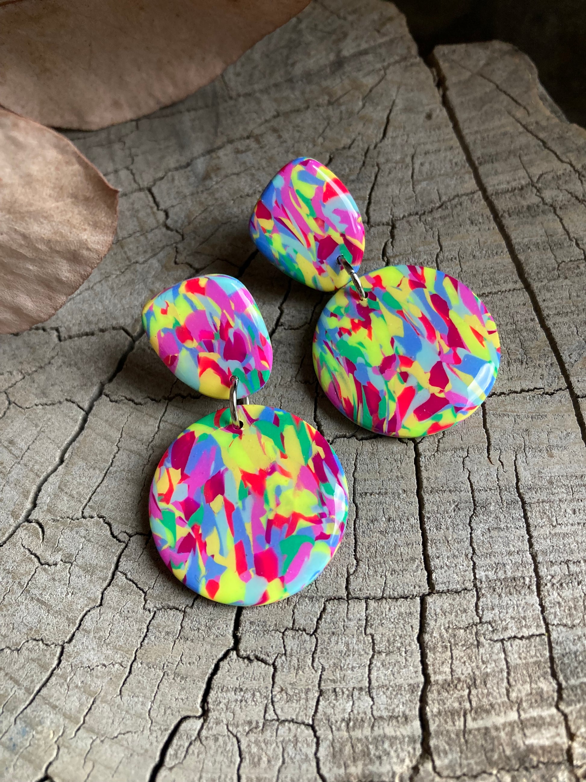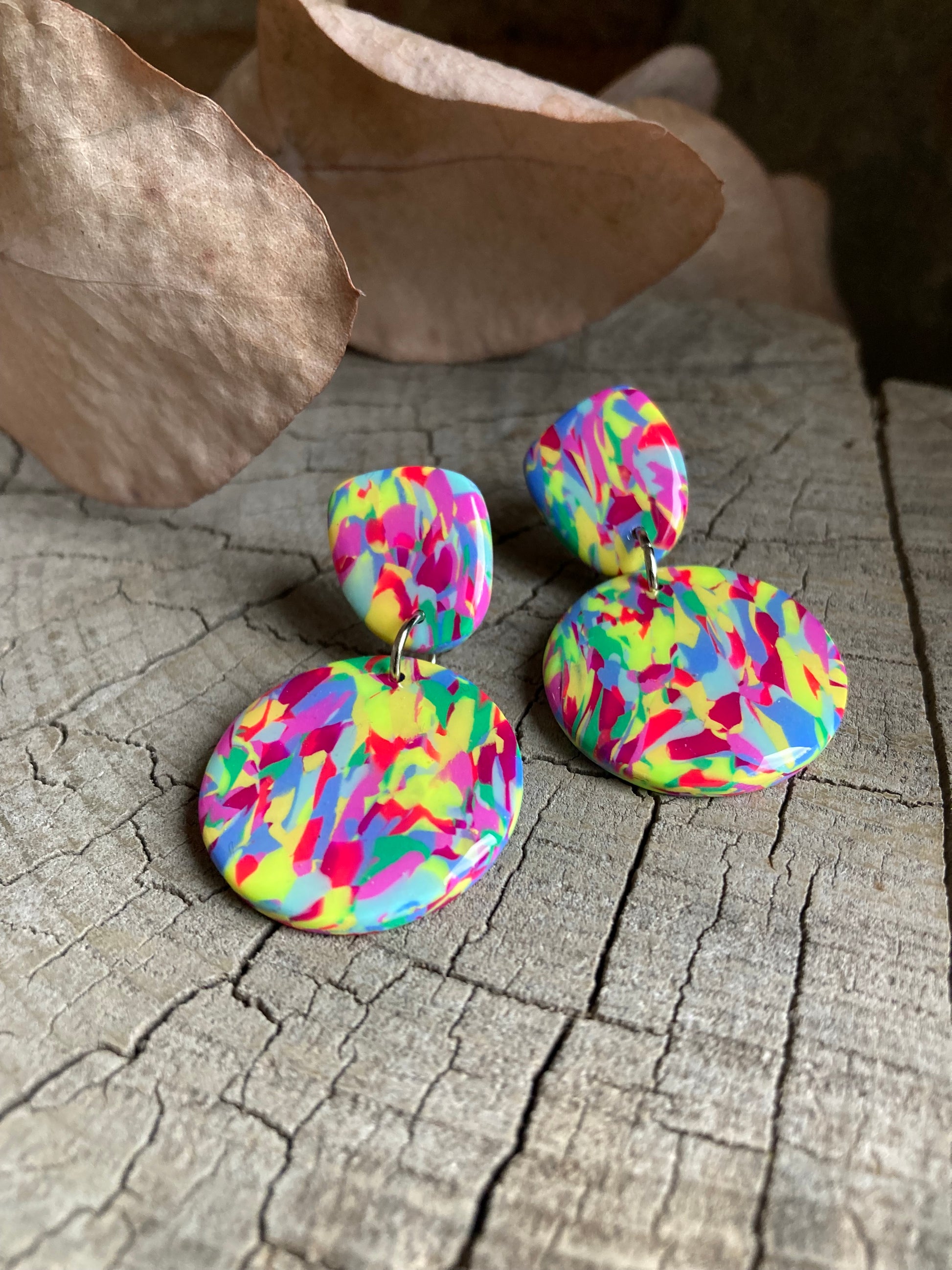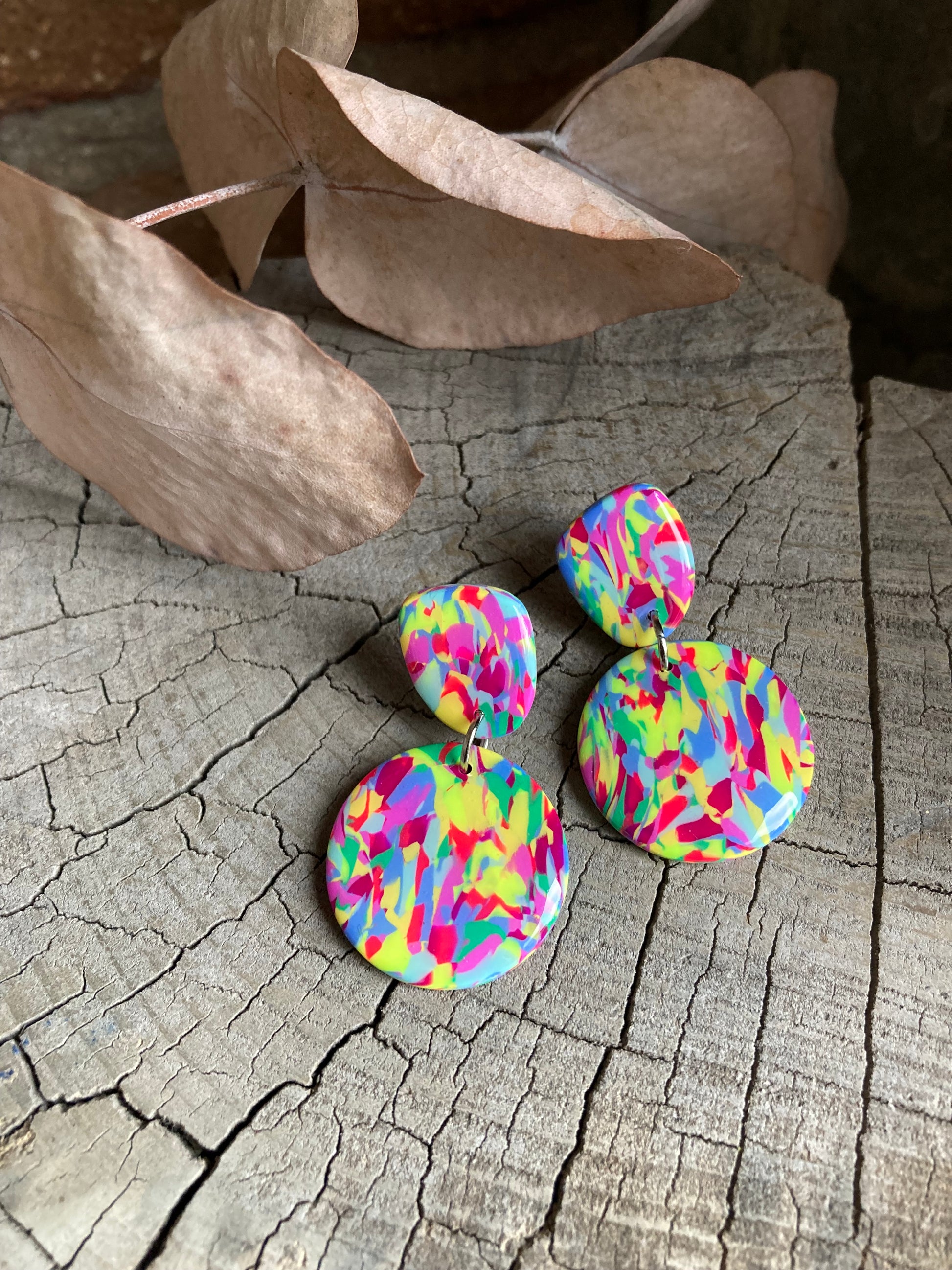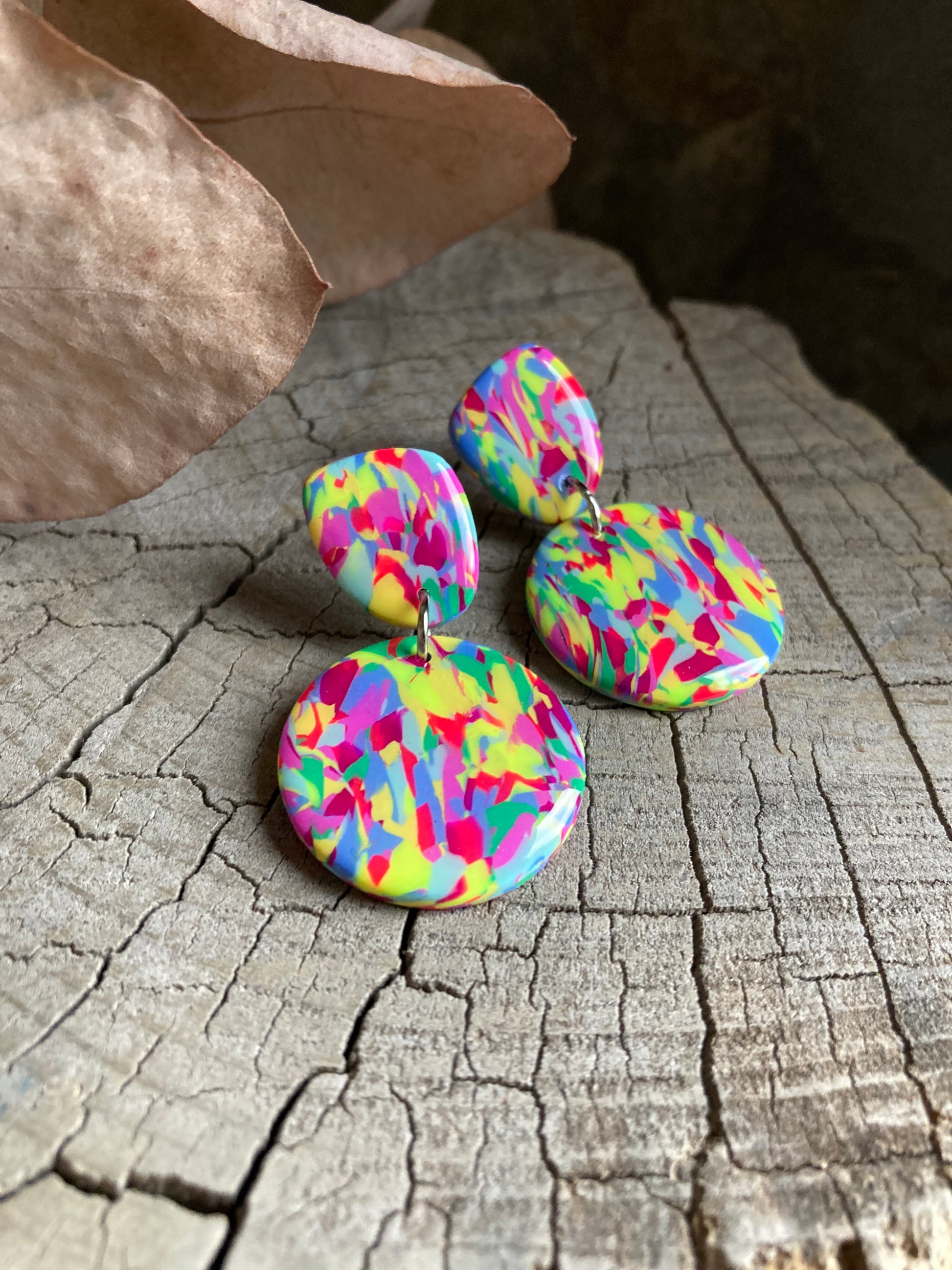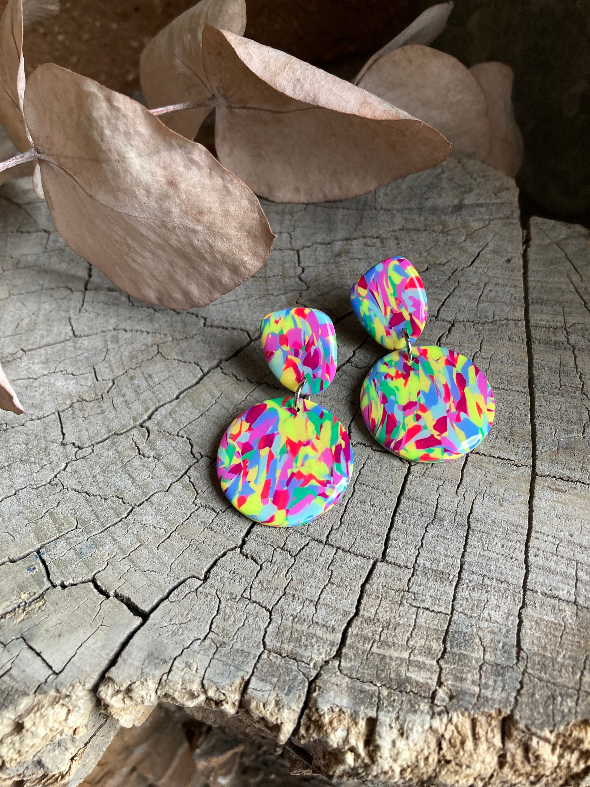 Aros de arcilla polimérica con top coat de resina uv. Miden 4,2 cms. Palito de acero quirúrgico y tope de goma.