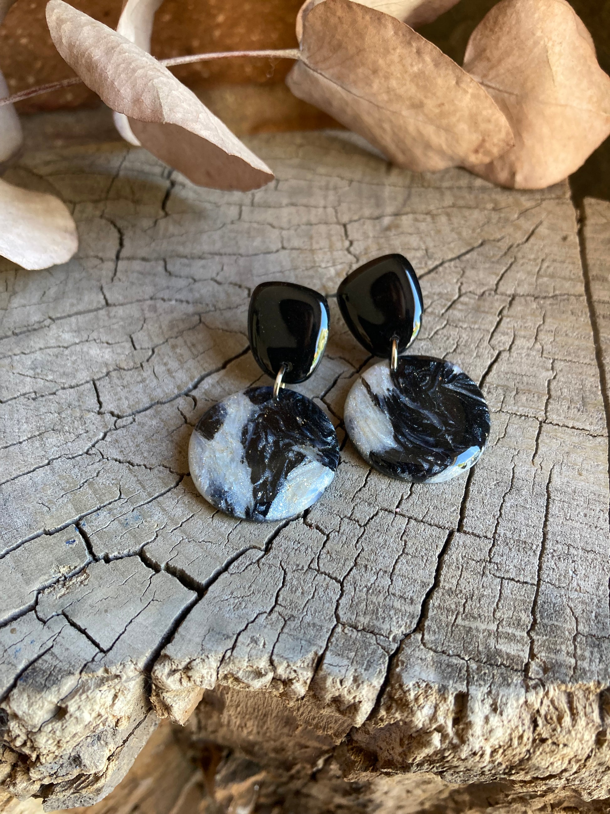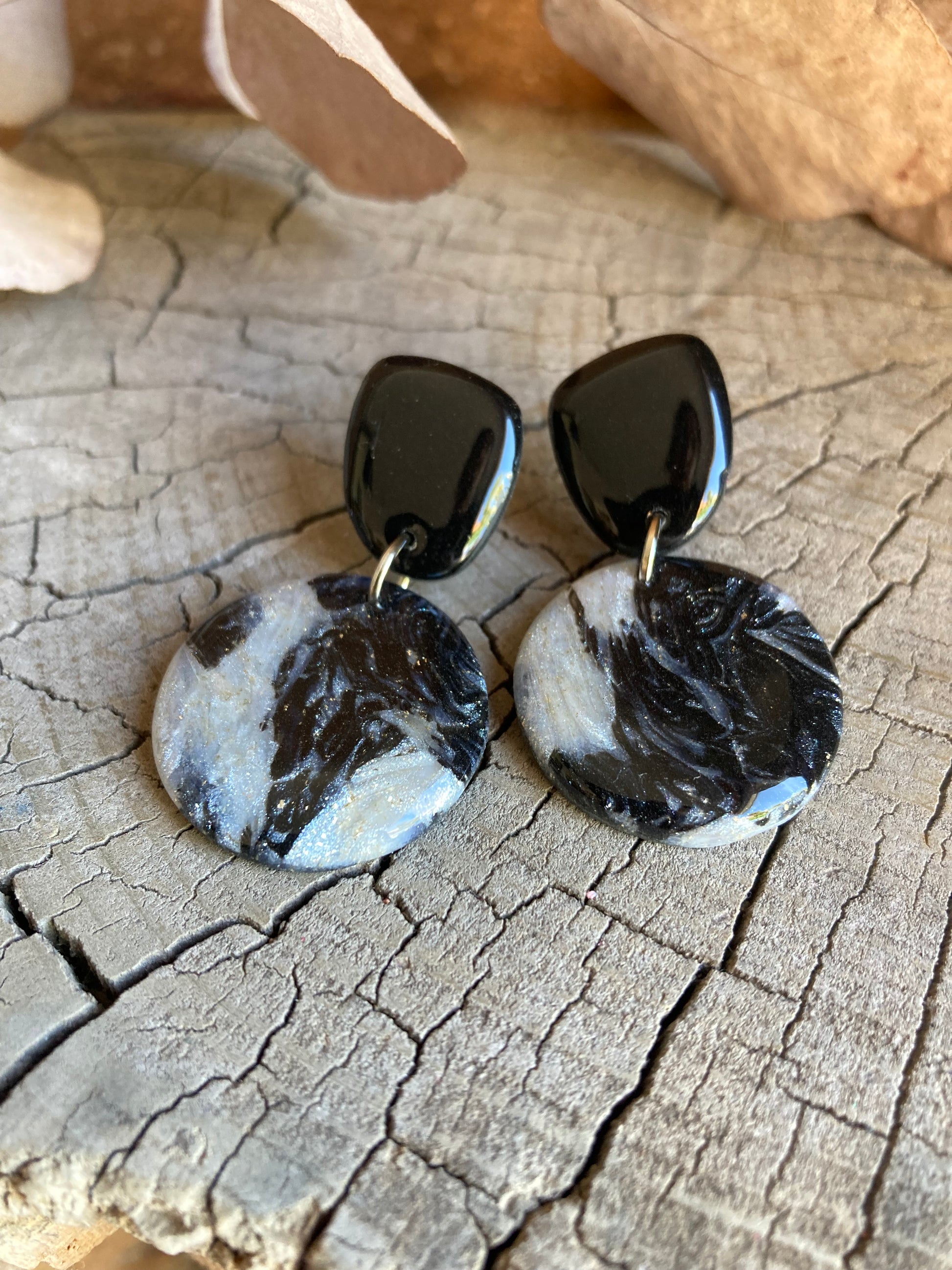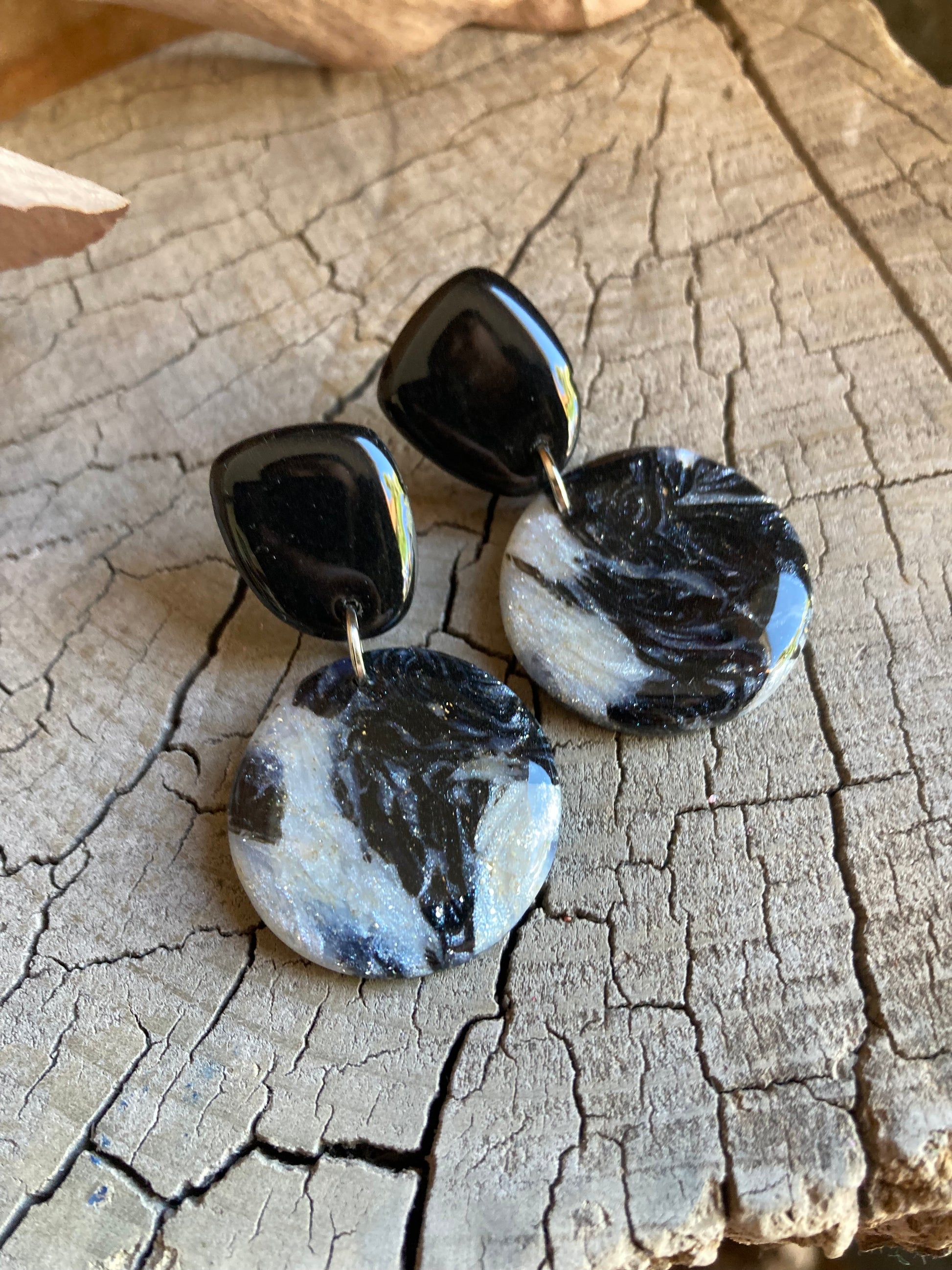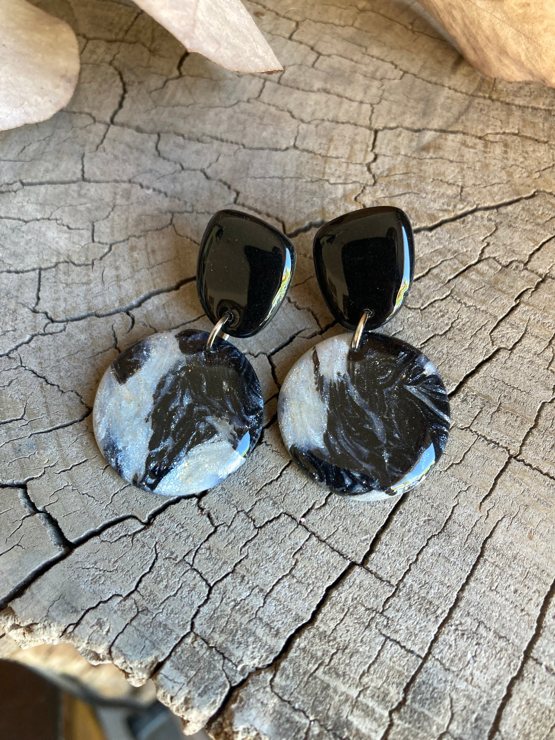 Aros de arcilla polimérica con top coat de resina uv. Miden 4,2 cms. Palito de acero quirúrgico y tope de goma.