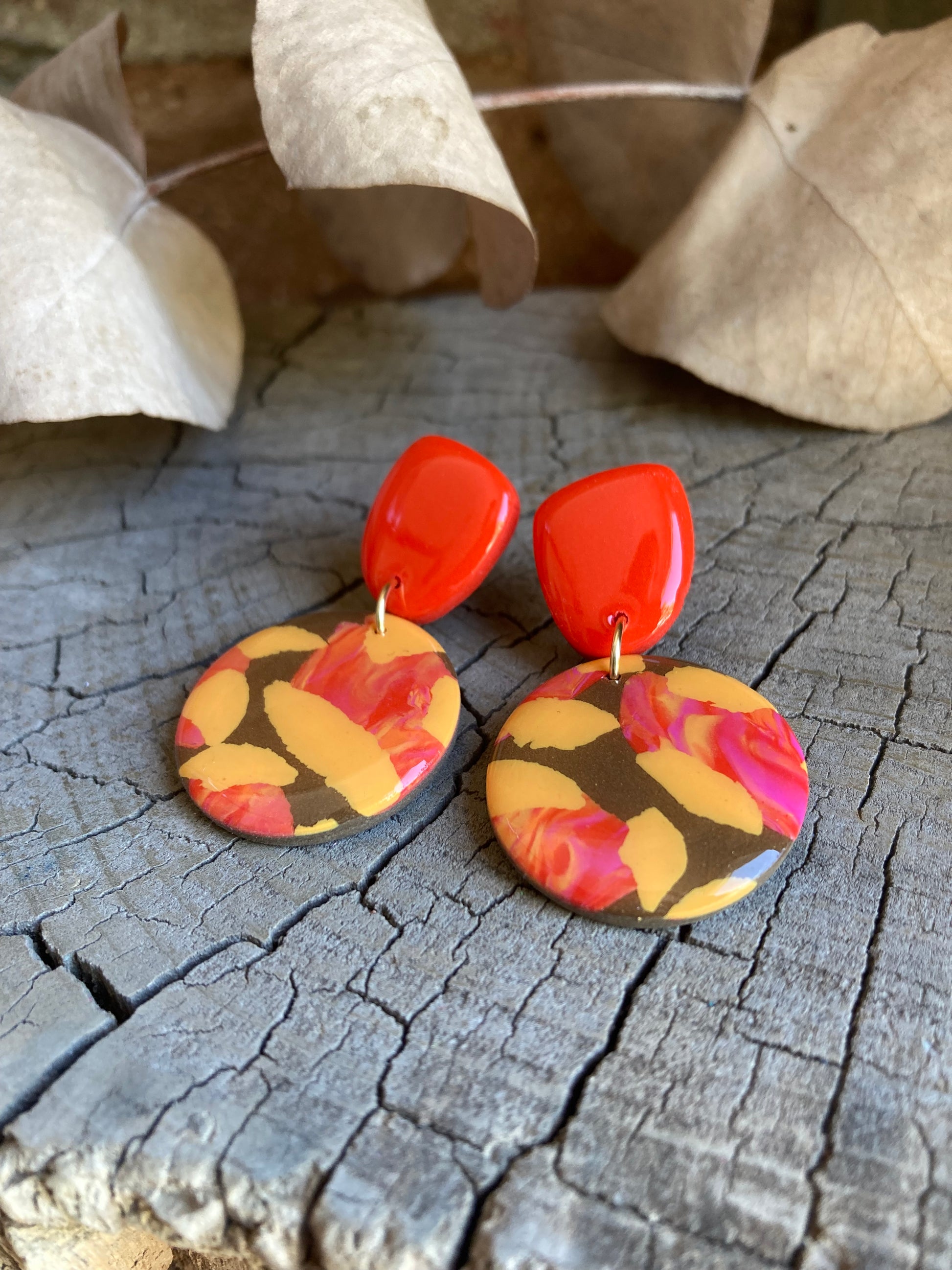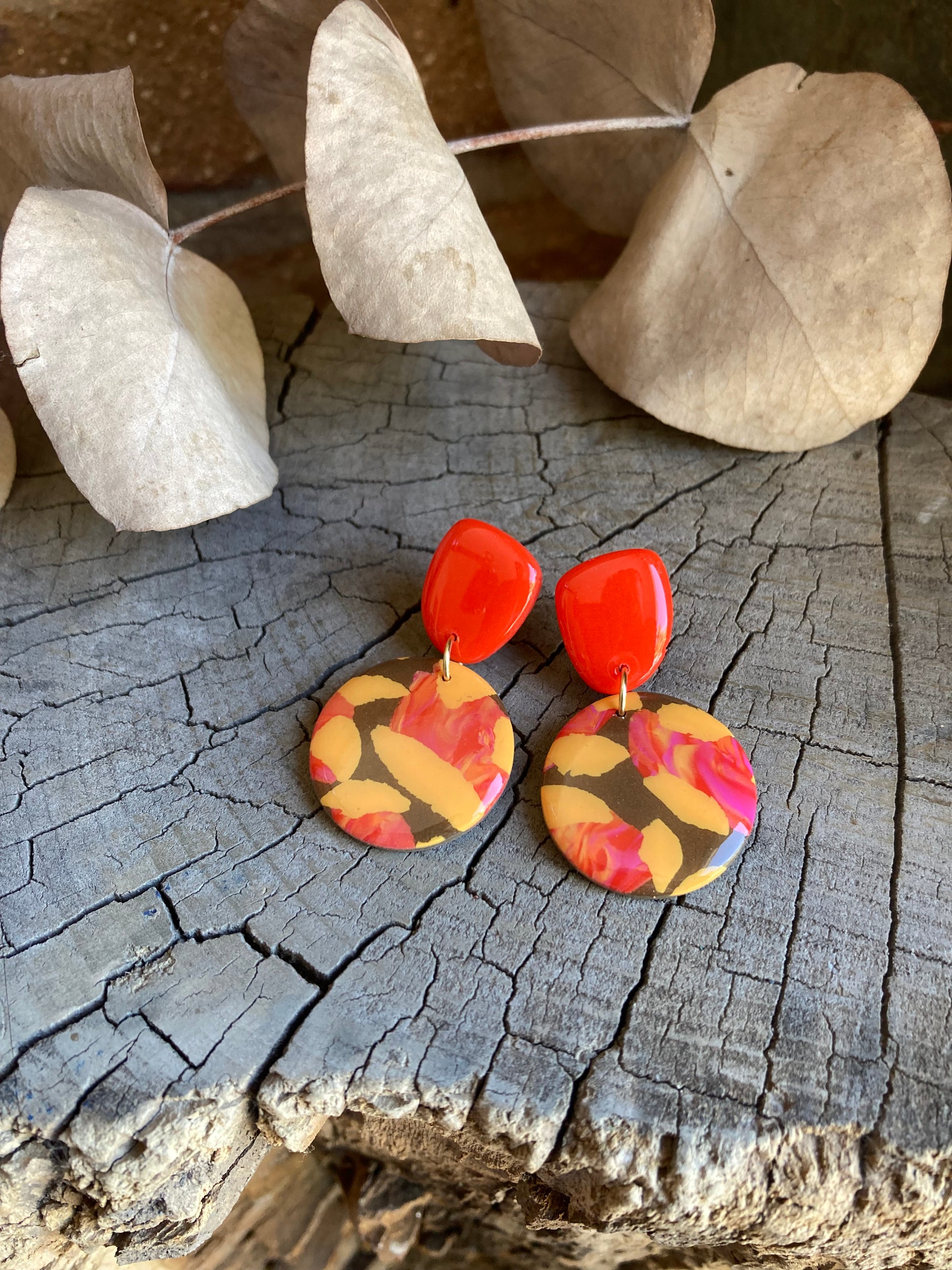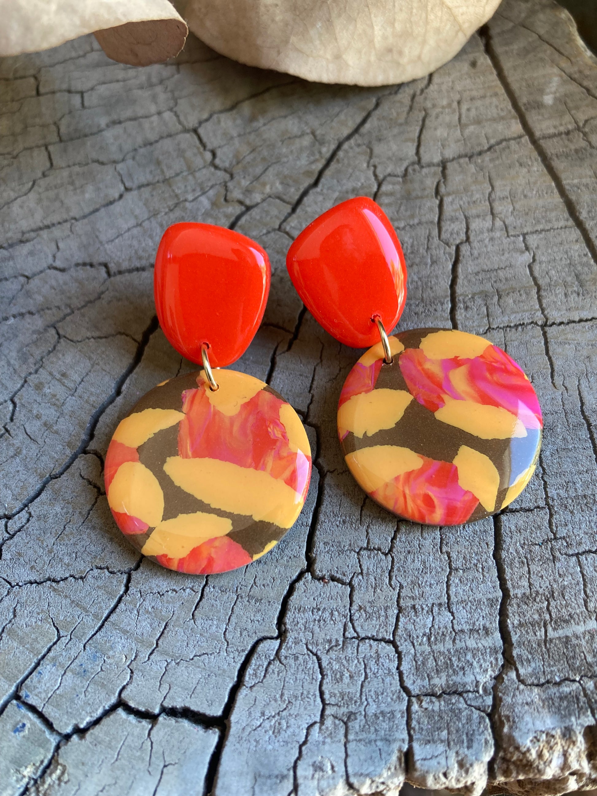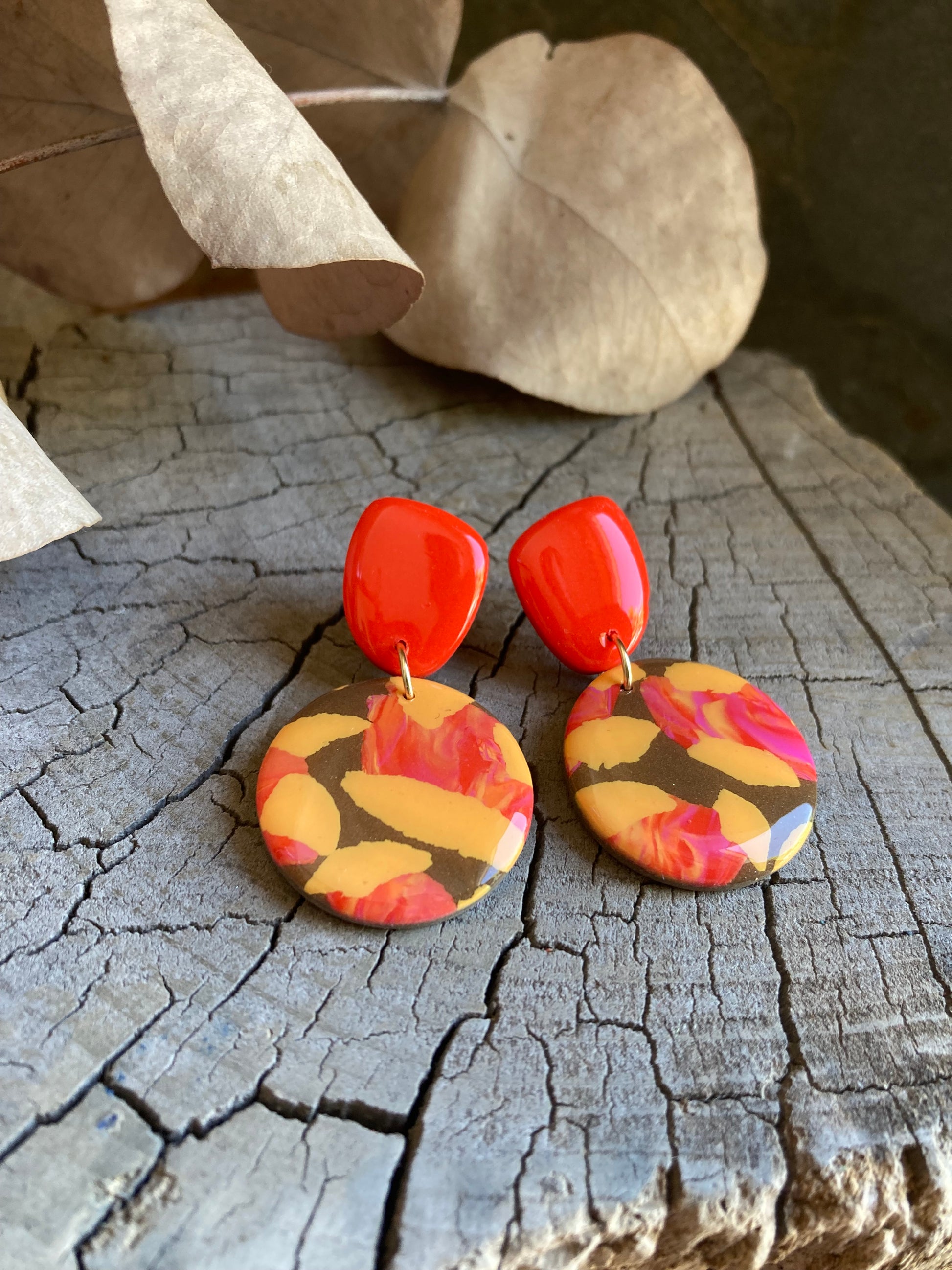 Aros de arcilla polimérica con top coat de resina uv. Miden 4,2 cms. Palito de acero quirúrgico y tope de goma.