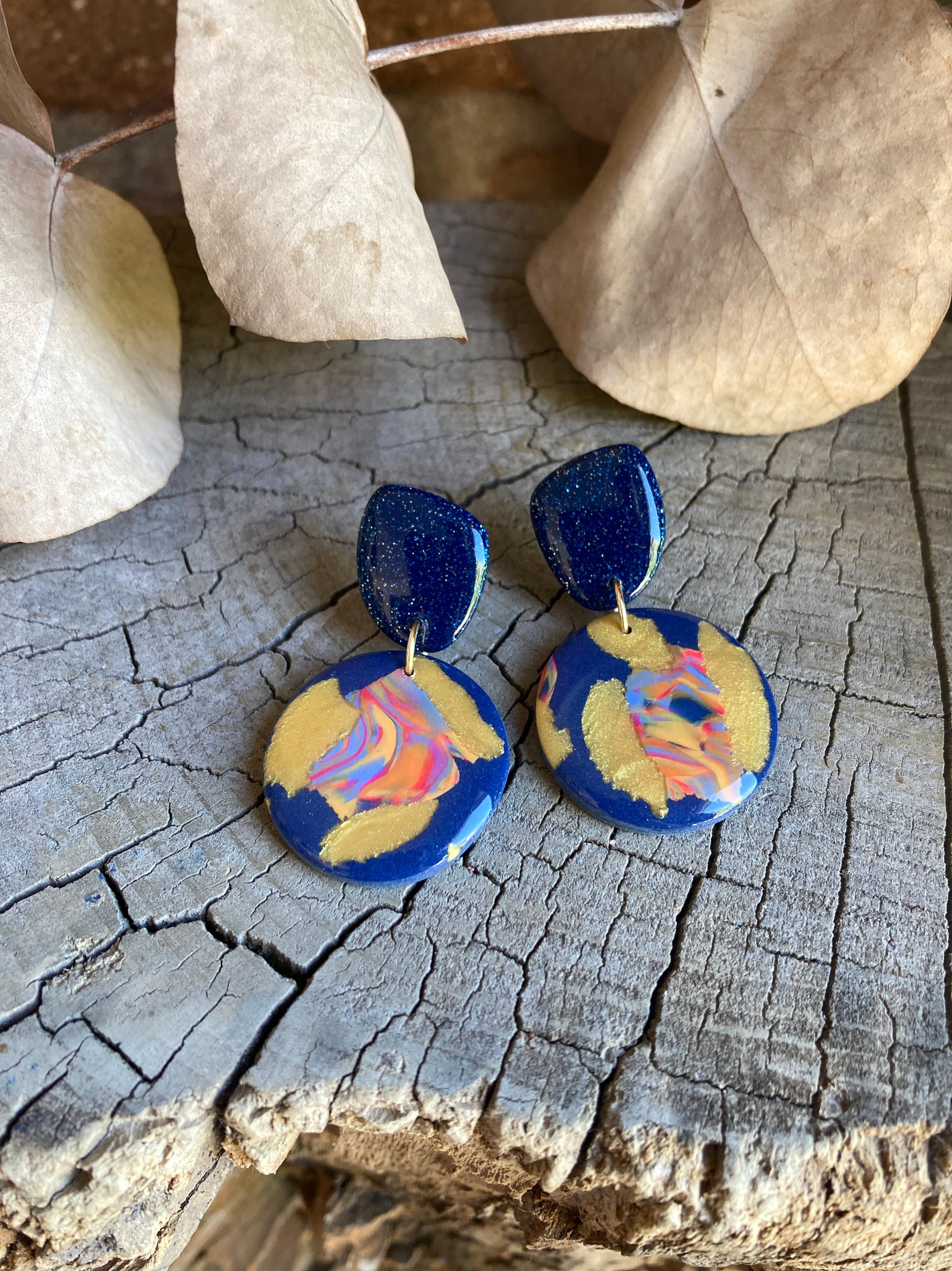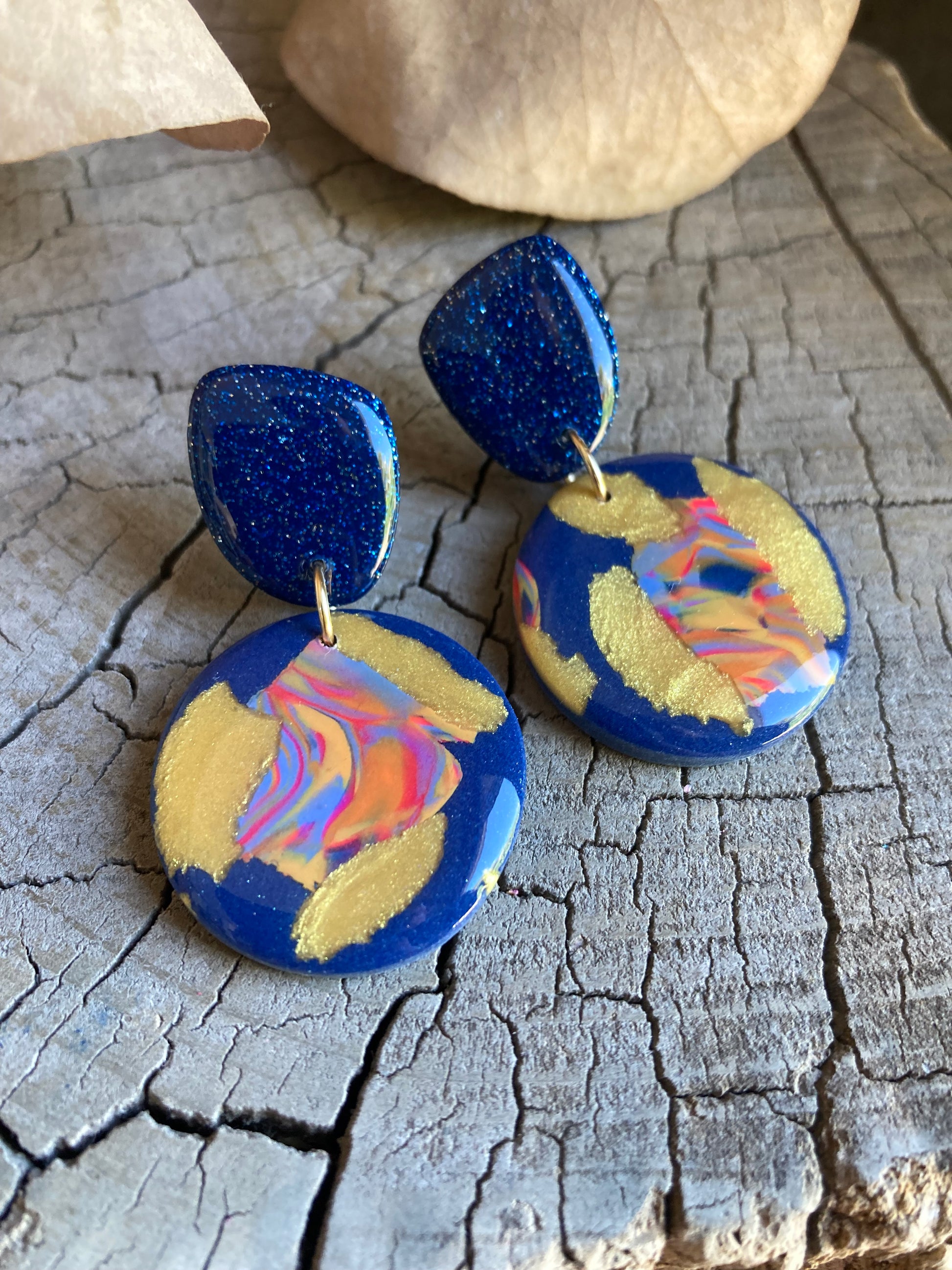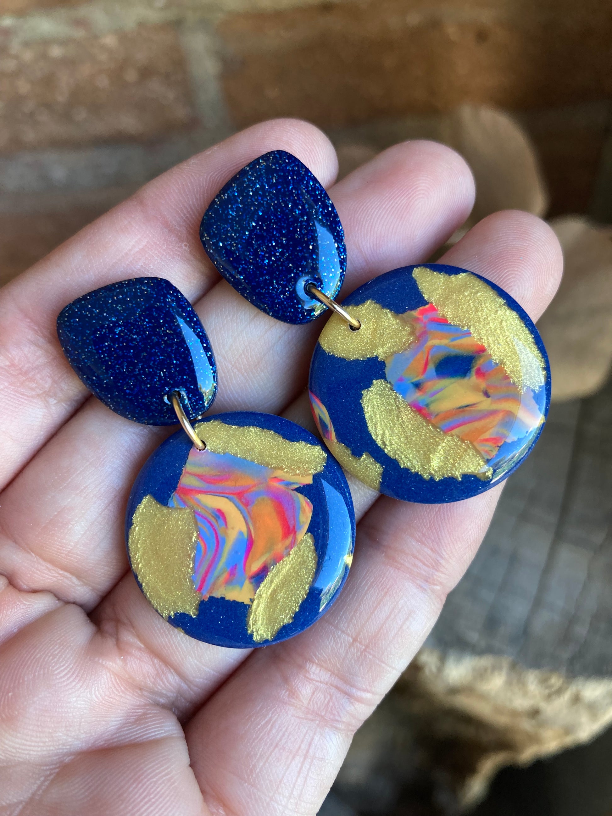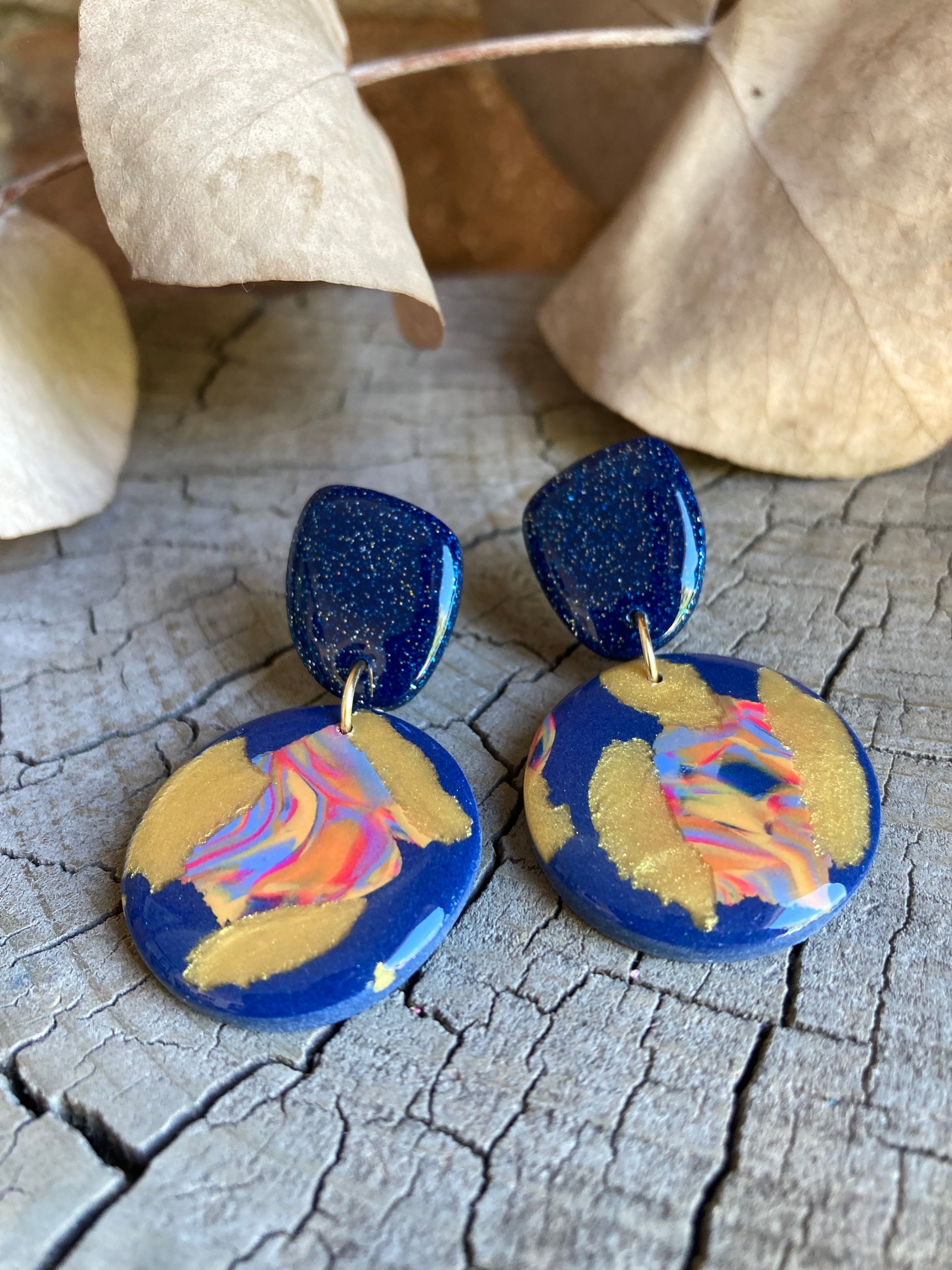 Aros de arcilla polimérica con top coat de resina uv. Miden 4,2 cms. Palito de acero quirúrgico y tope de goma.