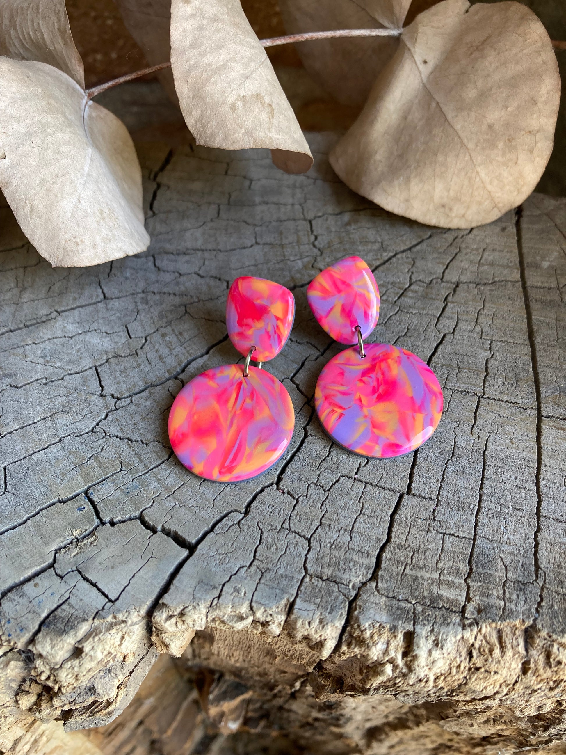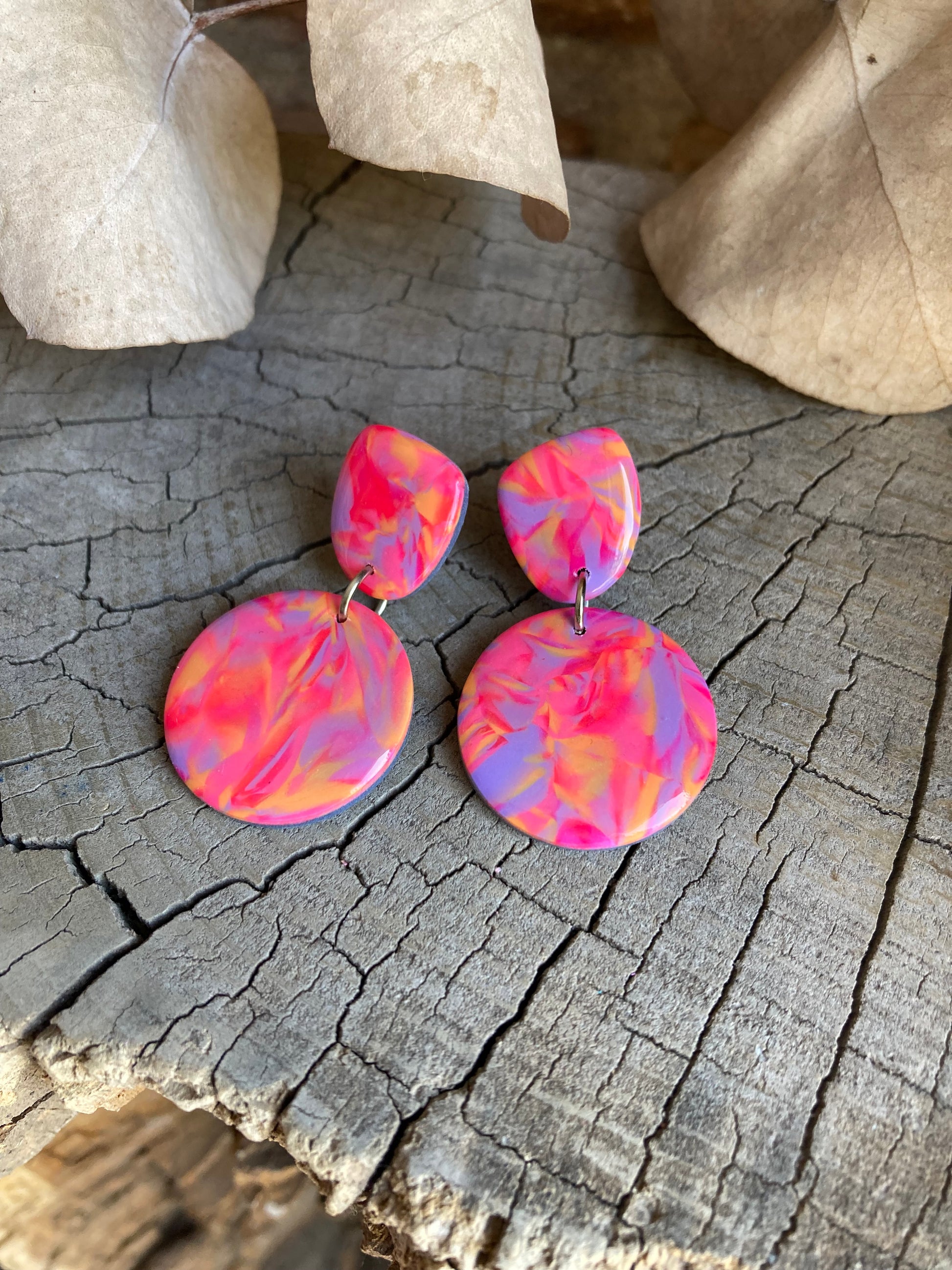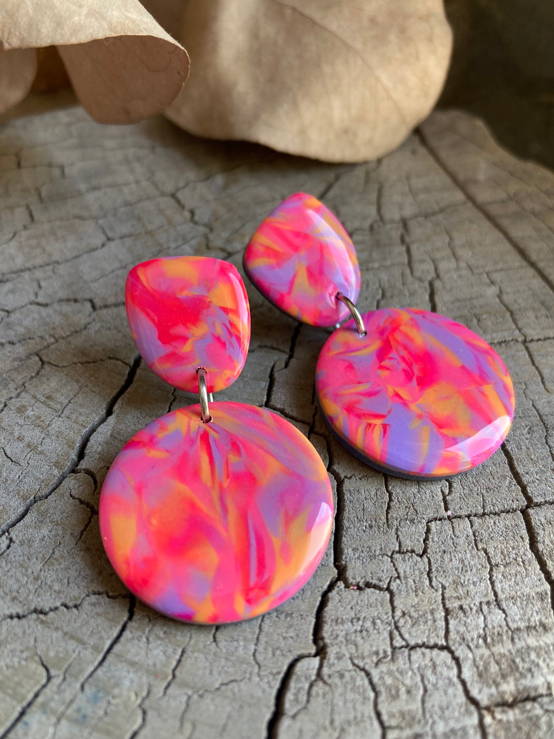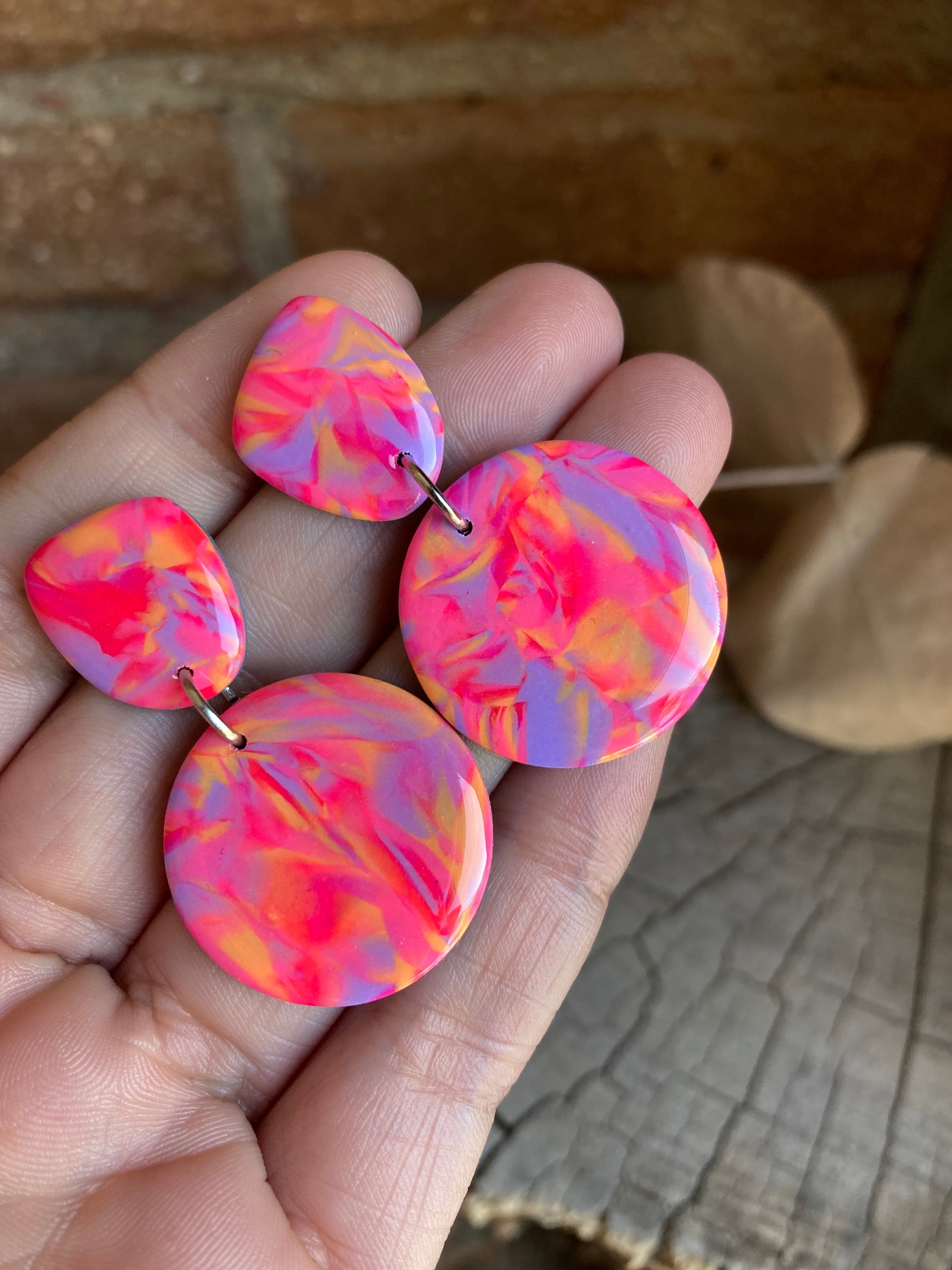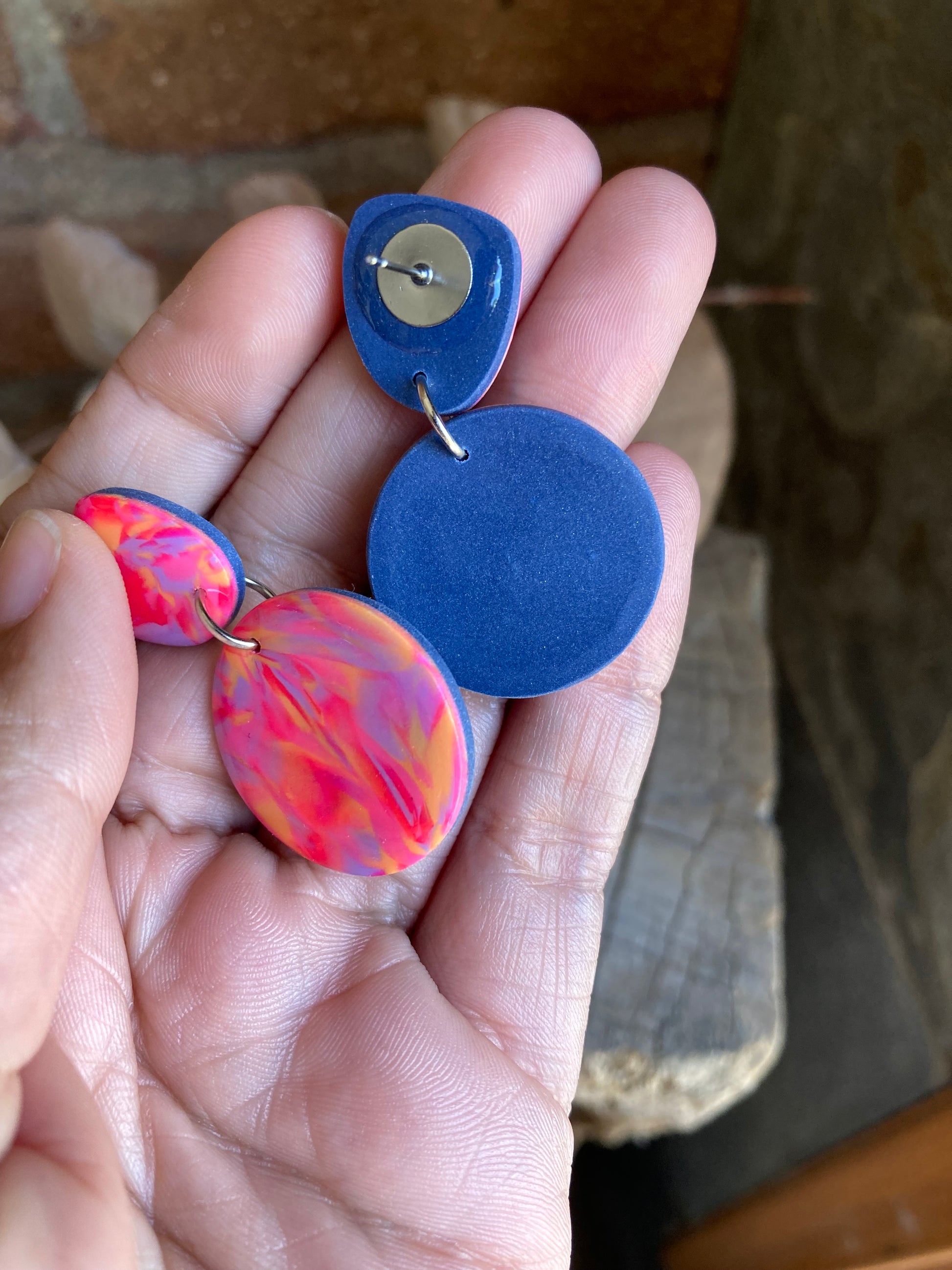 Aros de arcilla polimérica con top coat de resina uv. Miden 4,2 cms. Palito de acero quirúrgico y tope de goma.