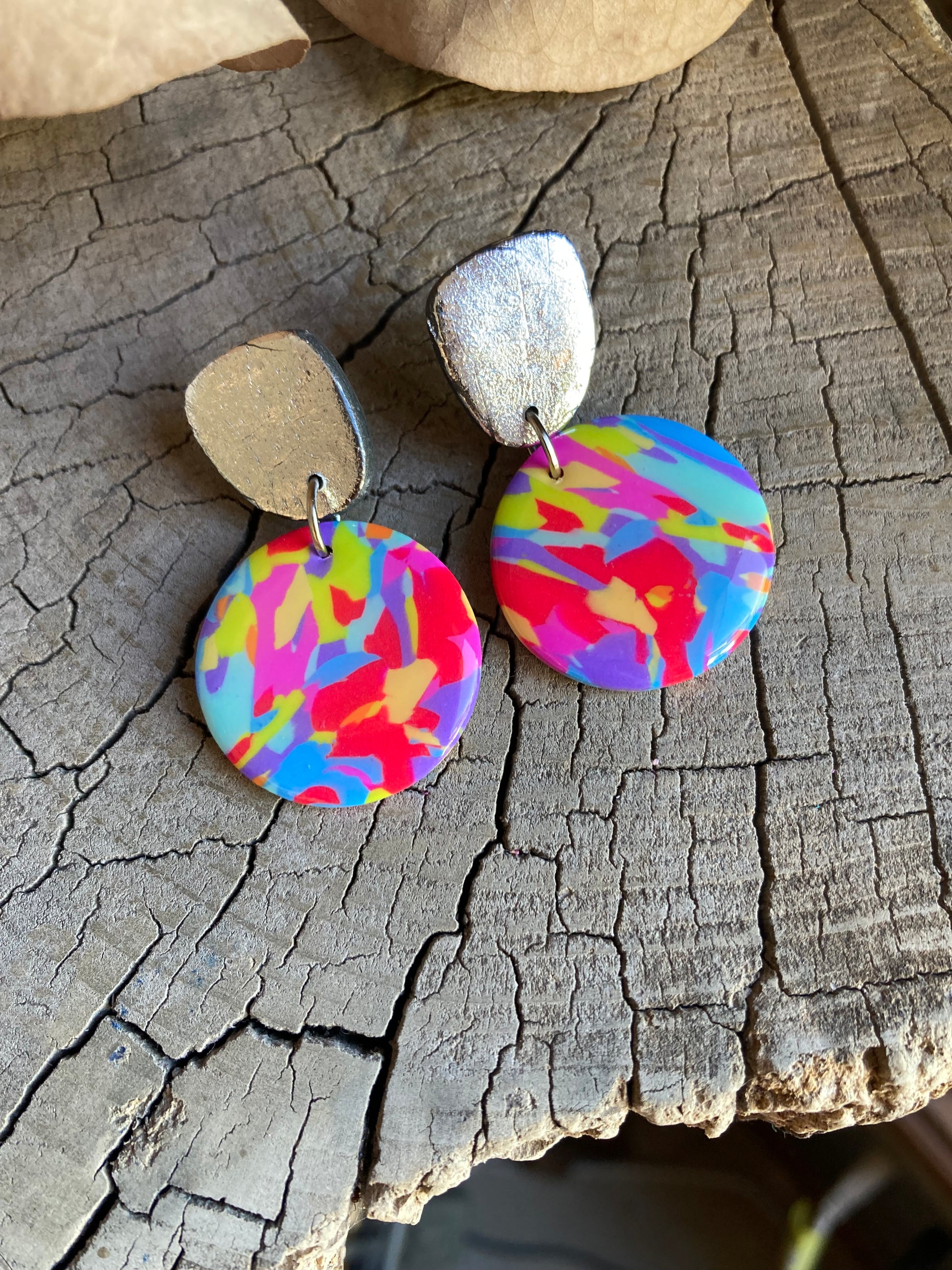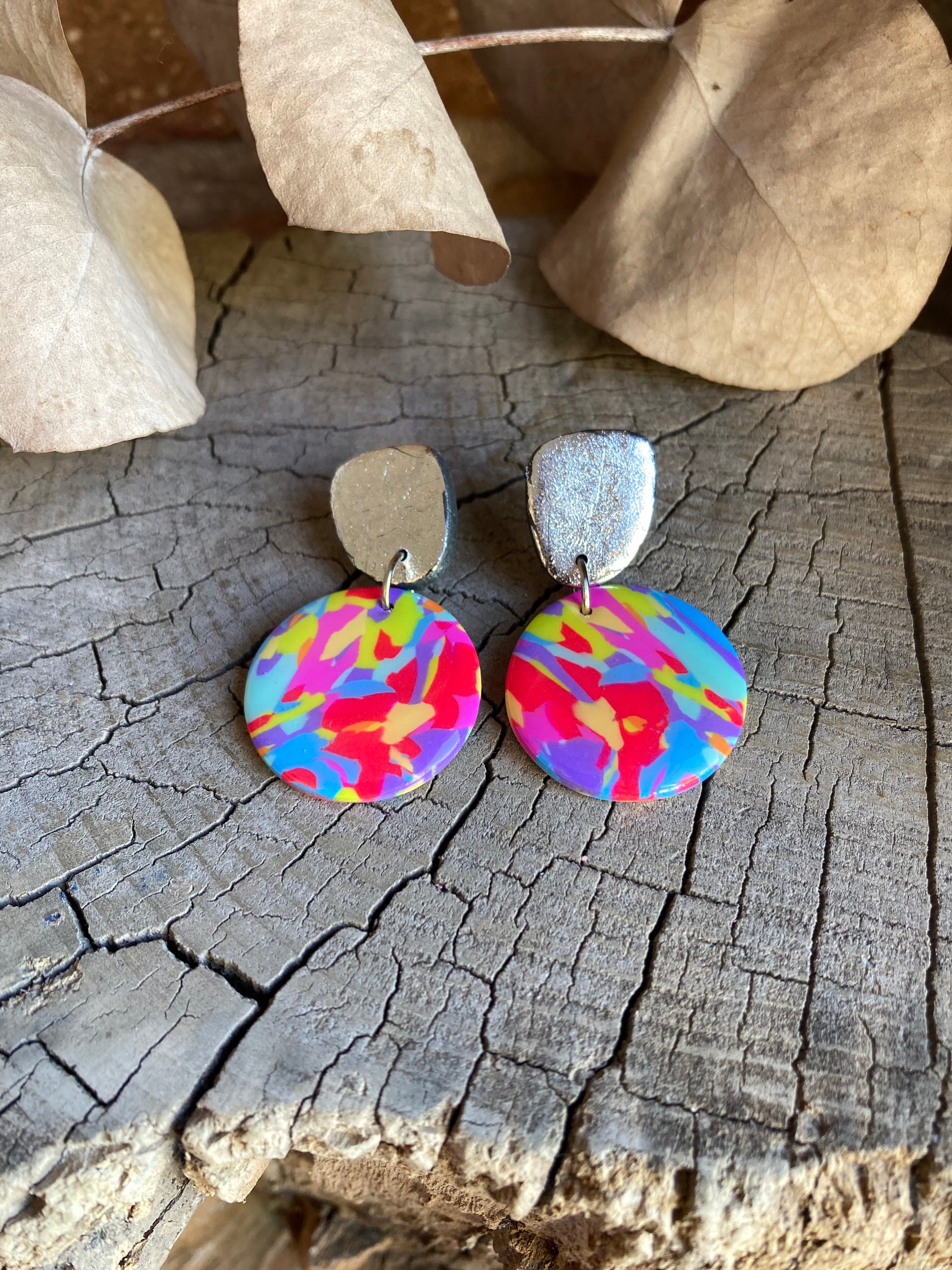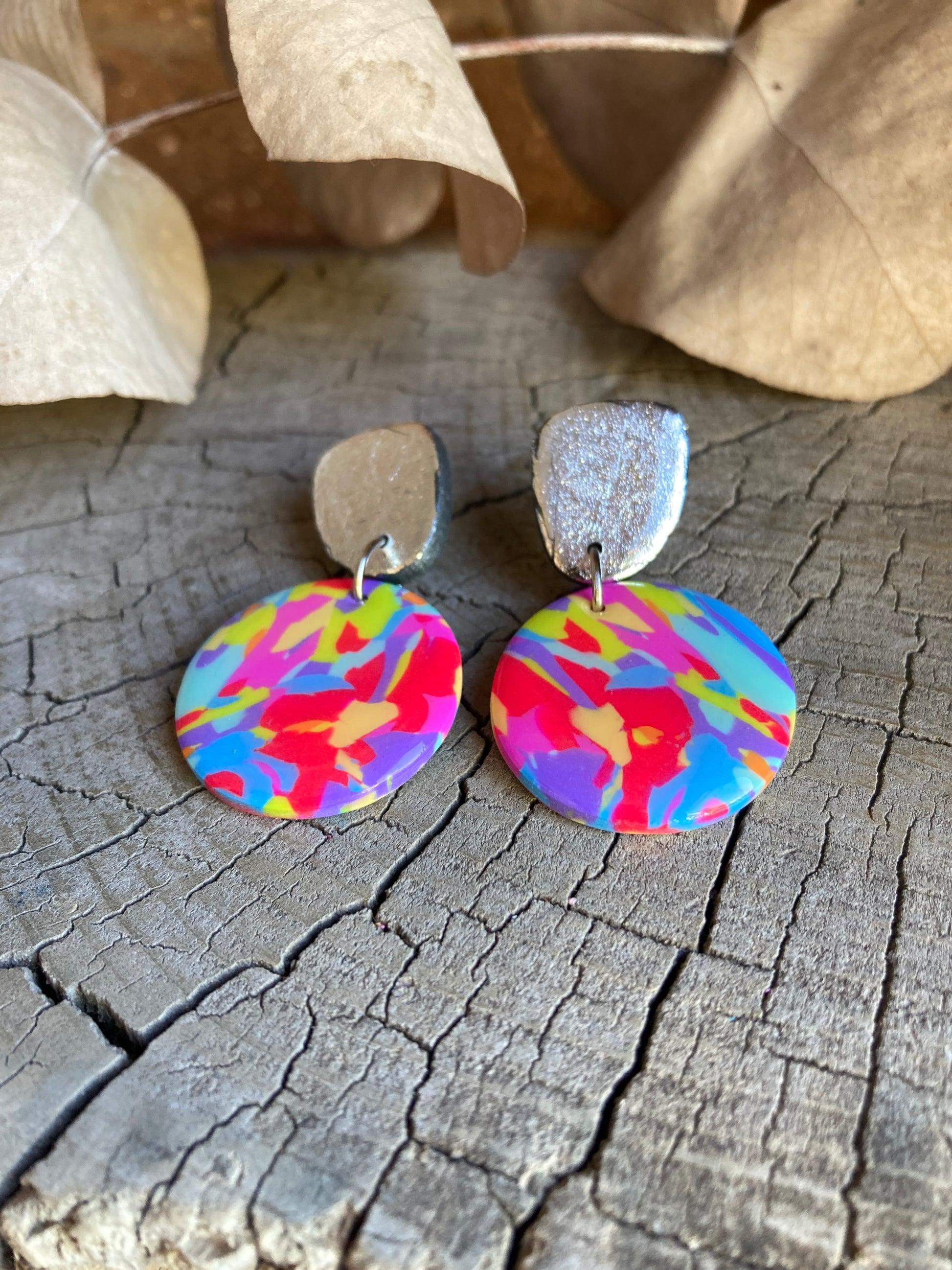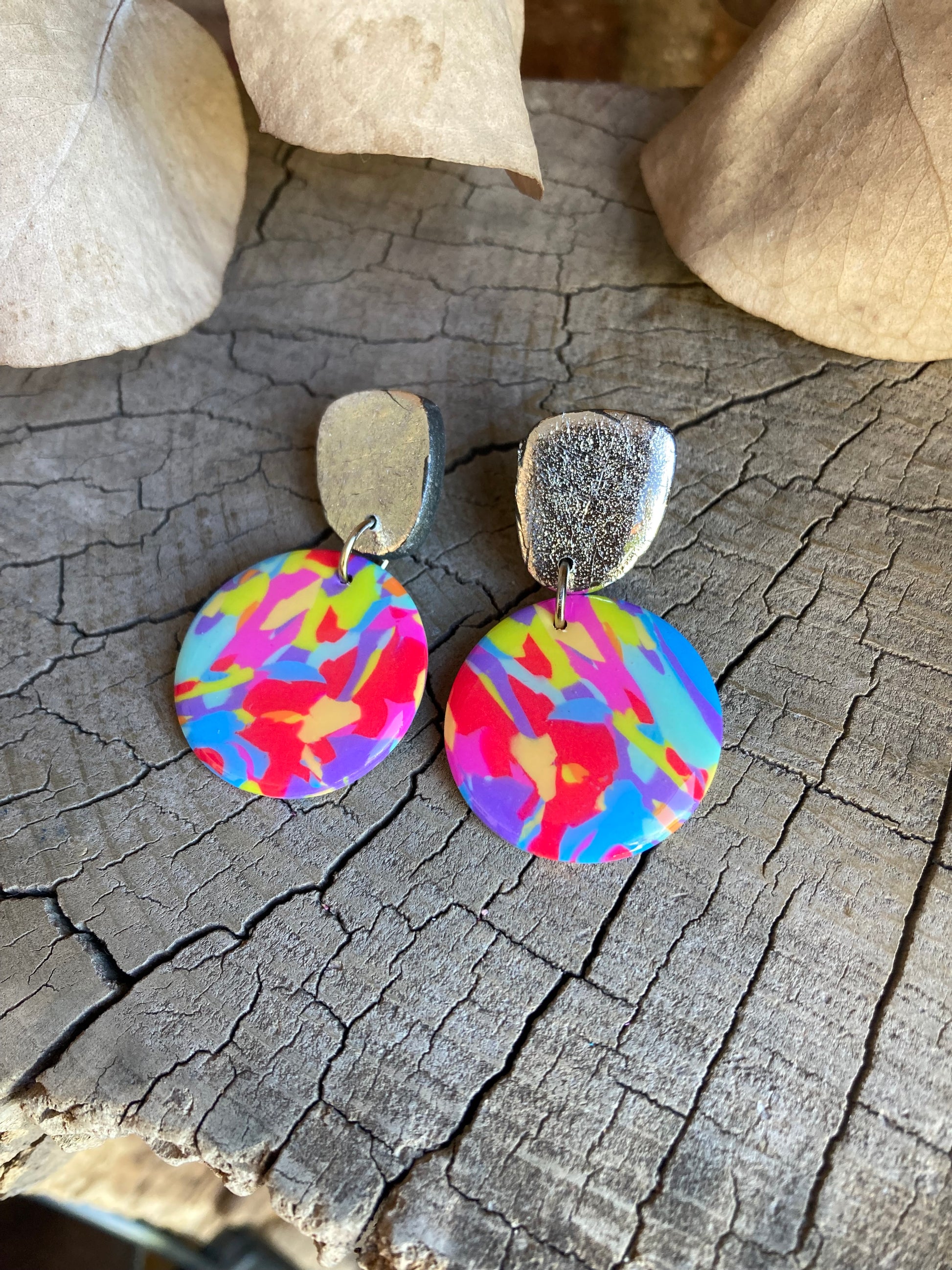 Aros de arcilla polimérica con top coat de resina uv. Miden 4,2 cms. Palito de acero quirúrgico y tope de goma.