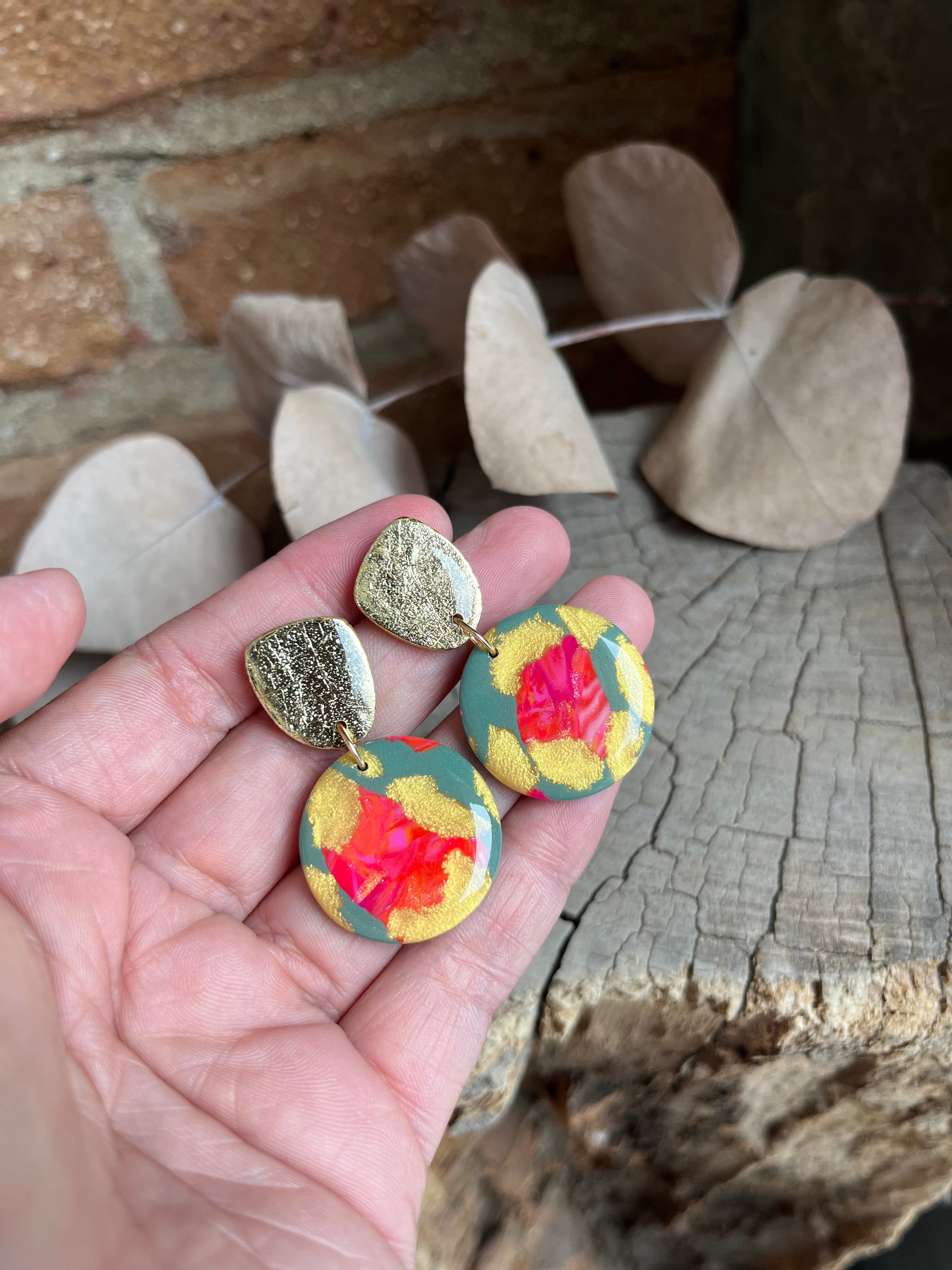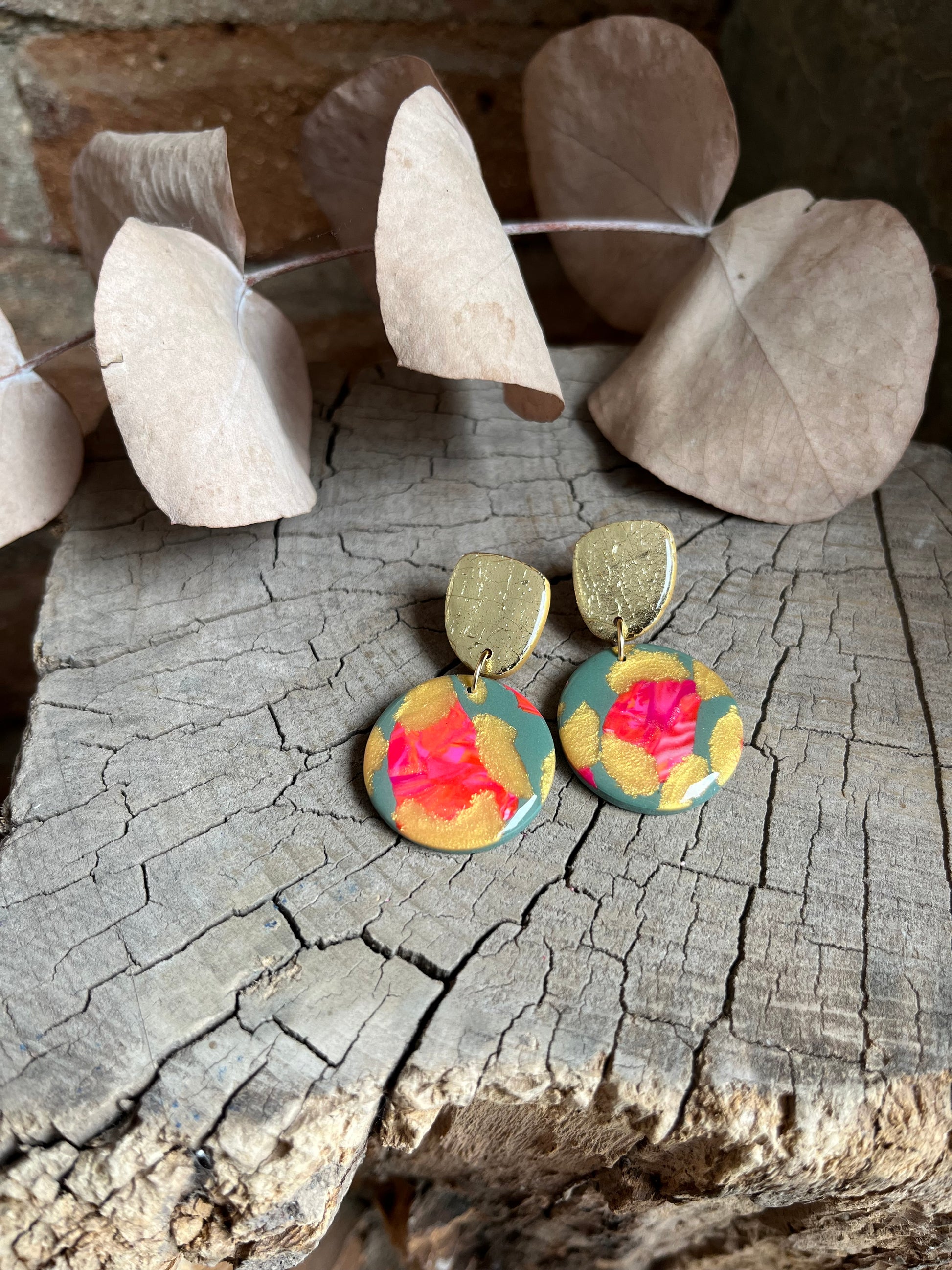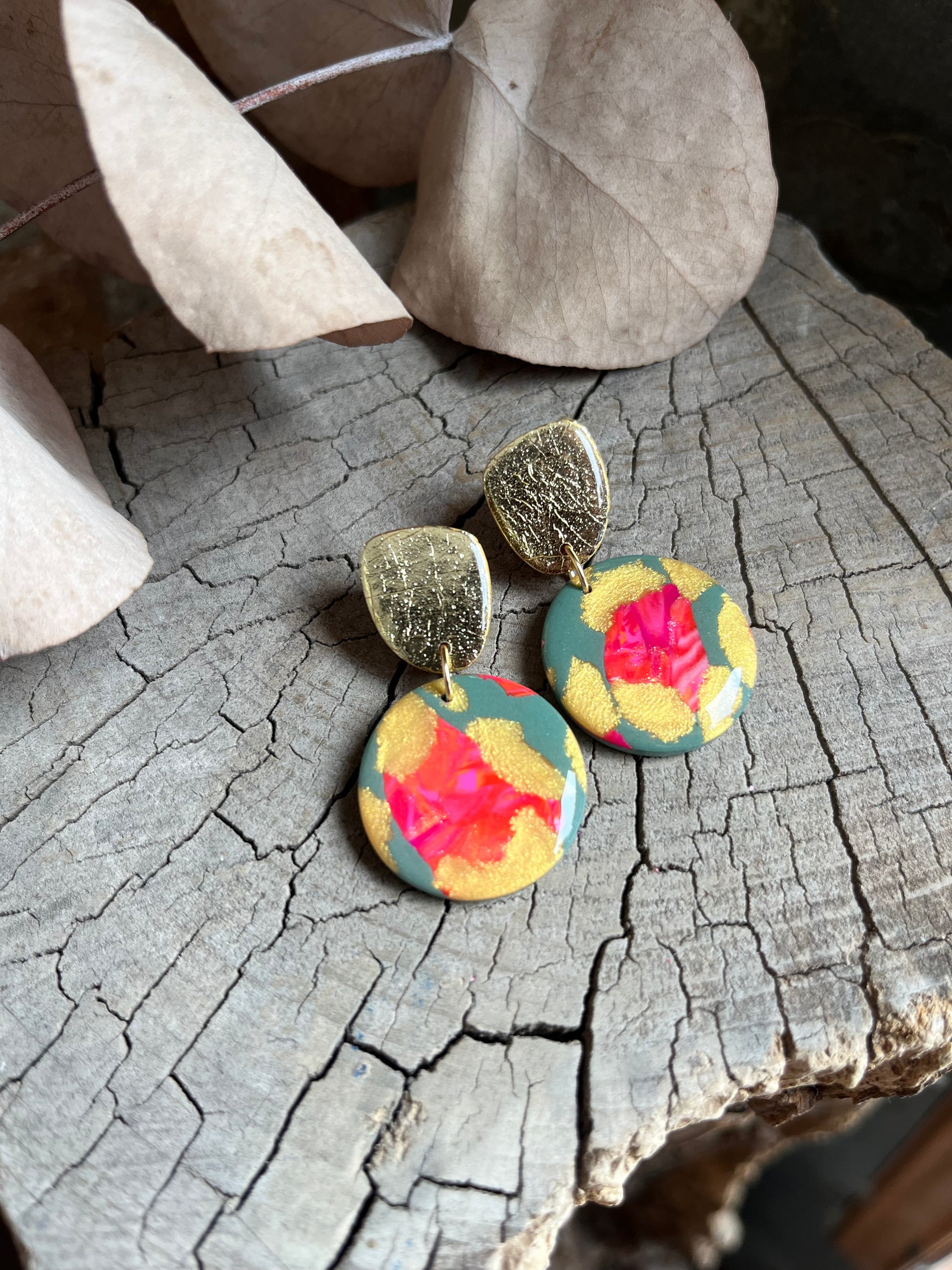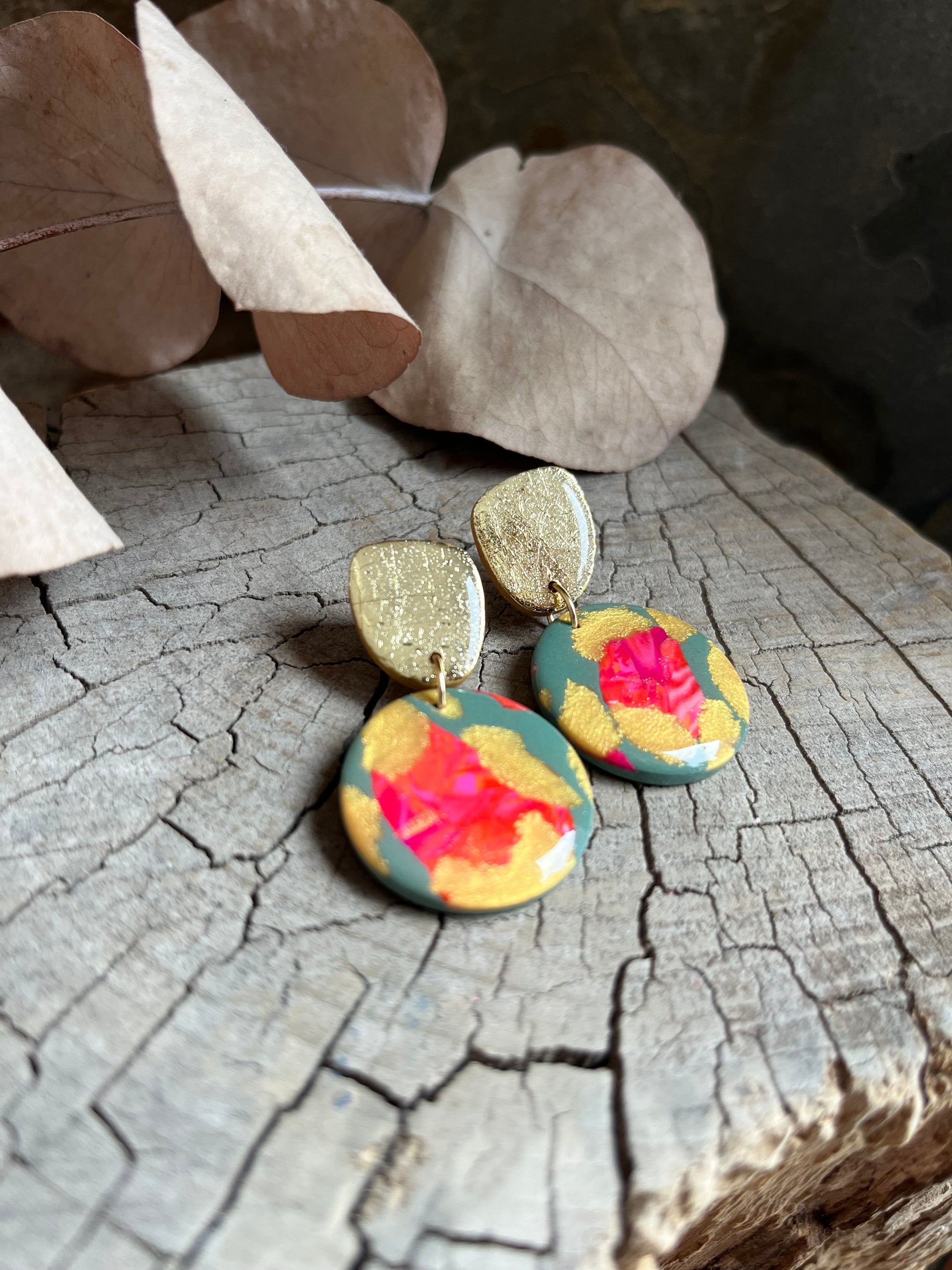Aros de arcilla polimérica con top coat de resina uv. Miden 4,2 cms. Palito de acero quirúrgico y tope de goma.