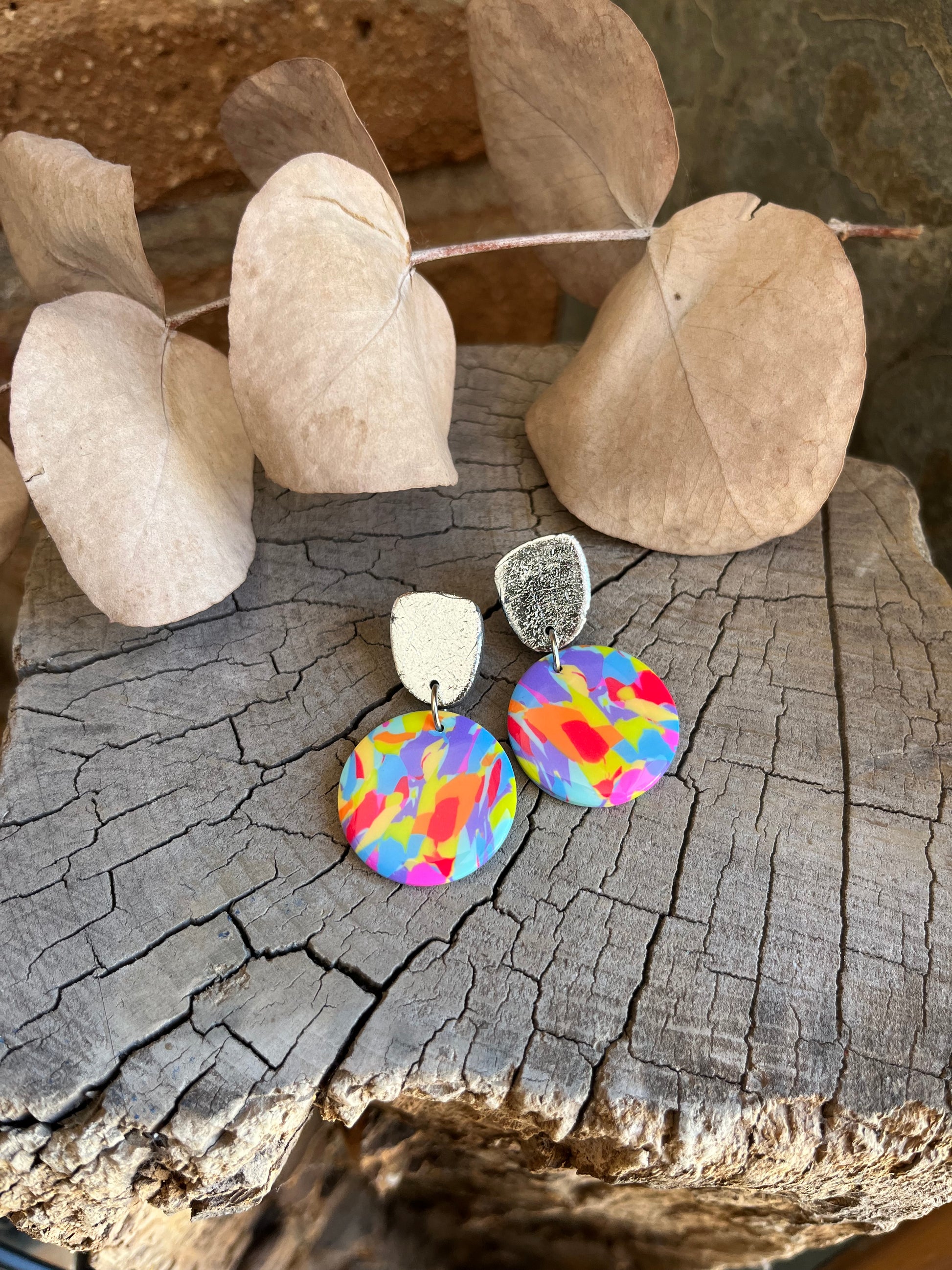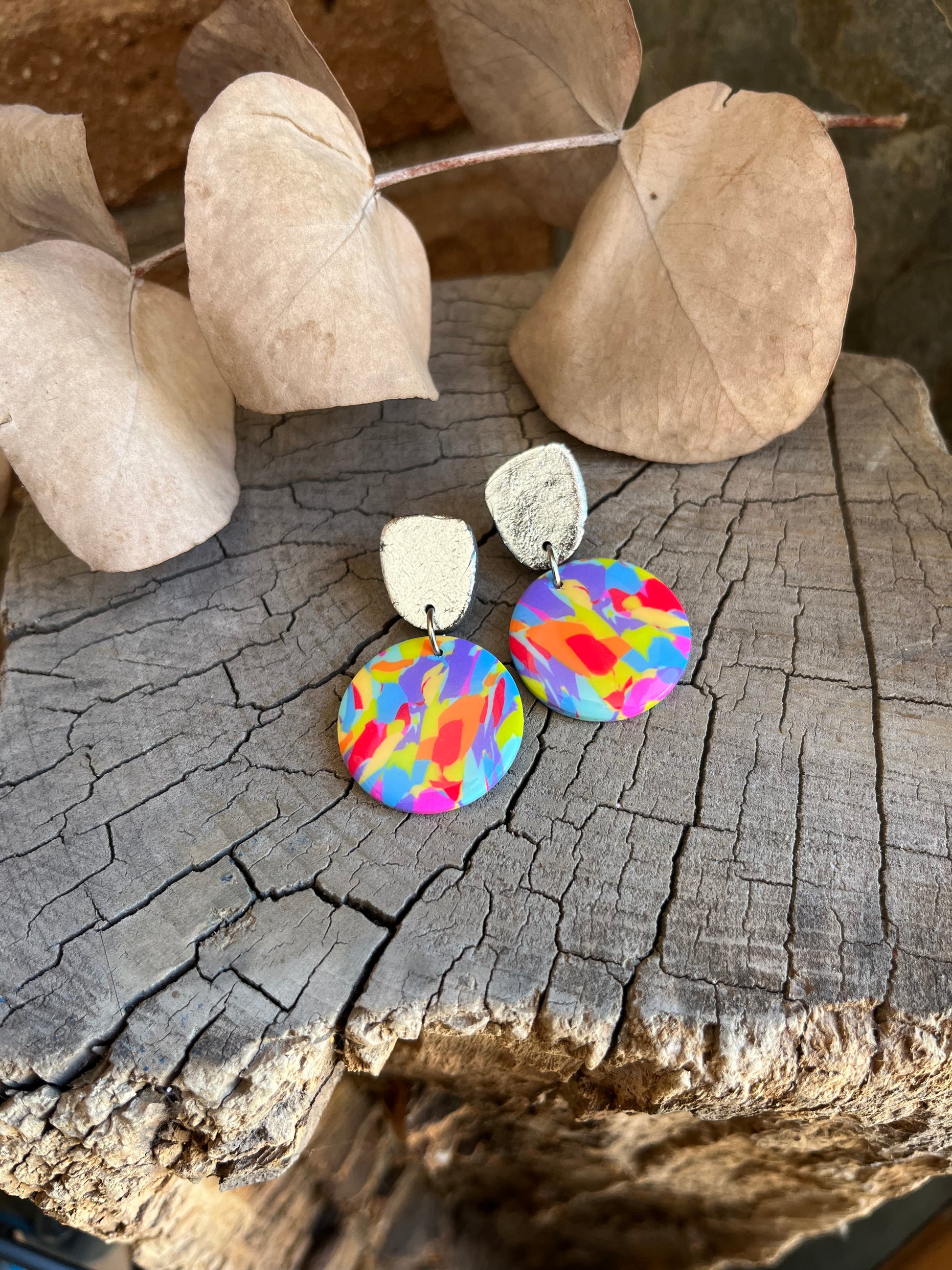 Aros de arcilla polimérica con top coat de resina uv. Miden 4,2 cms. Palito de acero quirúrgico y tope de goma.