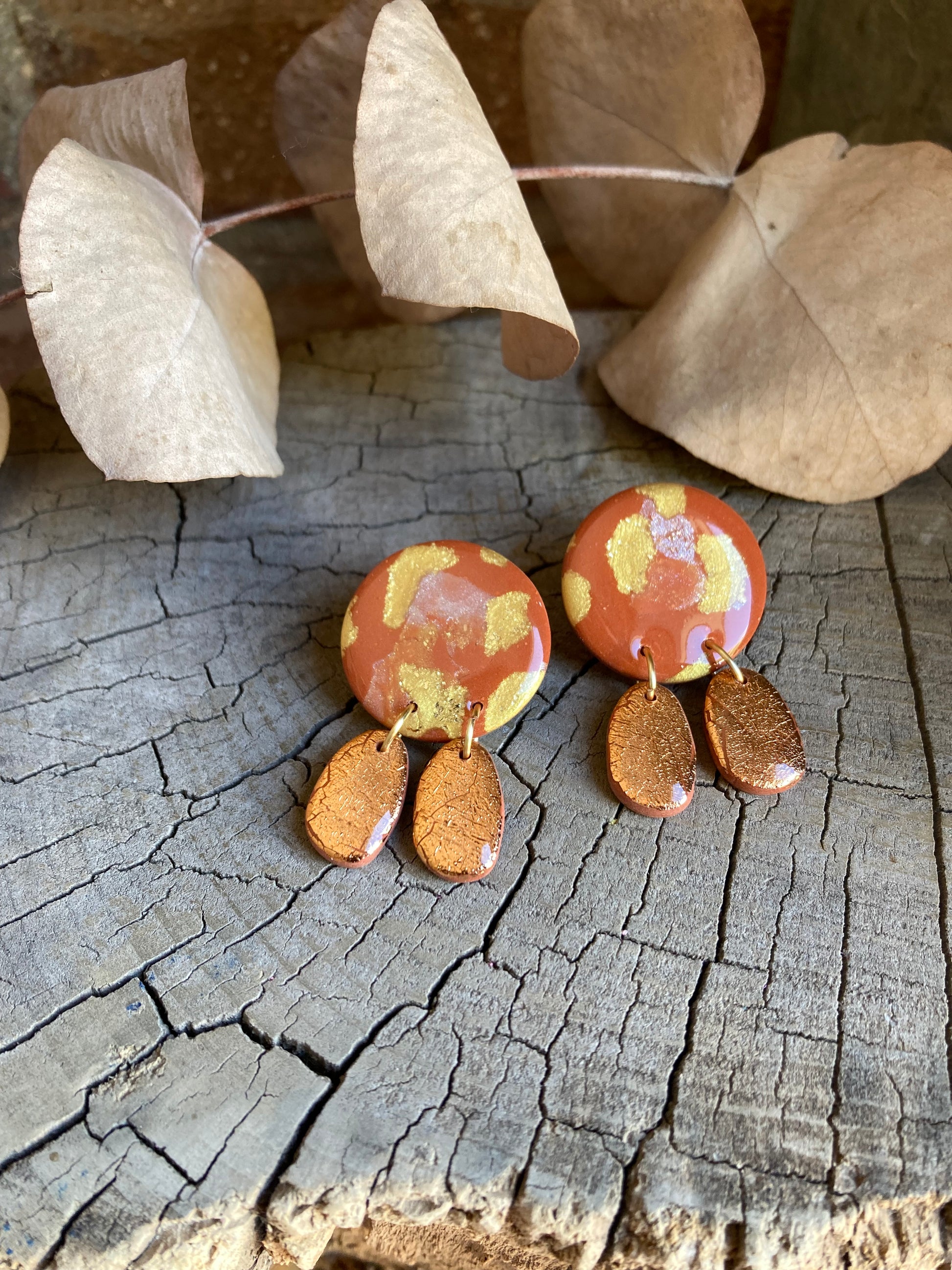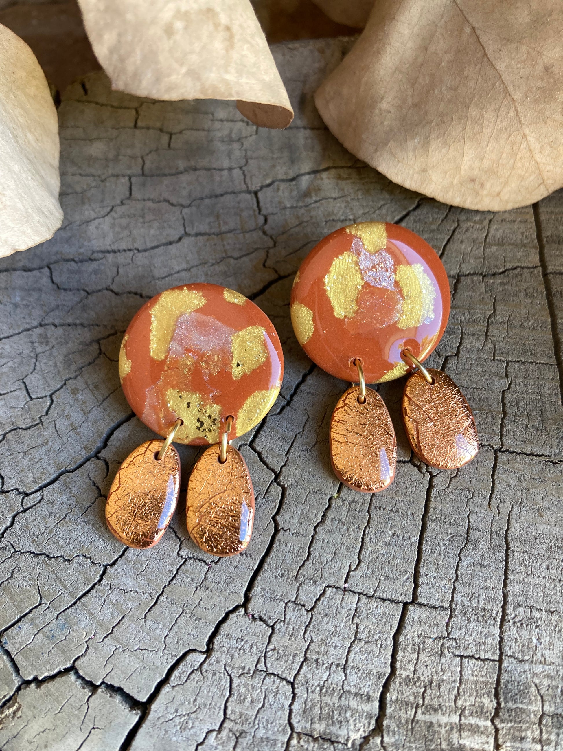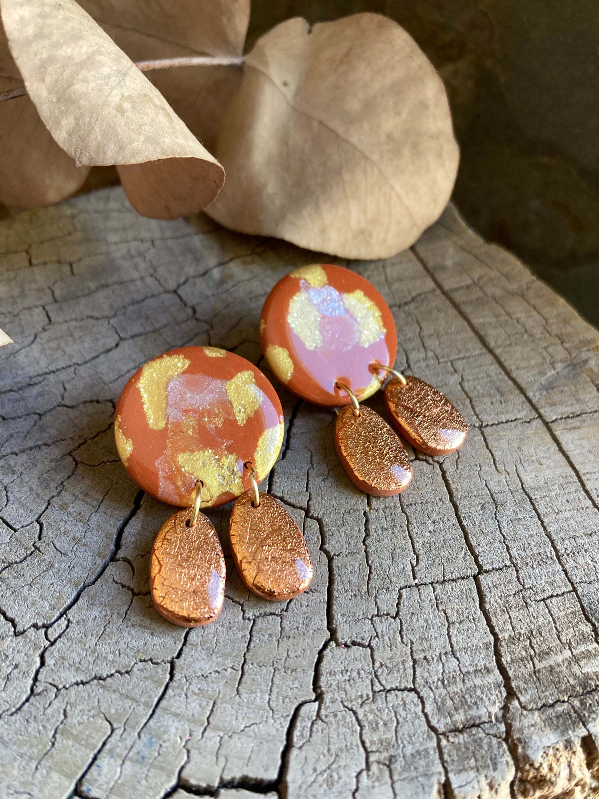 Aros de arcilla polimérica con top coat de resina uv. Miden 4,2 cms. Palito de acero quirúrgico y tope de goma.