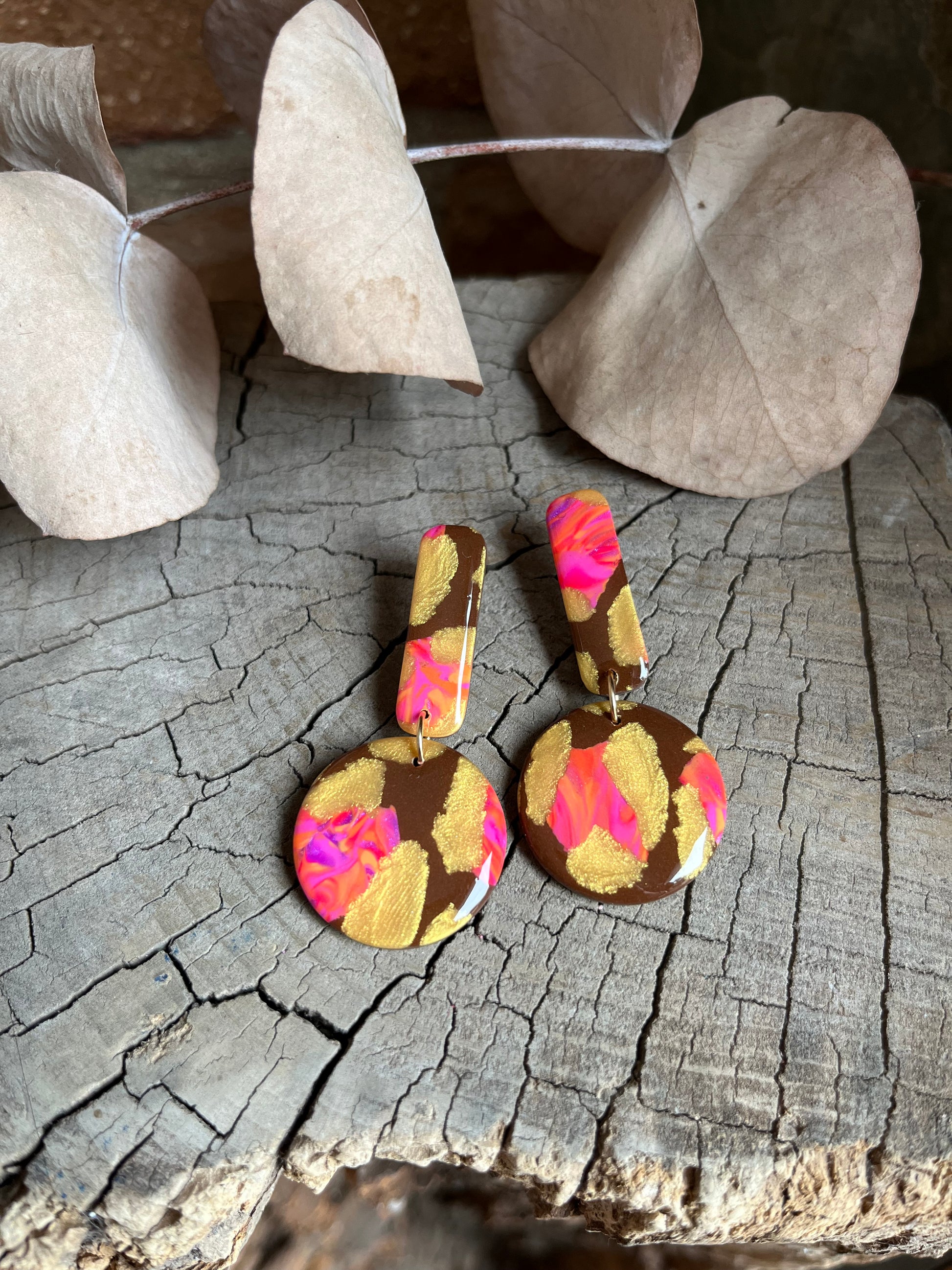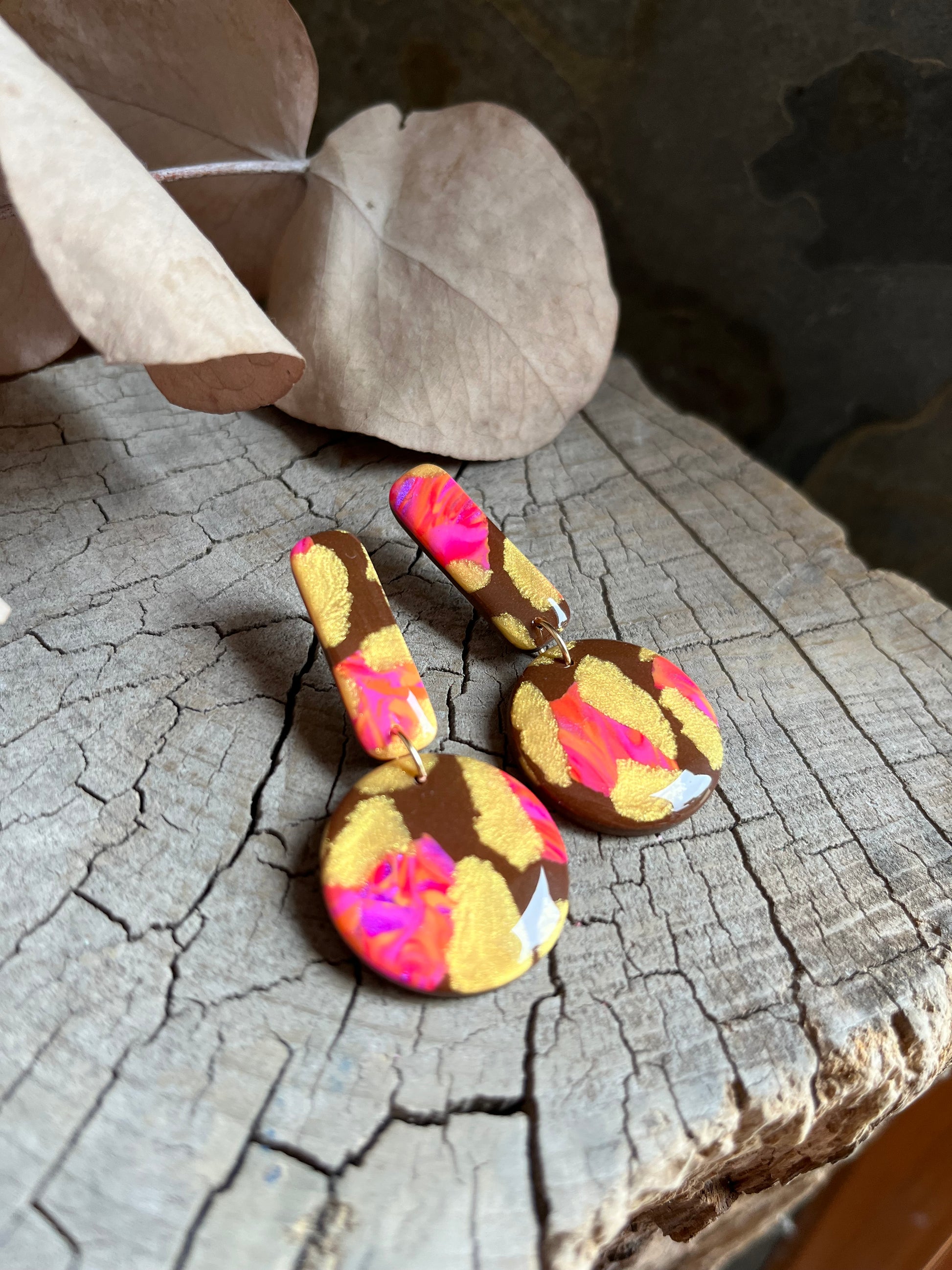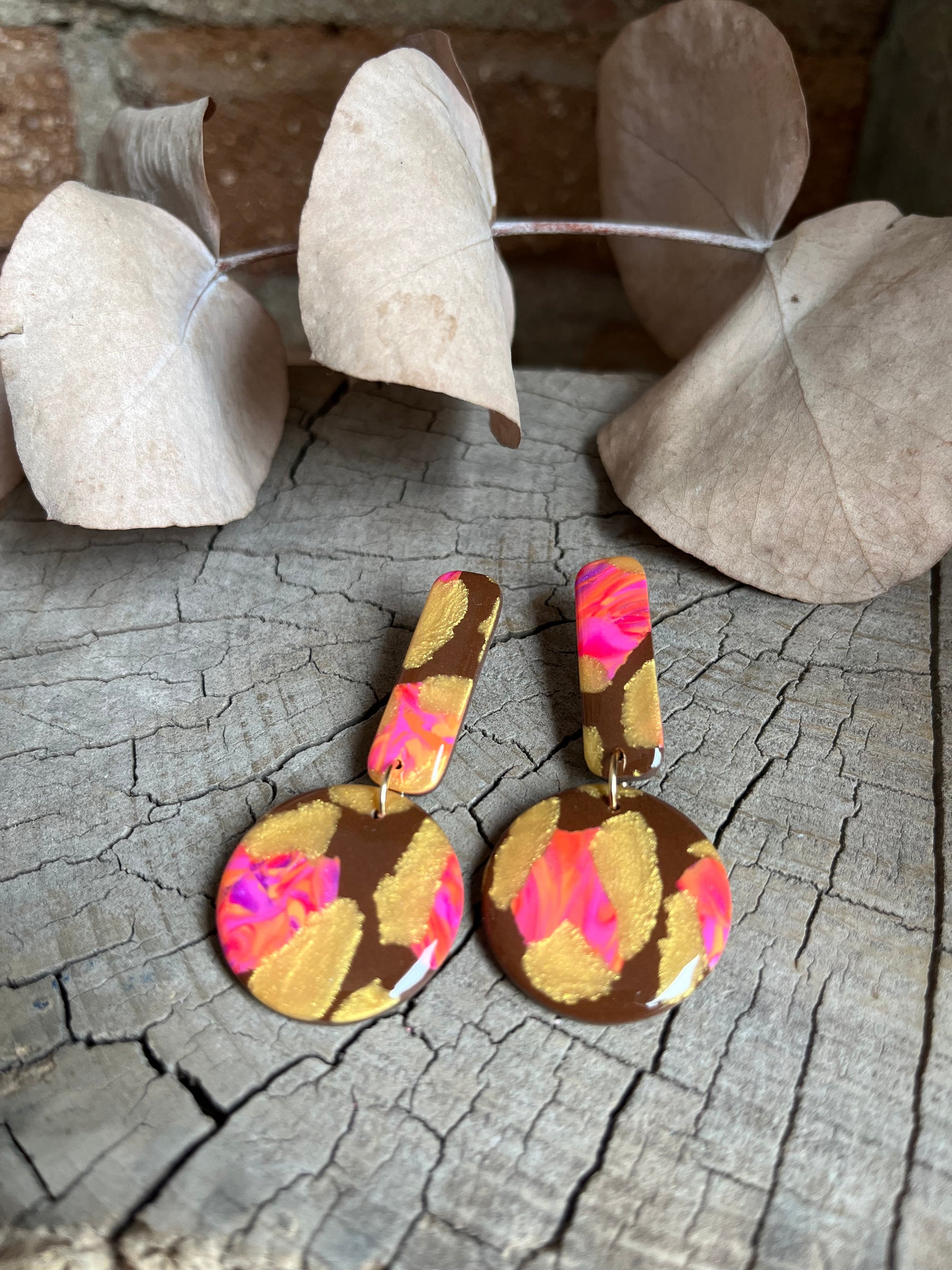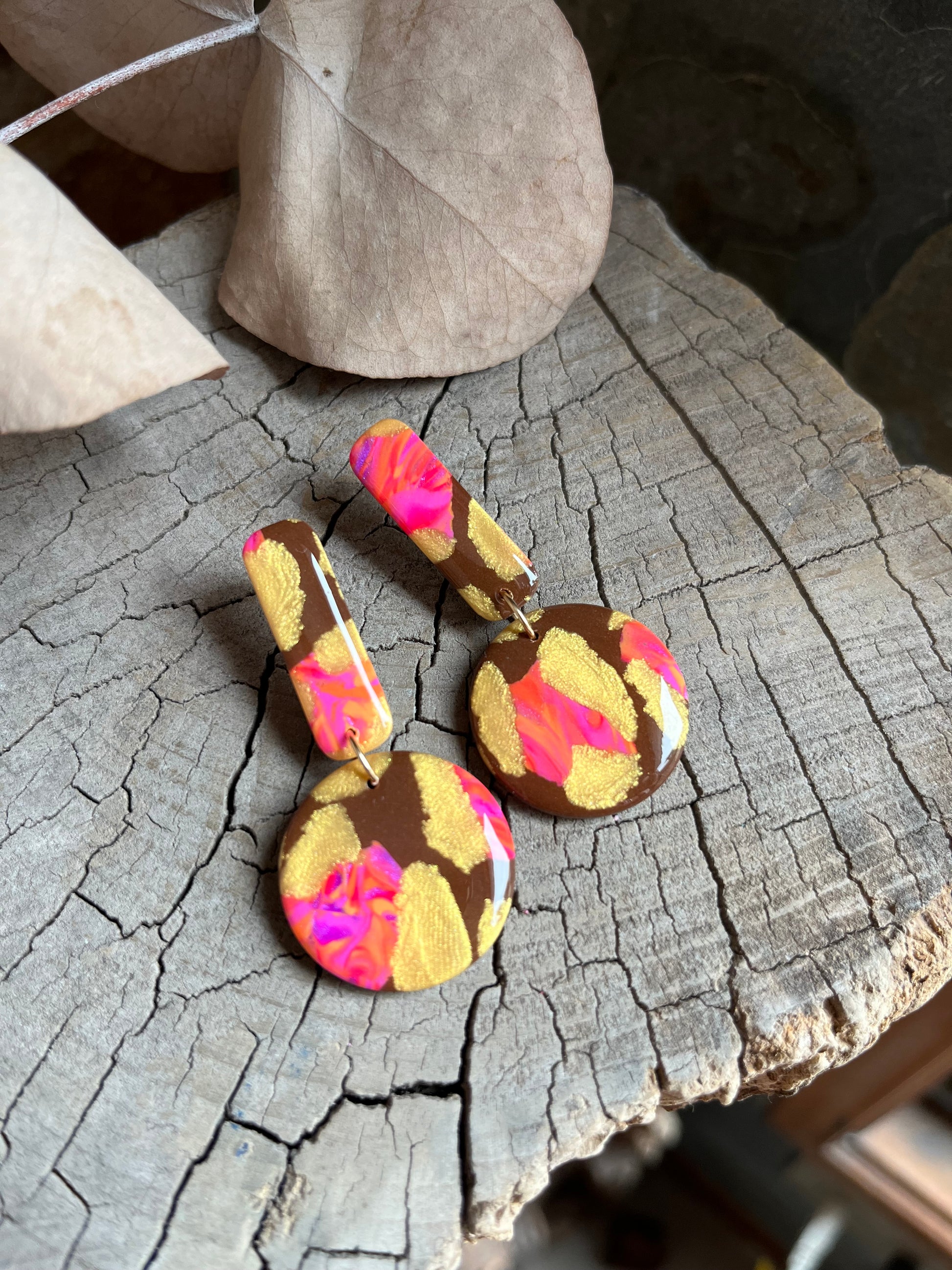 Aros de arcilla polimérica con top coat de resina uv. Miden 5,5 cms. Palito de acero quirúrgico y tope de goma.