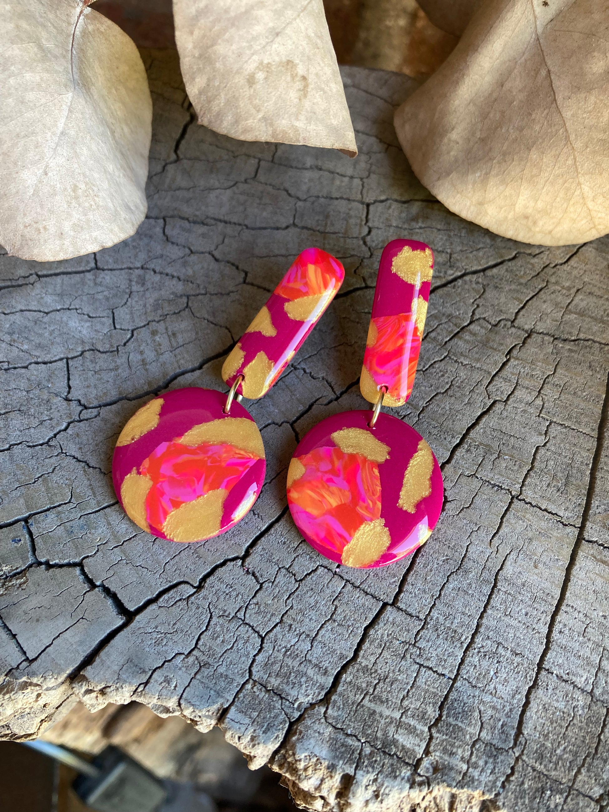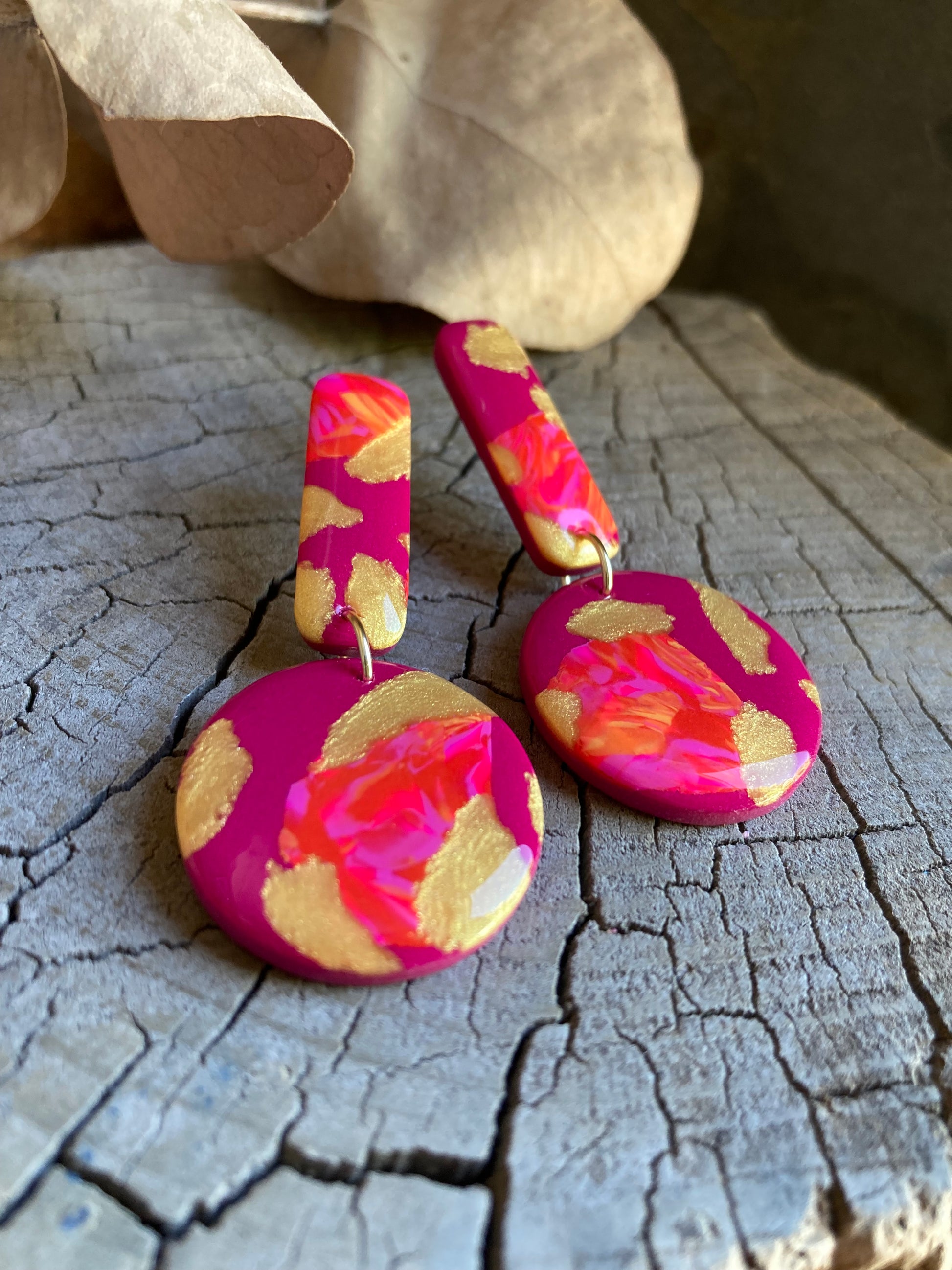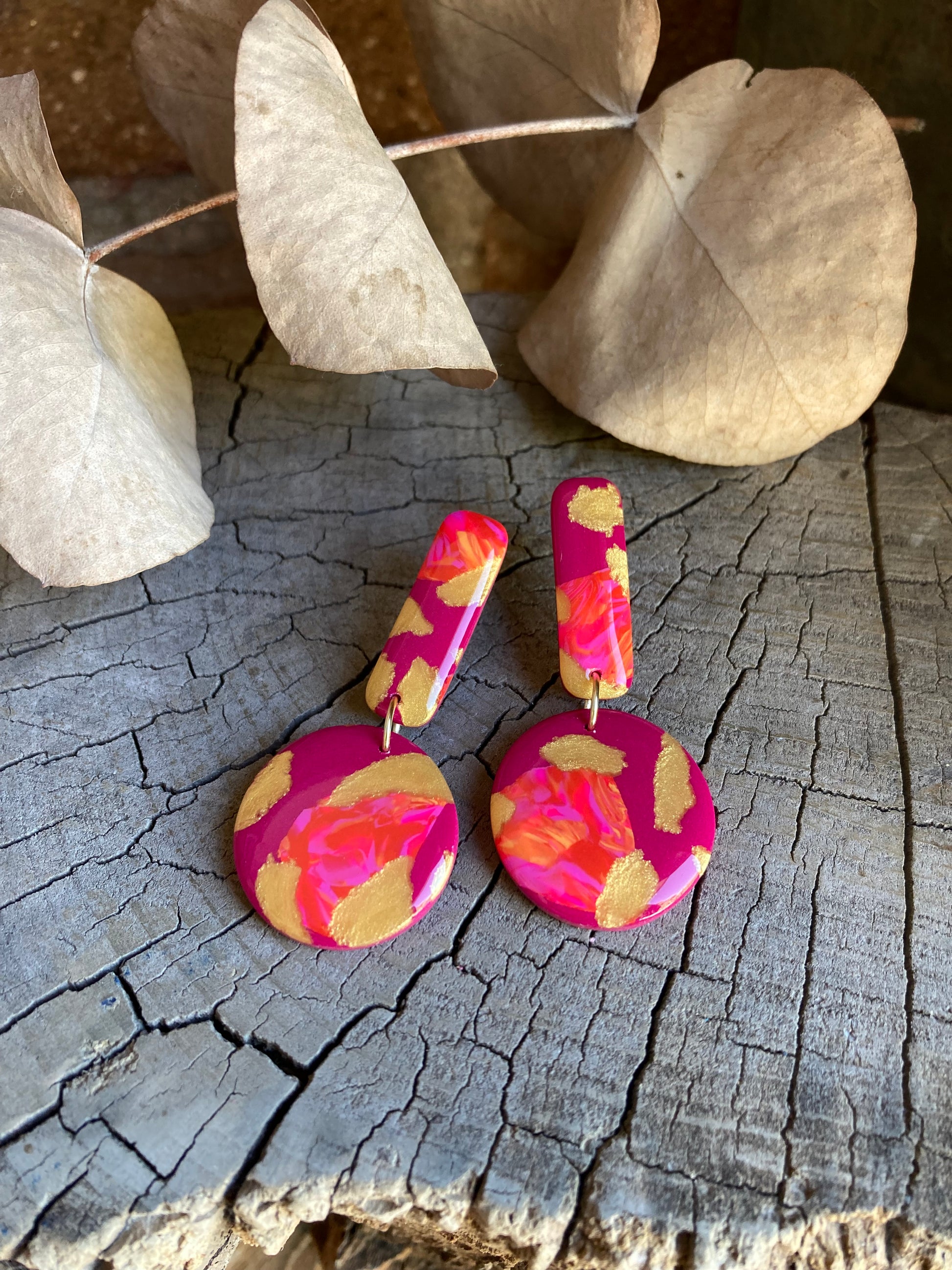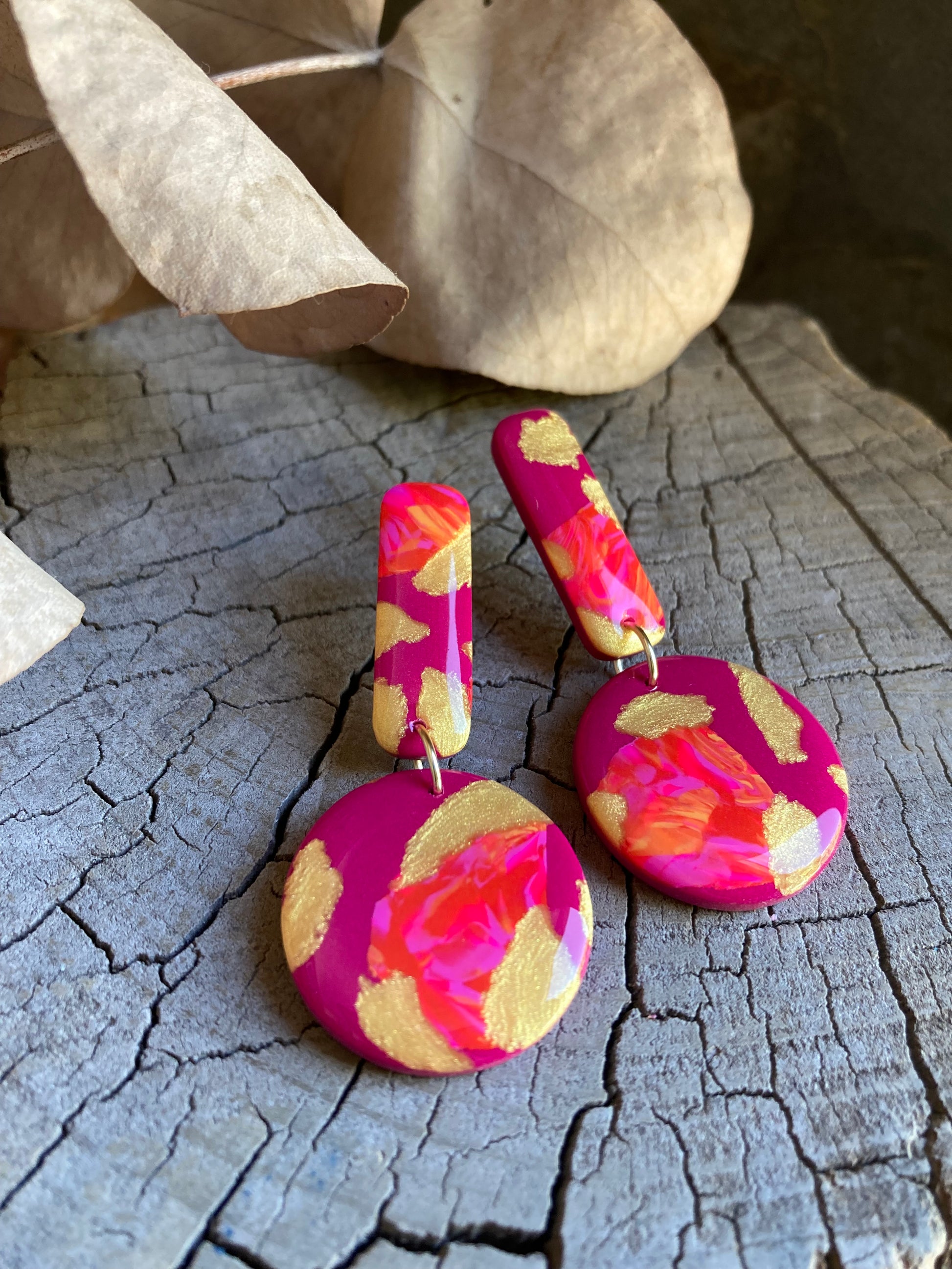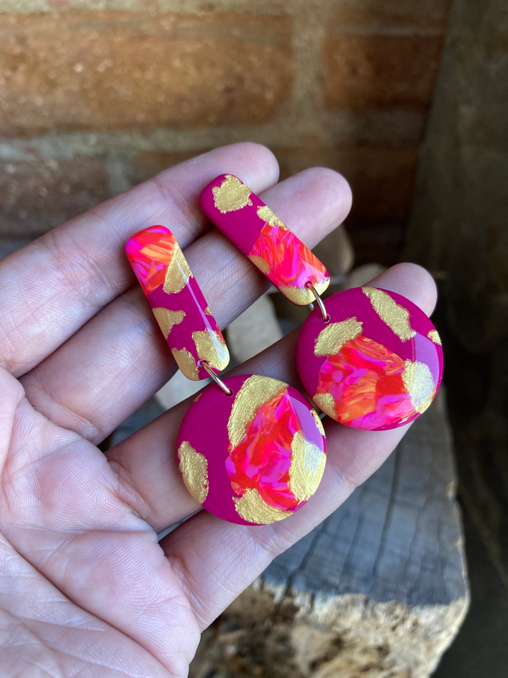 Aros de arcilla polimérica con top coat de resina uv. Miden 5,5 cms. Palito de acero quirúrgico y tope de goma.