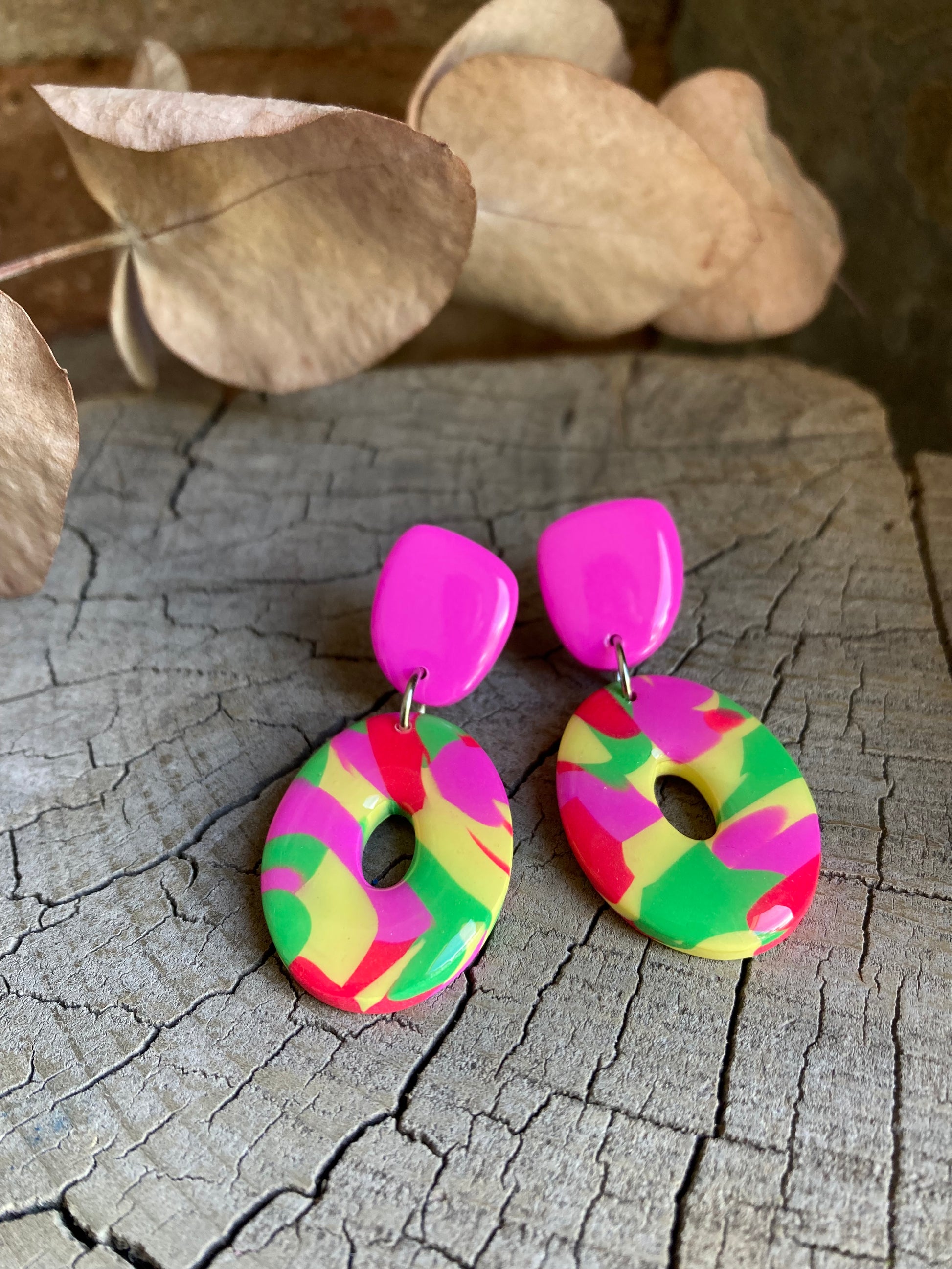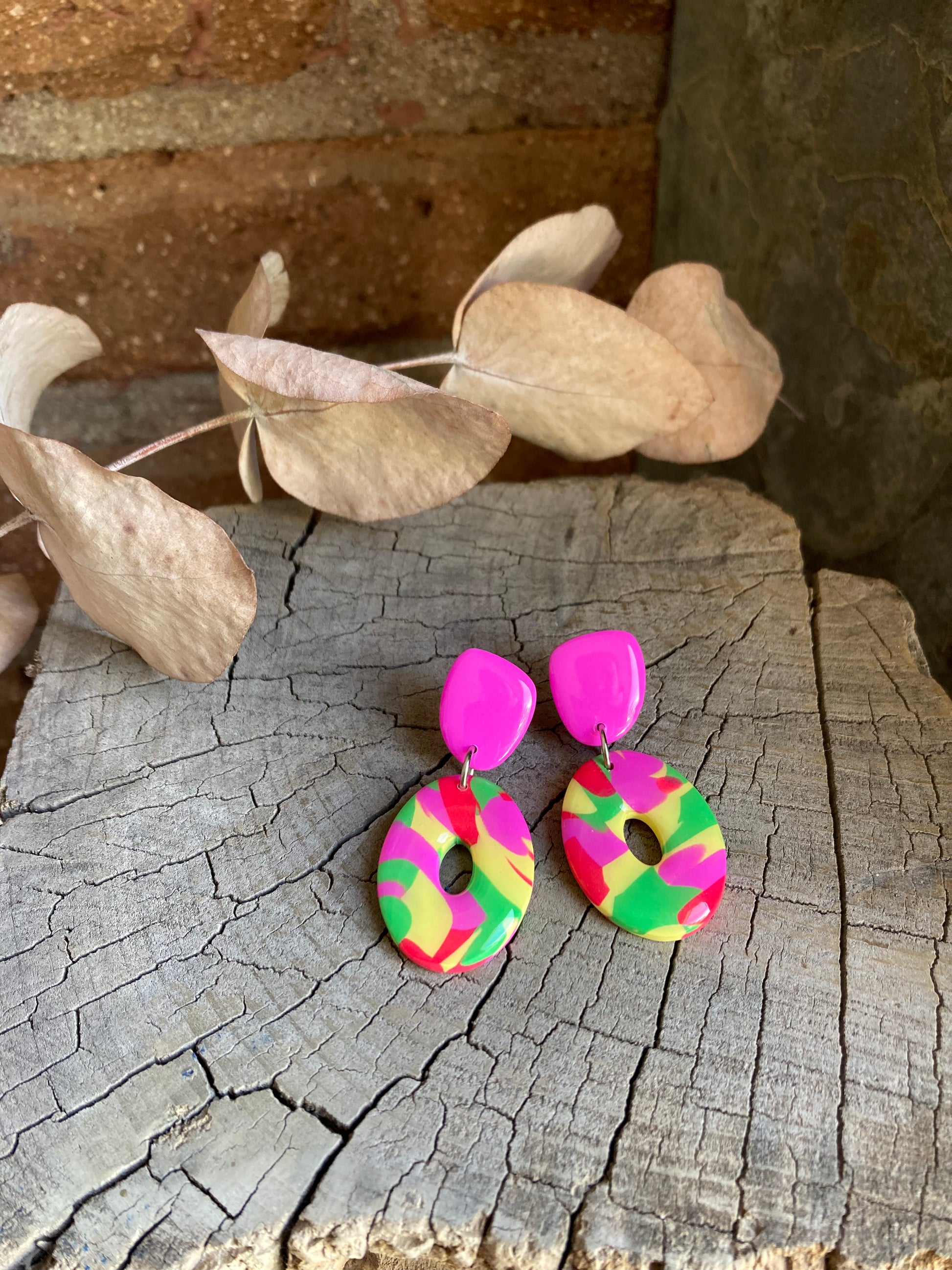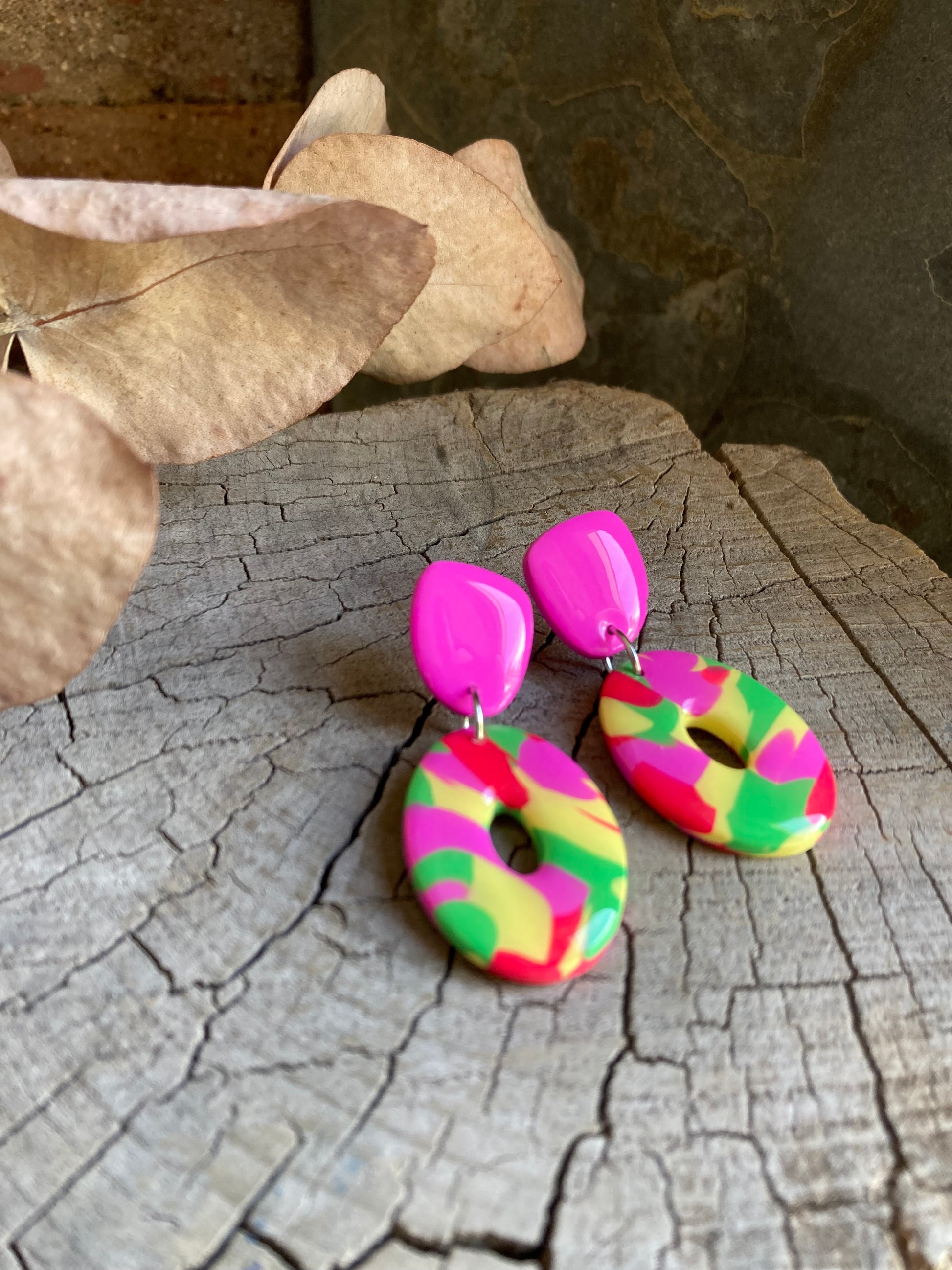 Aros de arcilla polimérica con top coat de resina uv. Miden 4,8 cms. Palito de acero quirúrgico y tope de goma.
